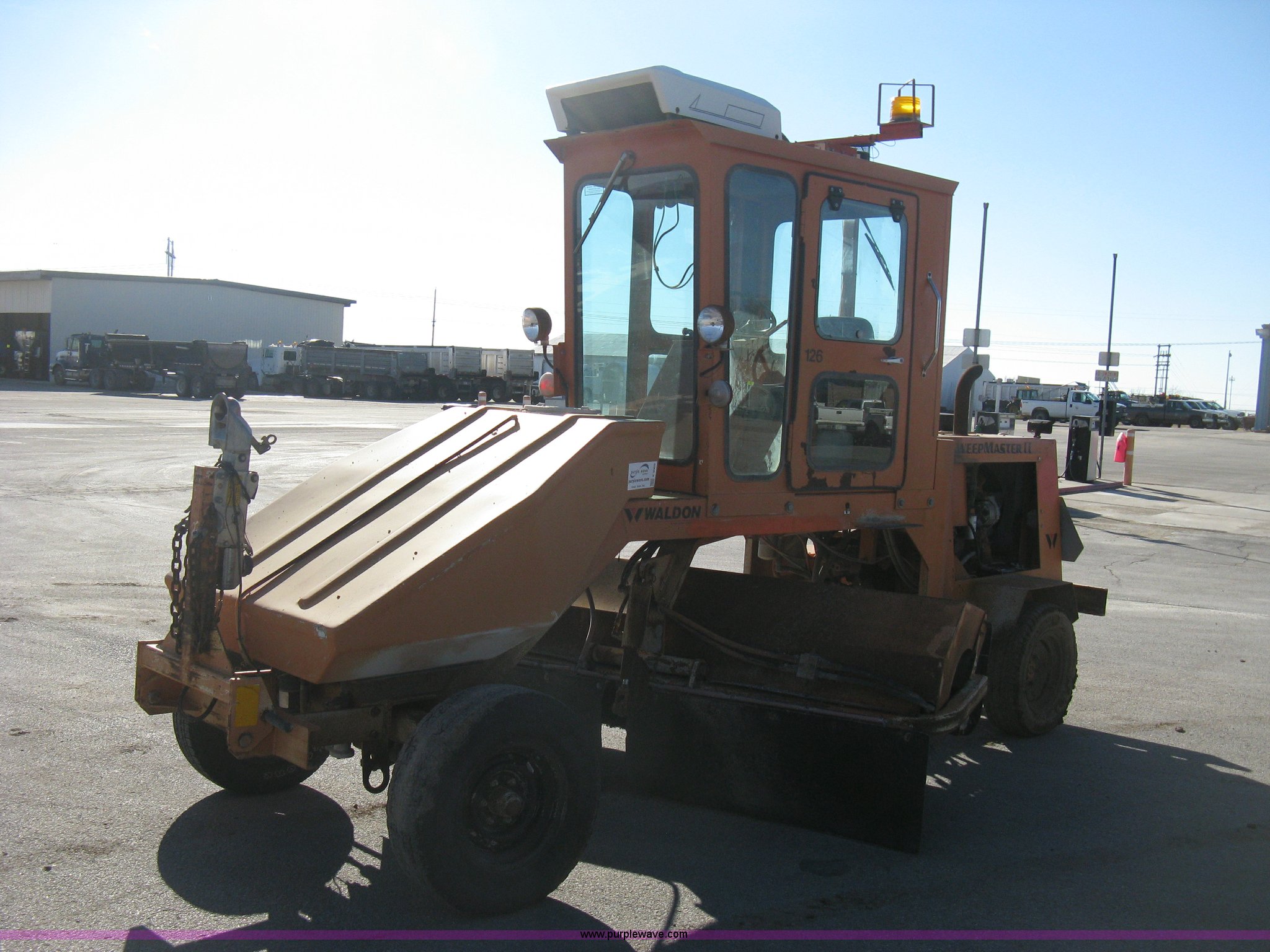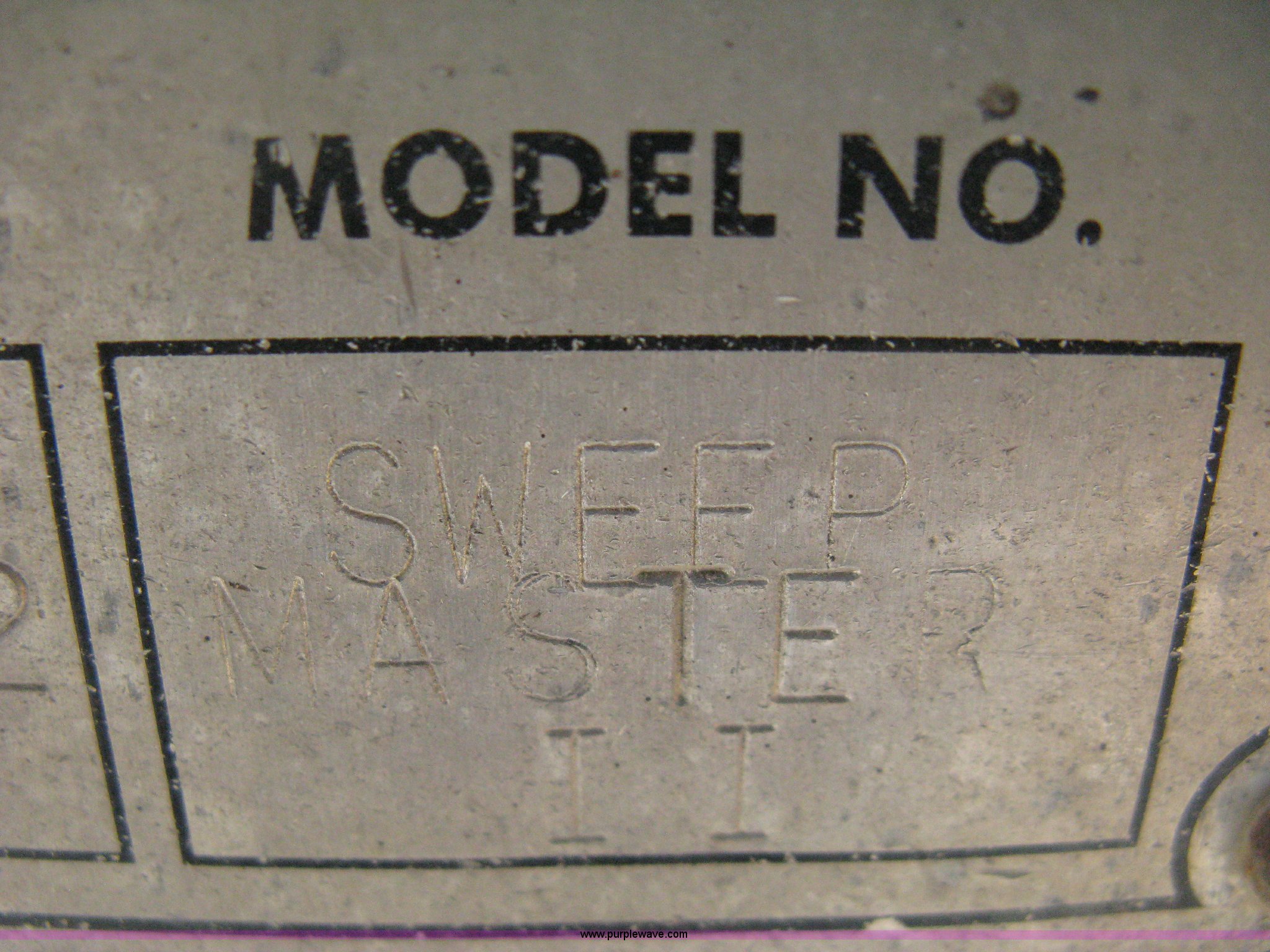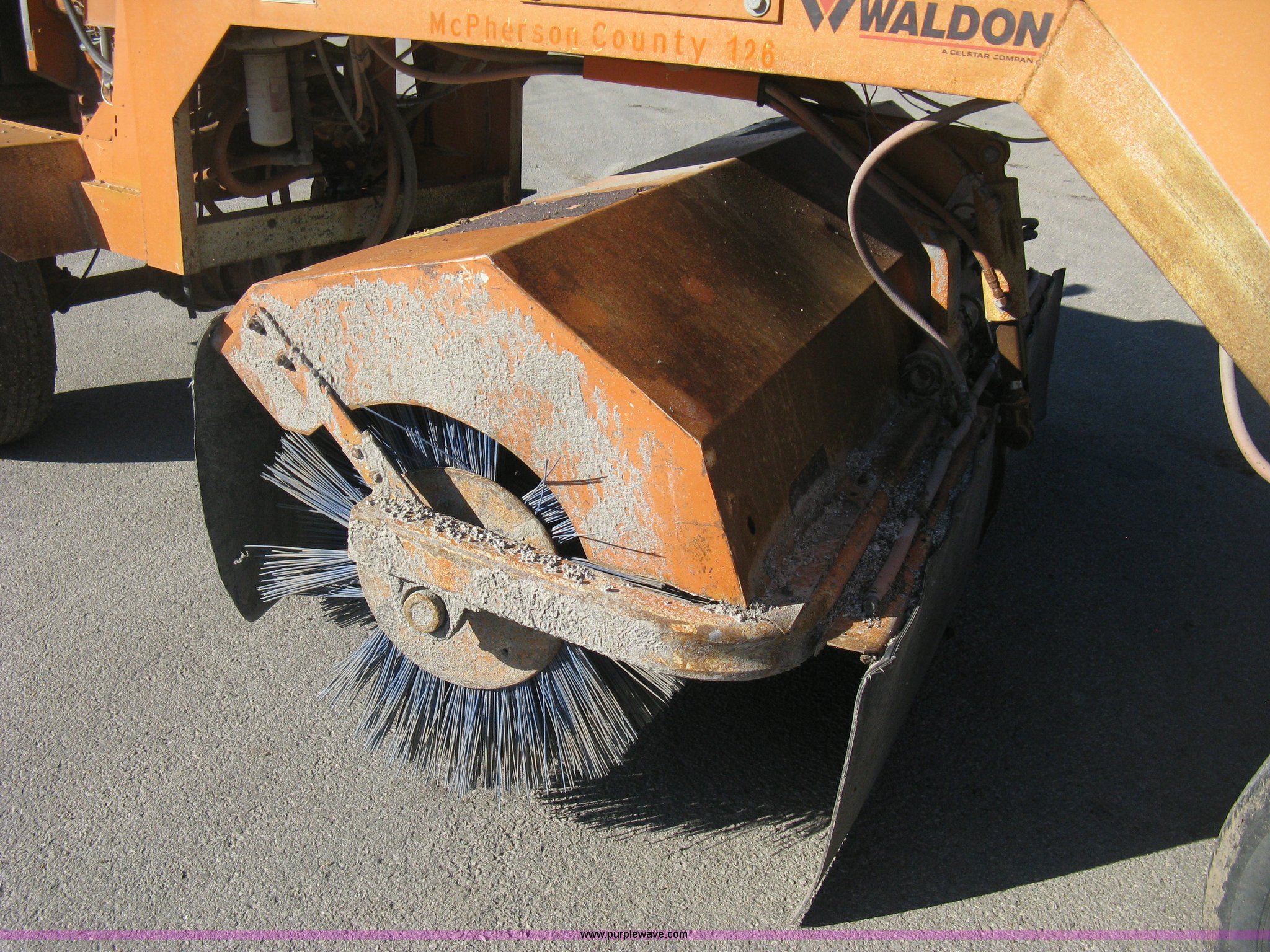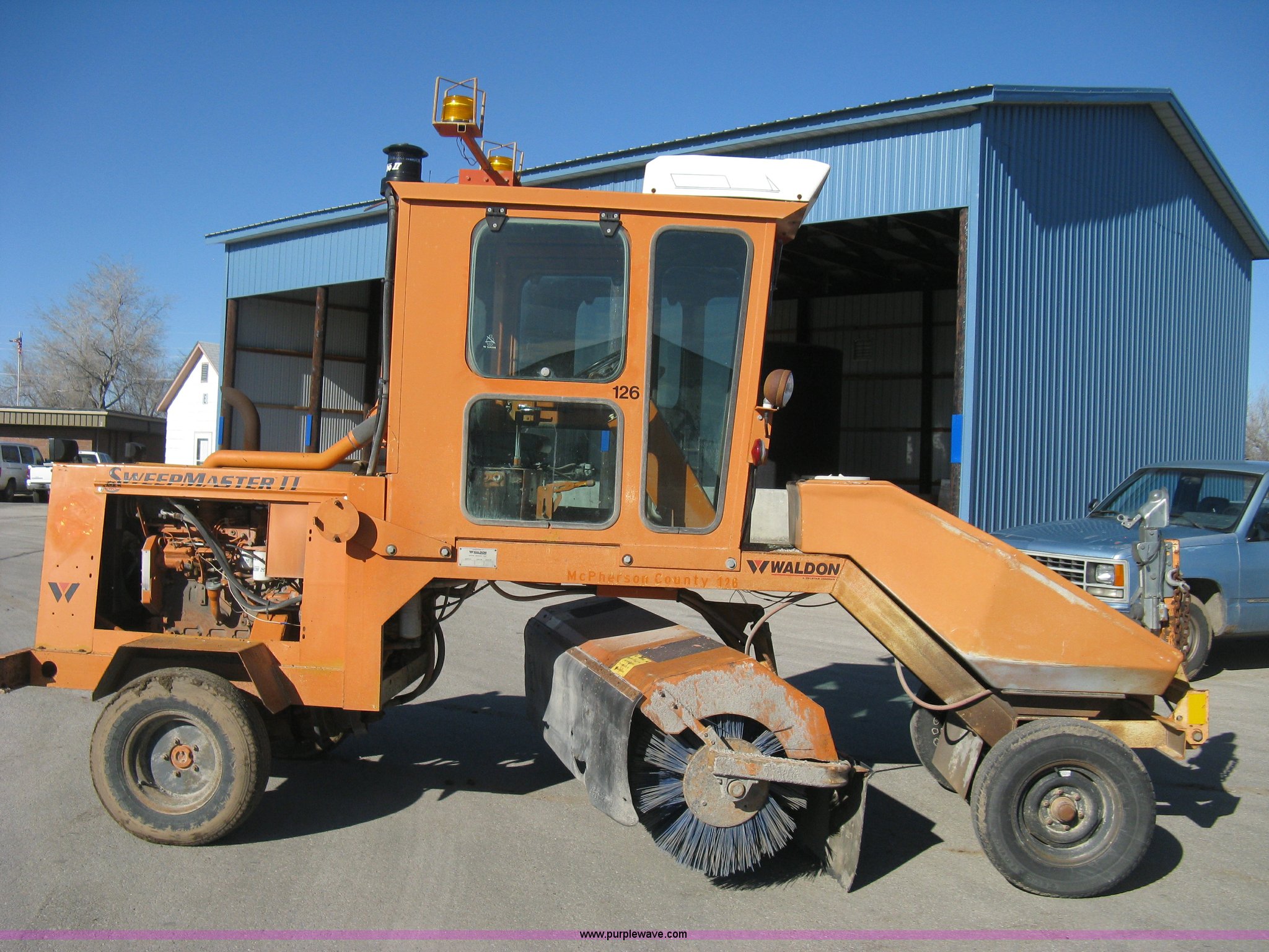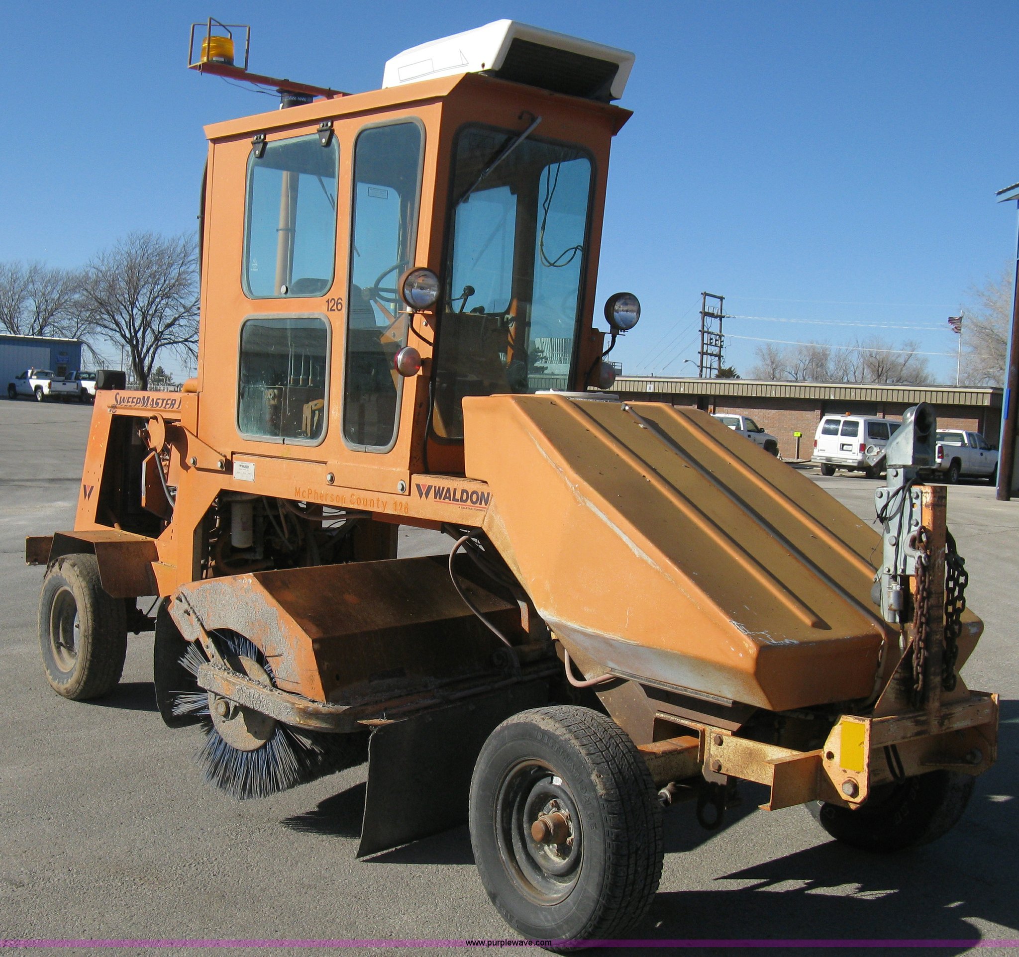 Purple Wave is selling a used Broom in Kansas. This item is a 1996 Waldon Sweep Master II broom with the following: 2,666 hours on meter, Cummins 3.9L four cylinder diesel engine, 76 HP, Hydrostatic transmission, Enclosed cab, AC and heat, Work lights, Windshield wipers, Water applicator, 94"W broom housing, Sug-O-Matic six tongue mount brake actuator, Amber caution light, Dive disengages for towing, Front mounted tow tongue, 2 5/16" ball hitch, P225/70R15 tires, Serial 24861-002