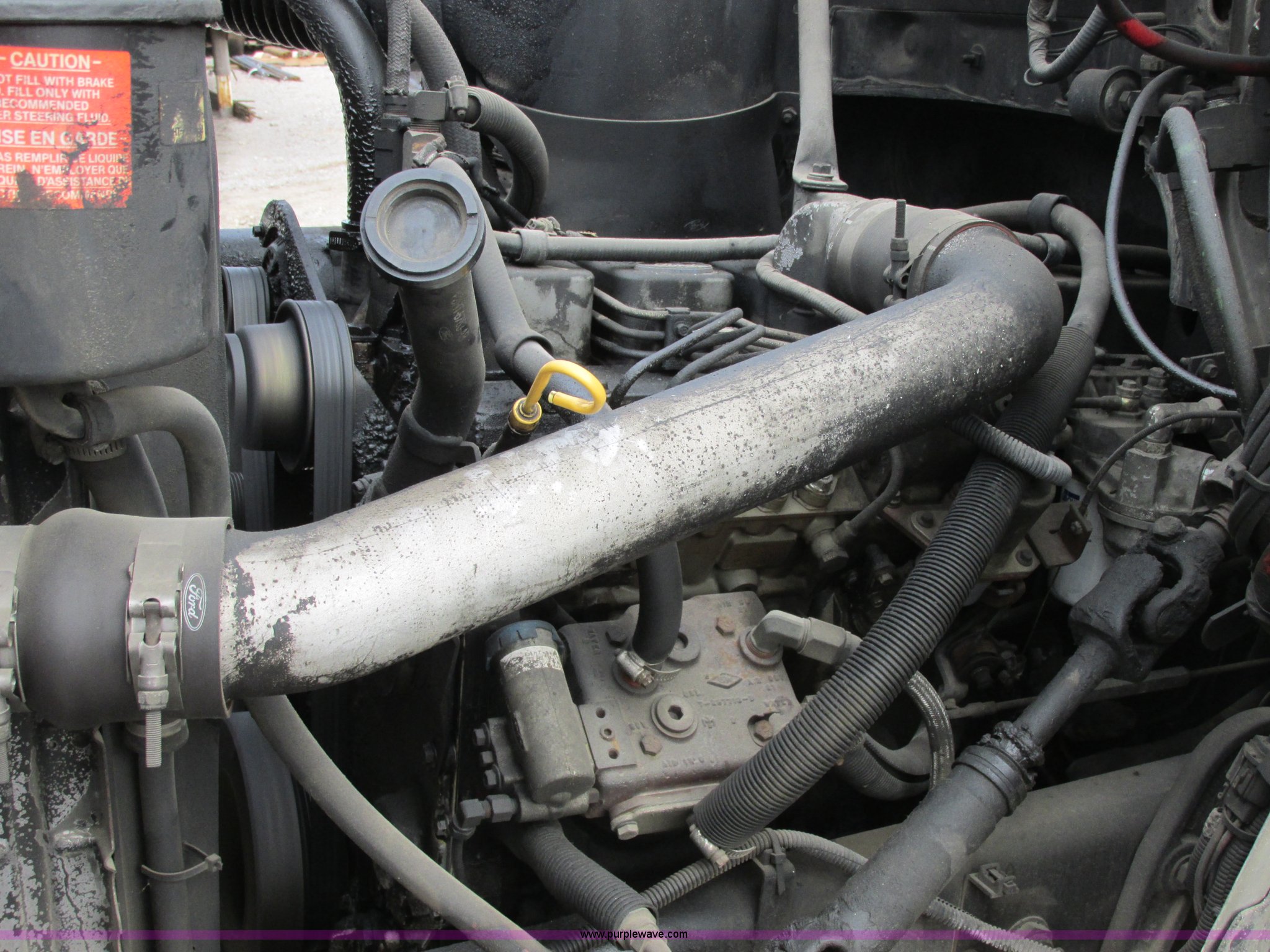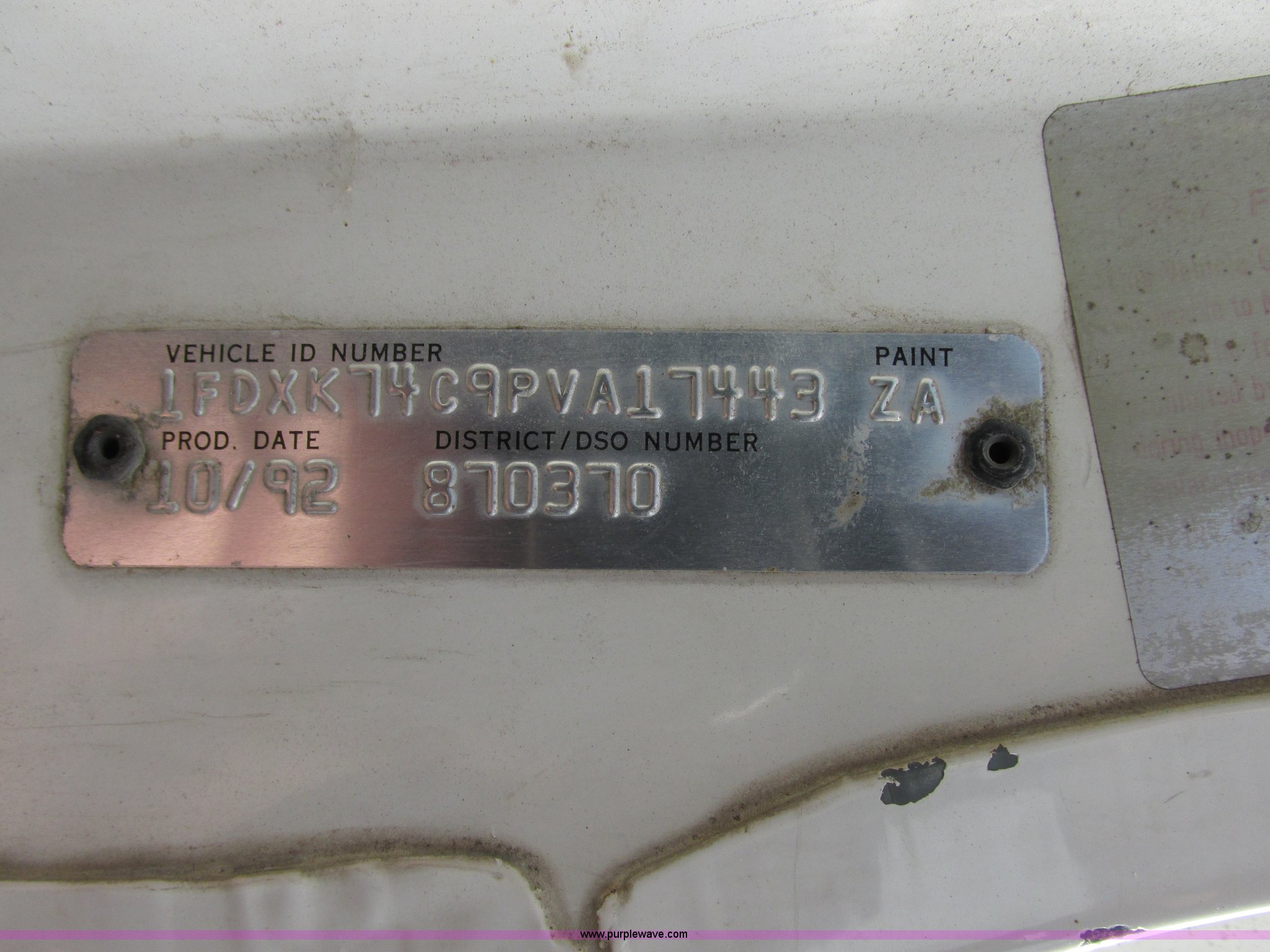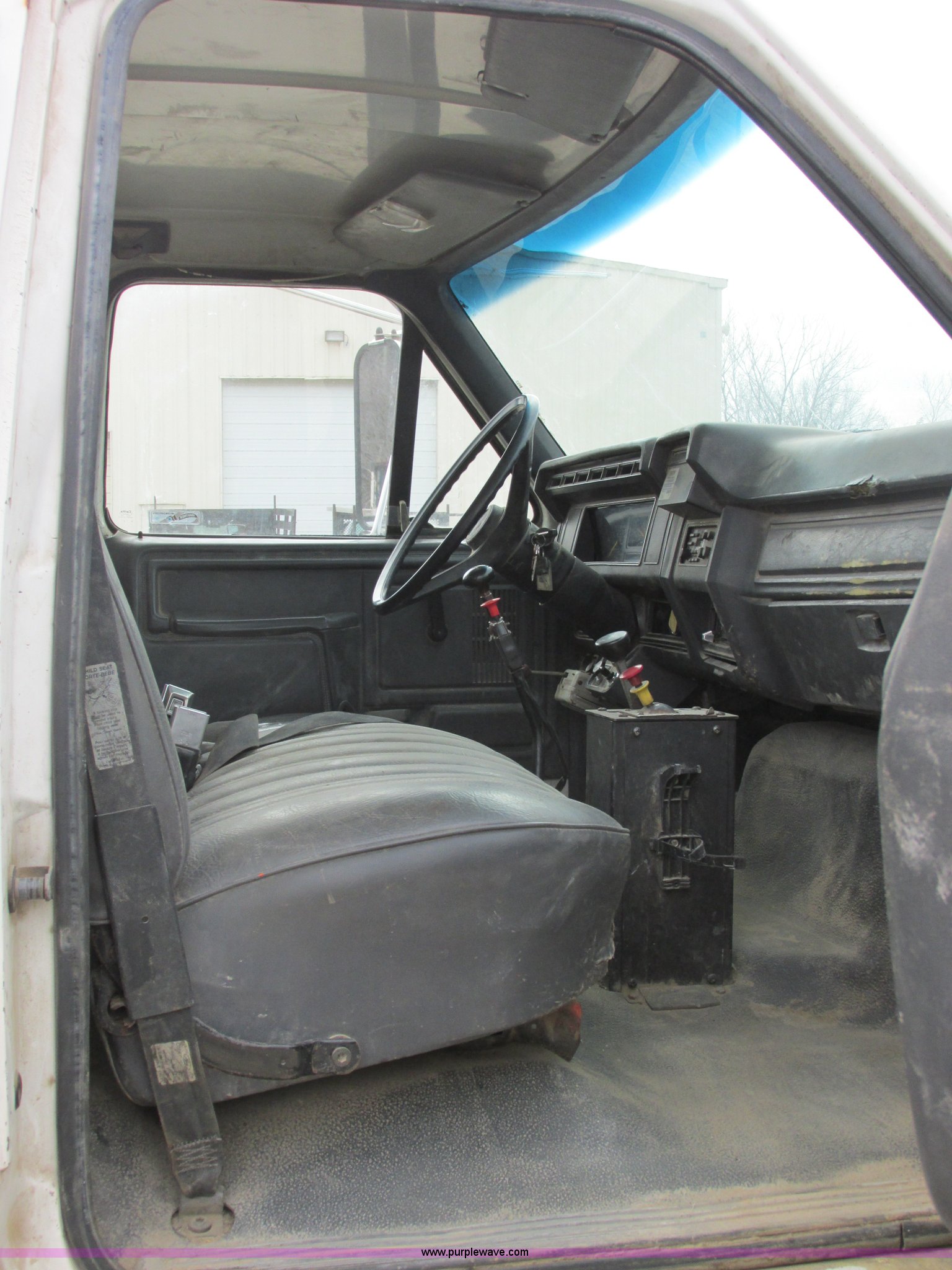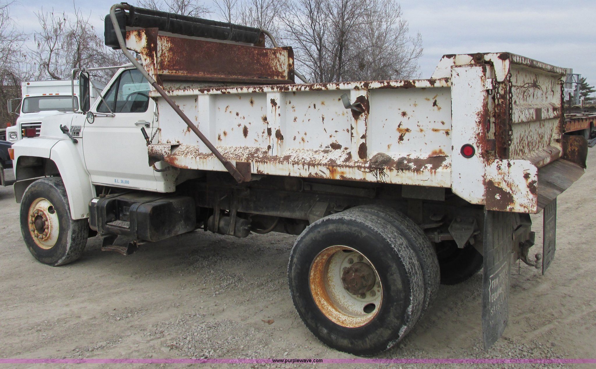 Purple Wave is selling a used Construction Dump Truck in Missouri. This item is a 1993 Ford F700 dump truck with the following: 169,477 actual miles, Cummins 5.9L L6 diesel engine, Five speed manual transmission, Two speed rear end, Heat, AM/FM/cassette, Spring suspension seat, 10' dump bed, Manual end gate, Single ram, Pintle hitch, Dual 50 gallon fuel tanks, Chelsea PTO, 12V electric tarp, Air brakes, 11R22.5 tires, GVWR 33,000 lbs, FAWR 12,000 lbs, RAWR 21,000 lbs, Unit# 25