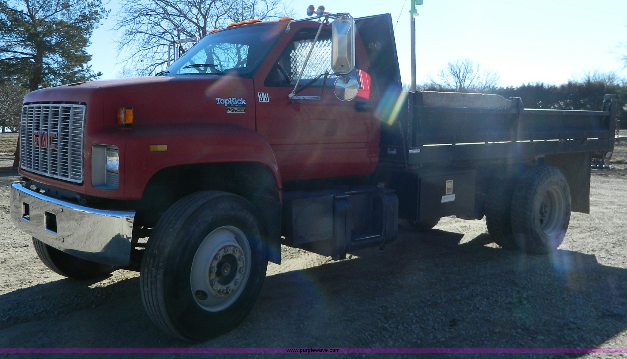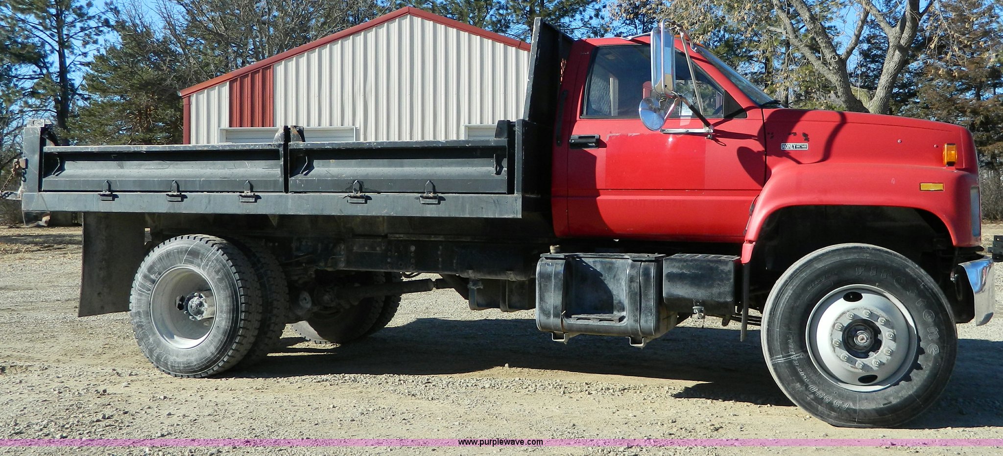 Purple Wave is selling a used Construction Dump Truck in Kansas. This item is a 1994 GMC TopKick dump truck with the following: 181,913 miles on odometer, Caterpillar 3116 6.6L L6 diesel engine, 215 HP, Serial 2BK39374, Eaton Fuller seven speed manual transmission, Heat, Knapheide 14'L x 96"W bed, Serial 921098, Dual fuel tanks, Under body toolbox, Pintle hitch, Air brakes, 11R22.5 tires, GAWR 22,700, Interior/exterior cosmetic damage