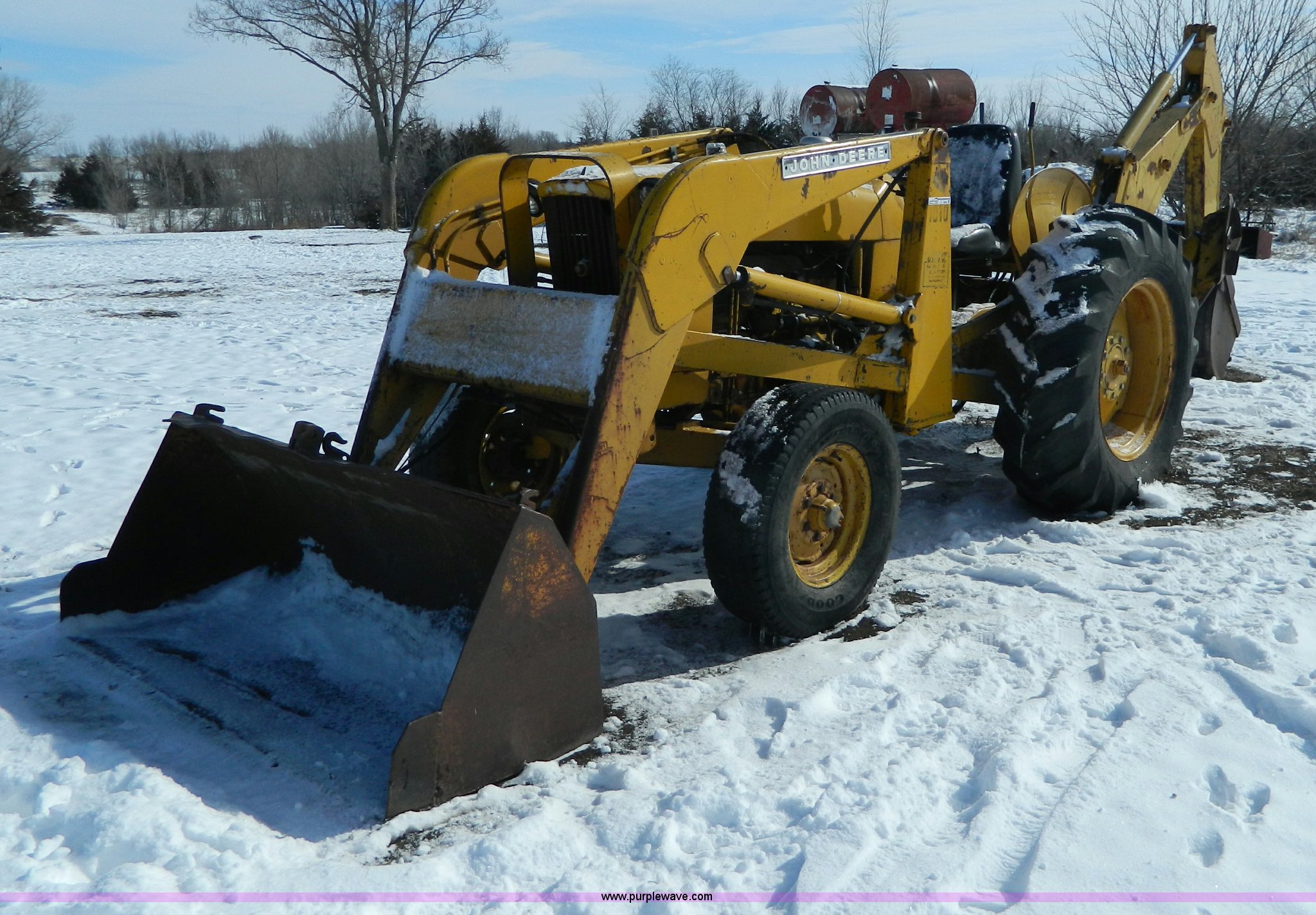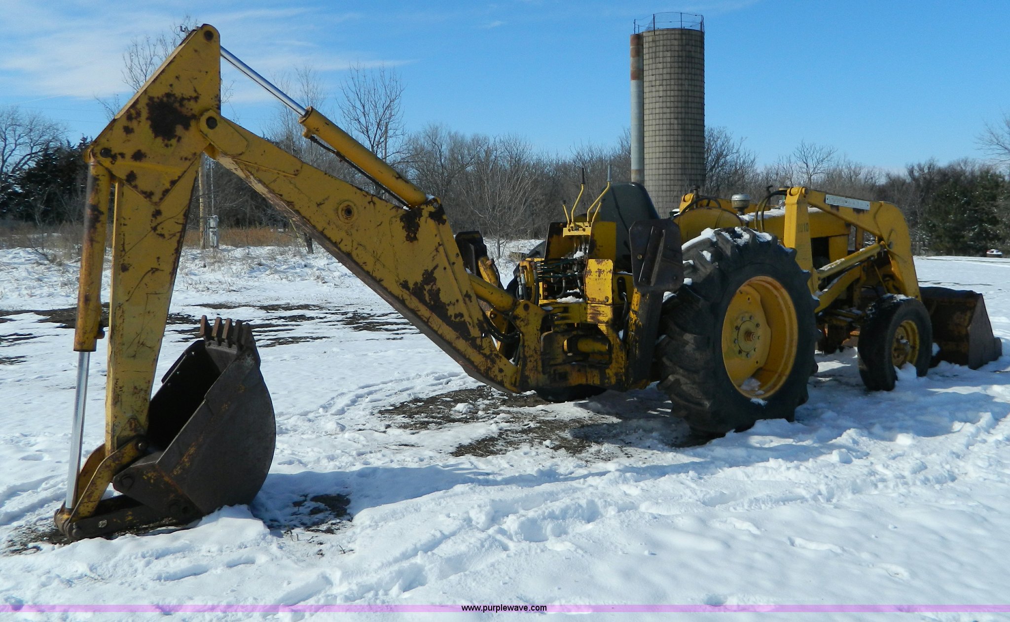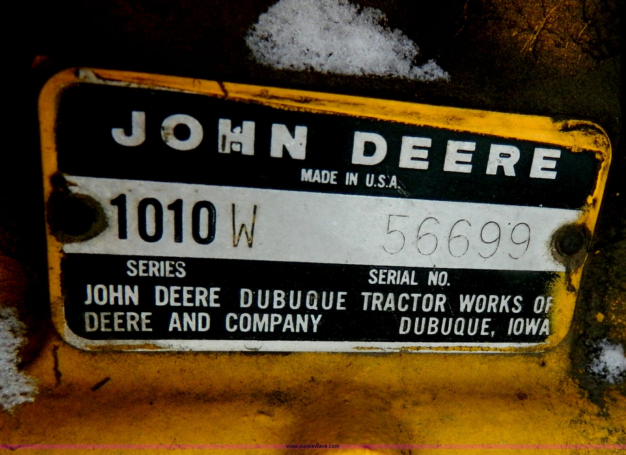 Purple Wave is selling a used Tractor Loader Backhoe in Kansas. This item is a John Deere 1010 backhoe with the following: 6,249 hours on meter, Four cylinder gas engine, Manual transmission, 5F-1R gears, Two lever loader control, Four lever backhoe control, 64" loader bucket, 24" backhoe bucket, Steel outrigger pads, LT265/75R15 front tires, 14.9-28 rear tires, Cosmetic damage, Needs muffler, Backhoe serial SNE0092000574U, Loader serial SNE0710003975U, Serial 56699