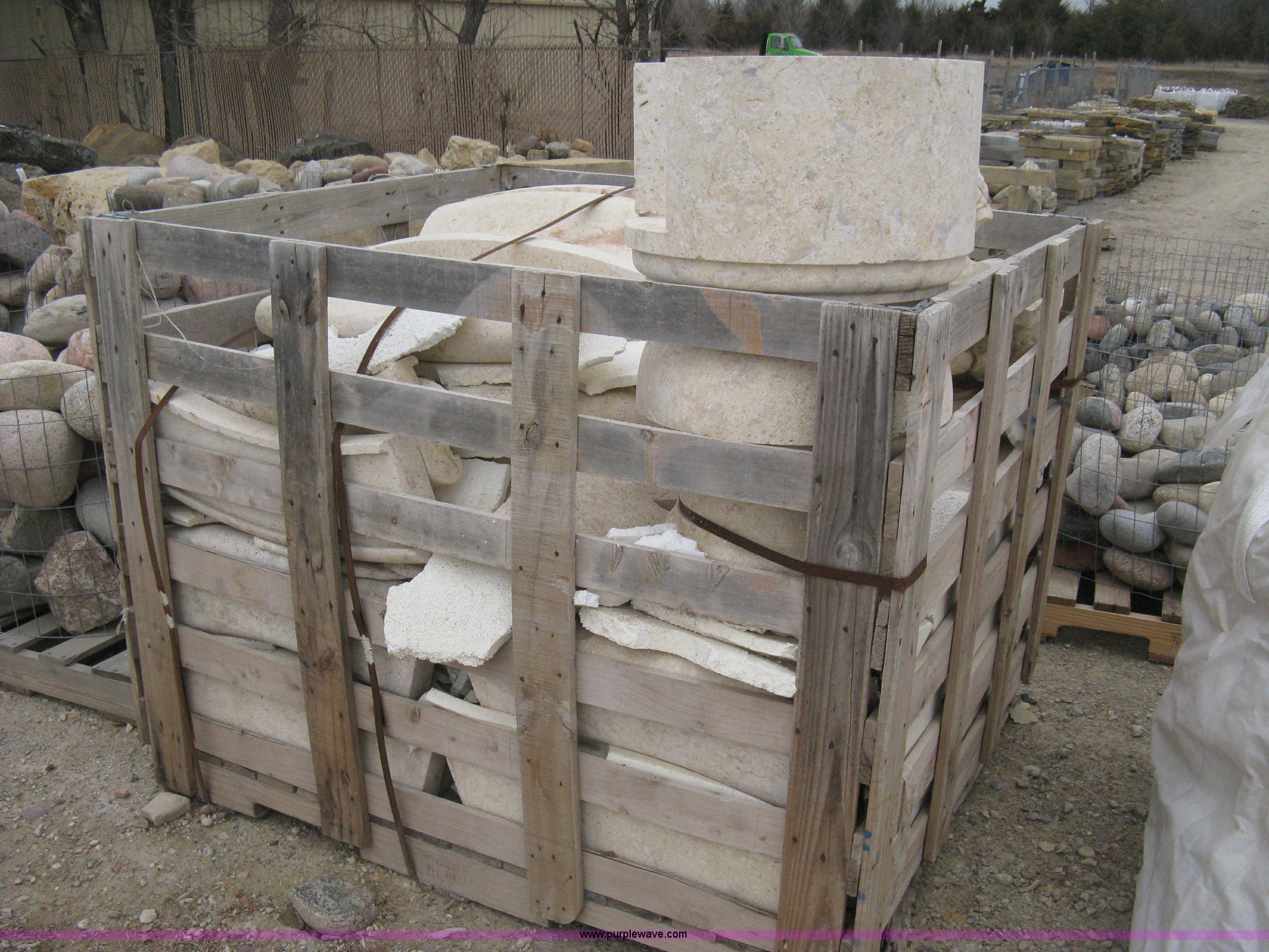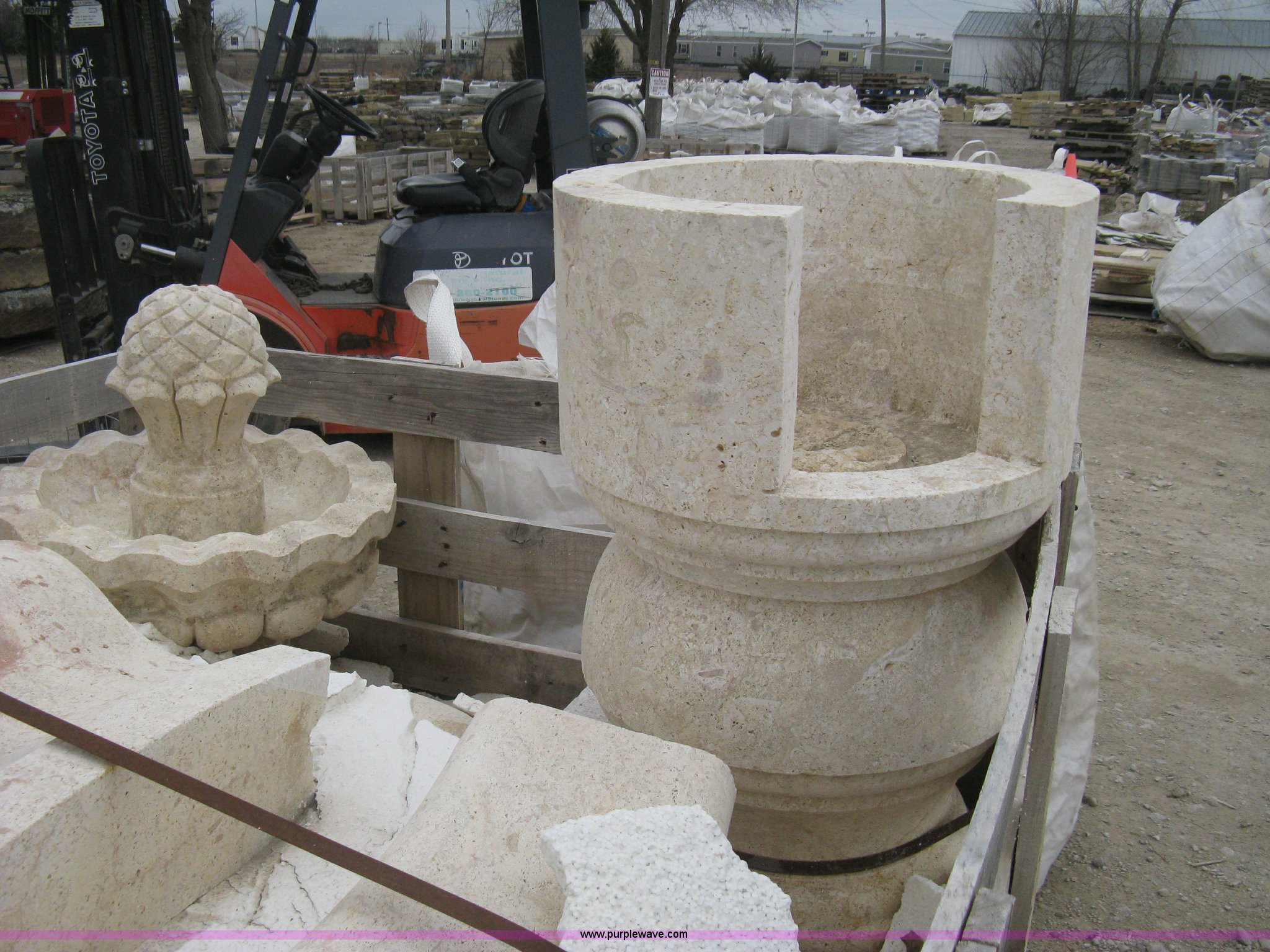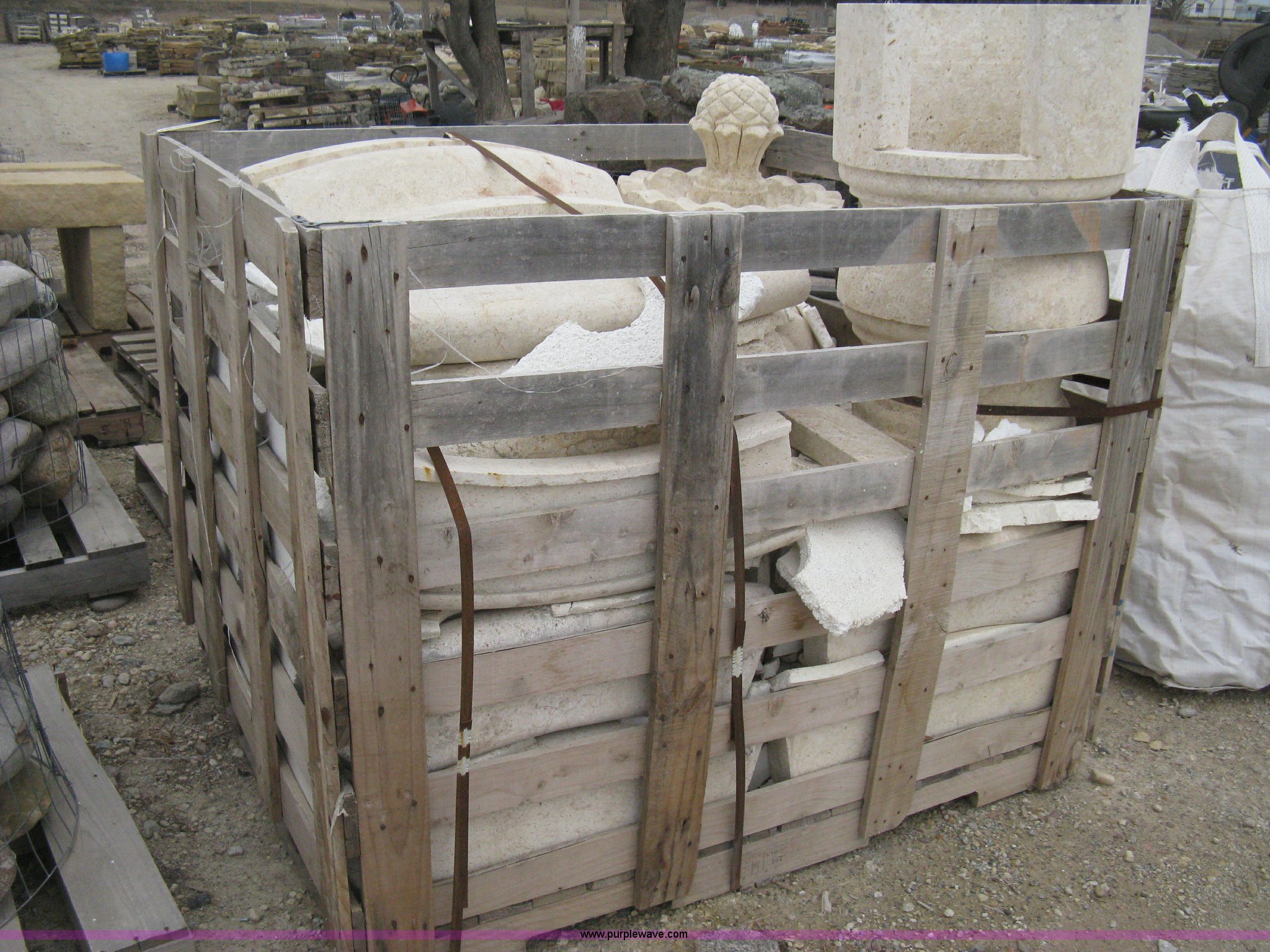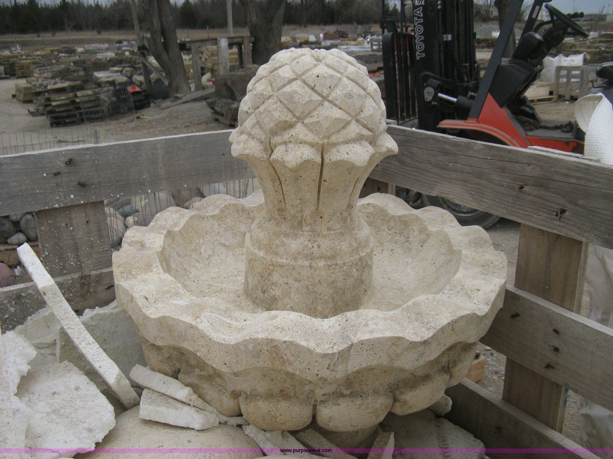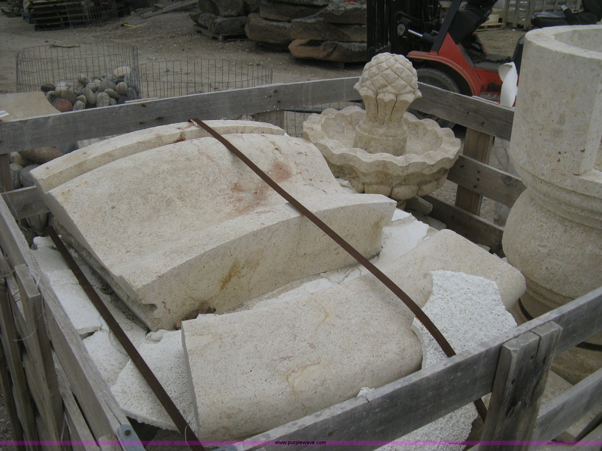 Purple Wave is selling a used Lawn and Garden in Kansas. This item is a Mediterranean stone carved fountain. This fountain requires to be installed on a concrete slab with the following: Mediterranean stone carved fountain. This fountain requires to be installed on a concrete slab. Shipping quotes available. Absolute Natural Stone. 10909 E Kellogg Drive. Wichita, KS 67207