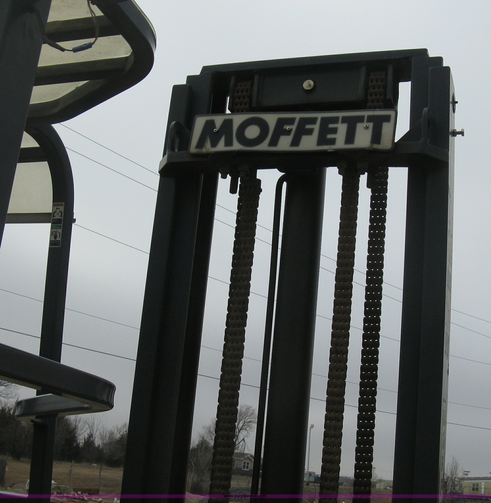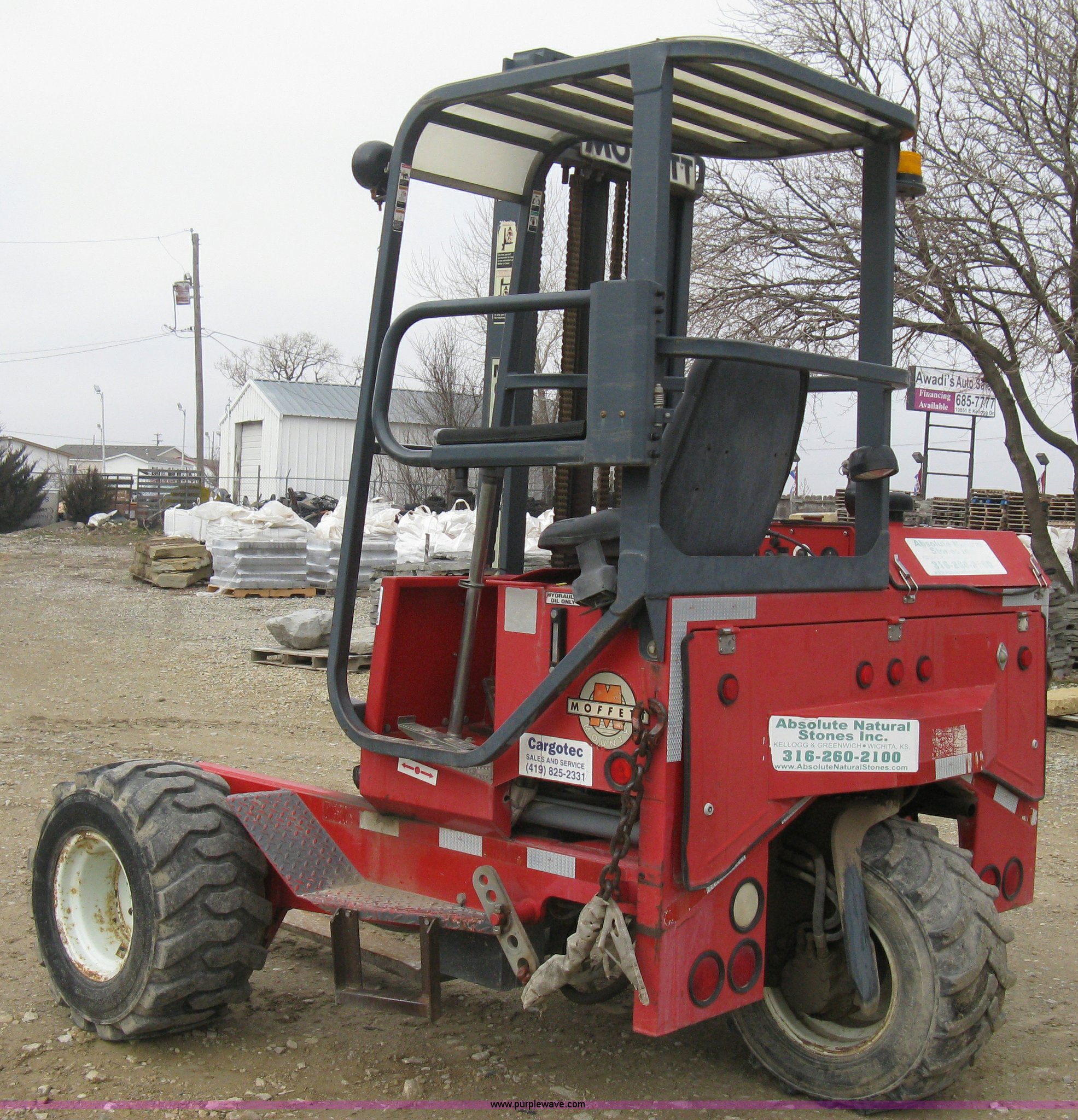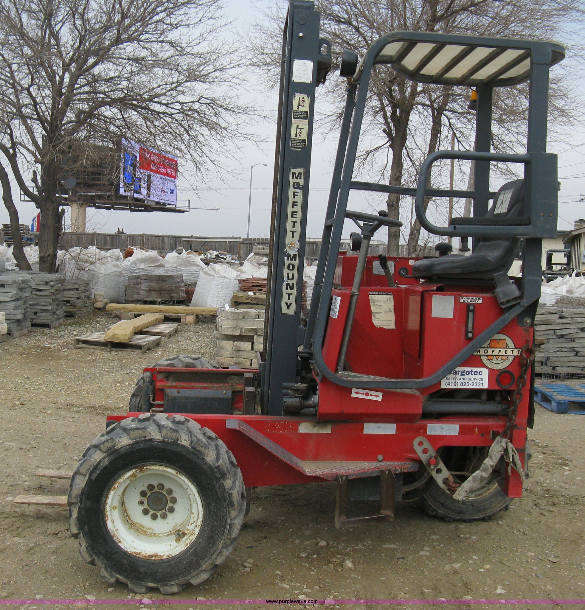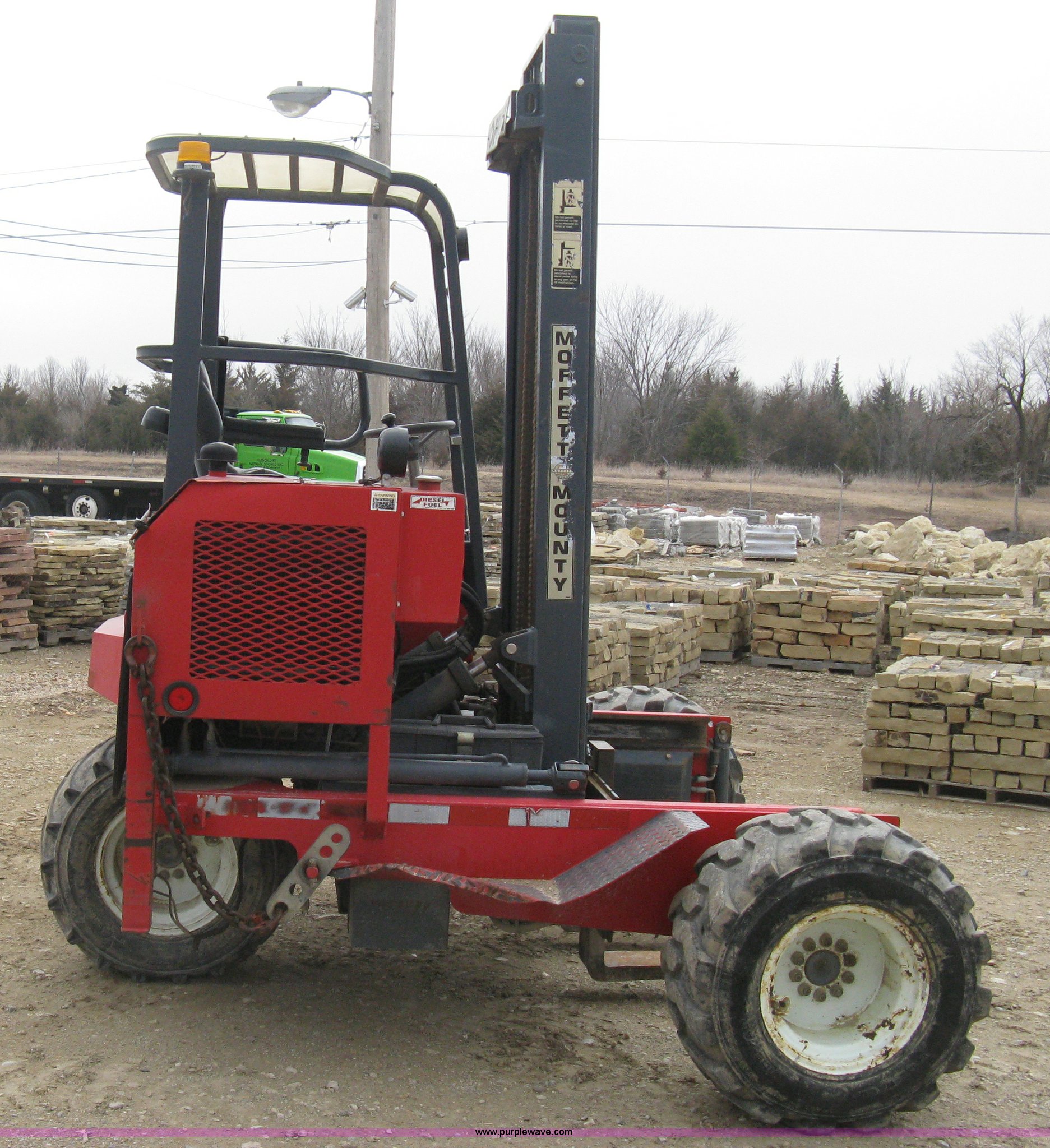 Purple Wave is selling a used Strt. Mast Rough Terr. Forklift in Kansas. This item is a 1997 Moffett M5000 piggy back forklift with the following: 1,803 hours on meter, Hours will vary, Lister Petter four cylinder diesel engine, Hydrostatic transmission, OROPS, 5,000 lbs lift capacity, 48"W fork assembly, 48"L x 6"W forks, (2) front hydraulic stabilizers, Moffett Mounty side shift mast, (2) anchor chains, Work lights, 31 x 15.5-15 tires, Serial 6758