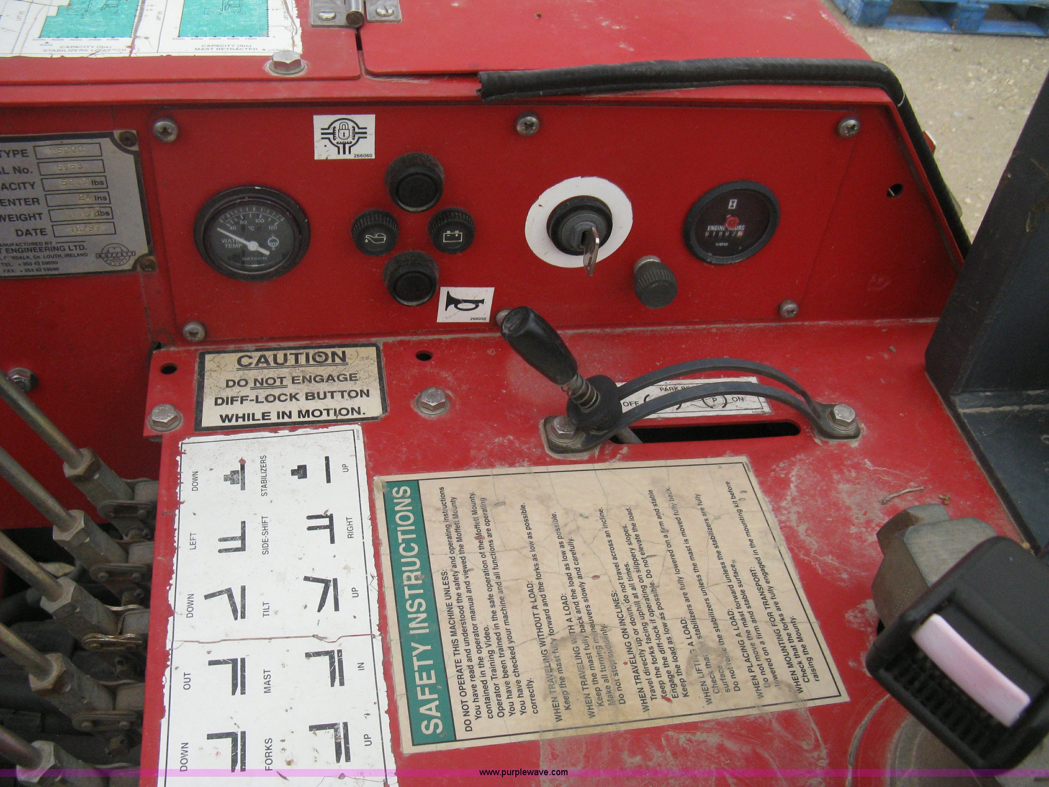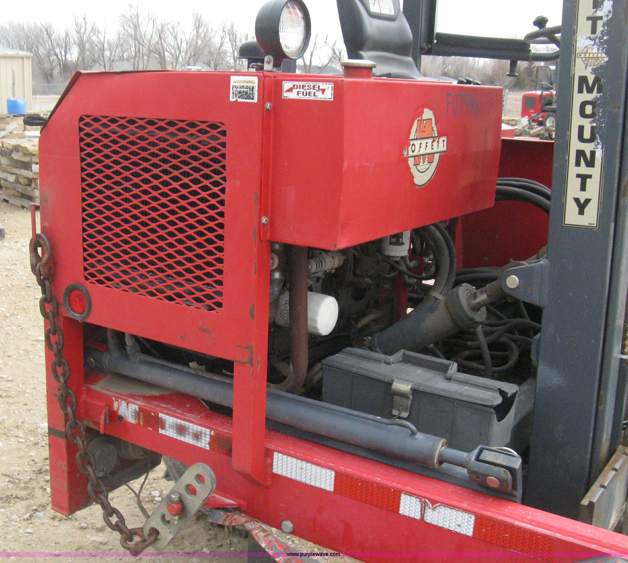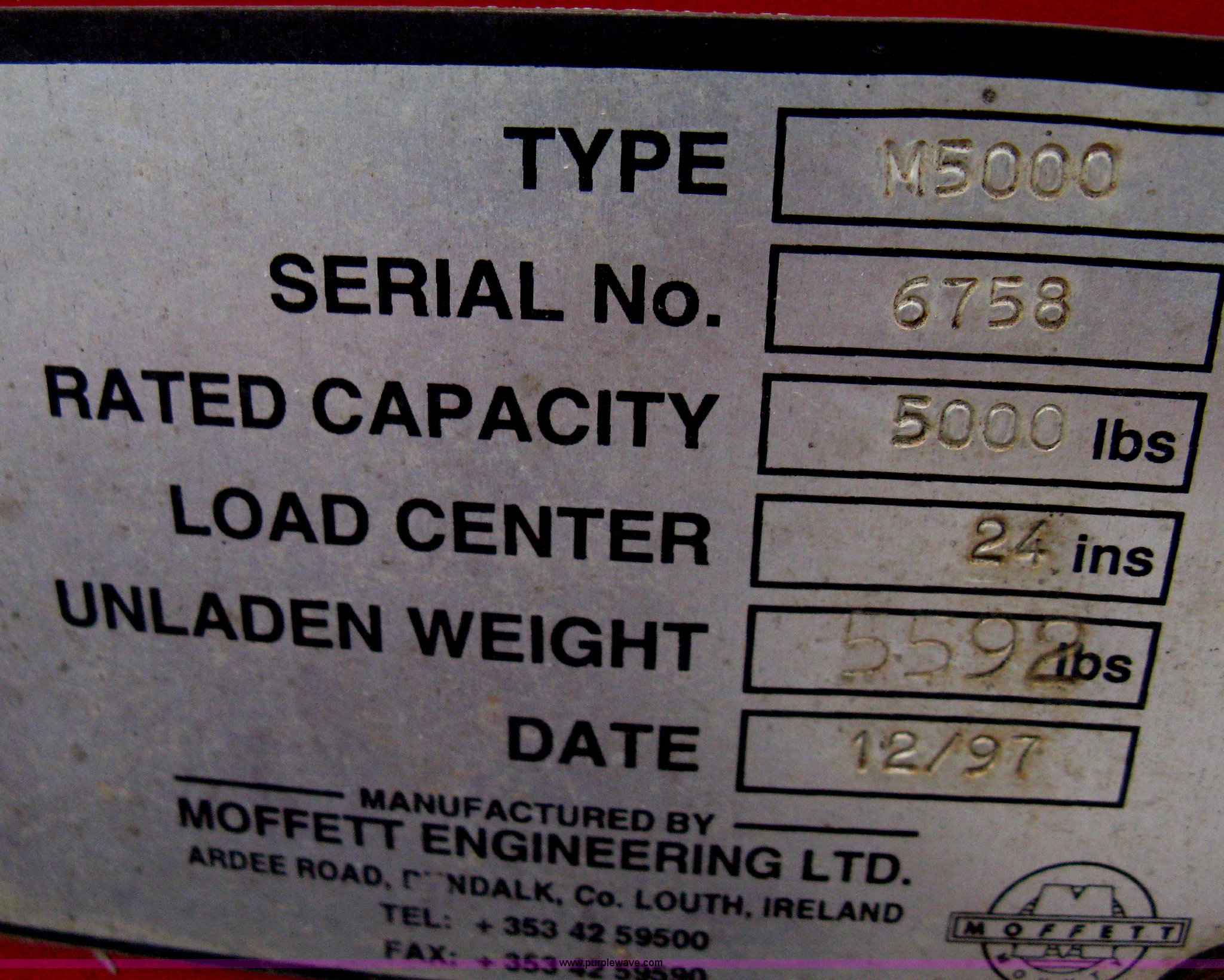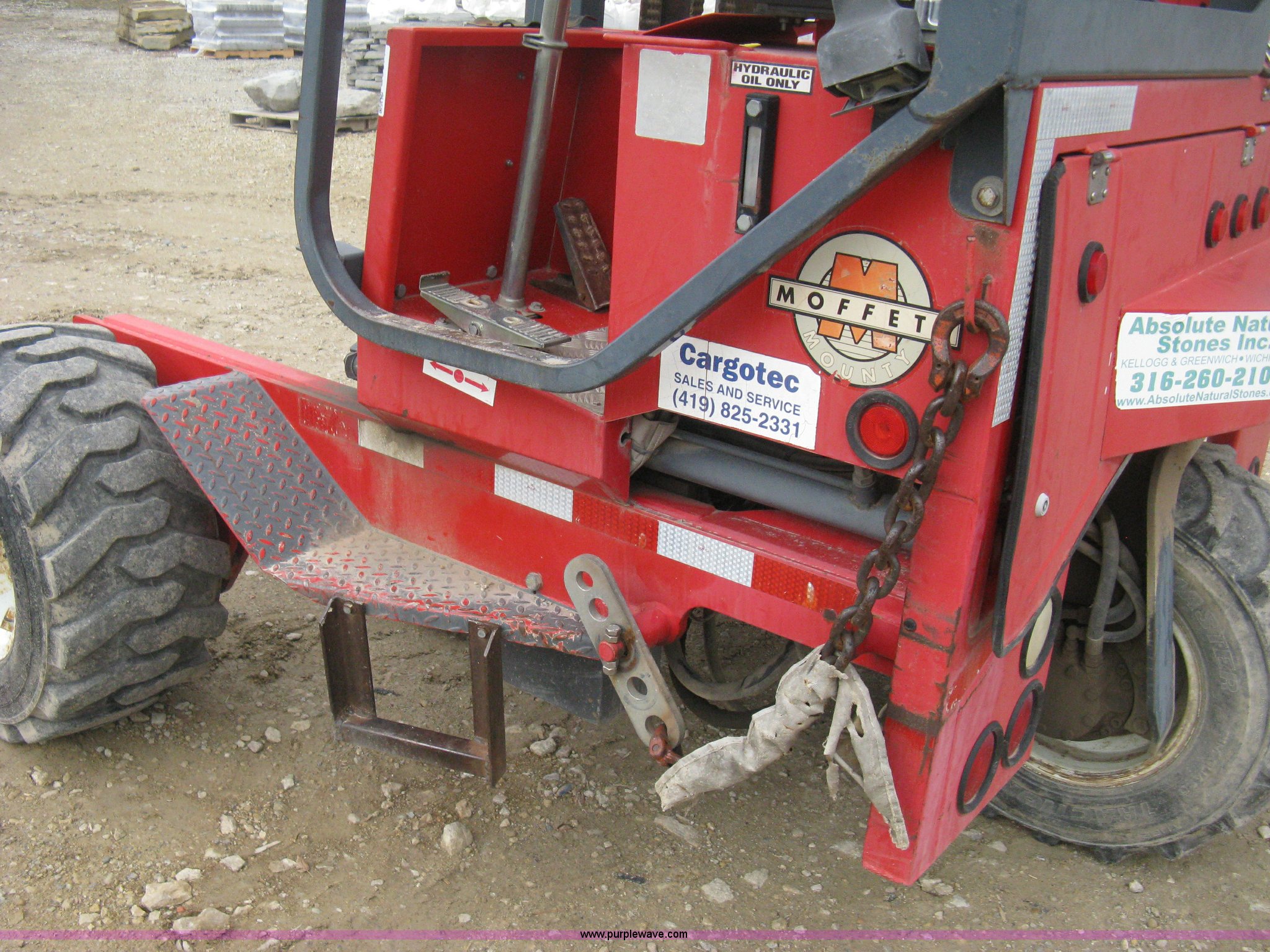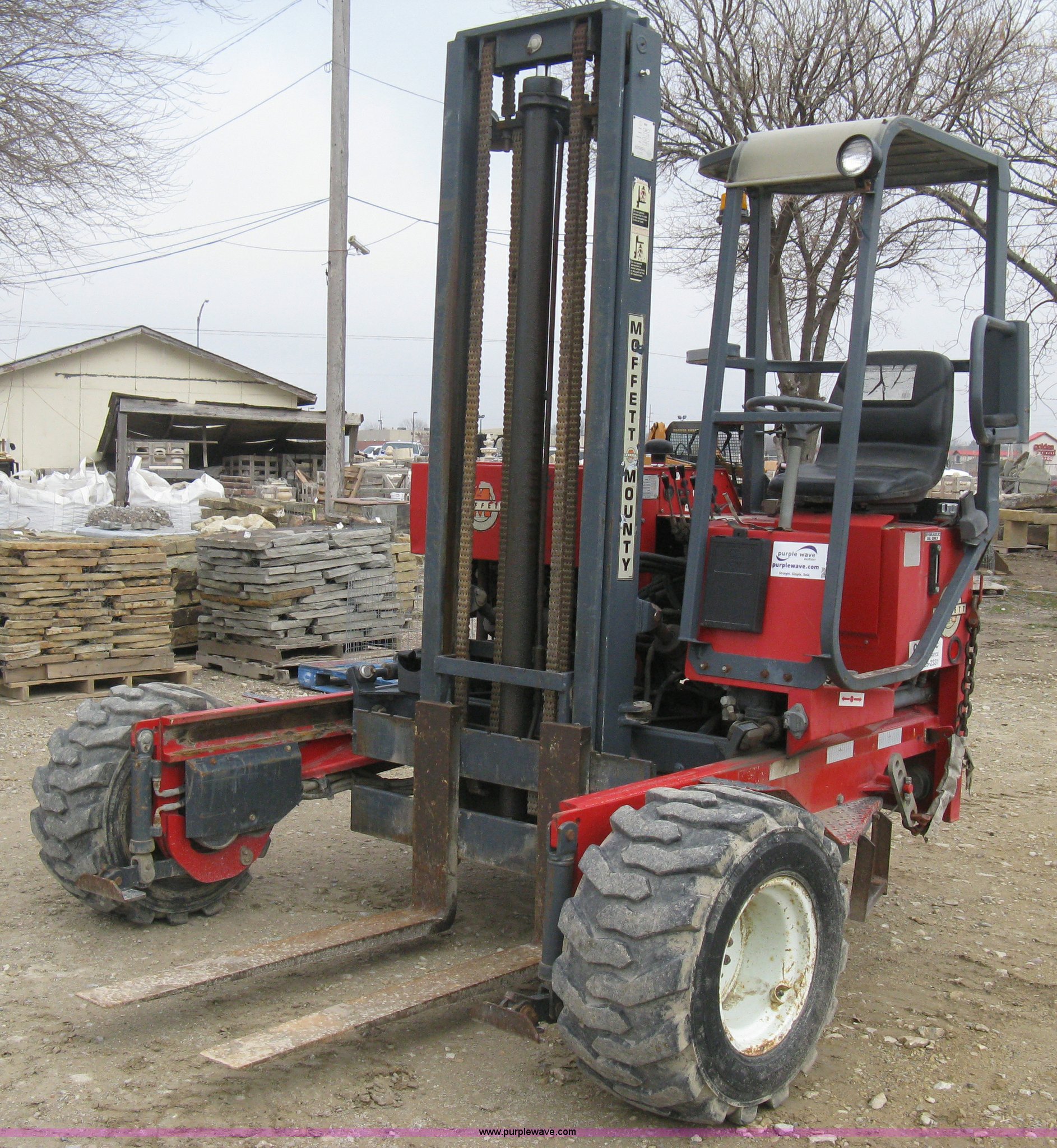 Purple Wave is selling a used Strt. Mast Rough Terr. Forklift in Kansas. This item is a 1997 Moffett M5000 piggy back forklift with the following: 1,803 hours on meter, Hours will vary, Lister Petter four cylinder diesel engine, Hydrostatic transmission, OROPS, 5,000 lbs lift capacity, 48"W fork assembly, 48"L x 6"W forks, (2) front hydraulic stabilizers, Moffett Mounty side shift mast, (2) anchor chains, Work lights, 31 x 15.5-15 tires, Serial 6758