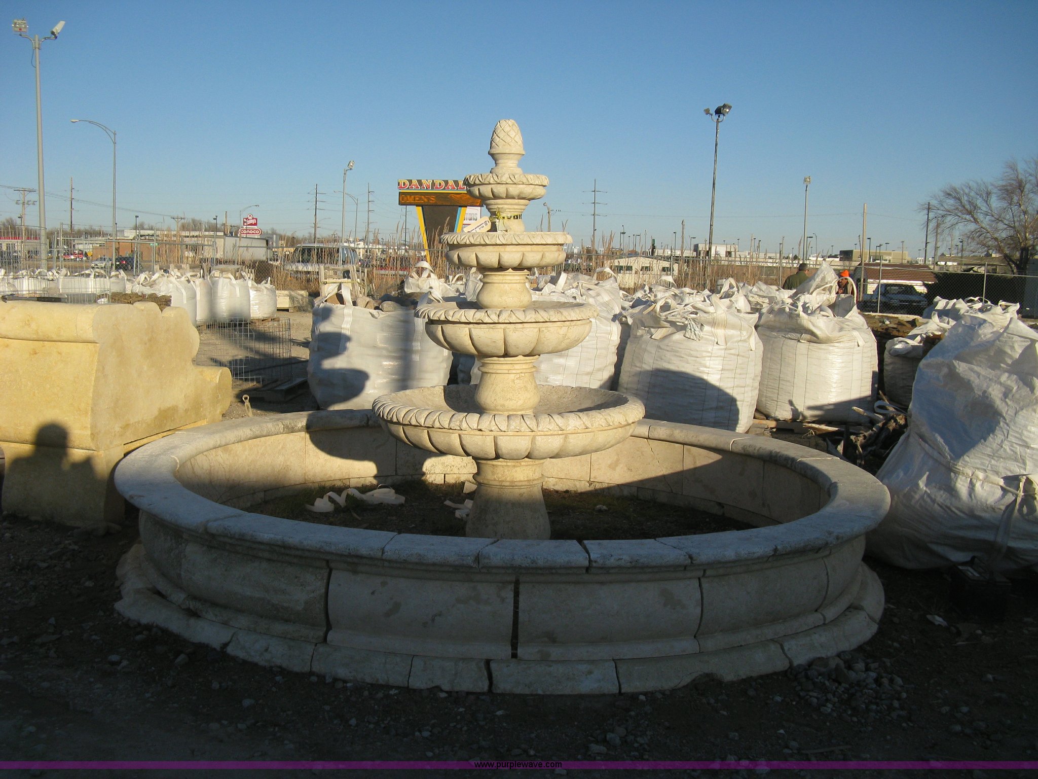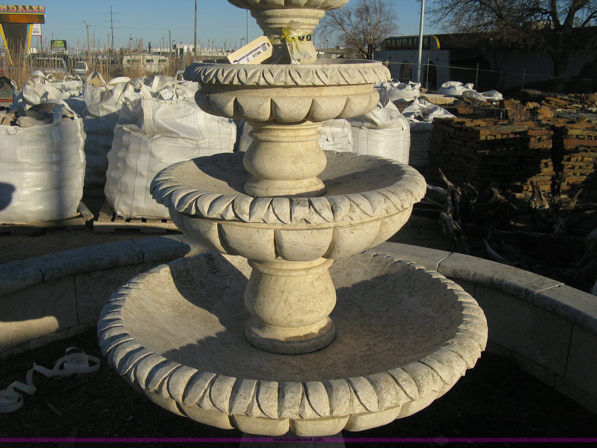 11' diameter four-tier Mediterranean carved fountain. Dry set as a display, Forklift will assist to load but buyer needs to bring labor to dismantle, Seller will advise regarding installation.. Shipping quotes available. Absolute Natural Stone. 10909 E Kellogg Drive. Wichita, KS 67207
