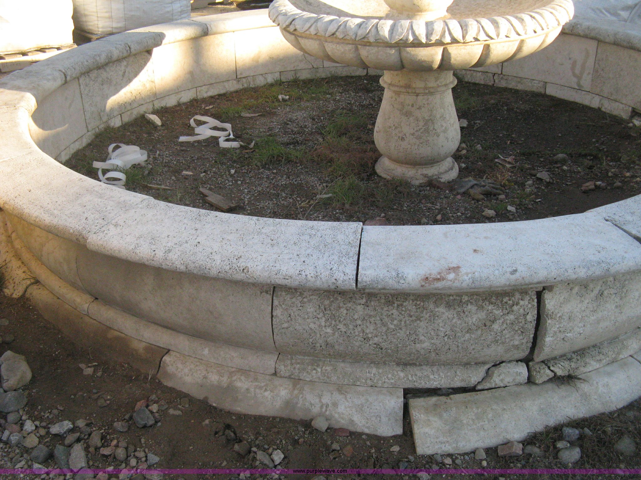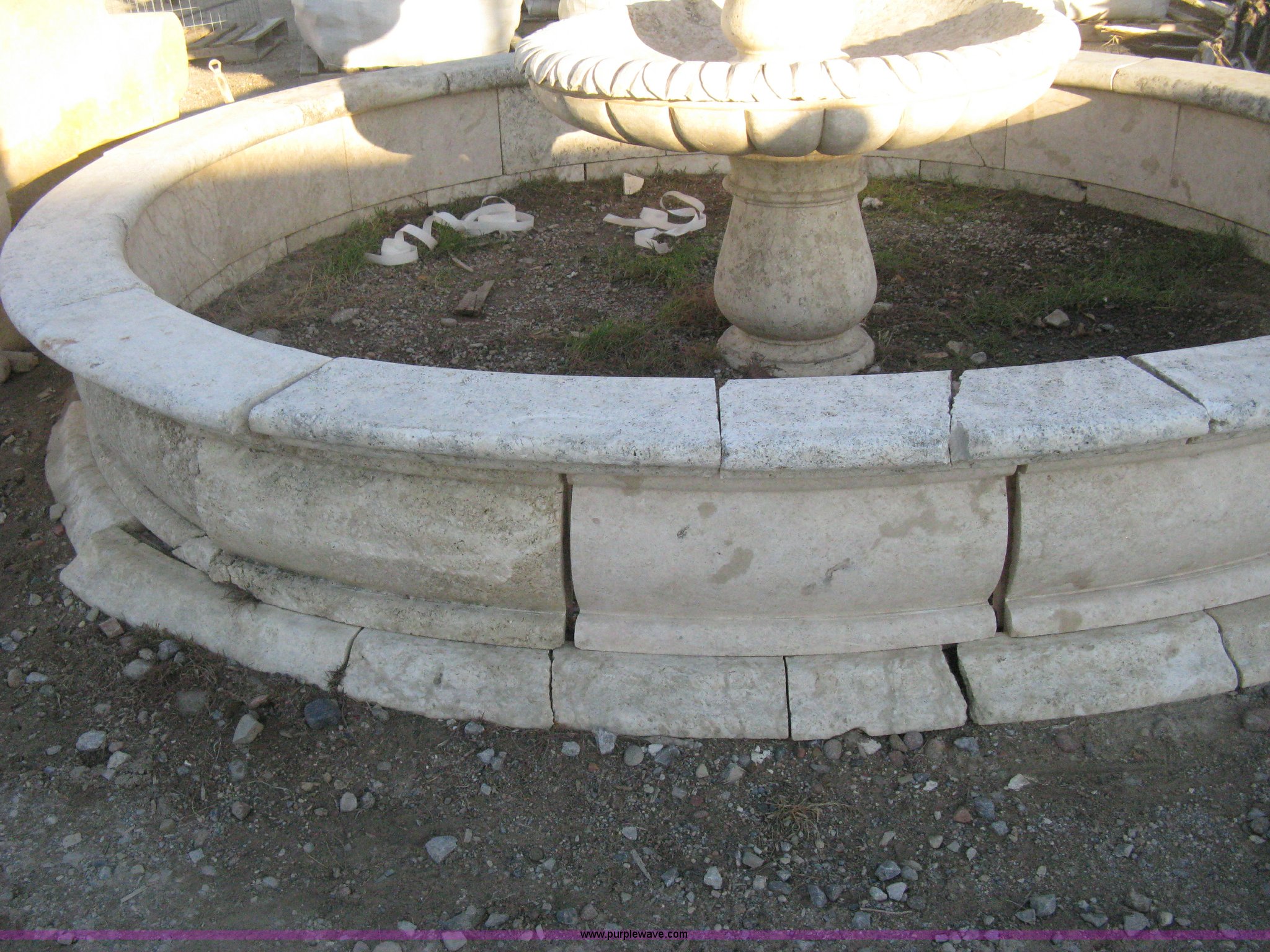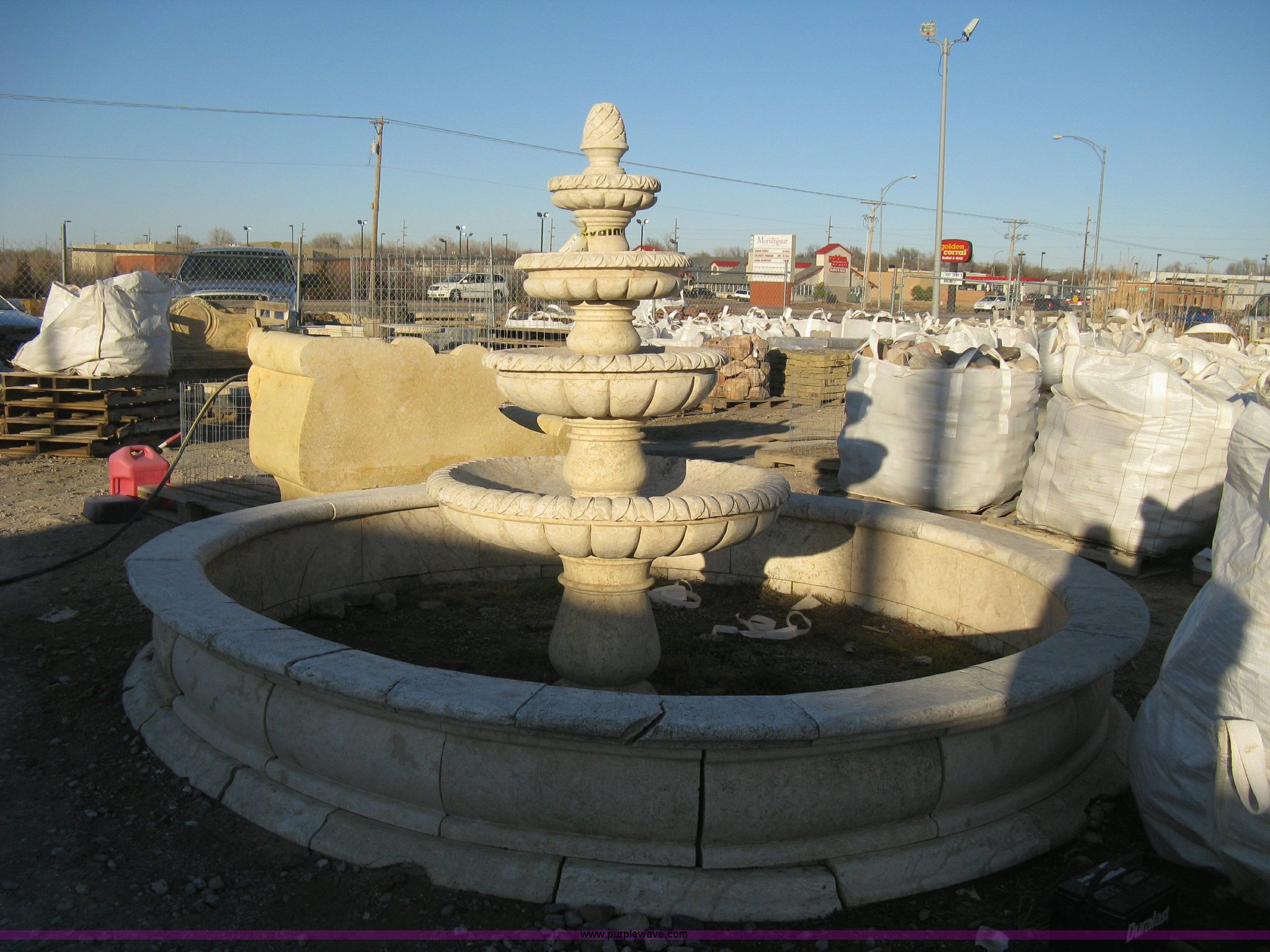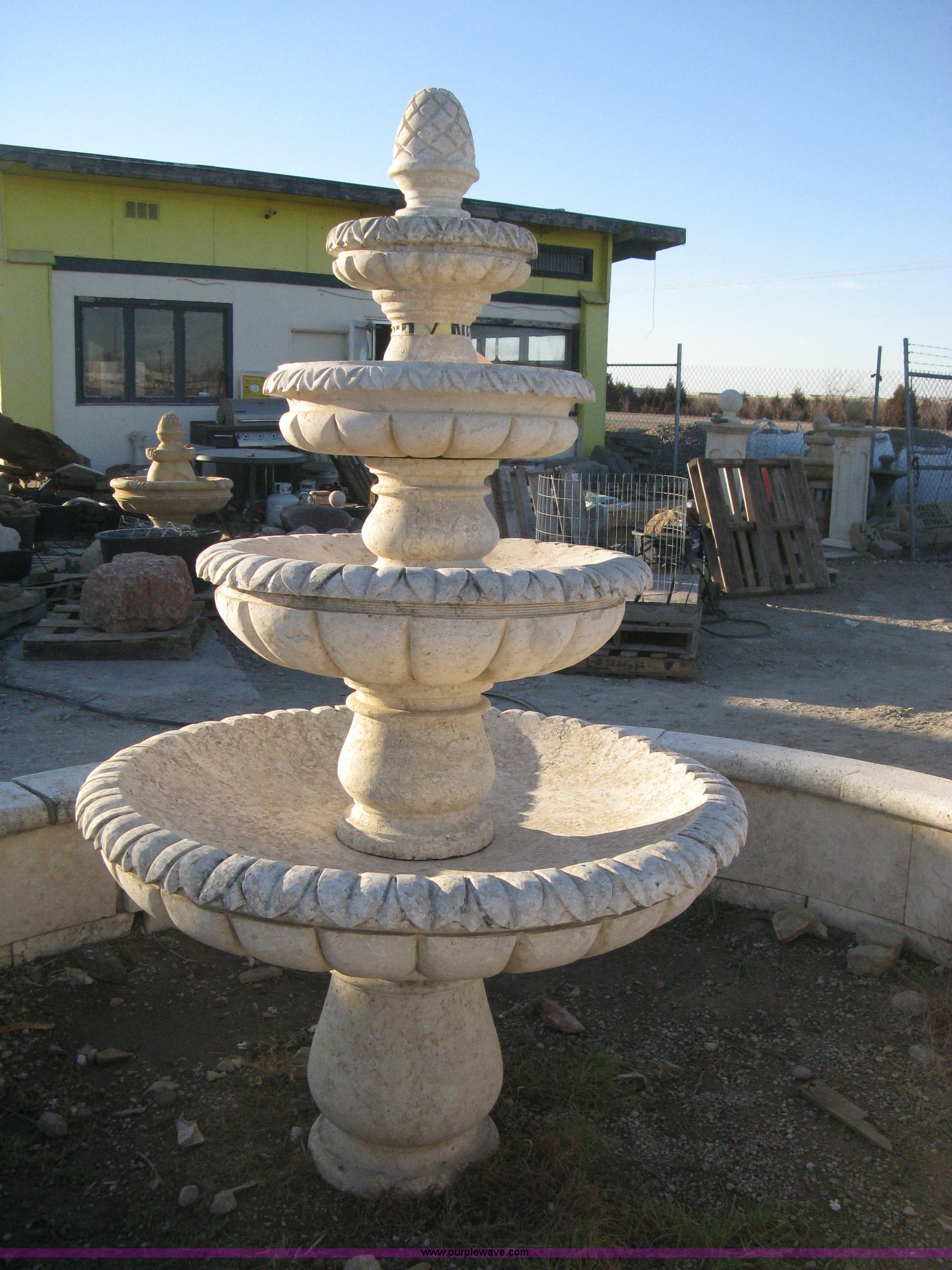 Purple Wave is selling a used Lawn and Garden in Kansas. This item is a 11' diameter four-tier Mediterranean carved fountain with the following: Dry set as a display, Forklift will assist to load but buyer needs to bring labor to dismantle., Seller will advise regarding installation.
