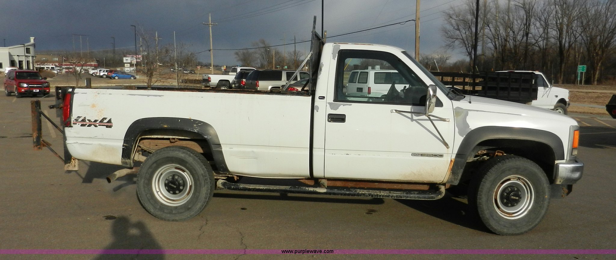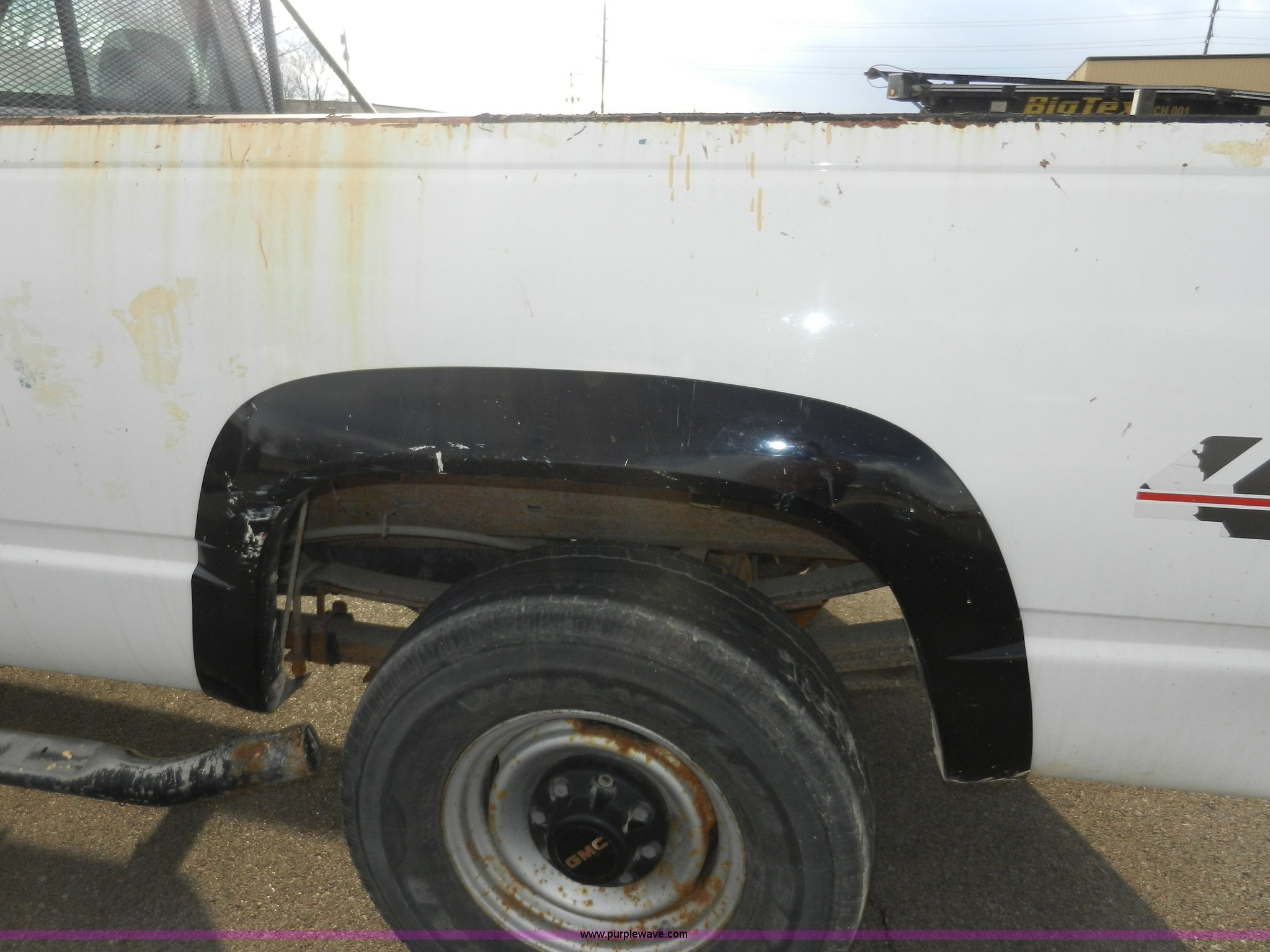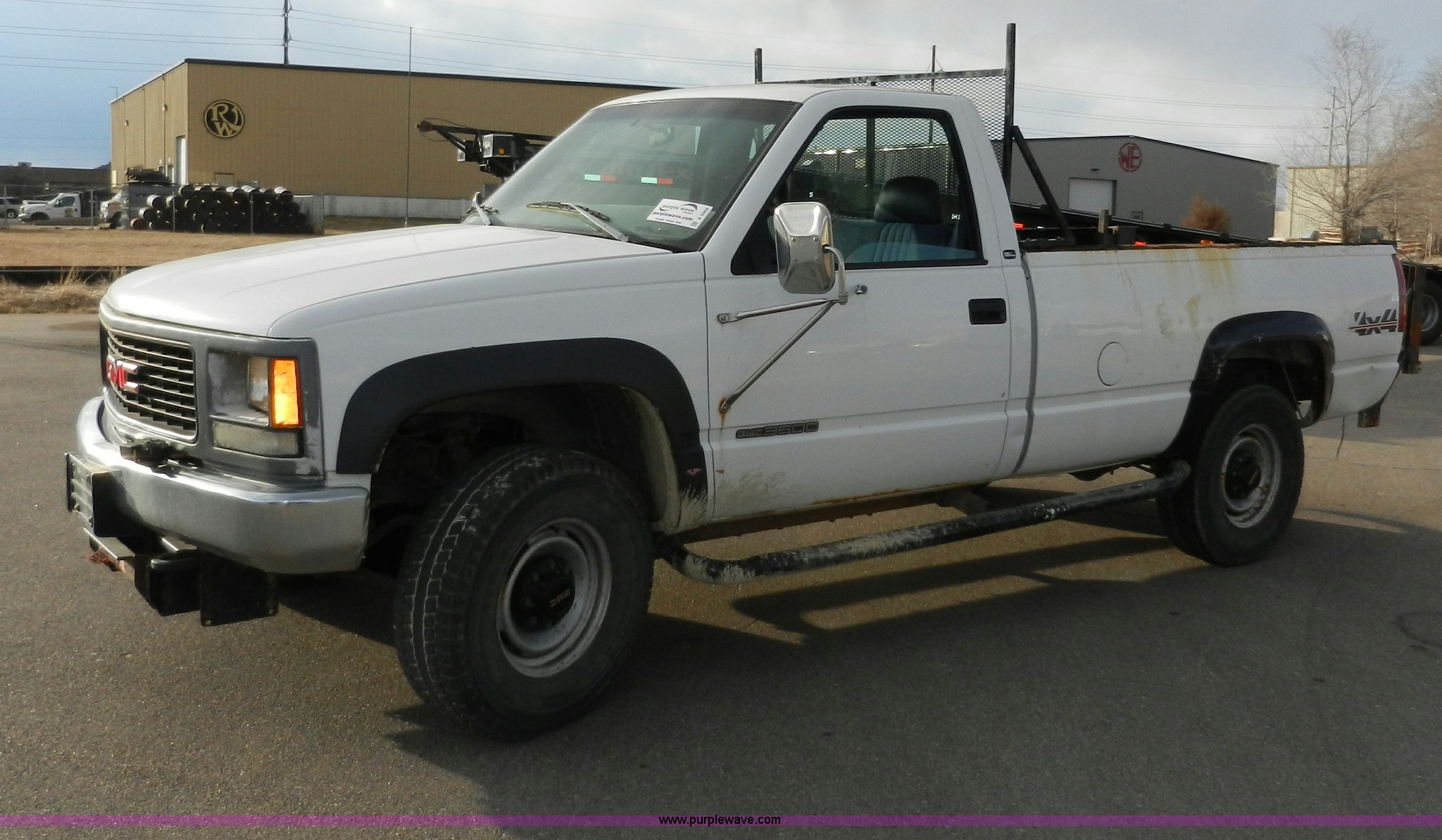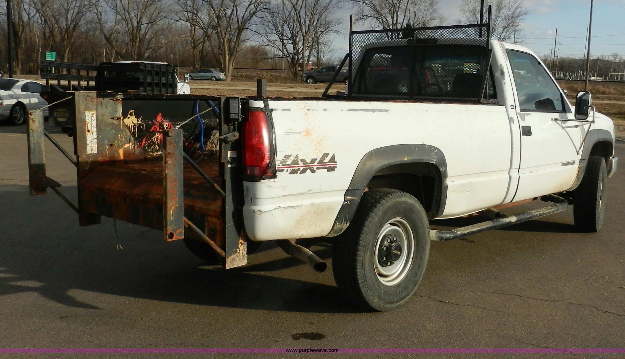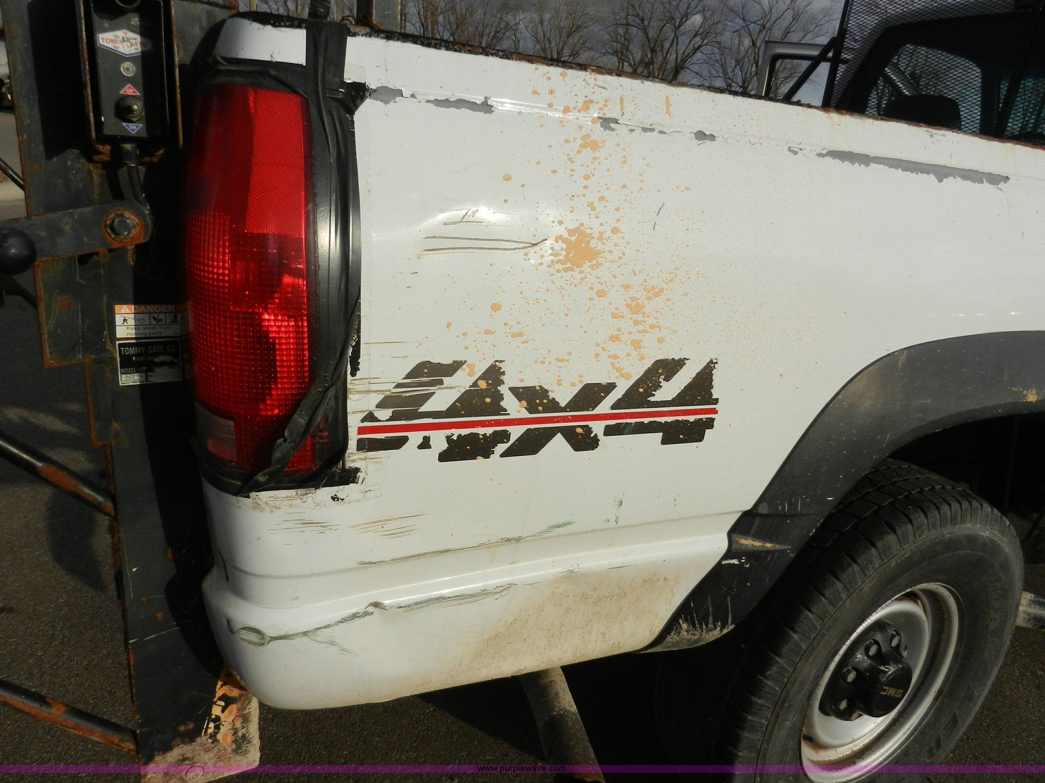 Purple Wave is selling a used Passenger Vehicle in Kansas. This item is a 1998 GMC Sierra 3500 SL pickup truck with the following: 80,893 miles on odometer, 5.7L V8 OHV 16V gas engine, Automatic transmission, Four wheel drive, Heat, AM/FM, Manual windows and locks, Cloth interior, Partial Tommy Gate lift unit, No tailgate, Side rails, Front tow hooks, 265/75R16 tires, Interior/exterior cosmetic damage, No interior door panel or handle on driver side, Body rust, Paint peeling, Driver side door will not lock