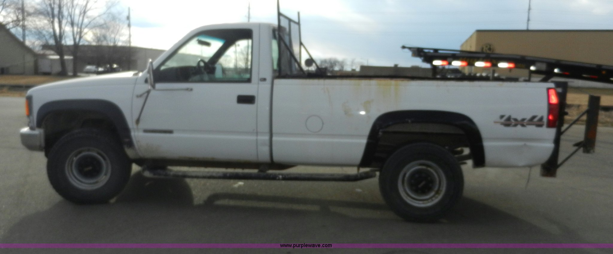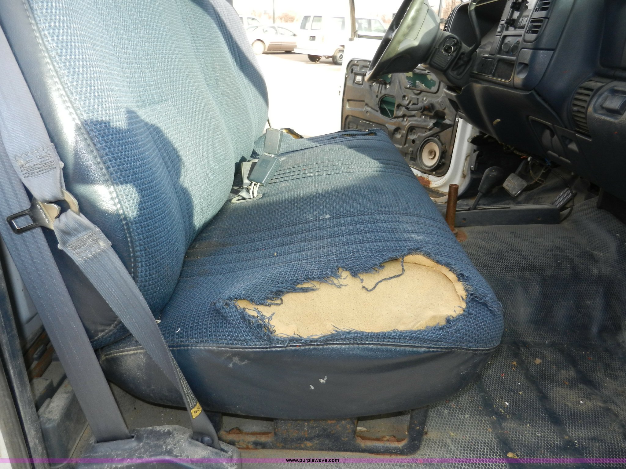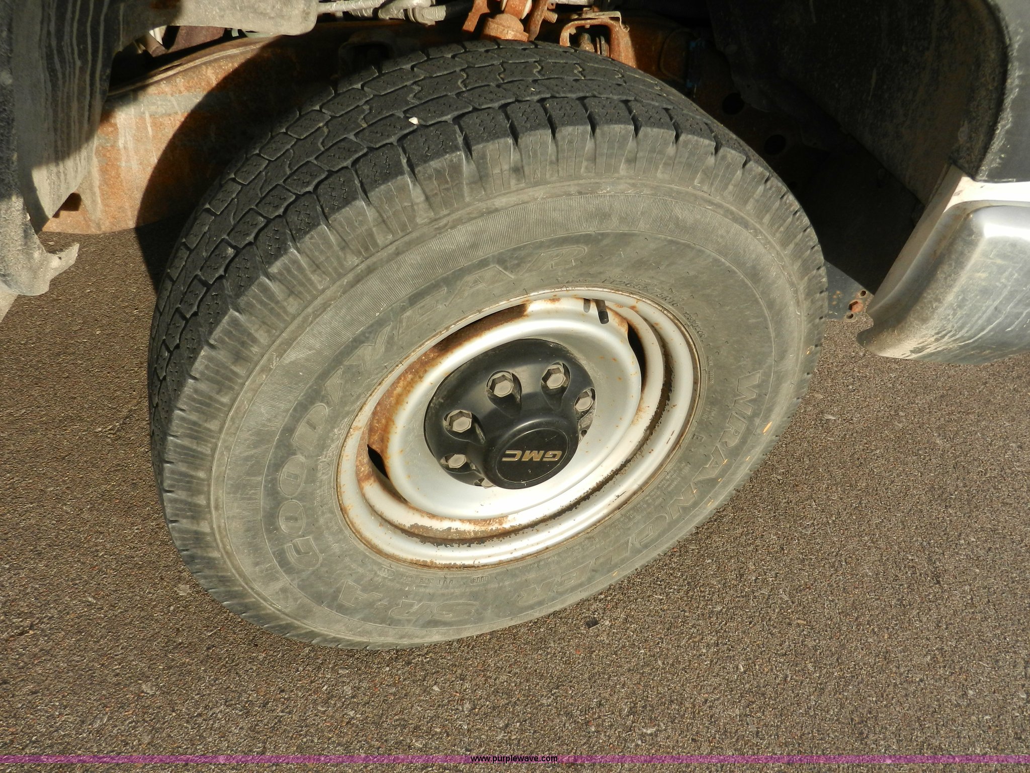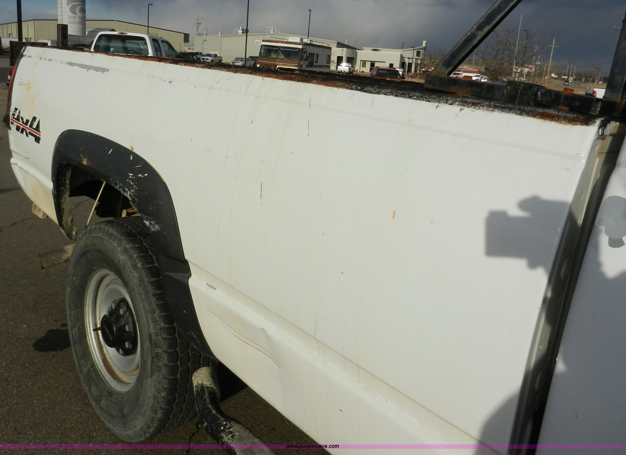 Purple Wave is selling a used Passenger Vehicle in Kansas. This item is a 1998 GMC Sierra 3500 SL pickup truck with the following: 80,893 miles on odometer, 5.7L V8 OHV 16V gas engine, Automatic transmission, Four wheel drive, Heat, AM/FM, Manual windows and locks, Cloth interior, Partial Tommy Gate lift unit, No tailgate, Side rails, Front tow hooks, 265/75R16 tires, Interior/exterior cosmetic damage, No interior door panel or handle on driver side, Body rust, Paint peeling, Driver side door will not lock