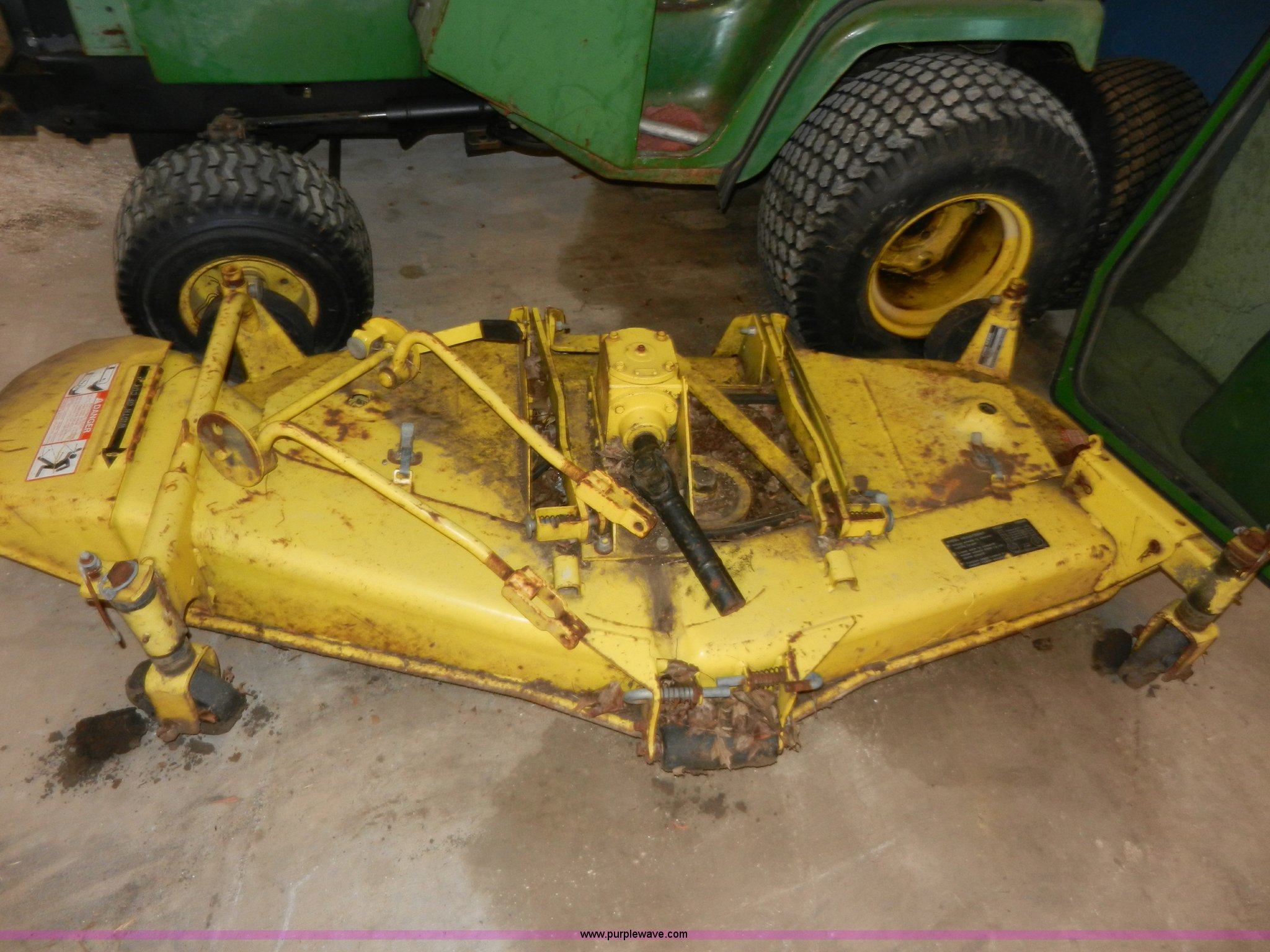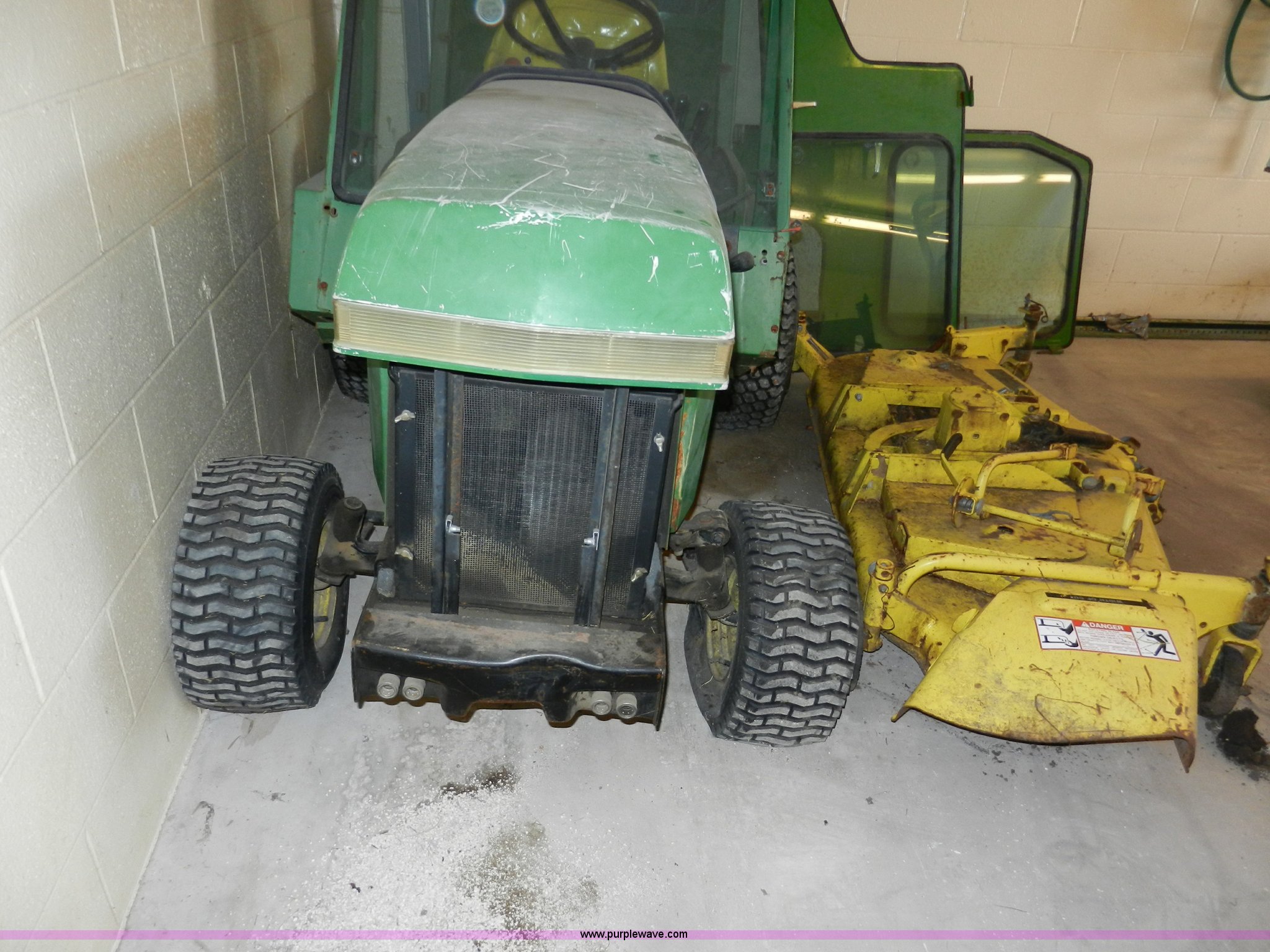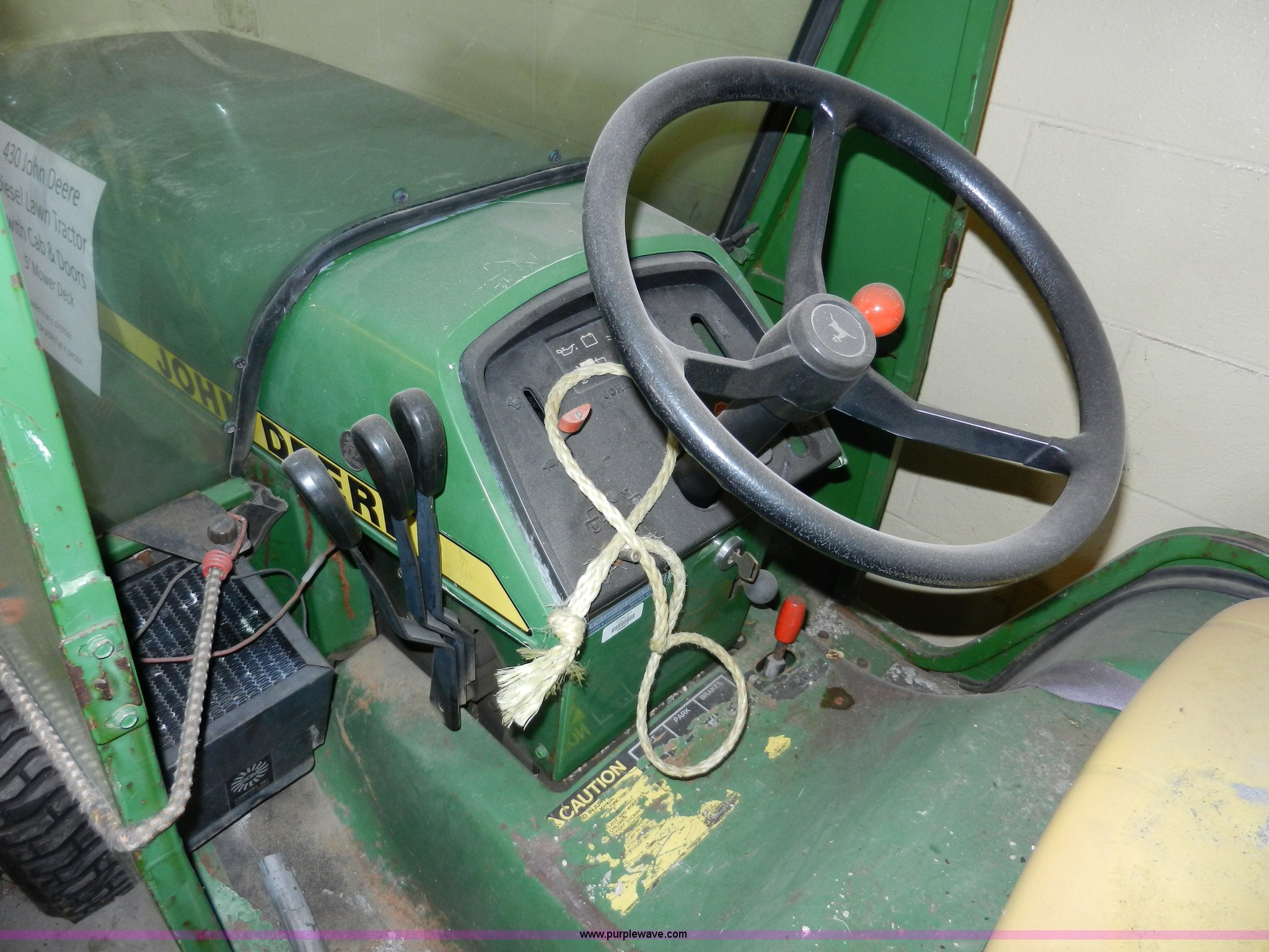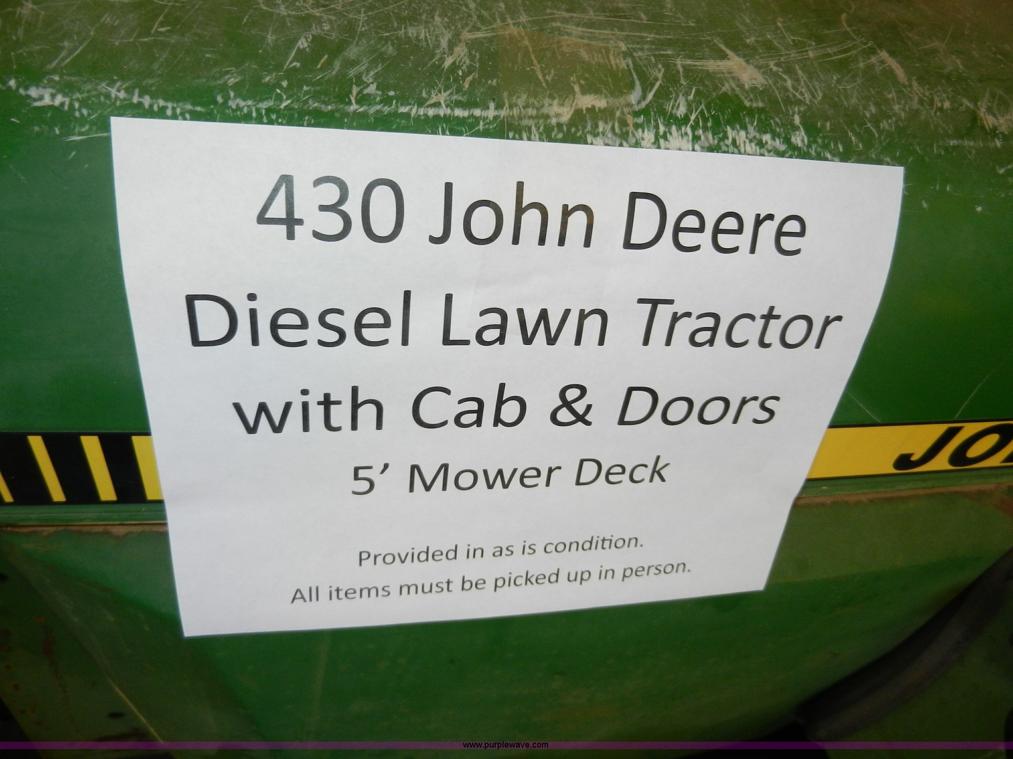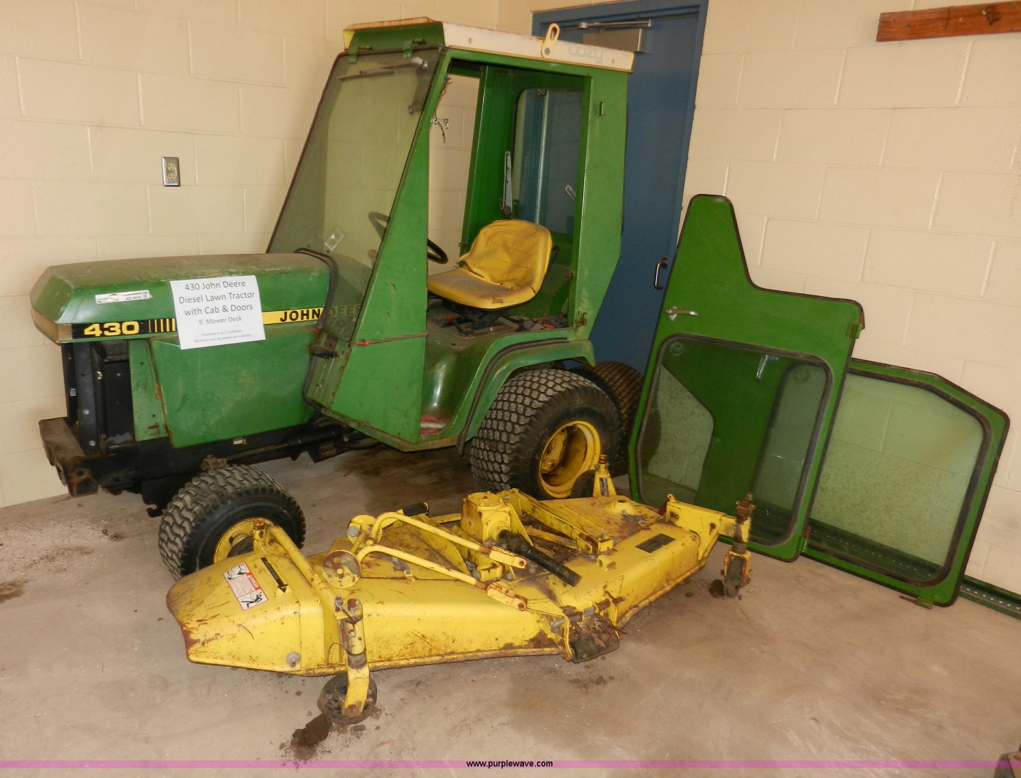 Purple Wave is selling a used Commercial Turf Mower in Kansas. This item is a John Deere 430 lawn tractor with the following: 5' cut, Deck wheels need replaced, Diesel engine, Cab and doors, Front and rear tires are flat, Need replaced, Unknown working condition, Serial M00430X421479