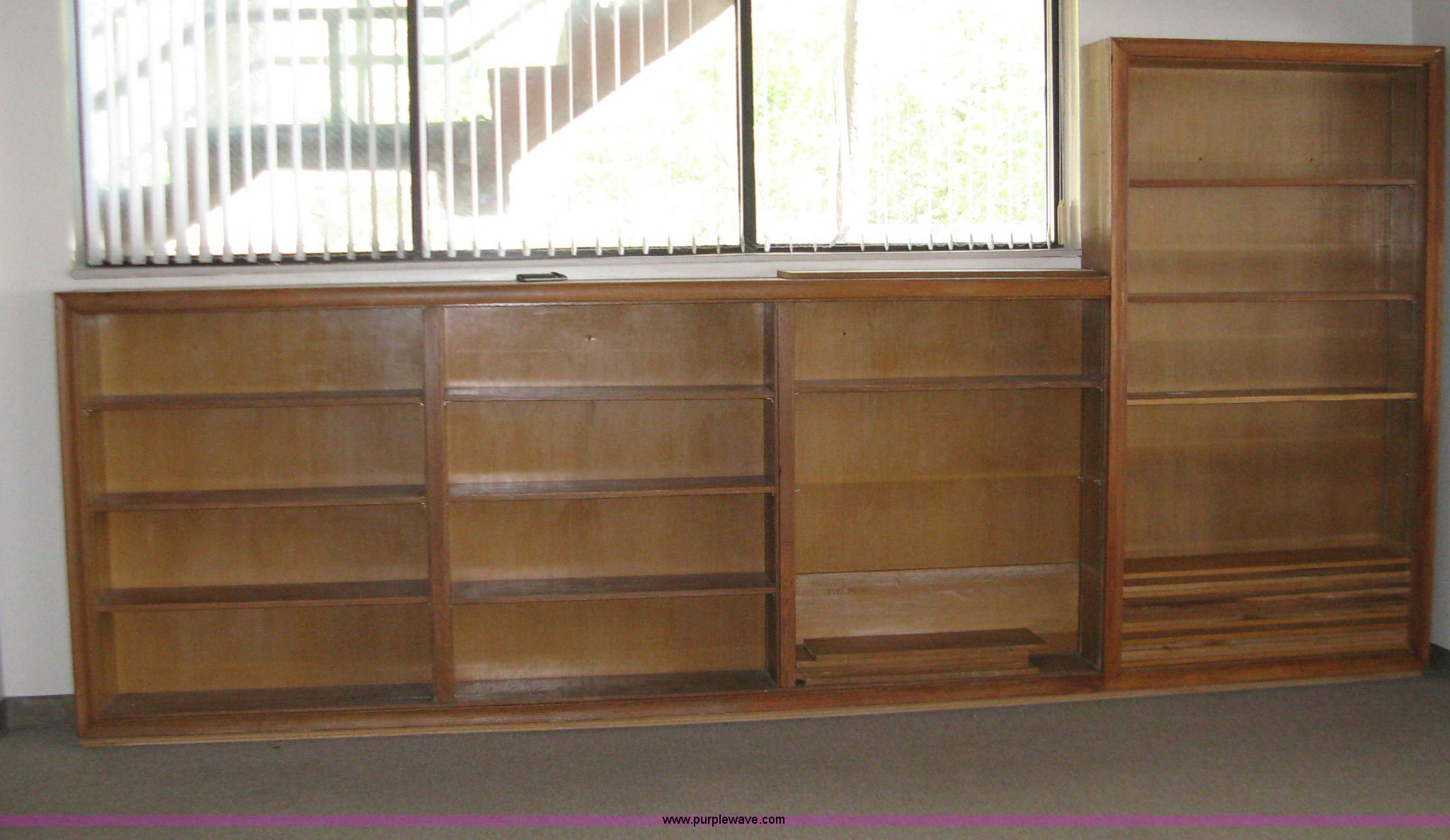 Purple Wave is selling a used Furniture in Kansas. This item is a Oak shelving unit with the following: 16' x 4'