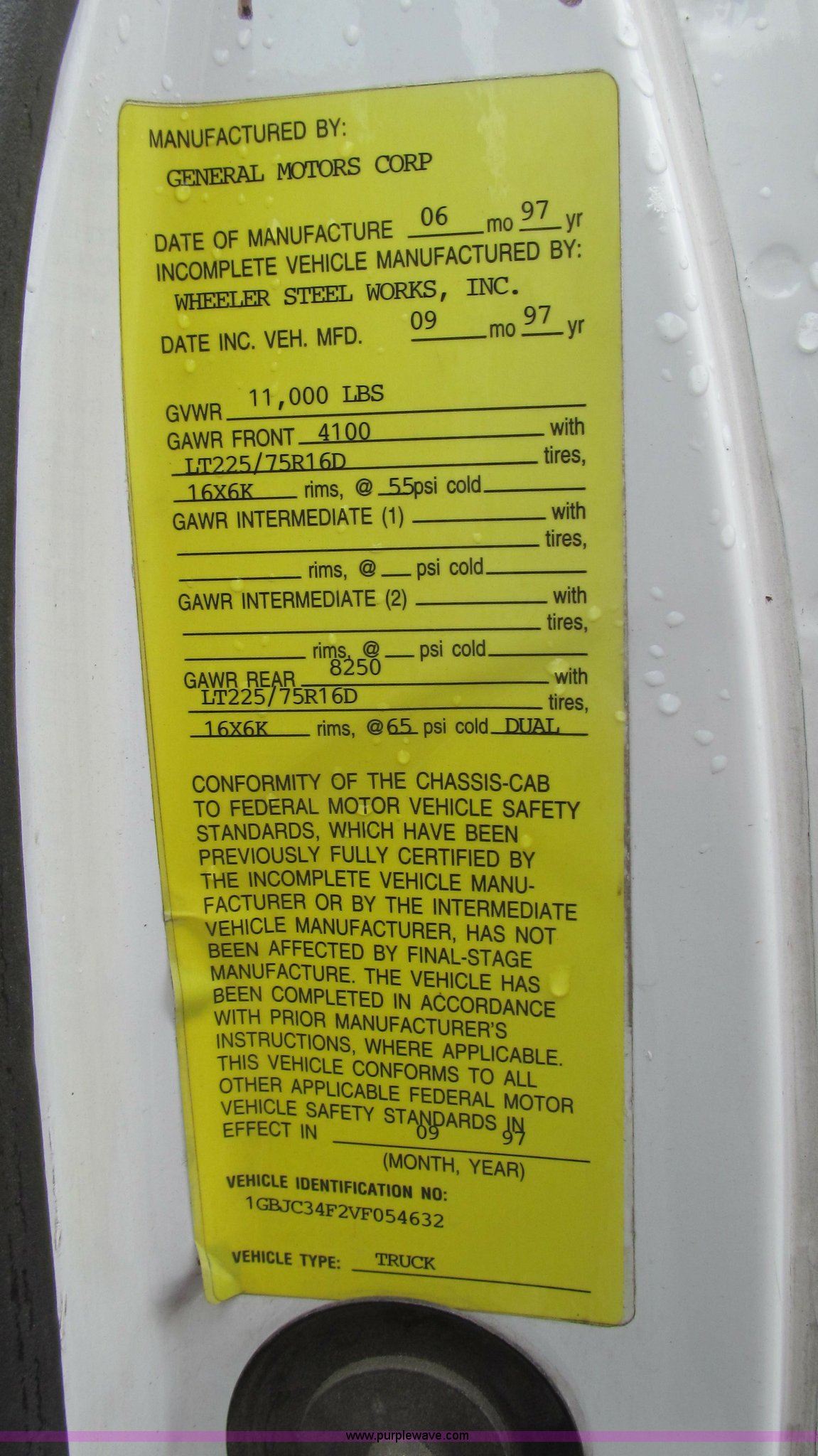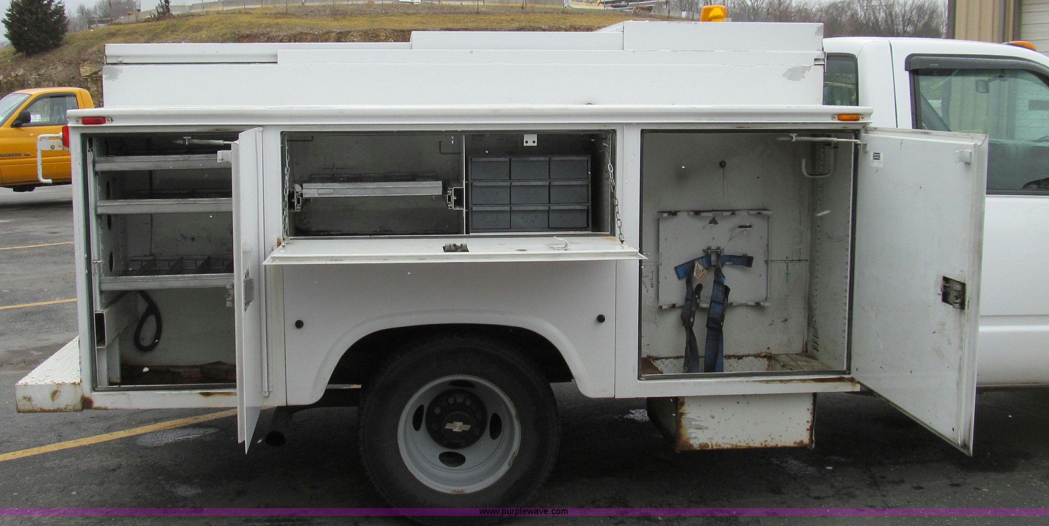 1997 Chevrolet 3500 utility truck. 198,561 miles on odometer, 6.5L V8 OHV 16V diesel engine, Automatic transmission, AC and heat, Manual windows and locks, Vinyl interior, Knapheide enclosed utility bed, LT225/75R16 tires, Transmission replaced at 197,377 miles in January 2012, Ball joints, brakes, and water pump replaced at 194,751 miles, Rust on right front fender and utility bed, EIN 5768. 1GBJC34F2VF054632. Shipping quotes available. Missouri Department of Transportation (MODOT - Central District). 1571 Missouri Blvd.. Jefferson City, MO 65102