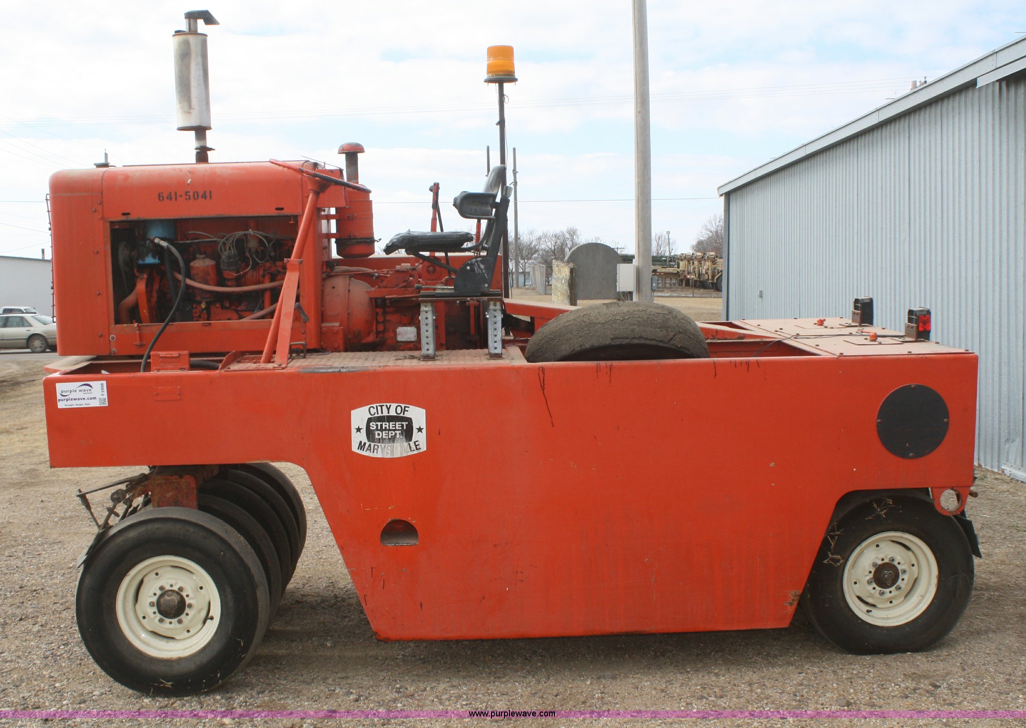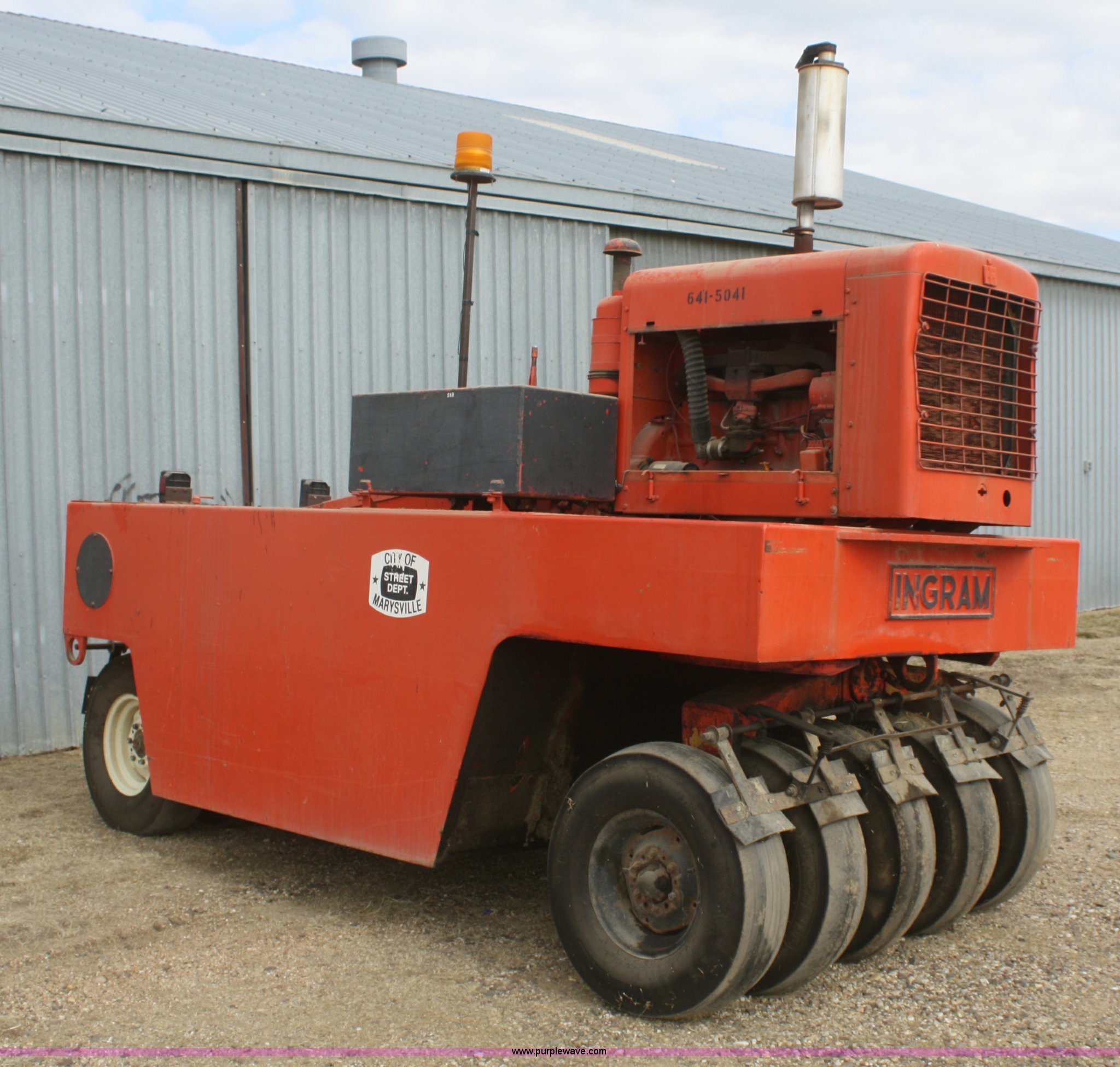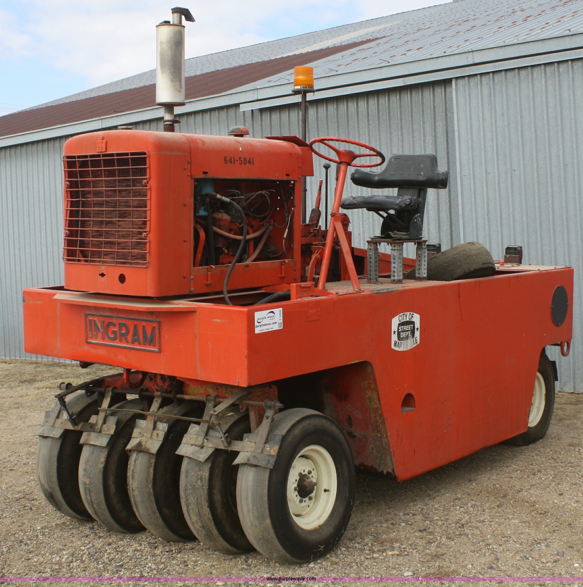 1971 Ingram 9-2800 nine wheel pneumatic roller. 1,147 hours on meter, Six cylinder gas engine, Four speed shuttle shift transmission, Brake master cylinder, engine tune up, new starter, parking brake shoes, transmission overhaul, left hand rear axle, bearings replaced or repaired 2008, Steering column bearings replaced 2010, Right hand rear axle and bearings, rear brake shoes, rear wheel cylinders, tires, and wheels replaced 2011, Small leak on steering cylinder, Unit was not used in 2012, Serial 411235P48. View equipment video. Shipping quotes available. City of Marysville. 209 N 8th Street. Marysville, KS 66508