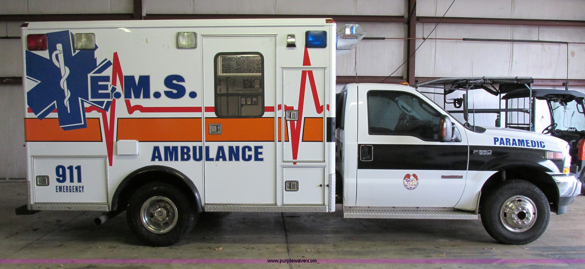 Purple Wave is selling a used Passenger Vehicle in Missouri. This item is a 2003 Ford F350 XL Super Duty ambulance with the following: 110,324 miles on odometer, 6.0L V8 OHV 32V turbo diesel engine, Engine is weak, Automatic transmission, AC and heat, Tilt, Cruise, AM/FM, Power windows, locks, and mirrors, Cloth interior, Ambulance Prep package, Wheeled Coach Mfg. ambulance bed, Approx. 144" x 91" x 84" exterior, 165" wheelbase, 235/85R16 tires, Buyer will be required to sign liability release with additional information, View release and additional information