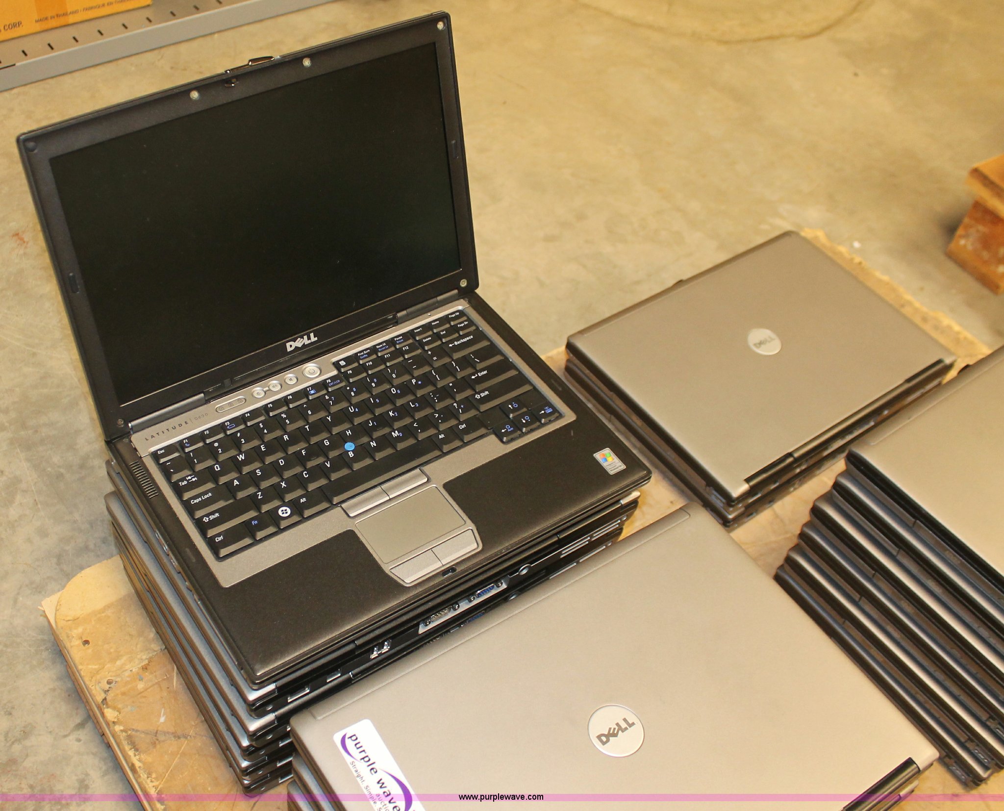 Purple Wave is selling a used Computers in Kansas. This item is a (26) Dell Lattitude D630 laptop computers with the following: Windows XP product keys, Intel Core 2 Duo, 1 GB ram, 80 GB hard drive, All units include standard internal primary battery, secondary battery, and CD-rom drive, All have power supplies, Machines have been wiped