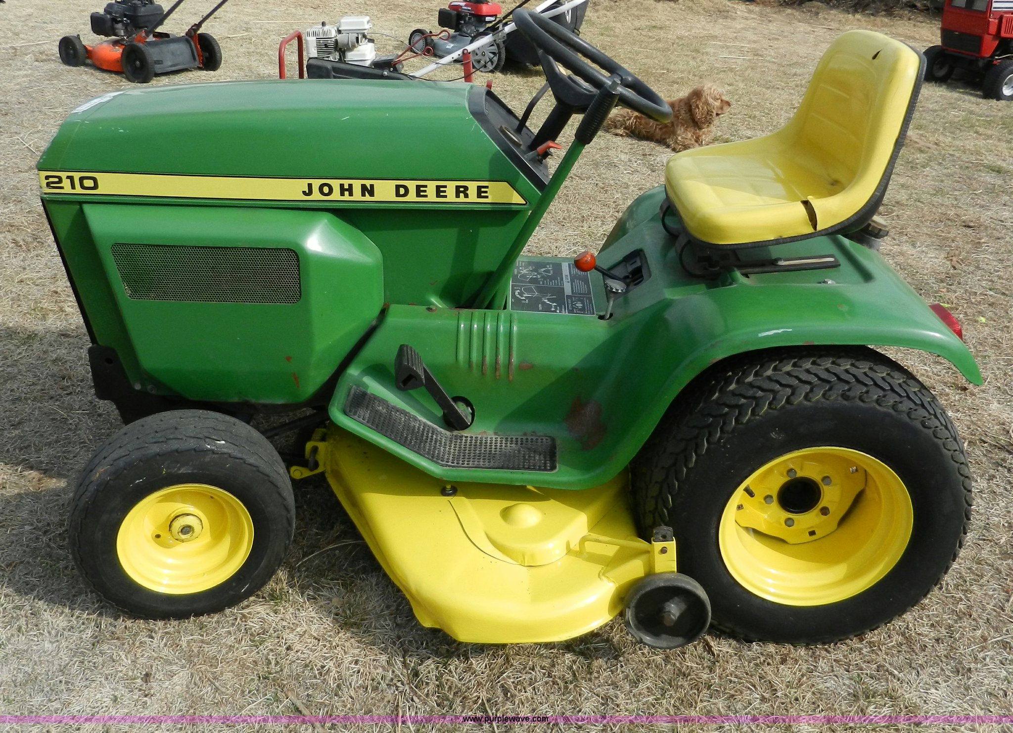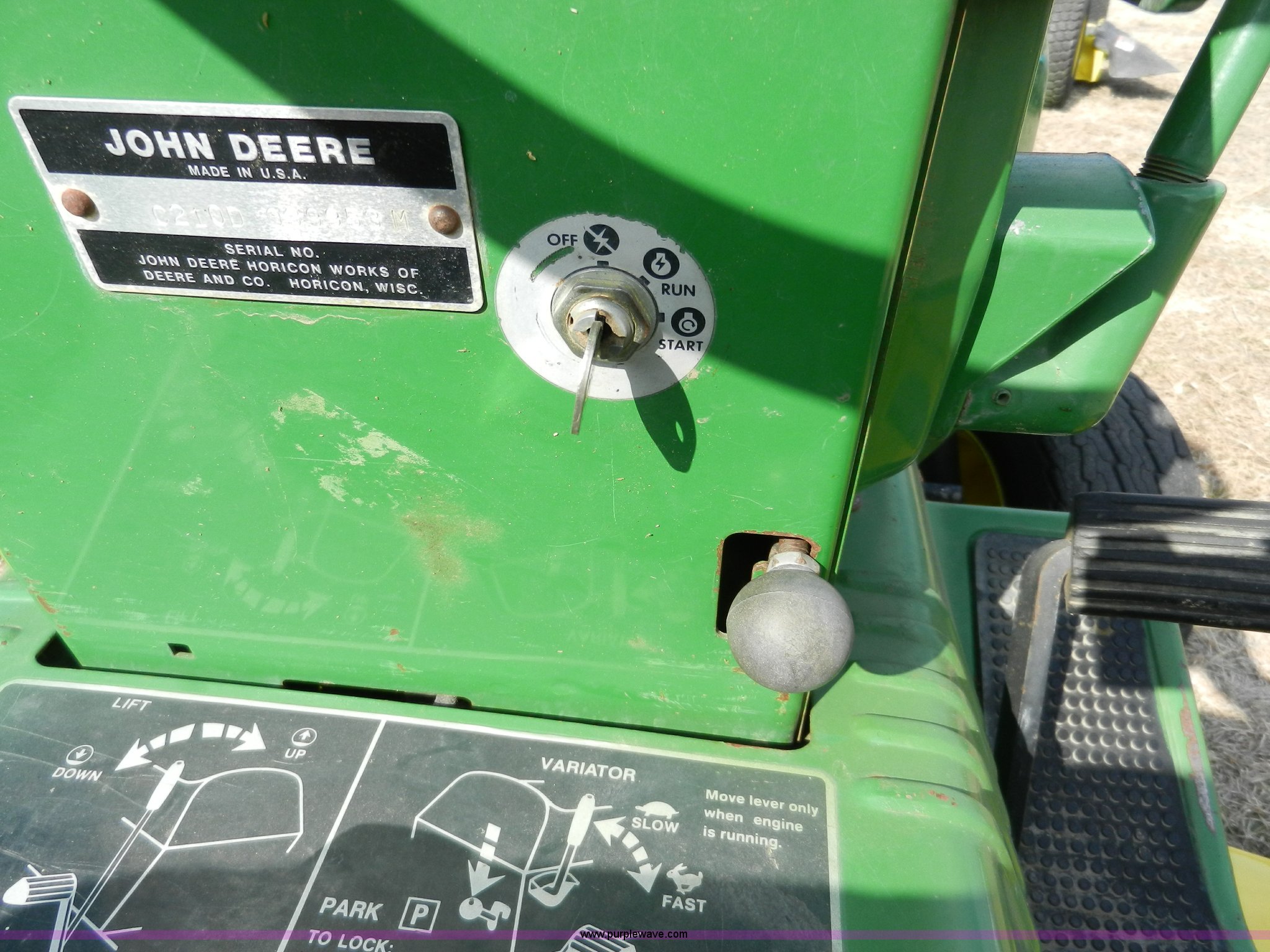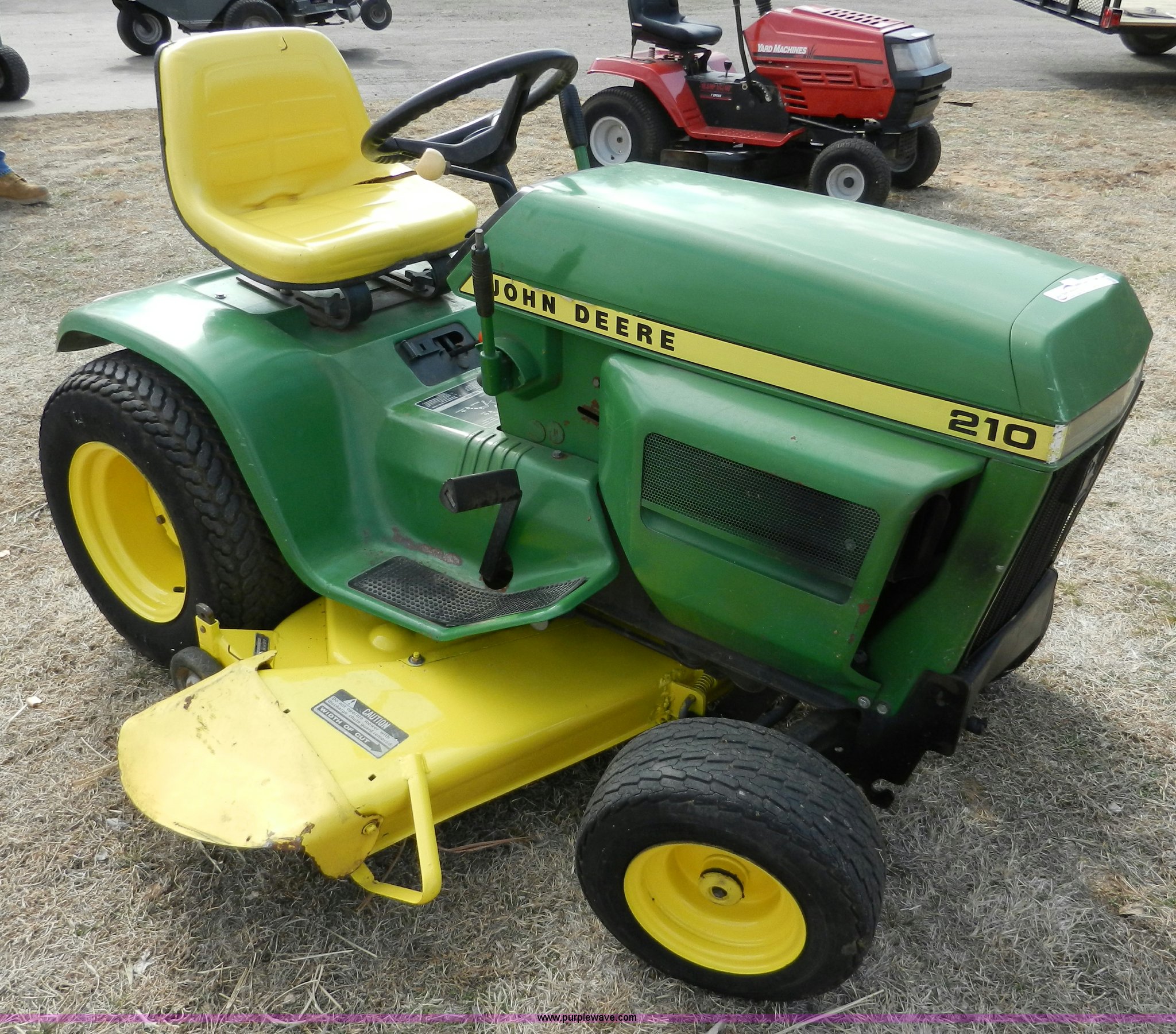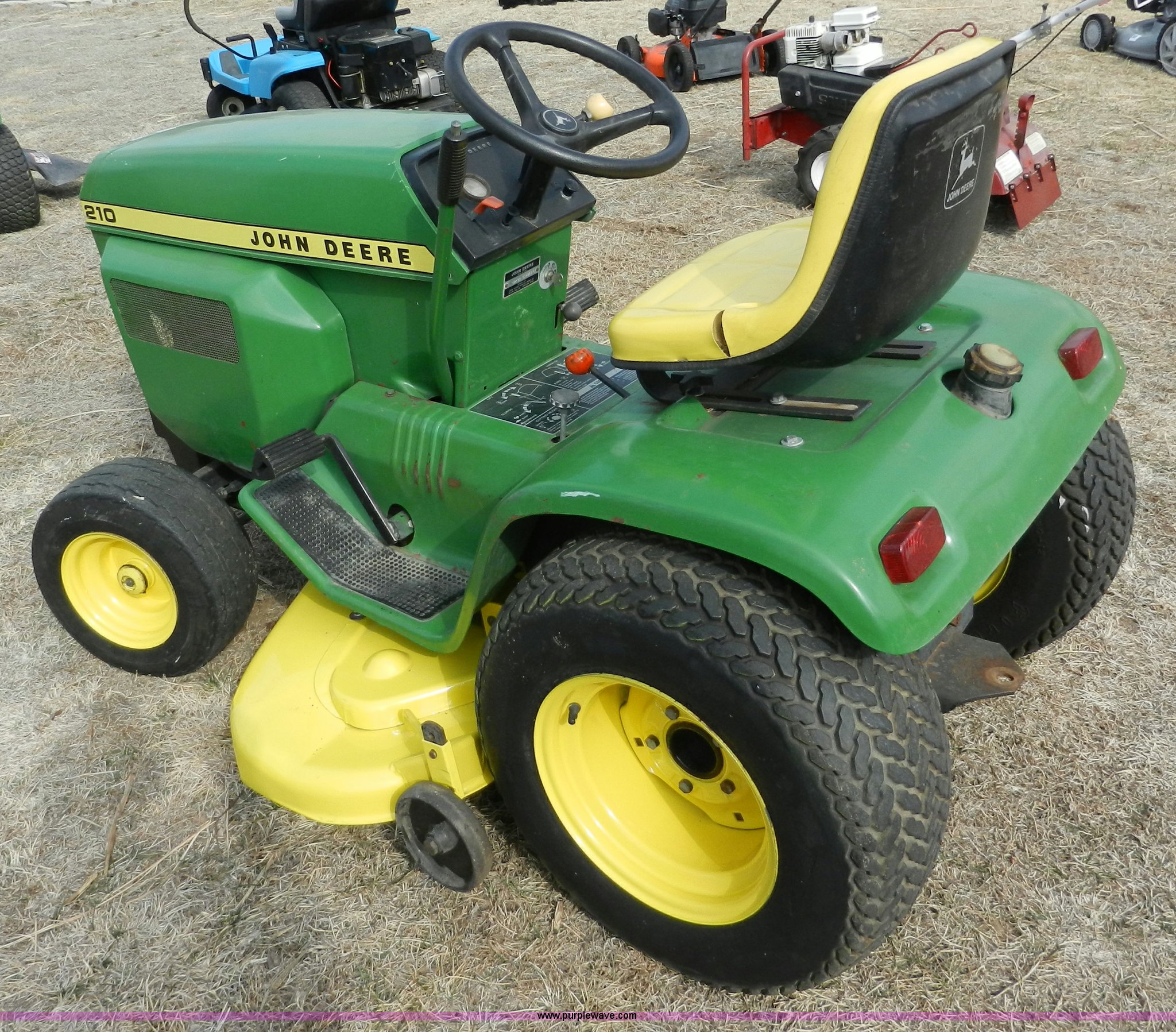 Purple Wave is selling a used Lawn and Garden in Kansas. This item is a John Deere 210 garden tractor with the following: 48" cut, Kohler 10 HP cast iron gas engine, Vari drive four speed transmission, 16.6.50 x 8 front tires, 23-12 x 12 rear tires, Recently replaced battery