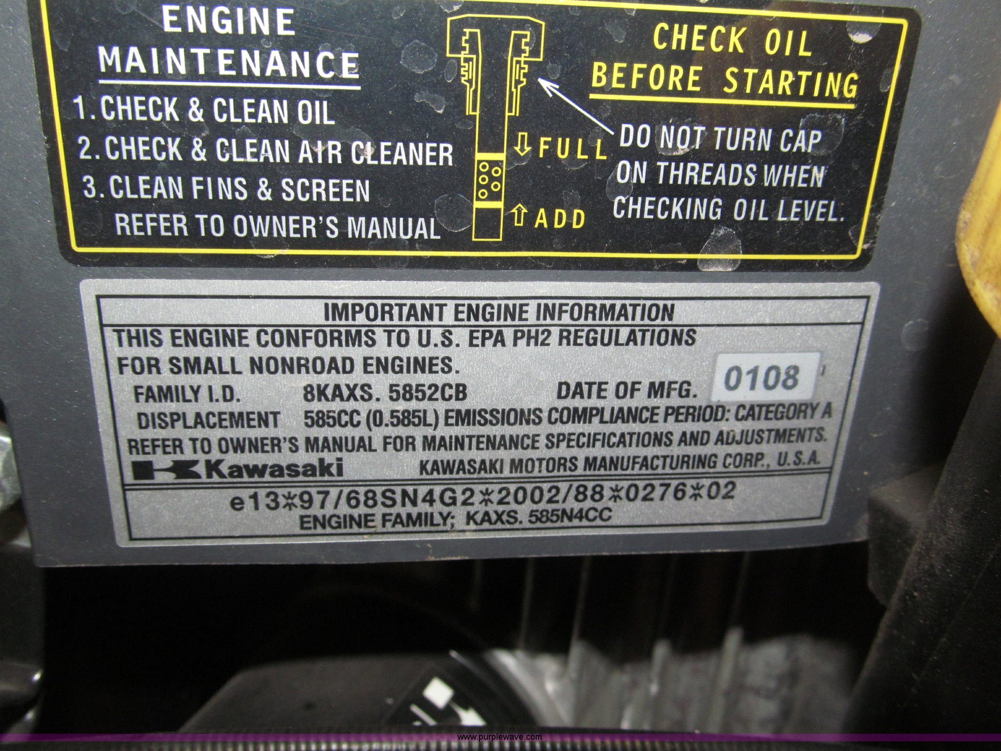 Purple Wave is selling a used Commercial Turf Mower in Nebraska. This item is a 2008 Husqvarna WH4817 commercial lawn mower with the following: Model 966947002, 48" cut, Kawasaki FH541V OHV KAI 17 HP V-twin gas engine, Manual start, Kanzaki DUP10 pump, Serial 10S11498Z, Easy access top plate on mower deck, 5.3 gallon top fill fuel tank, Adjustable handle and deck height, Side mount hydraulic tank, Pump/wheel motor transmission, Carlisle 9x3.50-4NHS front swivel tires, Kenda 16x7.50-8 rear turf tires, No discharge chute, Unused, Serial 083769751