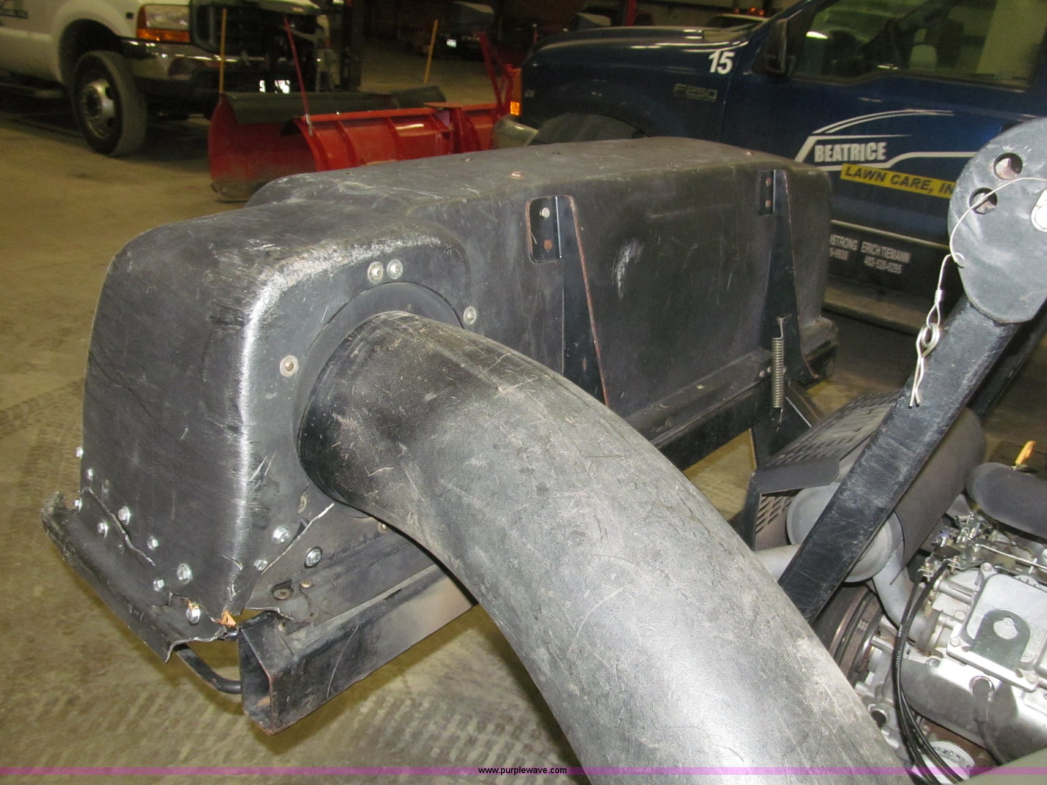 Purple Wave is selling a used Commercial Turf Mower in Nebraska. This item is a Exmark Lazer ZXS commercial lawn mower with the following: 1,016 hours on meter, 72" cut, Vanguard OHV V-twin gas engine, 35 HP, Hydrostatic transmission, Dual side-mount fuel tanks, Lever control, Left rear mounted hydraulic tank, UltraVac side blower rear bagger, Flip up pulley/belt access, Behind feet storage compartment, 13x6.50-6NHS front swivel tires, Carlisle 26x12.00-12NHS rear tires, Unit# 101