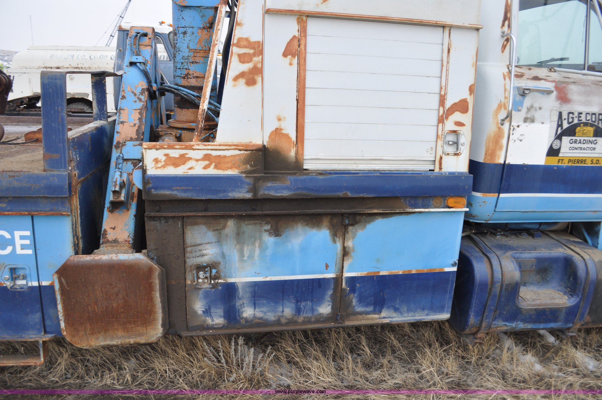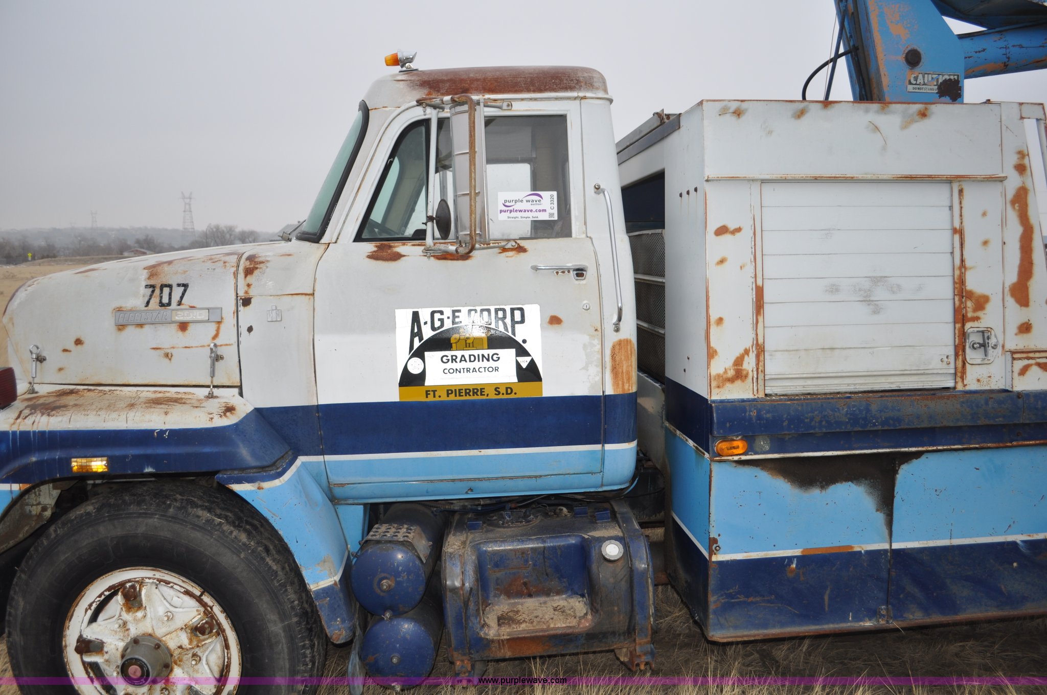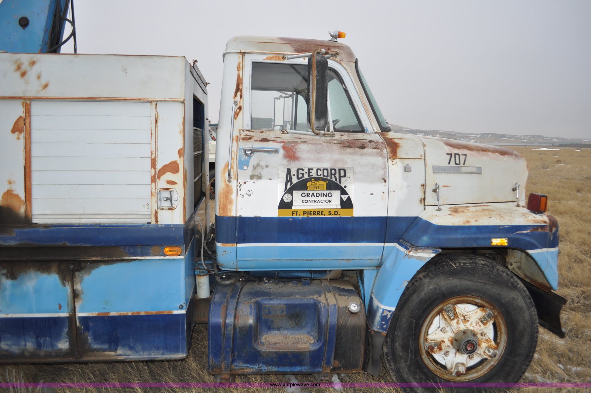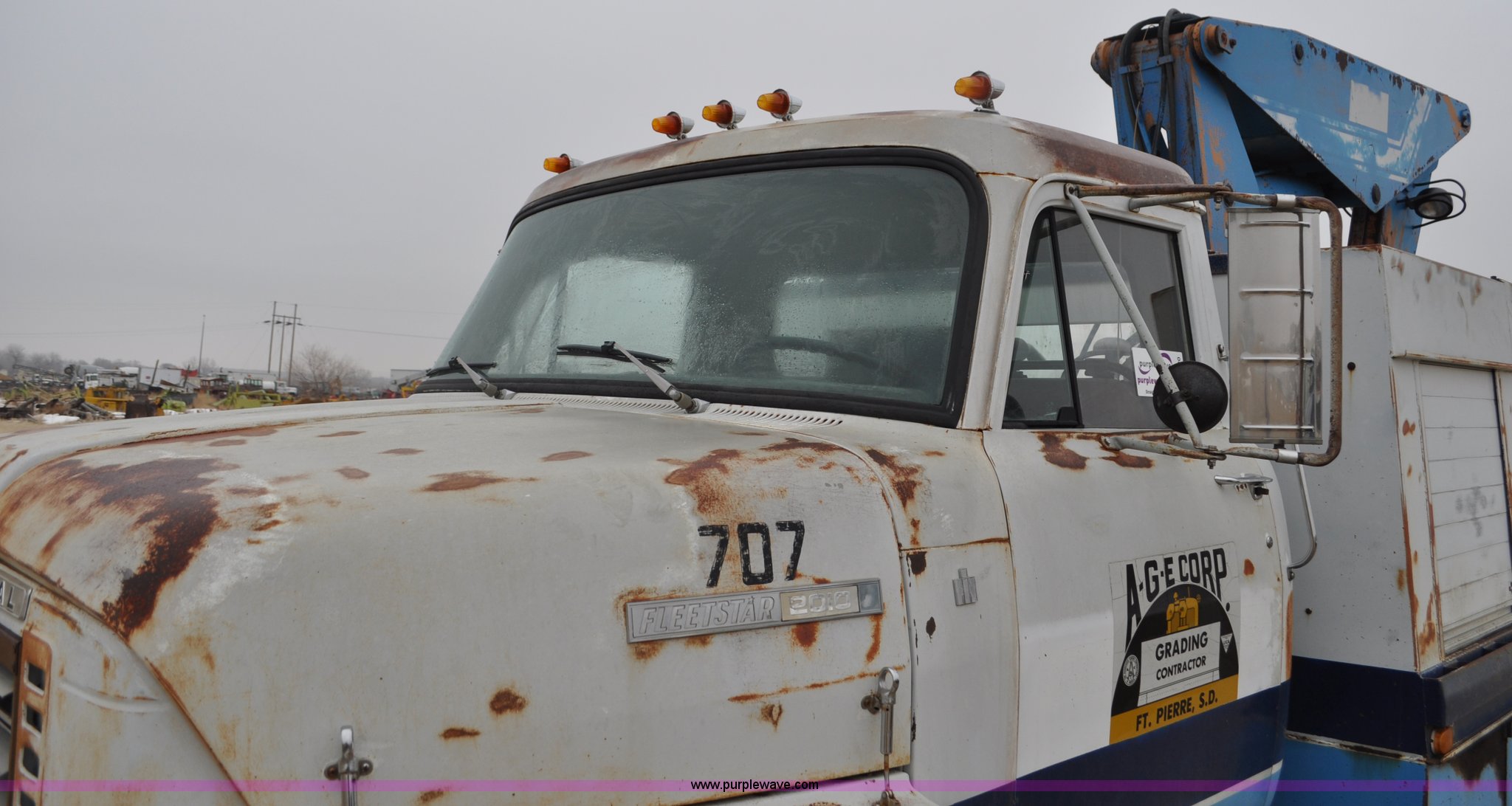 1976 International Fleetstar 2010A Fleet Corp tire truck. 120,472 miles on odometer, IHC 478 gas engine, Five speed manual transmission Two speed rear end, Heat, P&H MFG. Co. FEC crane Hydraulic outriggers, PTO driven hydraulics, Dual side controls, Serial 3000-145, Dressor air compressor Series 700, Wisconsin VH4D gas engine, Engine is stuck, Serial 457X4461, Air hose reel, 13'L steel bed Six tool compartments, Pin hitch, Dual fuel tanks, PTO, Spring suspension, Air brakes, 220" wheel base, 10.00-20 tires, No fuel , Dead battery, Running when parked, Unit# 707. D1222FGB17750. Shipping quotes available. A-G-E Corporation. 704 W Highway 14 and 34. Ft. Pierre, SD 57532