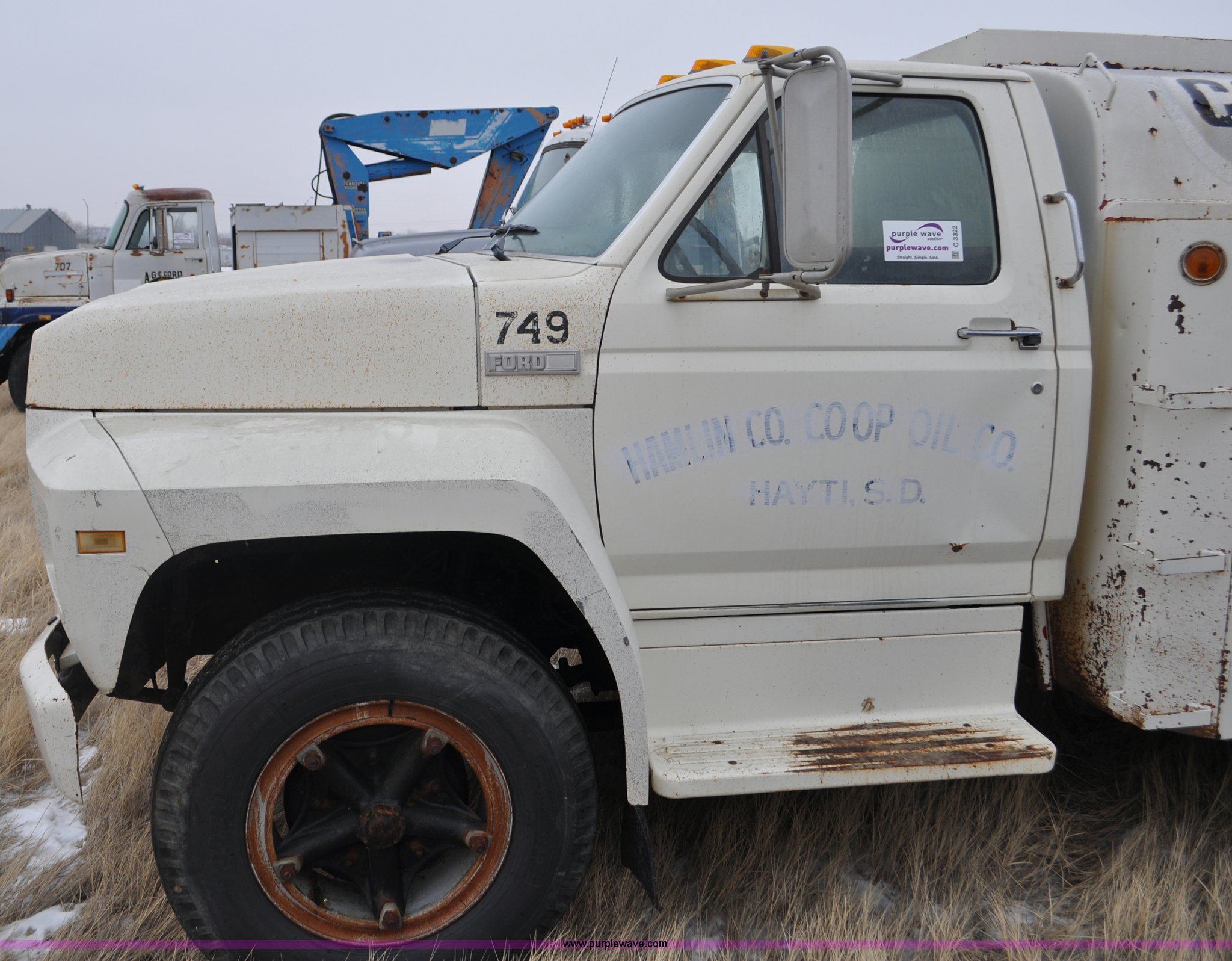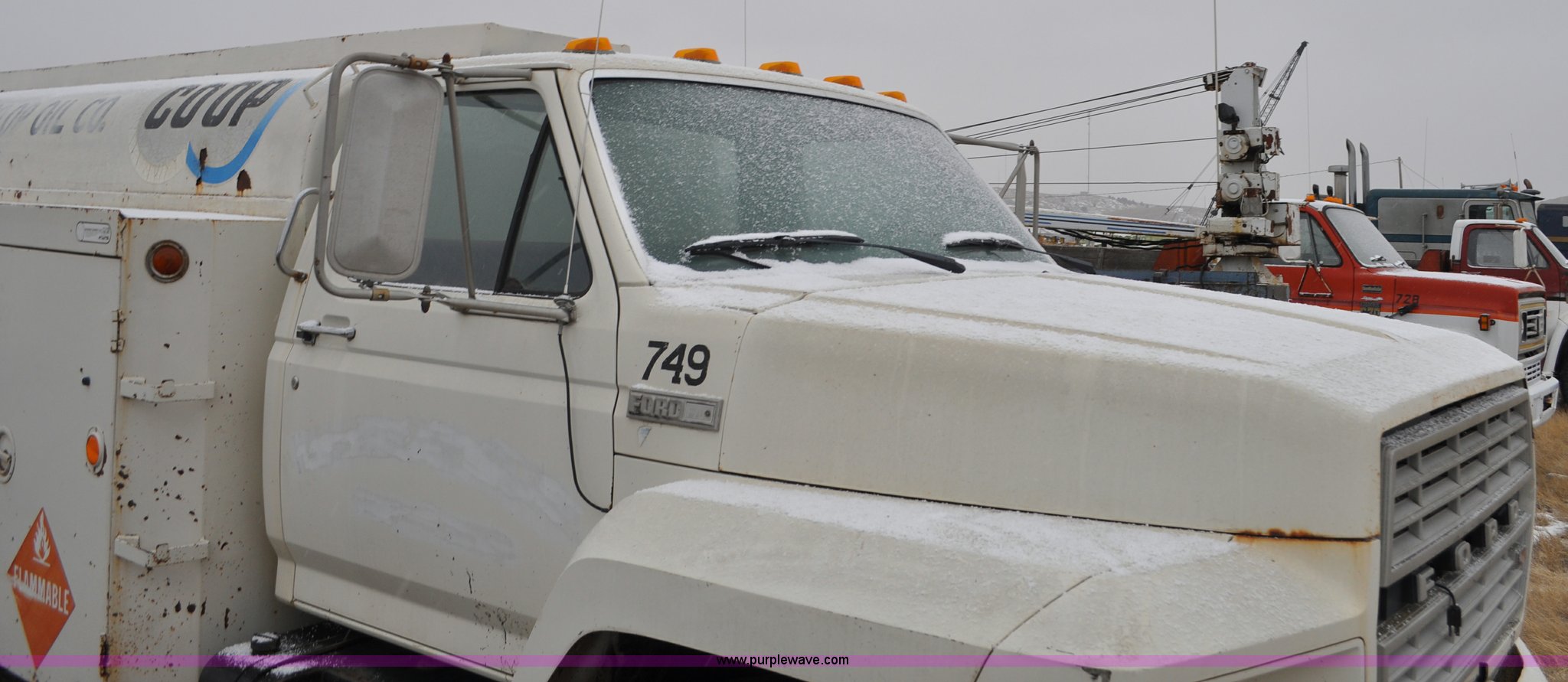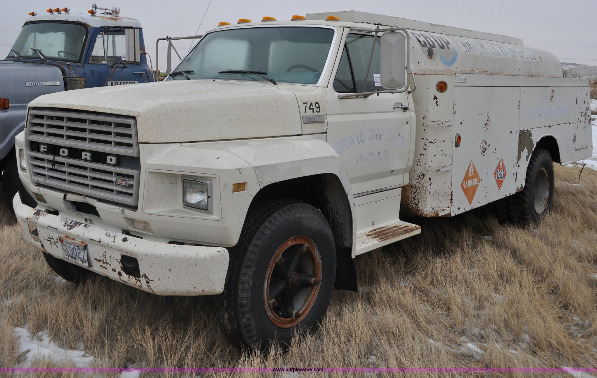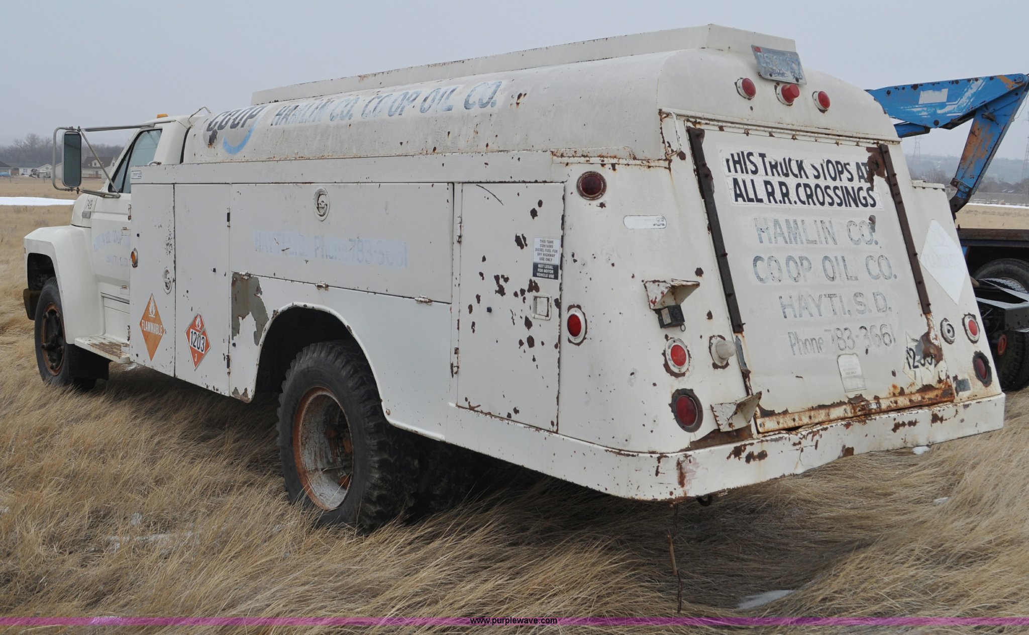 Purple Wave is selling a used Fuel Truck in South Dakota. This item is a 1980 Ford F700 fuel truck with the following: 94,470 miles on odometer, Lima 470 CID 4V gas engine, Four speed manual transmission, Two speed rear end, Brown fuel body, Five compartments, Smith fuel meters, Retractable hose reels, One hose in compartment, Four tool compartments, Single fuel tank, PTO, Spring suspension, Hydraulic brakes, 177" wheel base, 10.00-20 tires, GVWR 23,100 lbs, No fuel, Dead battery, Running when parked, Unit# 749