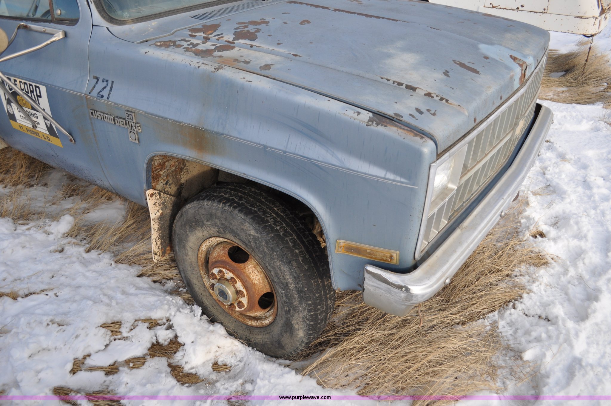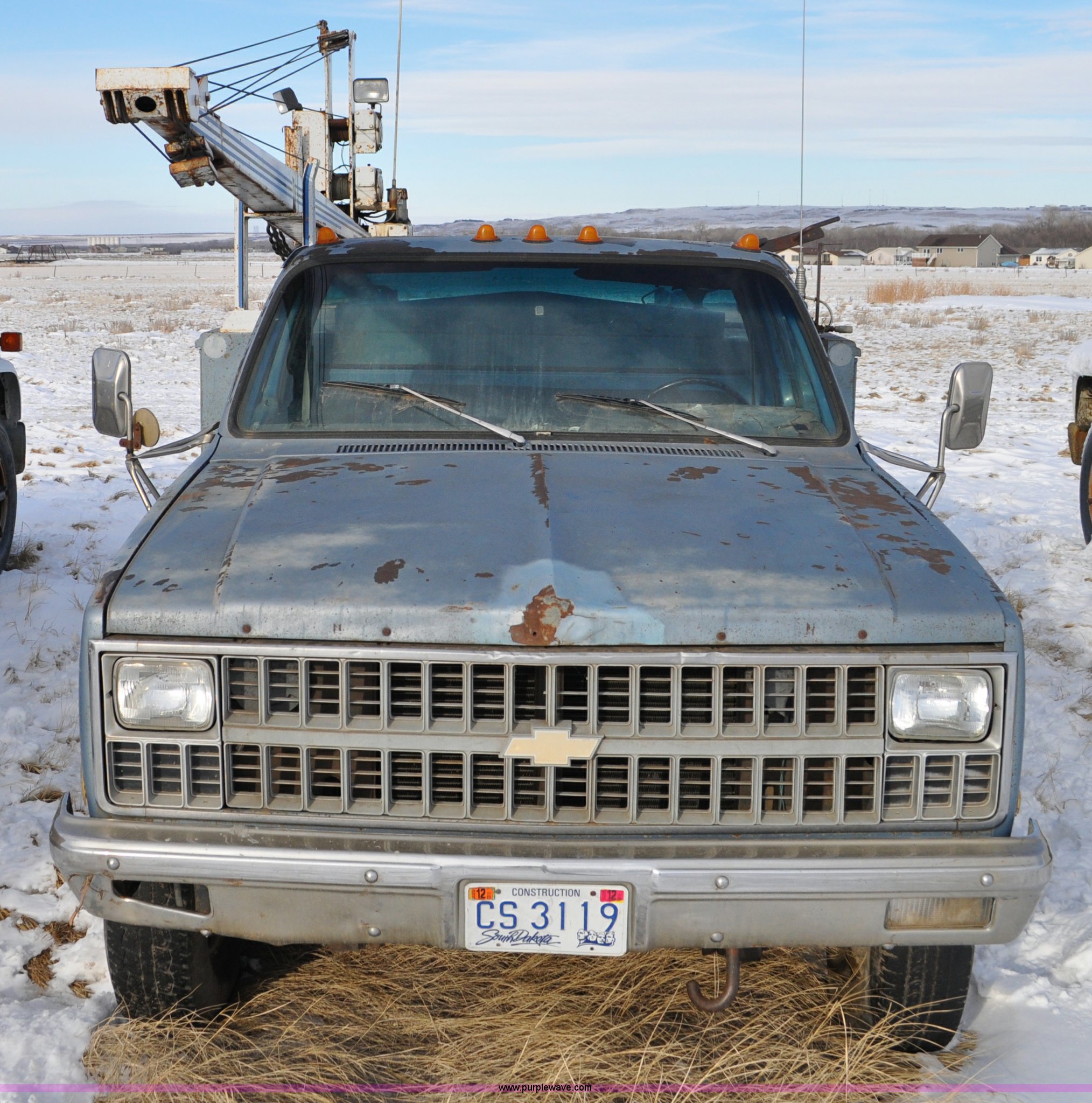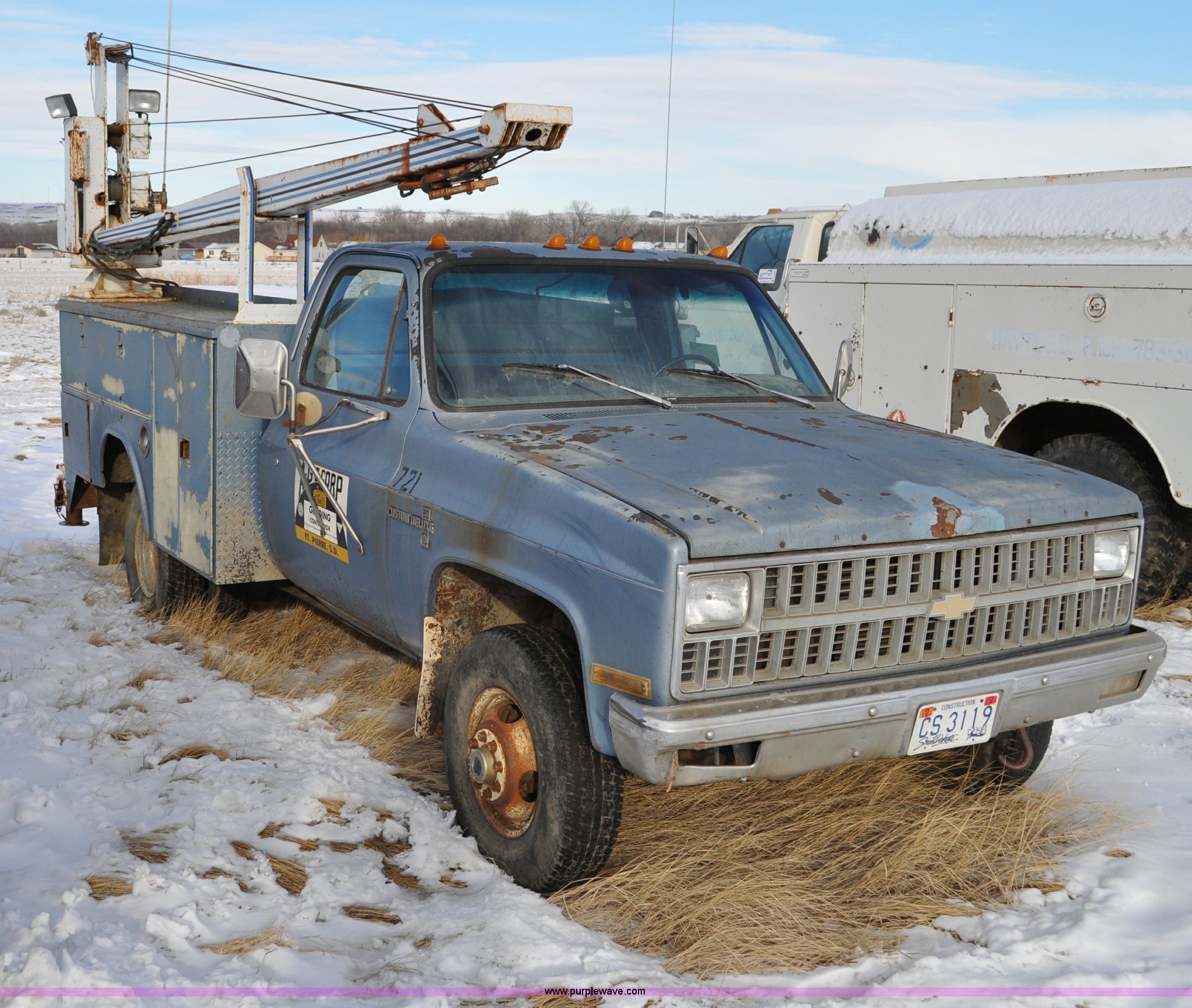Purple Wave is selling a used Passenger Vehicle in South Dakota. This item is a 1982 Chevrolet C30 Custom Deluxe utility bed truck with the following: 51,850 miles on odometer, Gas engine, Four speed manual transmission, Four wheel drive, Heat, Manual windows and locks, Vinyl interior, Auto crane, 14' boom, Remote control, Air compressor, Rear vise, Six storage compartments, Rear stabilizers, 235/85R16 tires, No fuel, Dead battery, Running when parked, Unit# 721