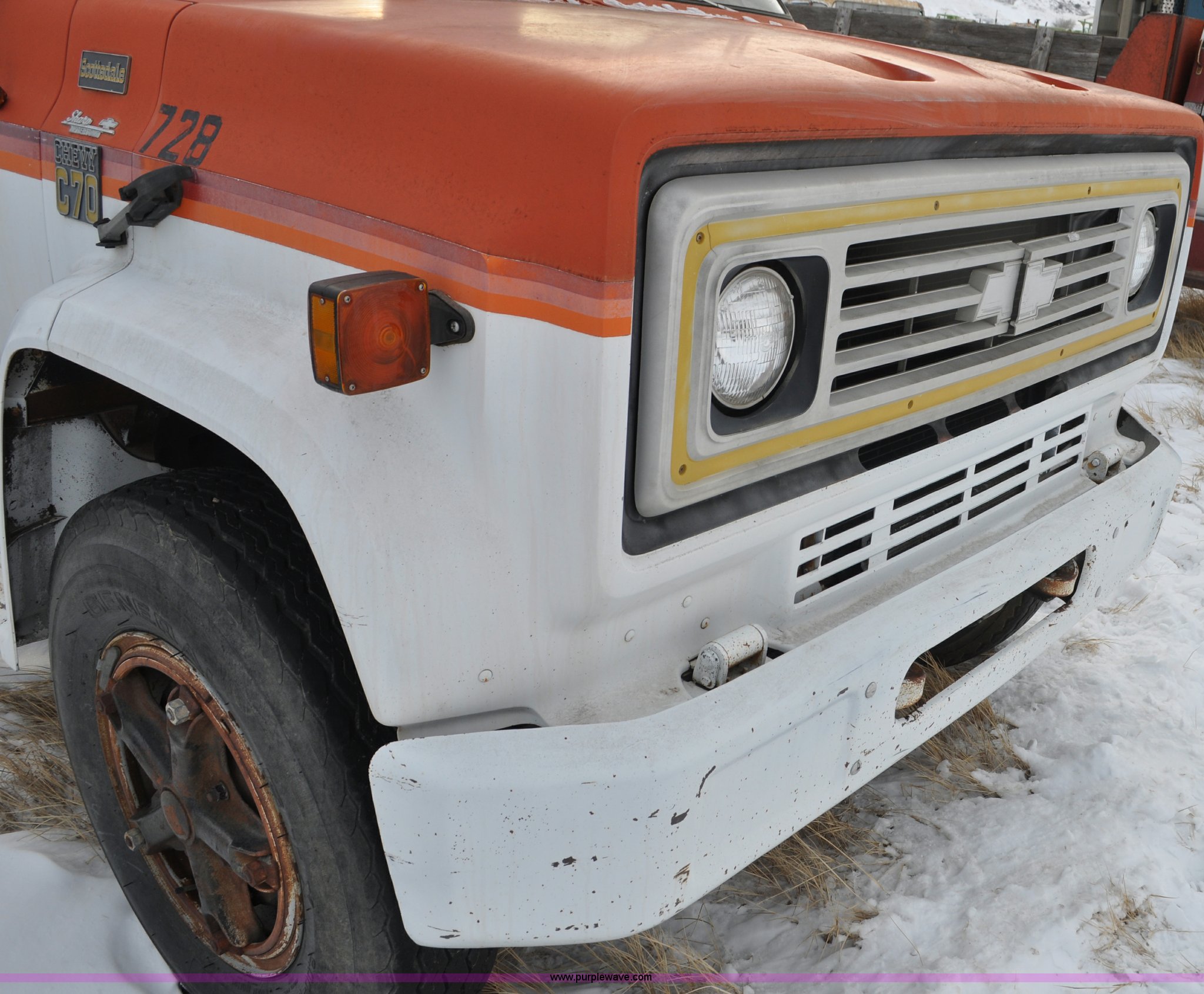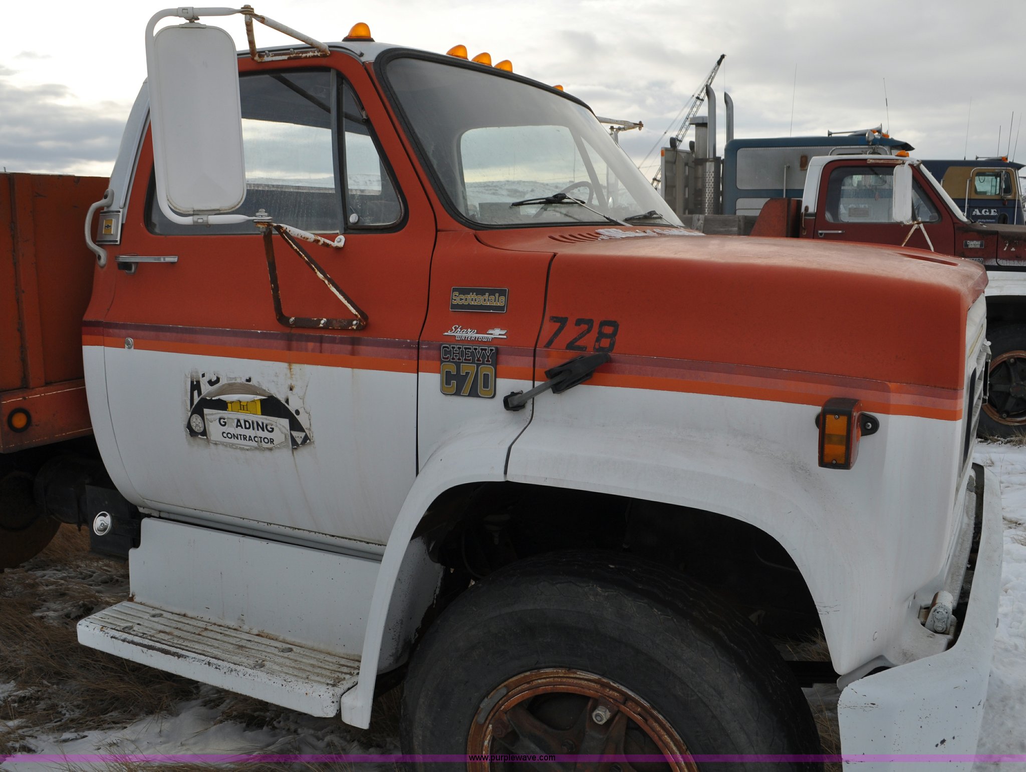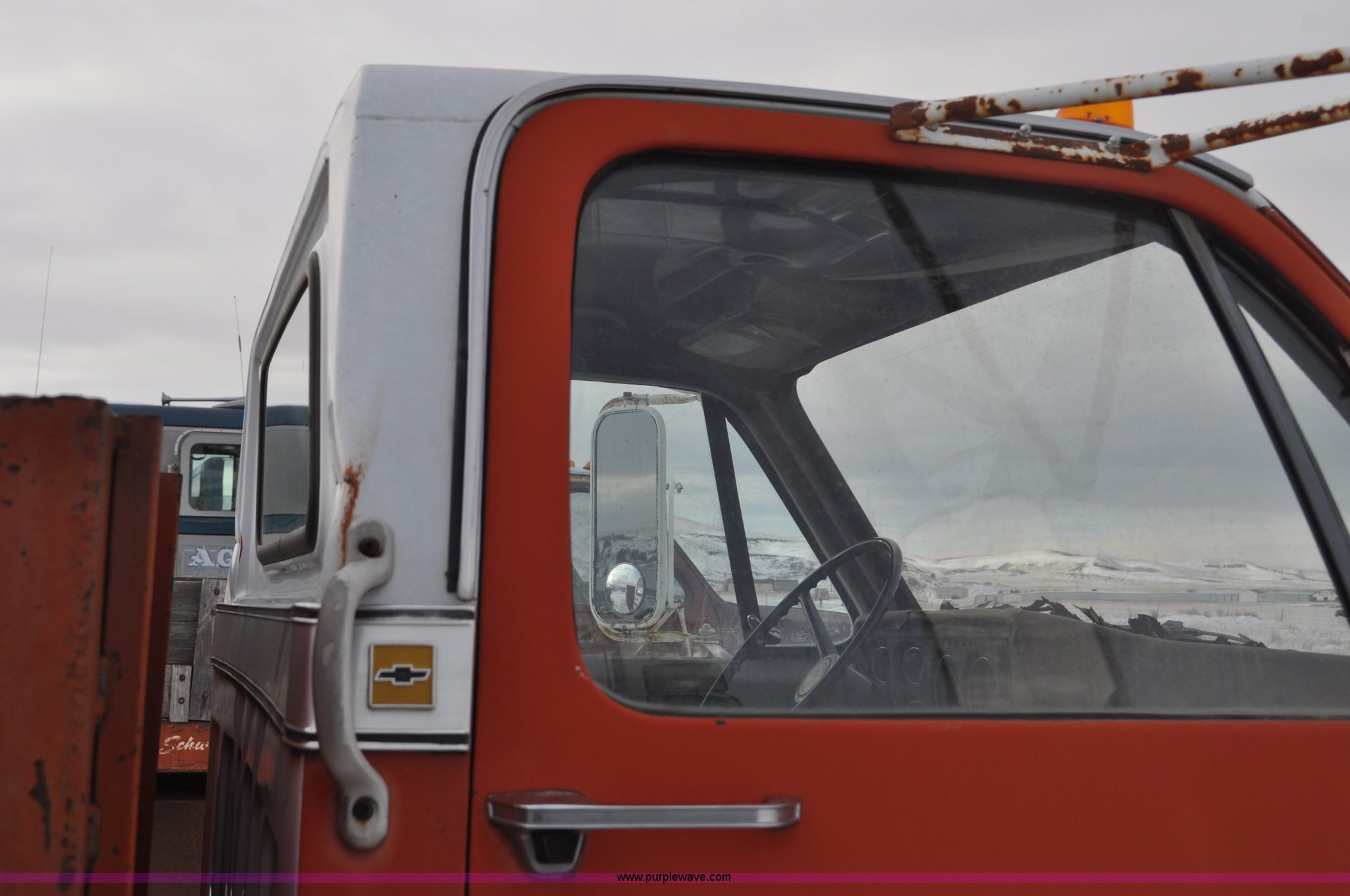 Purple Wave is selling a used Flat Bed Truck in South Dakota. This item is a 1979 Chevrolet Scottsdale C70 flatbed truck with the following: 29,426 actual miles, 366 CID V8 gas engine, Five speed manual transmission, Two speed rear end, Heat, Manual windows and locks, AM, Spring suspension seat, Schweiger's Deluxe 20'L bed, Stake pockets, Side boards, PTO, Dual ram hoist, (3) fuel tanks, 9.00-20 tires, GVWR 23,160 lbs, No fuel, Dead battery, Running when parked, Unit# 728