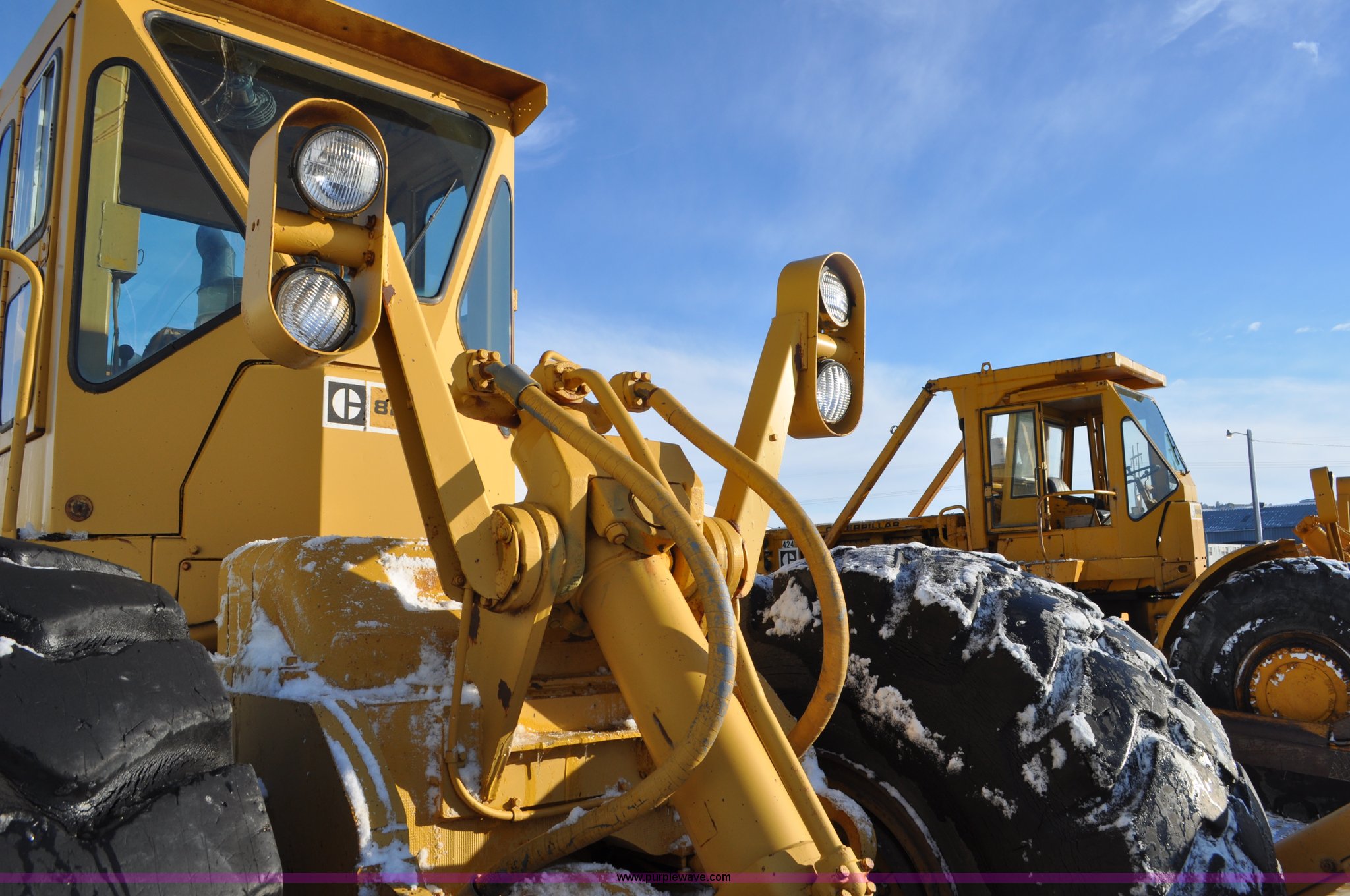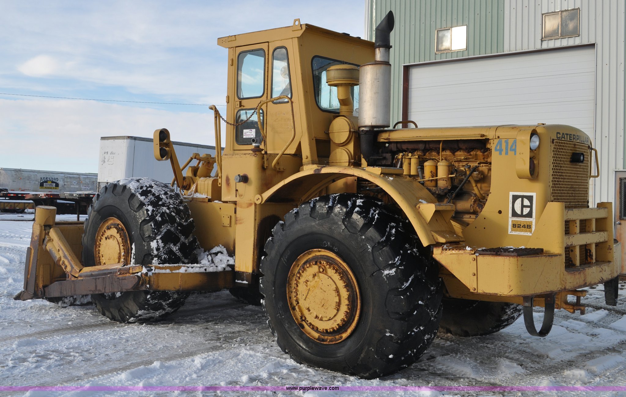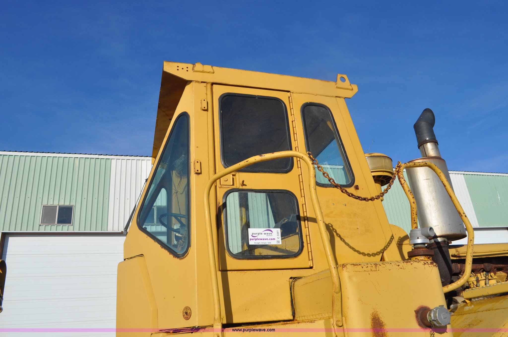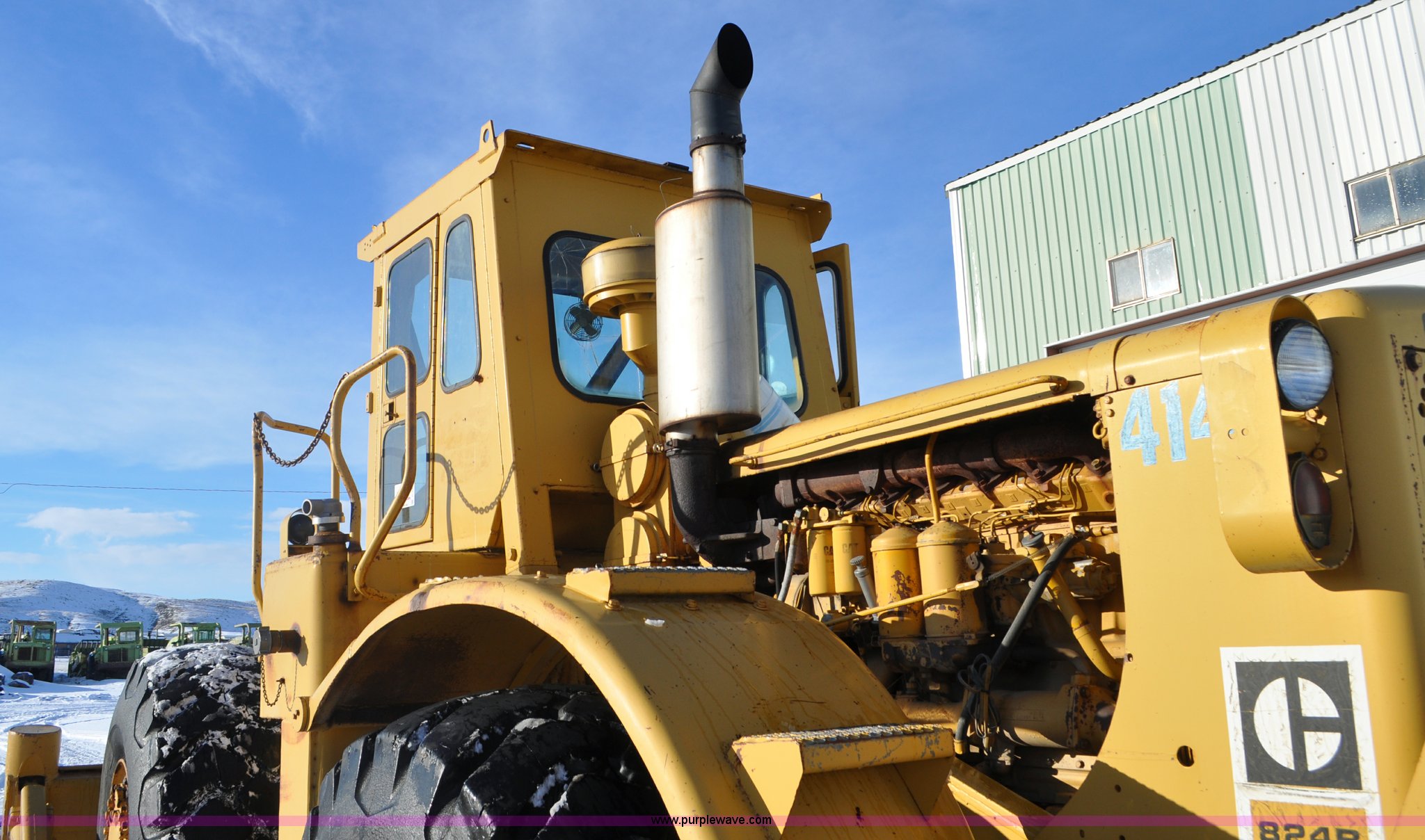 Purple Wave is selling a used Wheel Loader in South Dakota. This item is a 1975 Caterpillar 824B articulated wheel dozer with the following: 4,853 hours on meter, Caterpillar D343 six cylinder turbo diesel engine, Powershift transmission, 3F-3R gears, Enclosed cab, ROPS, Suspension seat, Front and rear work lights, Front windshield wipers, 13'W S-dozer blade, Twin tilt, Rear draw bar, Front weights, 29.5-29 tires, 64,581 lbs. base operating weight, Front and rear windows cracked, Serial 36H1369