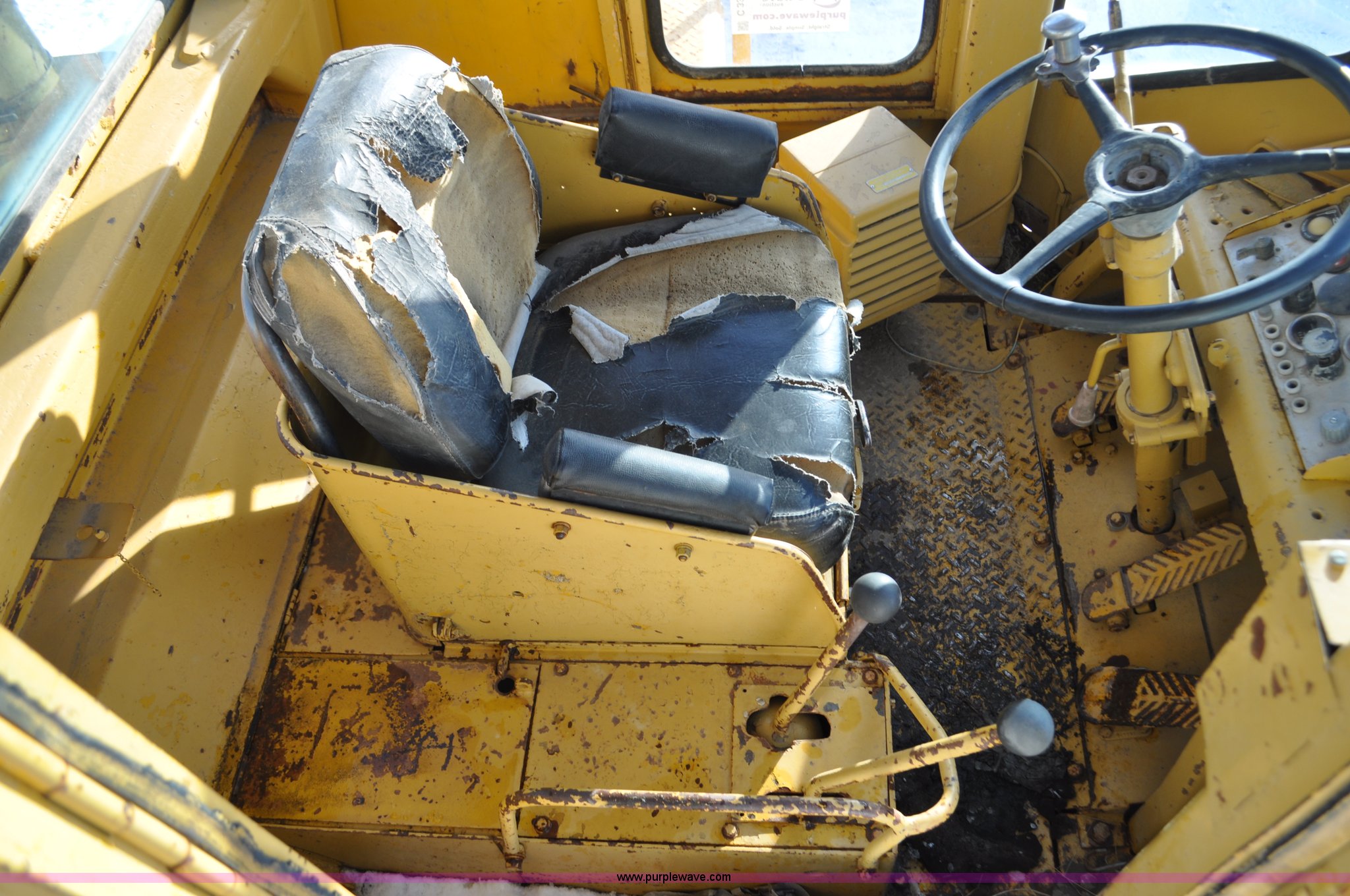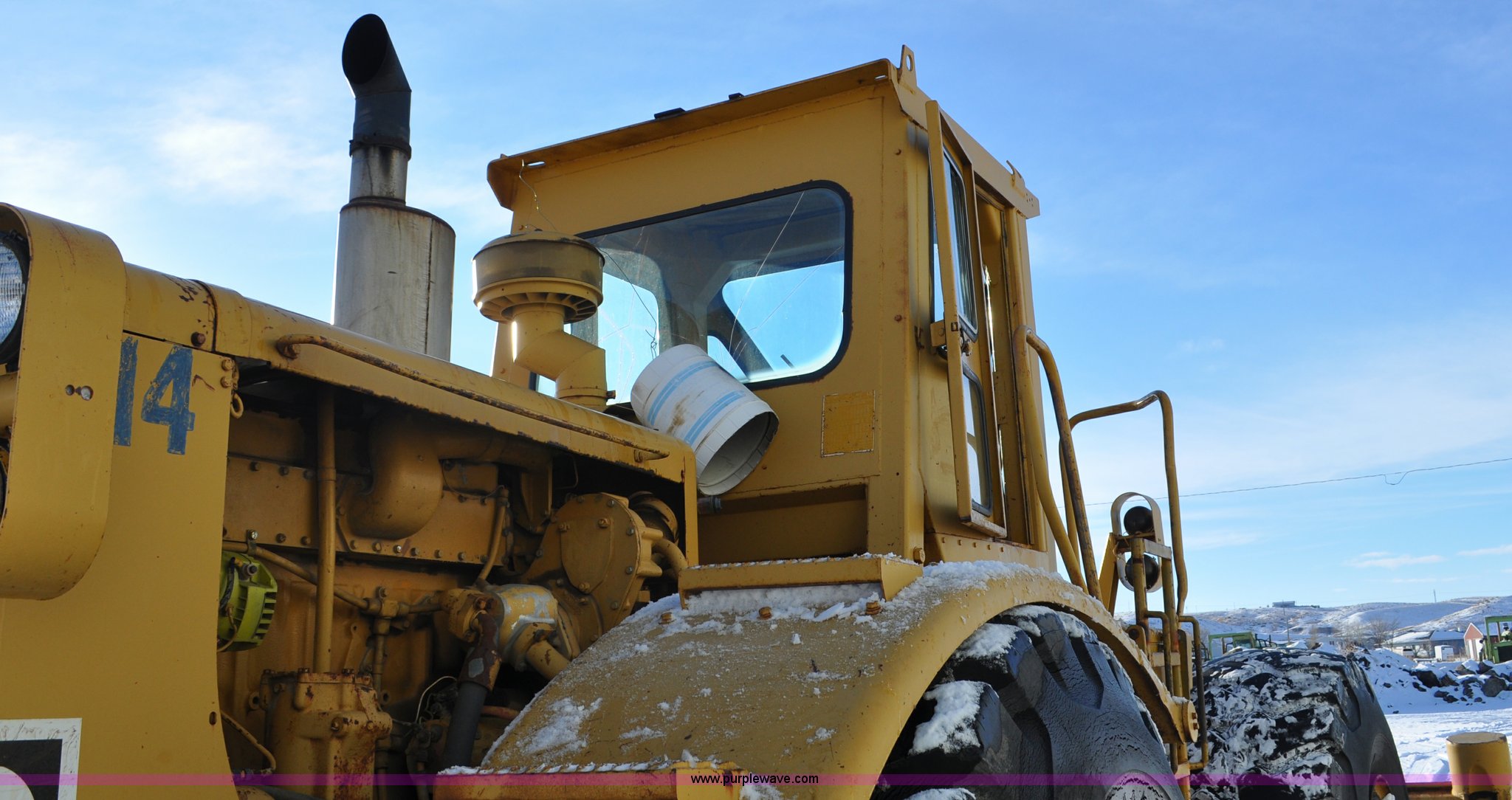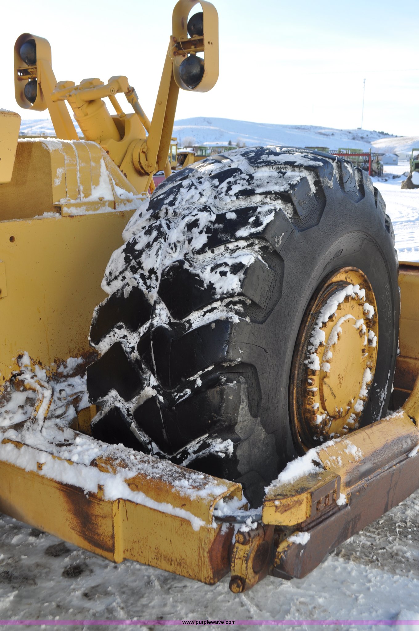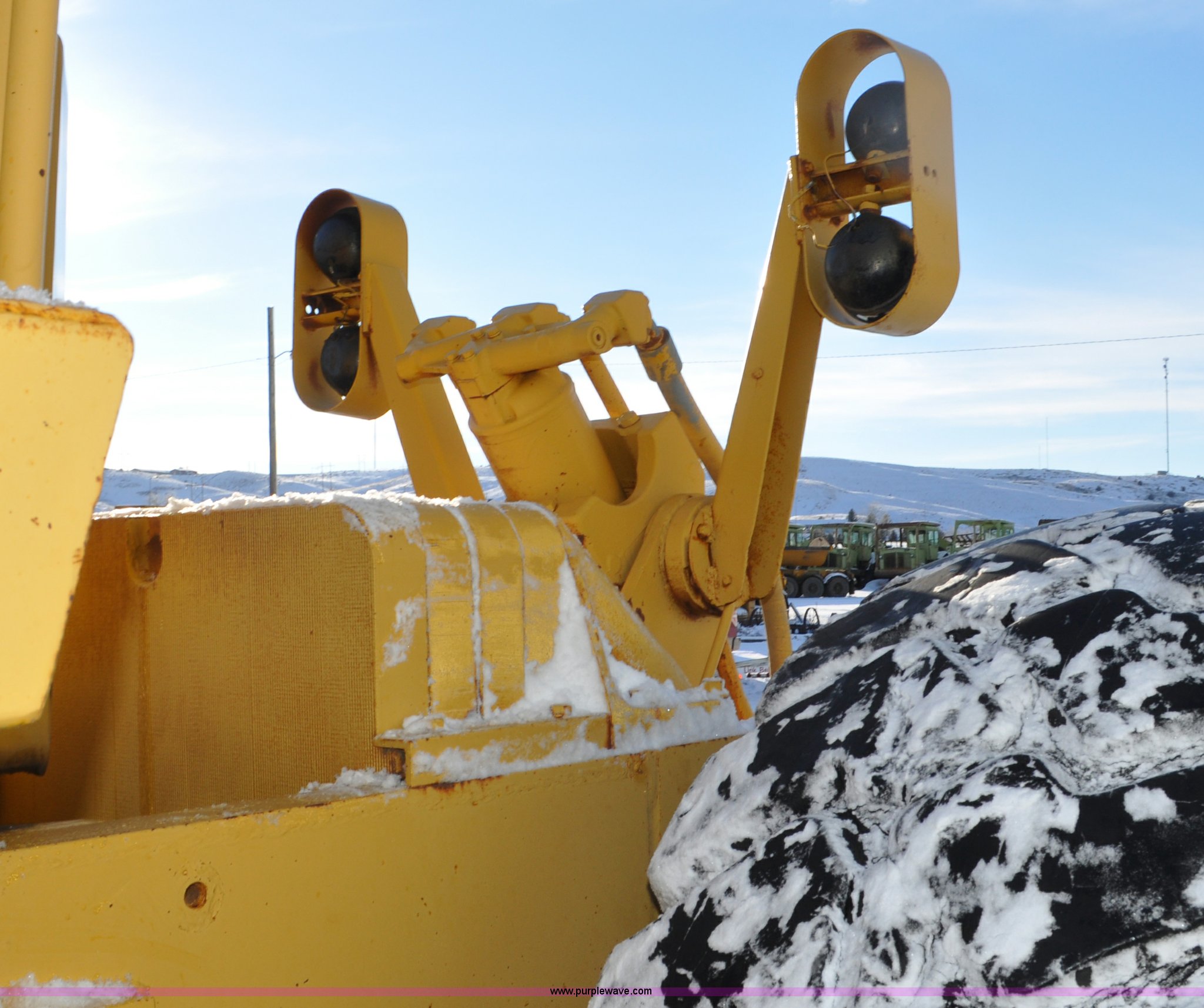 Purple Wave is selling a used Wheel Loader in South Dakota. This item is a 1975 Caterpillar 824B articulated wheel dozer with the following: 4,853 hours on meter, Caterpillar D343 six cylinder turbo diesel engine, Powershift transmission, 3F-3R gears, Enclosed cab, ROPS, Suspension seat, Front and rear work lights, Front windshield wipers, 13'W S-dozer blade, Twin tilt, Rear draw bar, Front weights, 29.5-29 tires, 64,581 lbs. base operating weight, Front and rear windows cracked, Serial 36H1369