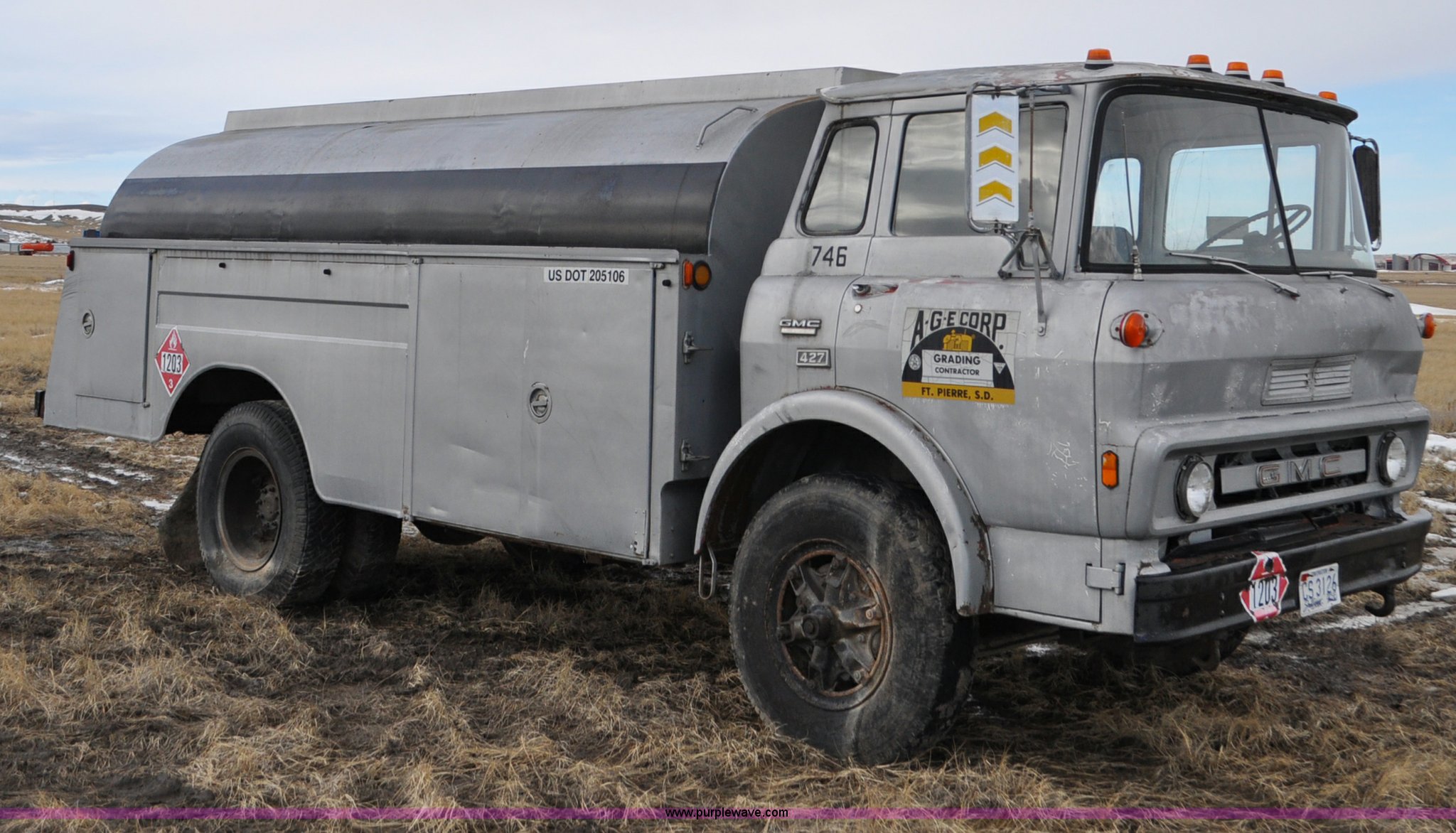 Purple Wave is selling a used Fuel Truck in South Dakota. This item is a 1979 GMC 7000 fuel truck with the following: 102,785 miles on odometer, 427 CID eight cylinder gas engine, Five speed manual transmission, Two speed axle, 1974 Arrow fuel tank body, 2,200 gallon capacity, (5) compartments, Neptune auto stop registers, Retractable hose reels, (2) storage compartments, Serial 74-3126, 50 gallon fuel tank, Air brakes, 10.00-20 tires, No fuel, Dead battery, Cracked drivers door glass, Operational when parked