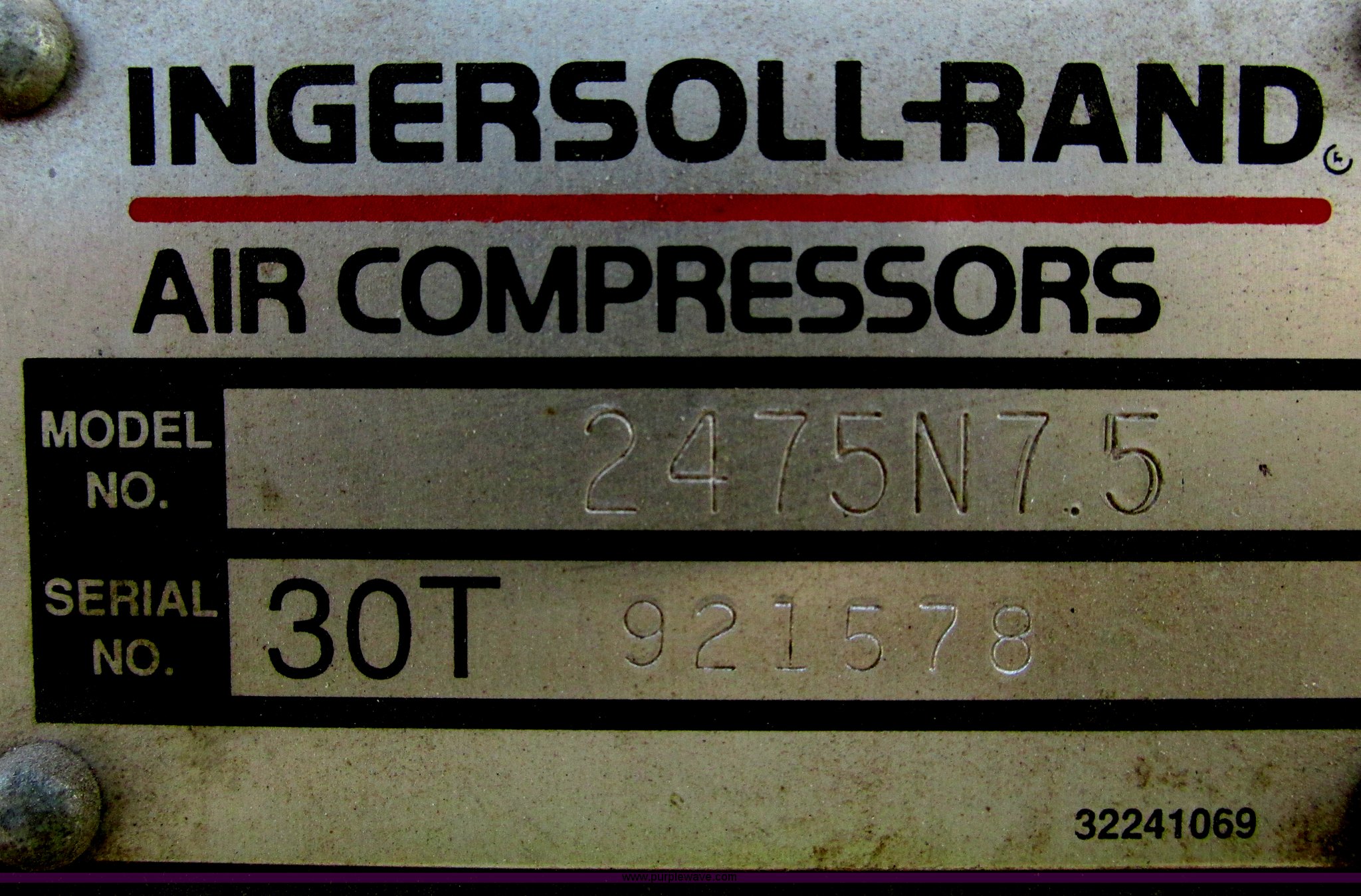 Ingersoll Rand T30 air compressor. Baldor 7.5 HP electric motor Single phase, 230V, 80 gallon tank, 200 maximum psi, Working when removed from service, Serial 30T921578. Shipping quotes available. George J. Shaw Construction Co.. 1601 Bellefontaine. Kansas City, MO 64127