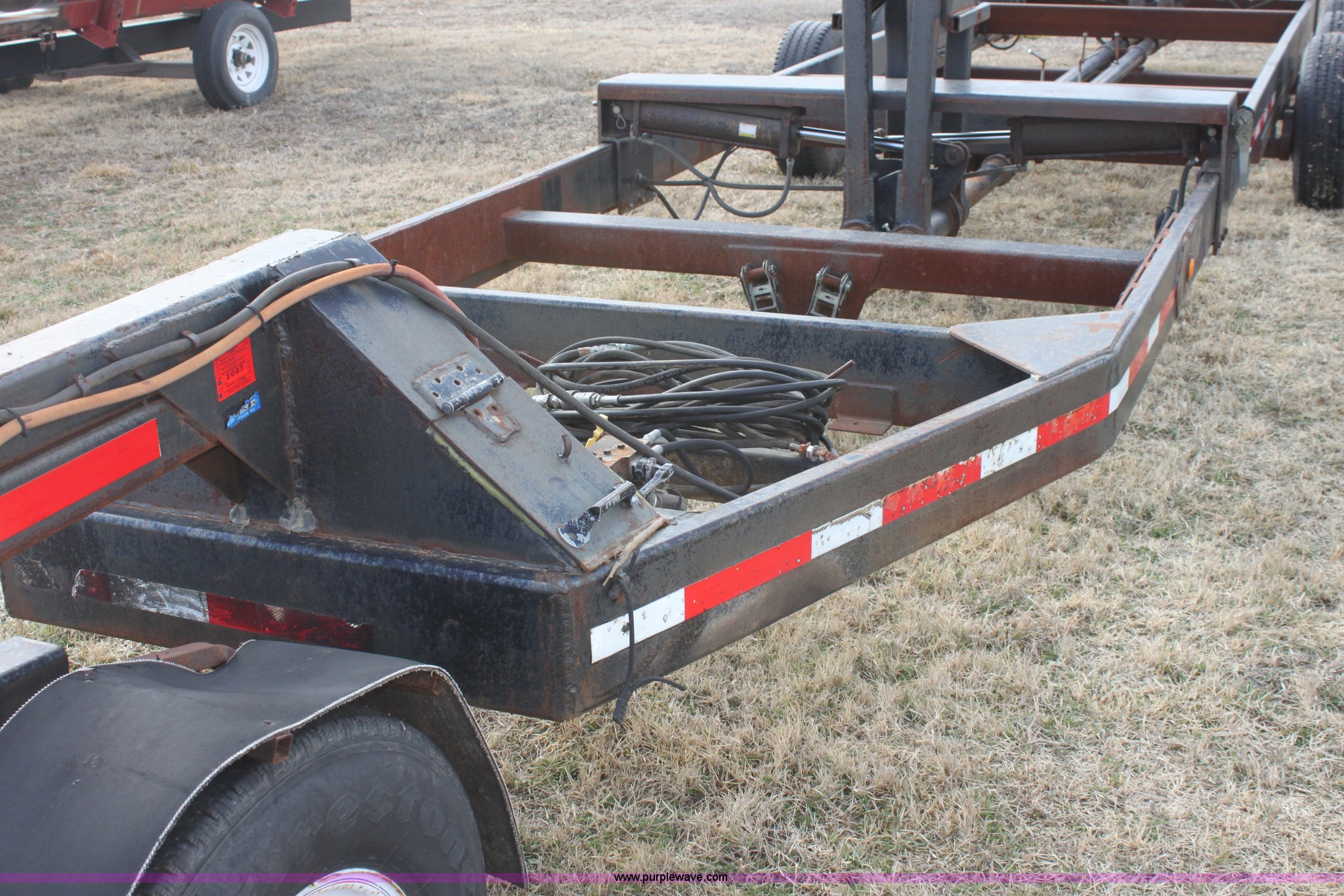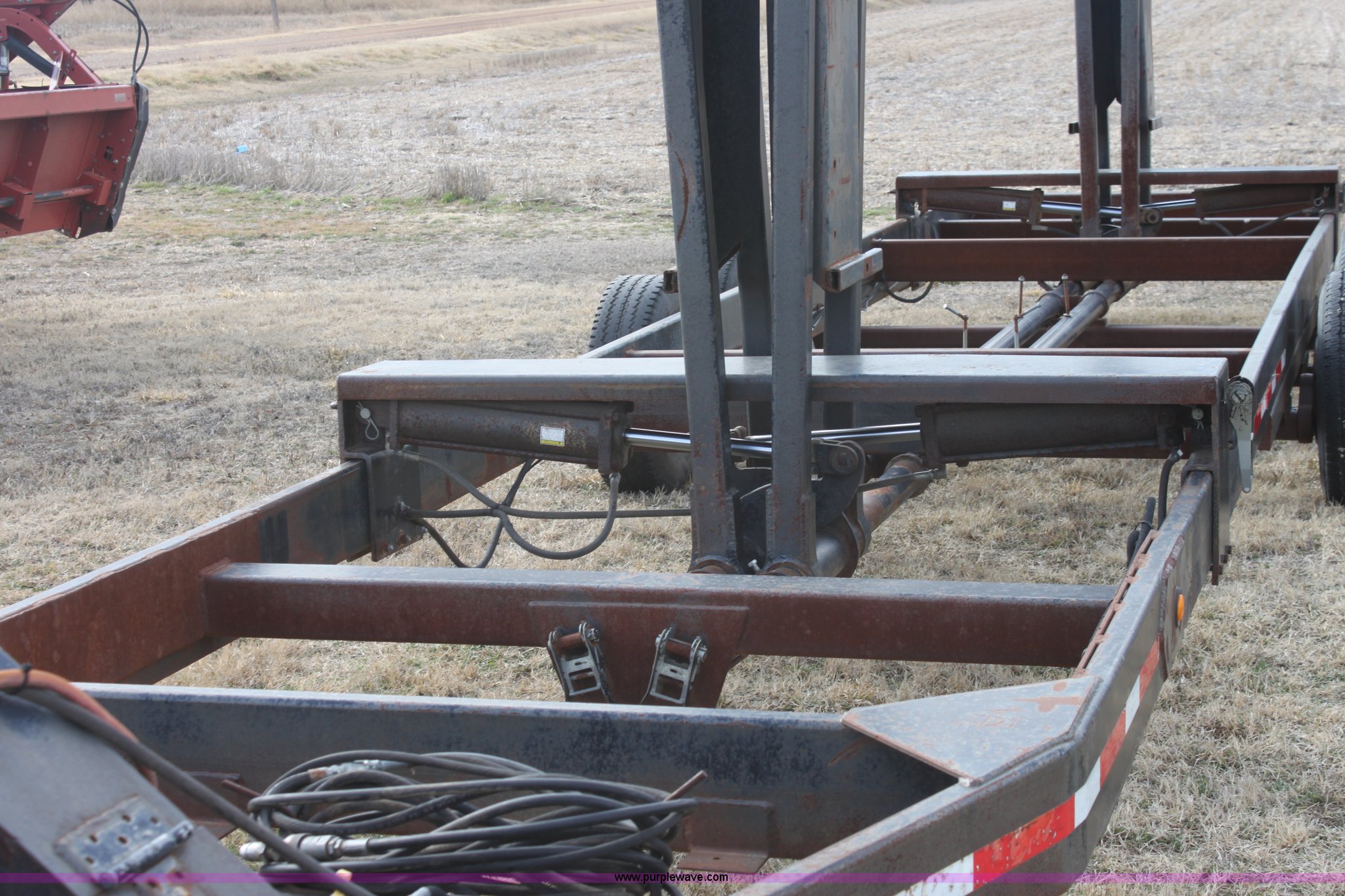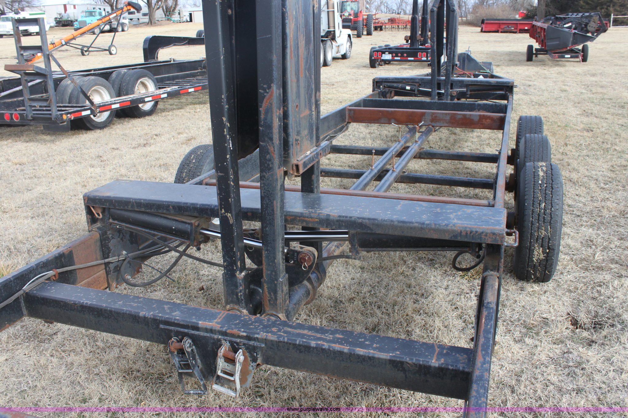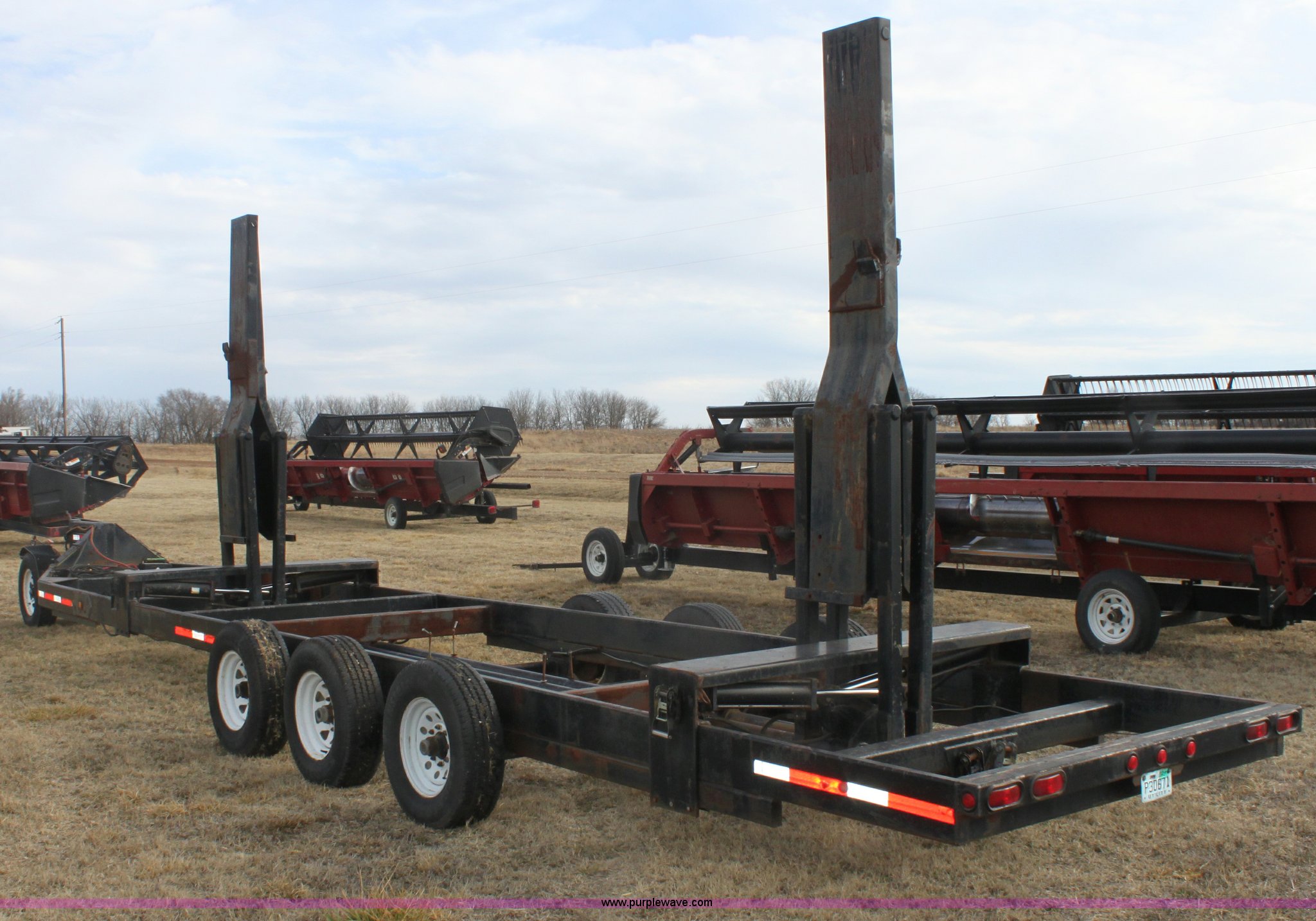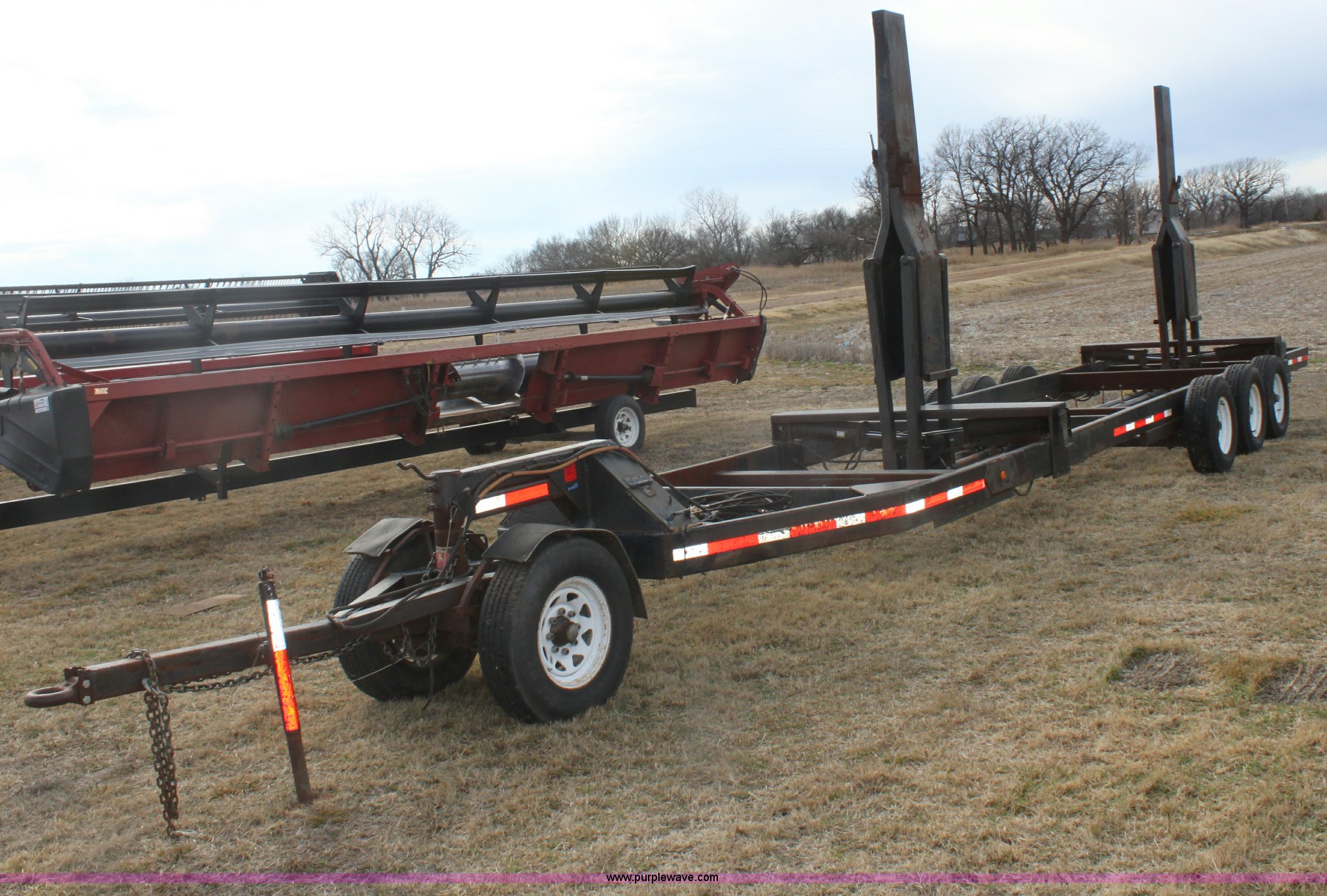 Purple Wave is selling a used Ag Equip. or Header Trailer in Kansas. This item is a 2003 shop built triple axle double header trailer with the following: Self contained hydraulic system, Electric over hydraulic pump, Constructed to handle up to 30' headers, Electric brakes, Pintle hitch, Bull Dog jack, 7,000 lbs axles, 16" 10 ply tires