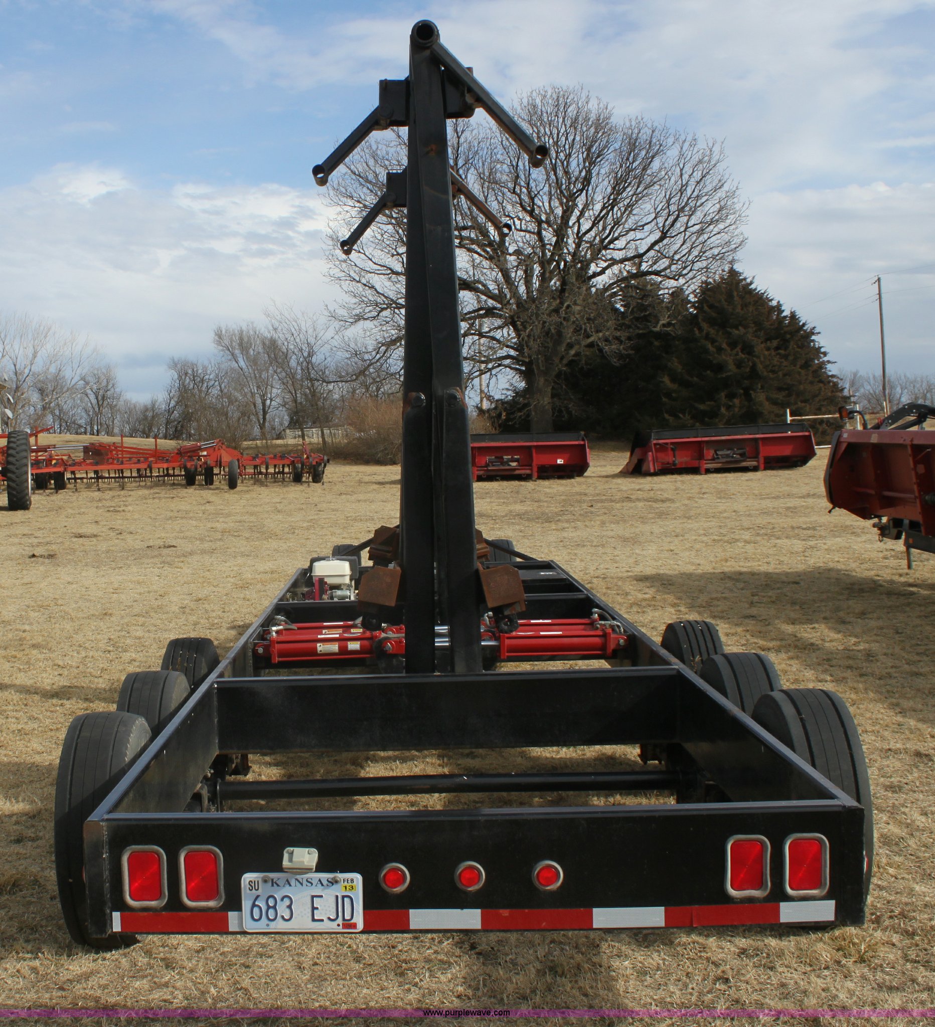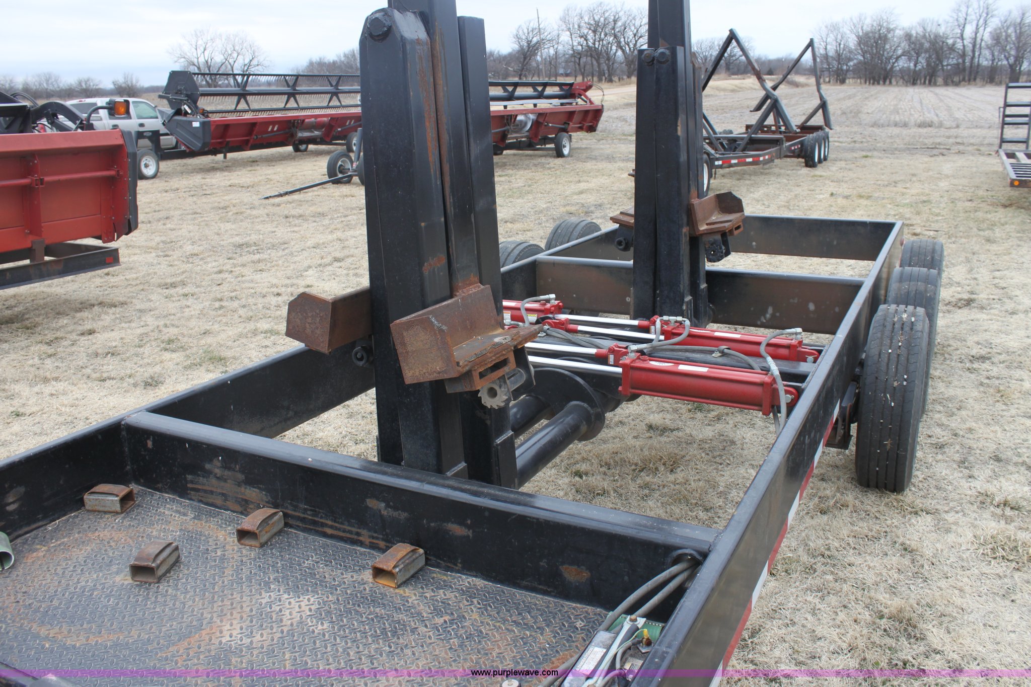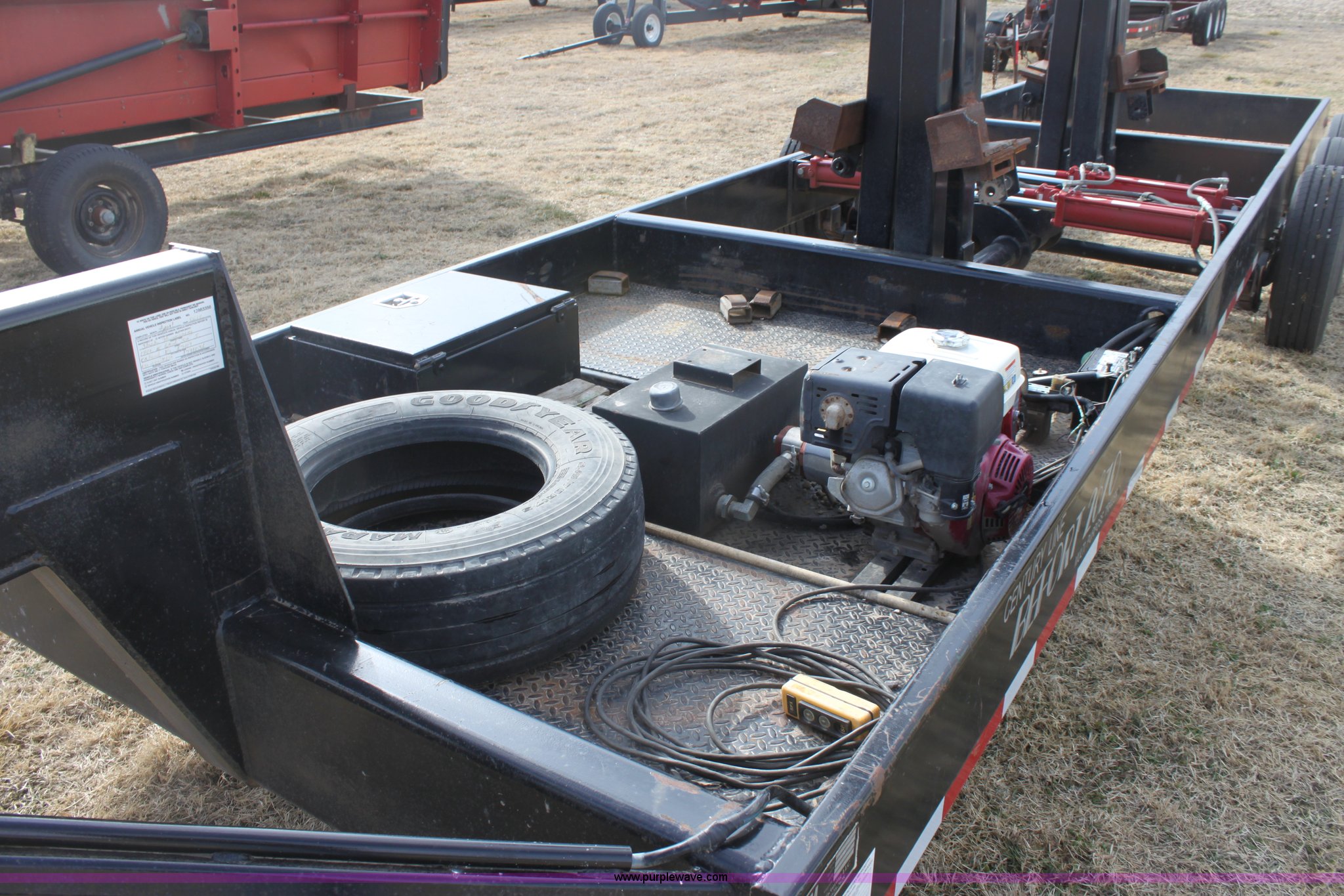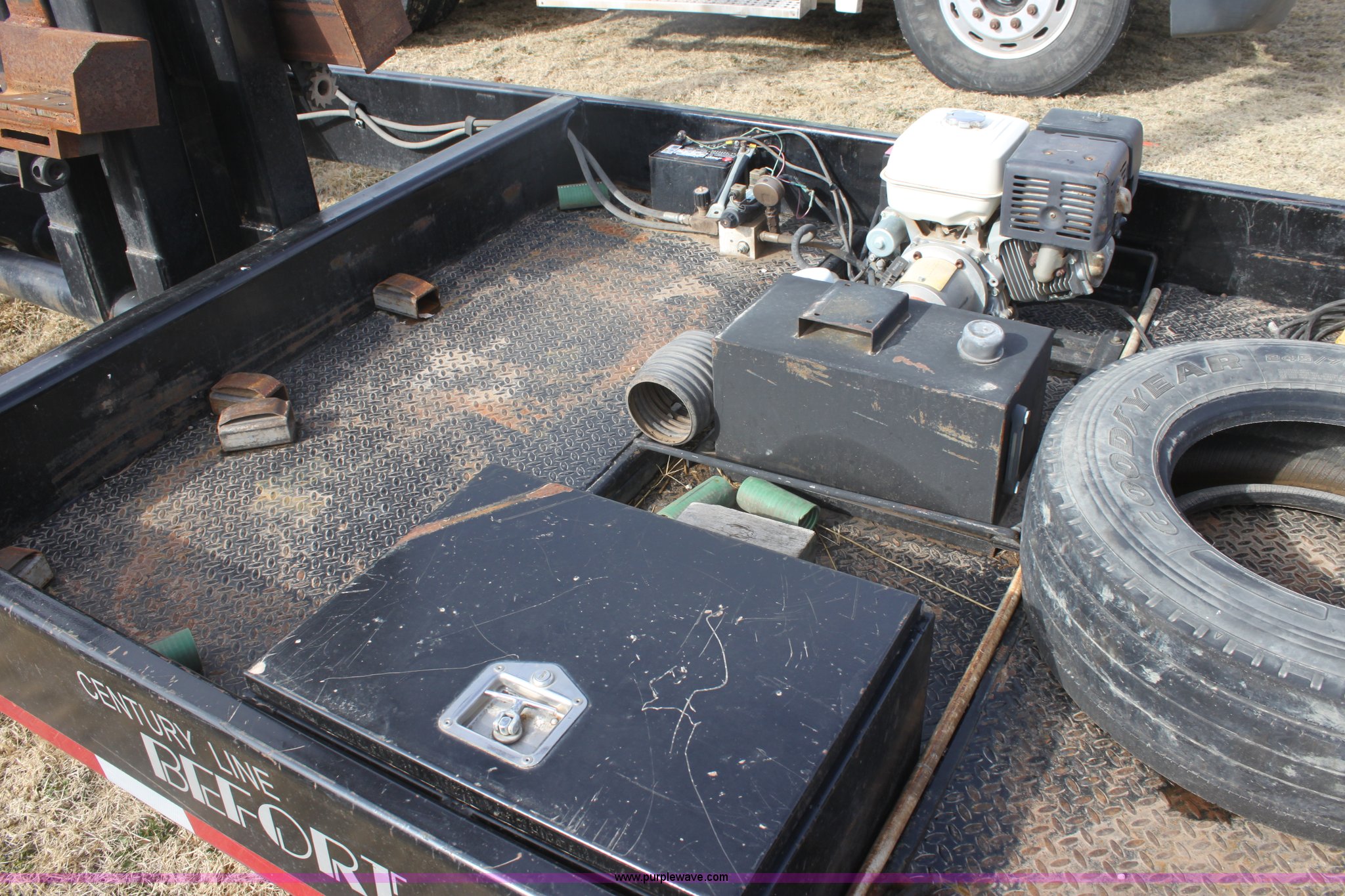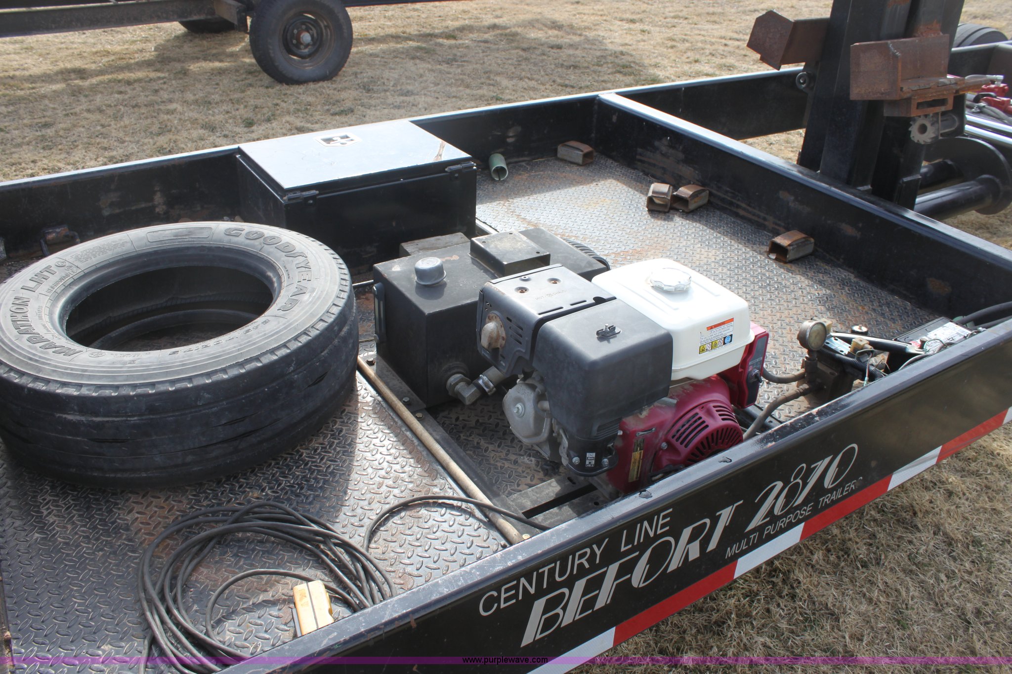 Purple Wave is selling a used Ag Equip. or Header Trailer in Kansas. This item is a 2008 Century Line Befort 2870 triple axle multi purpose header trailer with the following: Self contained hydraulic system, Honda GX390 gas engine, Electric start, Toolbox, Setup to handle up to 40' draper or rigid head, Tie down straps, Pintle hitch, 17.5 tires, Goodyear Marathon 245/70R17.5 spare tire, GVWR 26,000 lbs