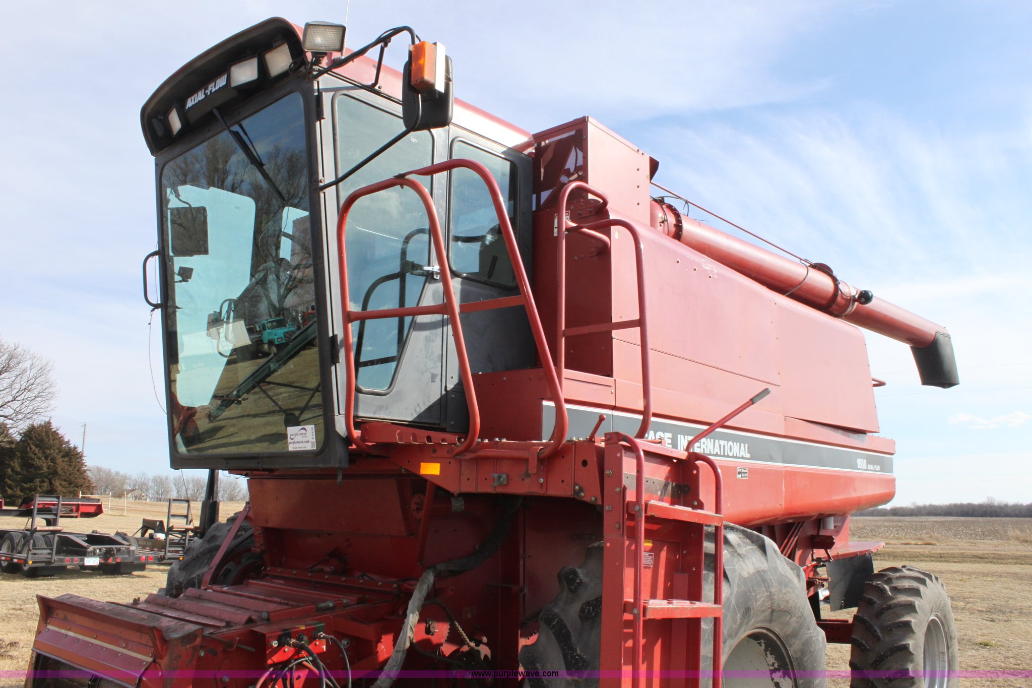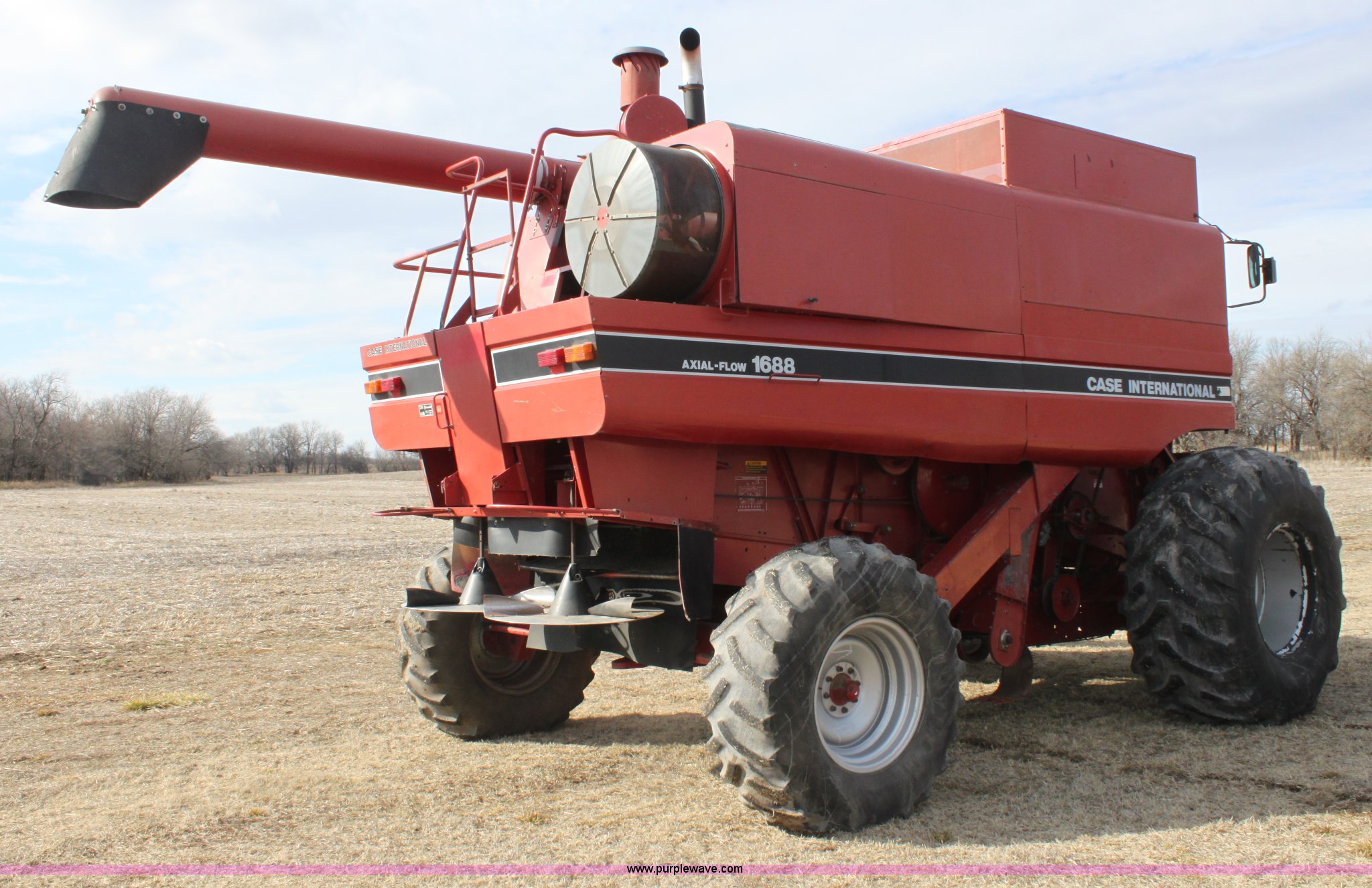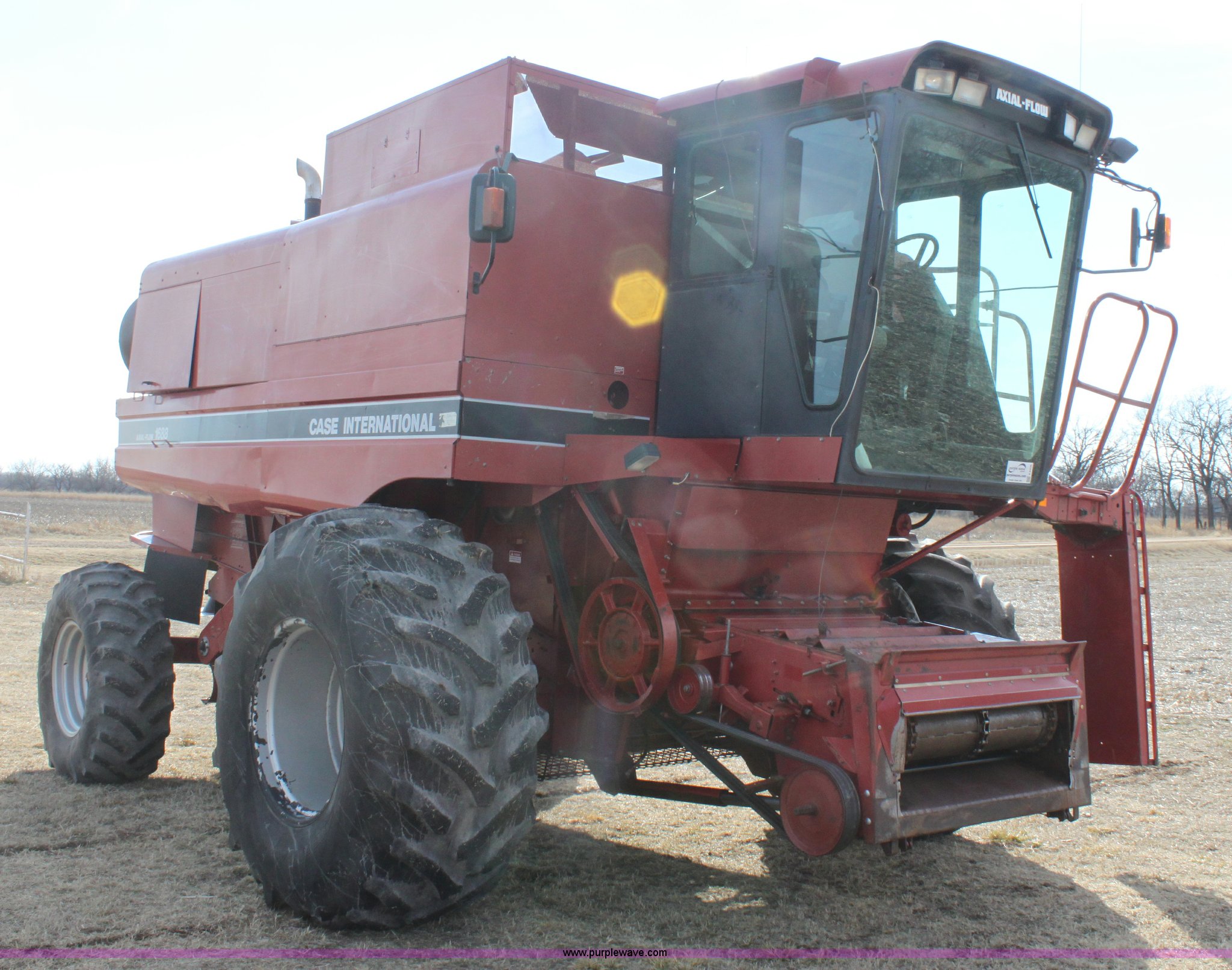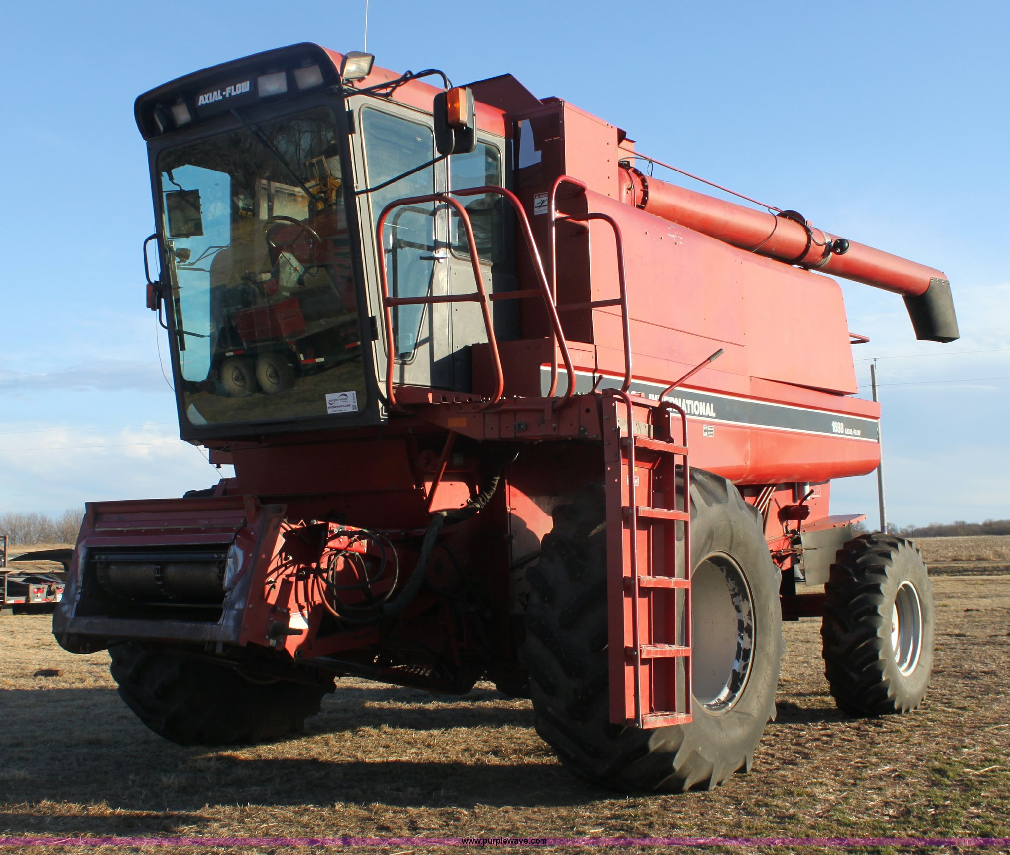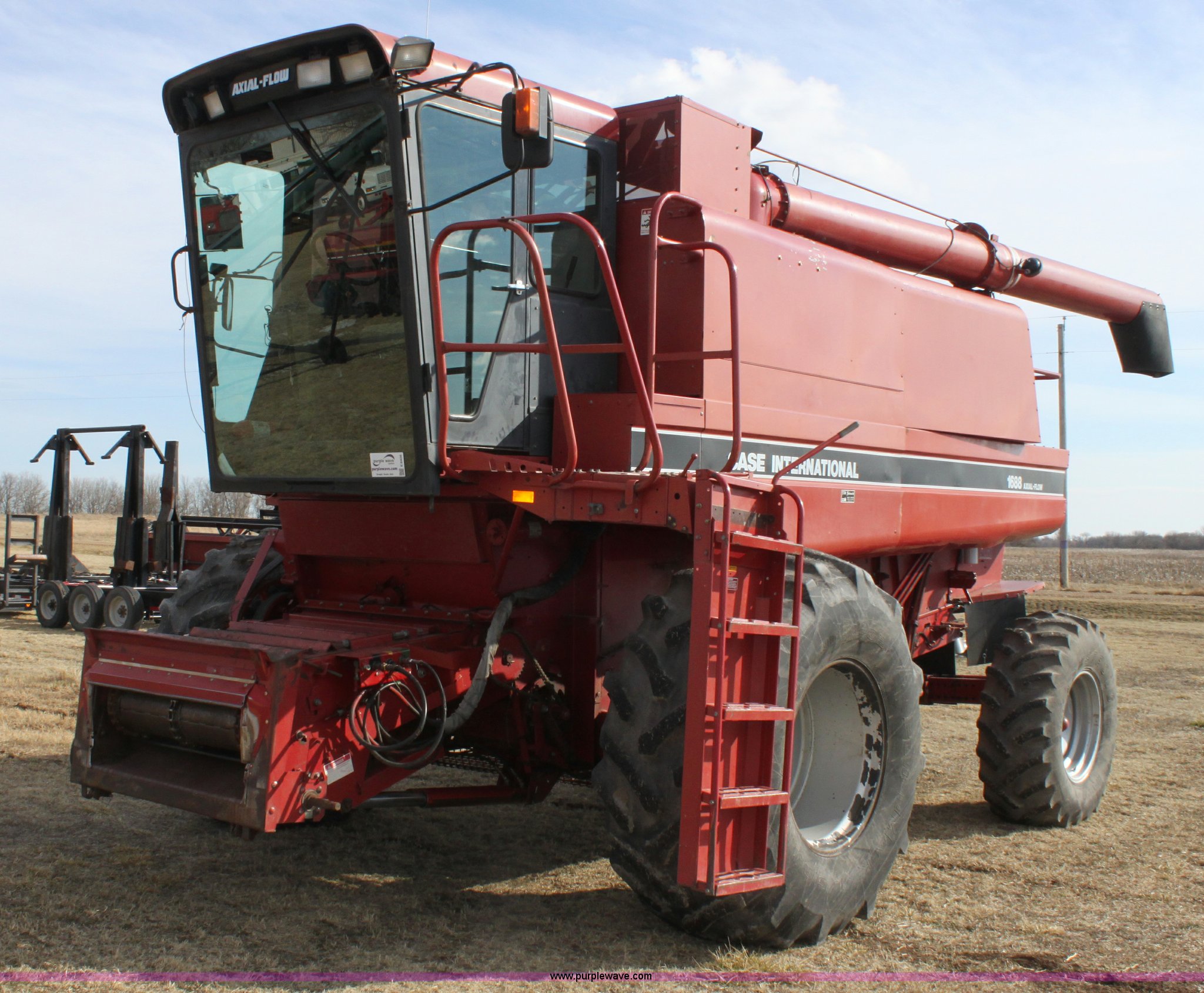 Purple Wave is selling a used Combine in Kansas. This item is a 1994 Case IH 1688 Axial-Flow F33 combine with the following: 4,512 engine hours on meter, Cummins 8.3L turbo diesel engine, Two speed transmission, AM/FM, AC, Shaft speed monitor, Auto header height control, Reel speed control, In cab rotor and fan controls, Case Grain Scan monitor, Model 24536003, Serial 0946-13603, (2) sets of concaves, Large and small wire, (2) sets of grates, Bar and slotted, Recently replaced feeder house chain, Fewer than 30 hours use, Rotor cage, vines, Elephant ears, feeder house bottom, clean grain auger, and return auger replaced approximately 1,000 hours ago, 30.5L-32 front tires, 18.4-26 rear tires, Kenwood two-way radio is not included, Serial JJC0121179