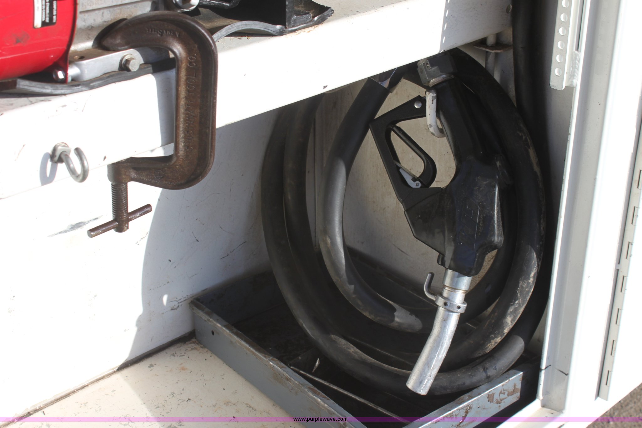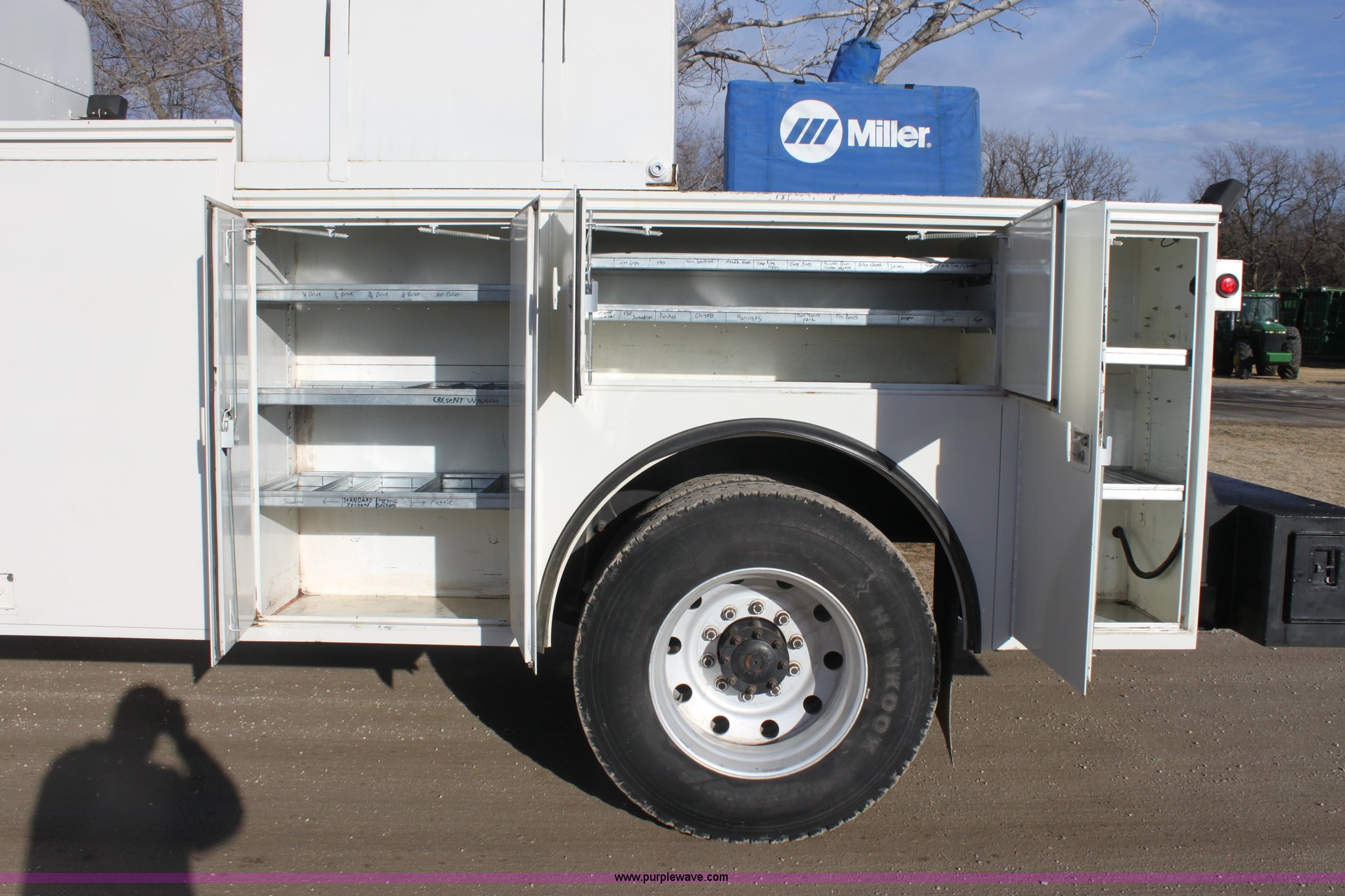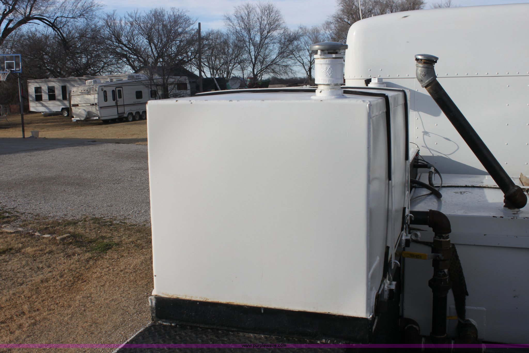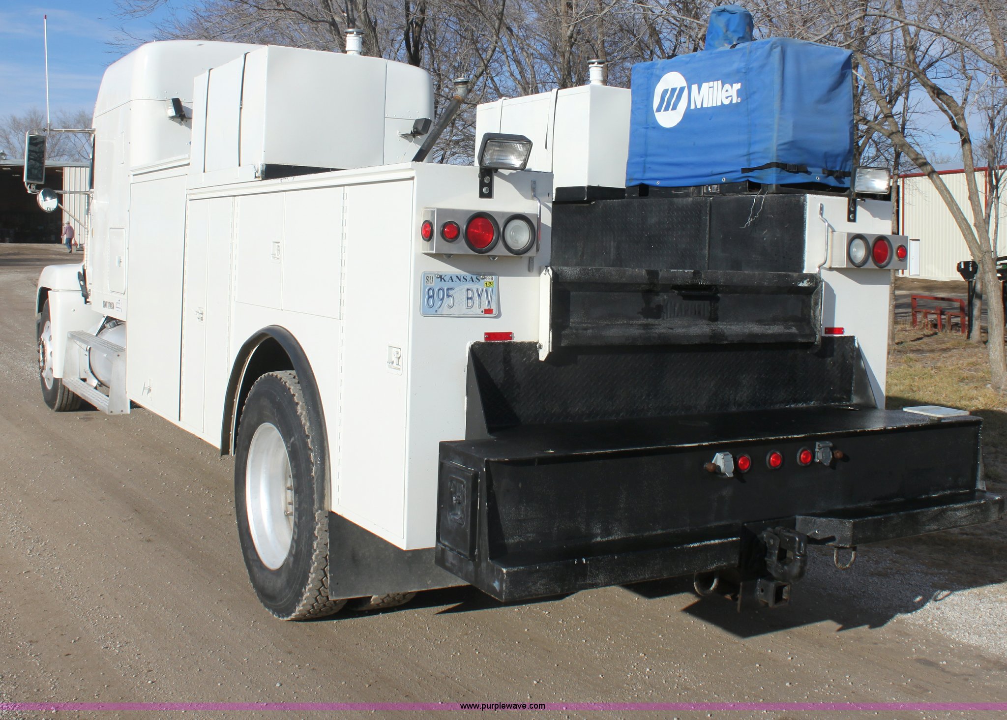 Purple Wave is selling a used Service Truck in Kansas. This item is a 1999 Freightliner FLD semi service truck with the following: 913,478 miles on odometer, Cummins 855 diesel engine, 450 HP, Rockwell 10 speed manual transmission, Pioneer AM/FM/CD, Custom rear bench seat, Air ride cab, Engine brake, Knapheide utility bed, Model 6169VLHB60J, 14'L x 96"W, Spray-in bed liner, 22" heavy duty rear work bench, Style bumper with storage, Serial 20070215-0057655, (4) 119 gallon fuel tanks, Plumbed to meet DOT requirements, Honda GX160 gas powered 2" bulk fuel pump, 1" GPI nozzle and hose, Air suspension, Aluminum 140 gallon under step fuel tank, Air lock pintle hitch, (2) sets of trailer light hook ups, 2.5" receiver hitch, 11R24.5 tires, Retractable air reels, Professionally repainted one year ago, Less than 20,000 miles on new injectors, Miller welder is not included, Contents not included