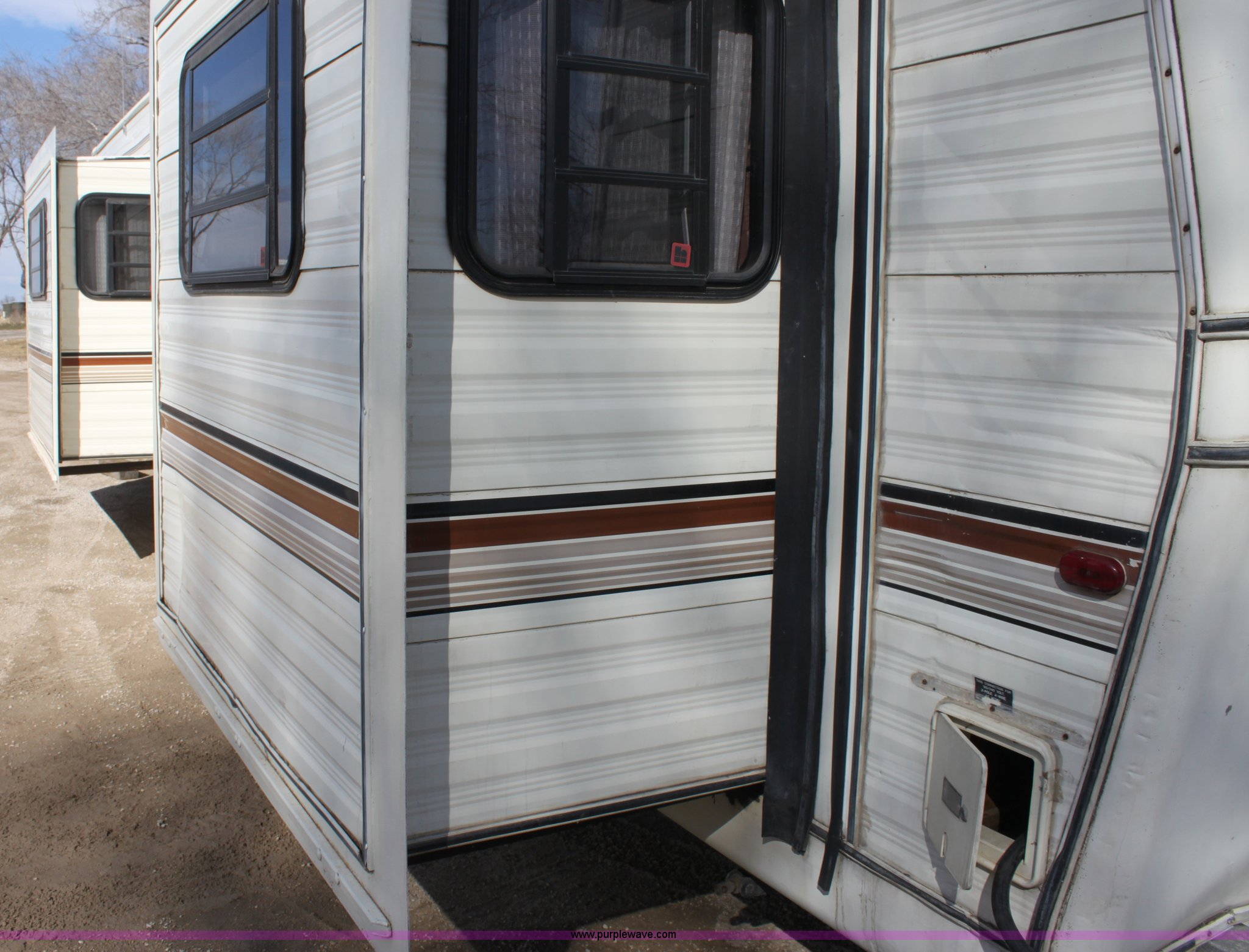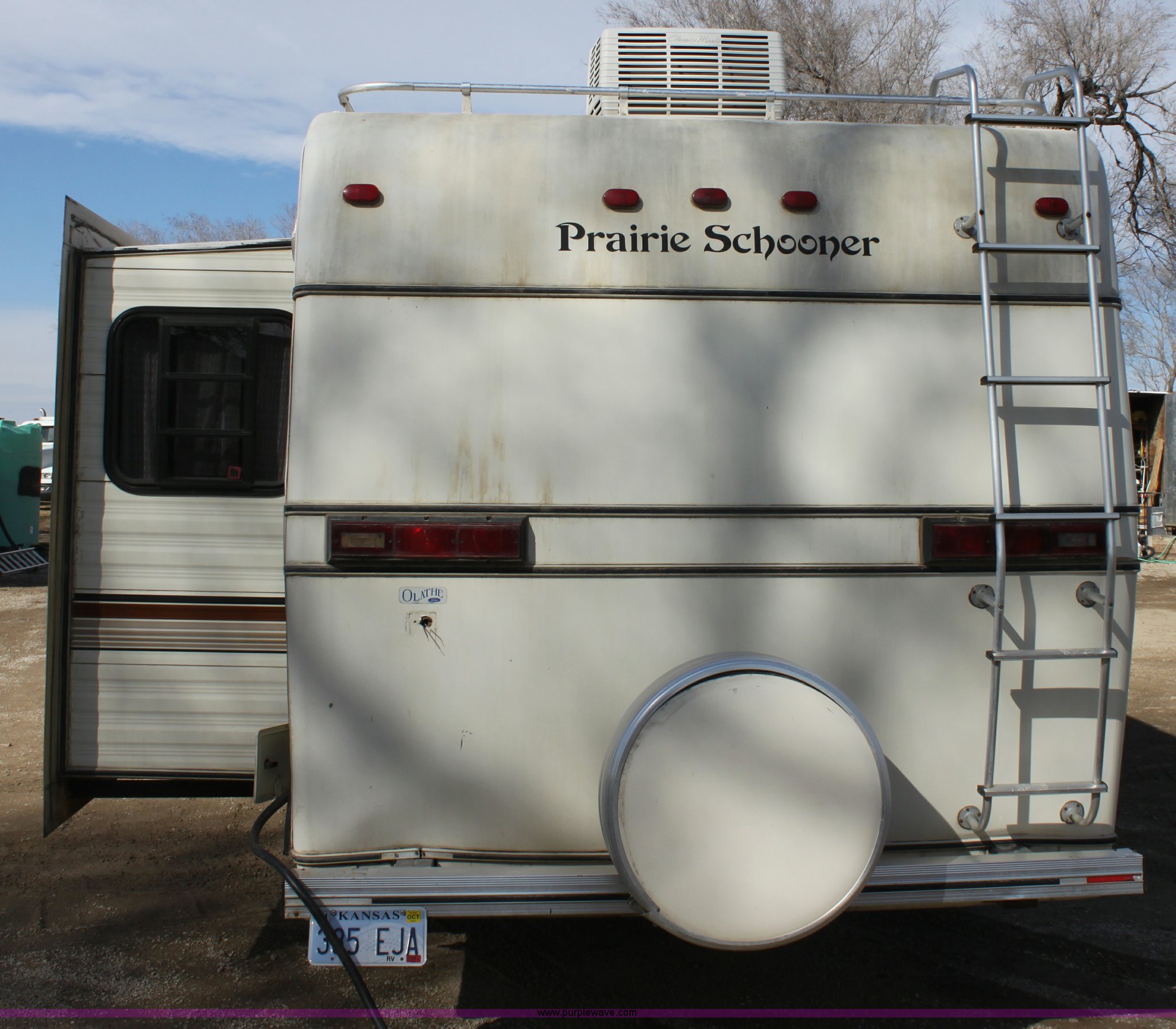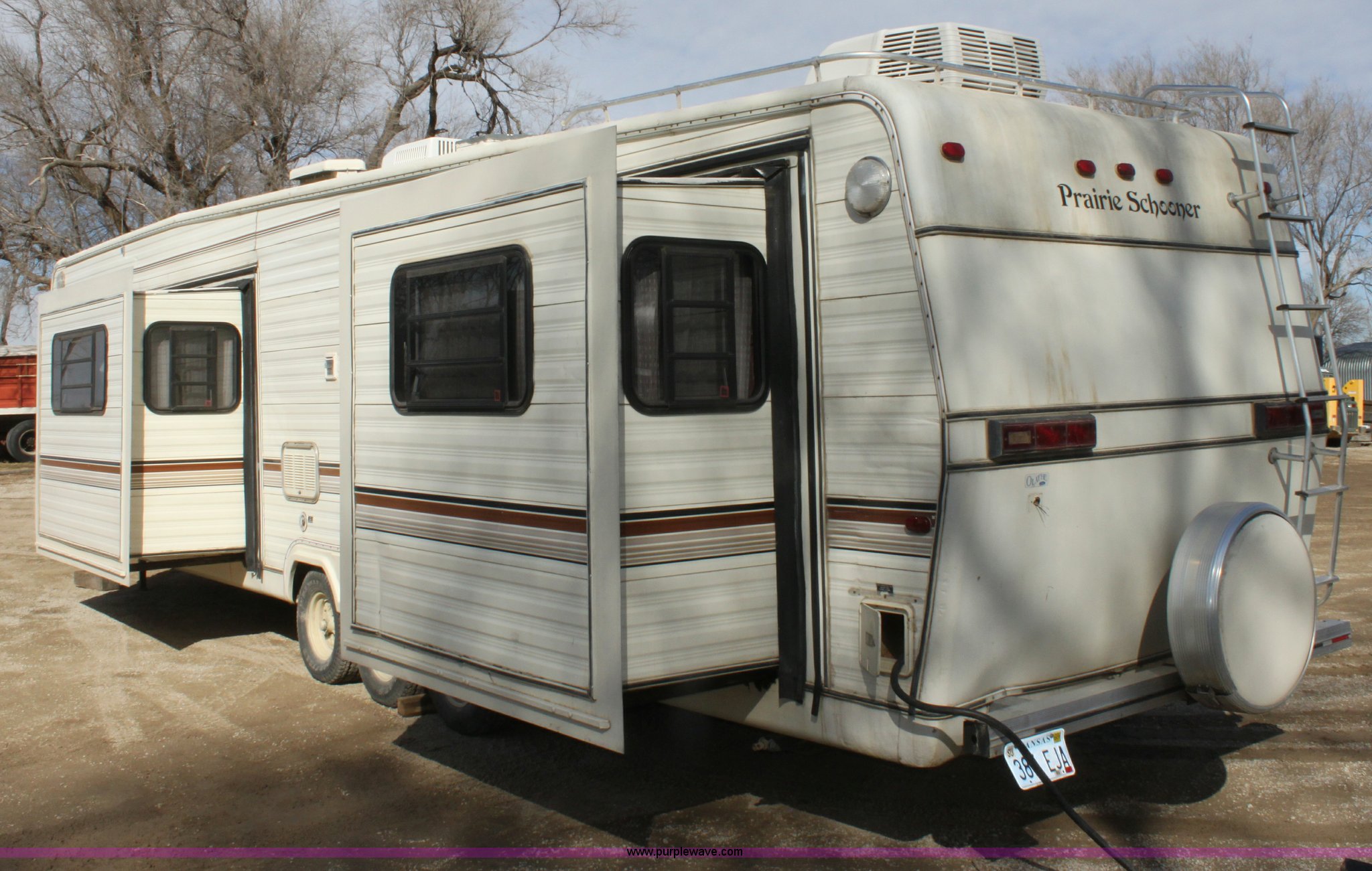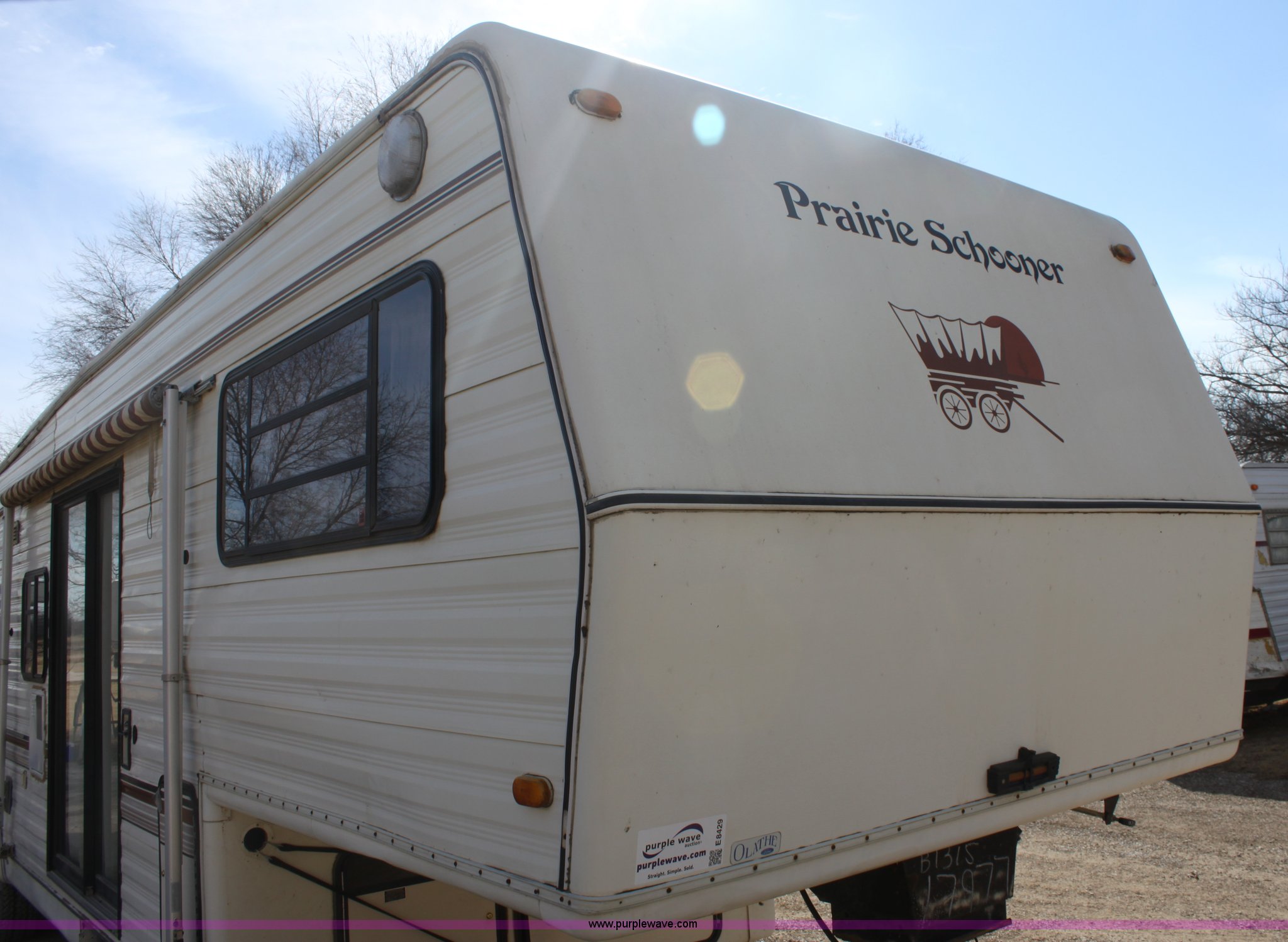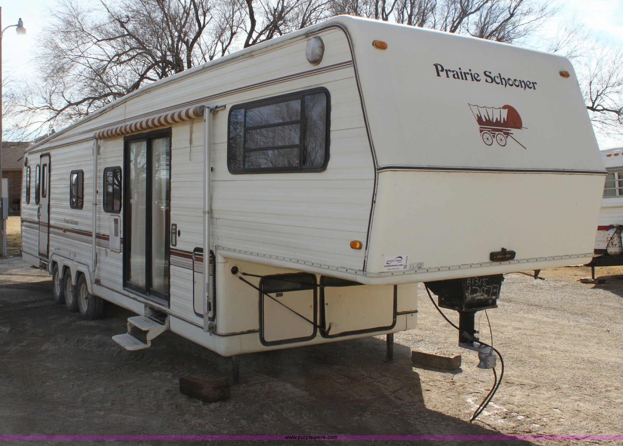 Purple Wave is selling a used RV in Kansas. This item is a 1985 Prairie Schooner camper with the following: Dual slide-outs, 8' and 6', Conservator refrigerator/freezer, System Monitor II, Fresh water, Gray holding tank, (2) rooftop Alas, Duo-therm, Coleman Mach, Roof has been cool sealed, 12' awning, Gooseneck adapter, Triple axle, Wheel bearings packed last year, 235/75R15 tires, 16 gallon water heated replaced last year, Faucets, refrigerator, hot water heater, toilet and one roof top AC have all been replaced