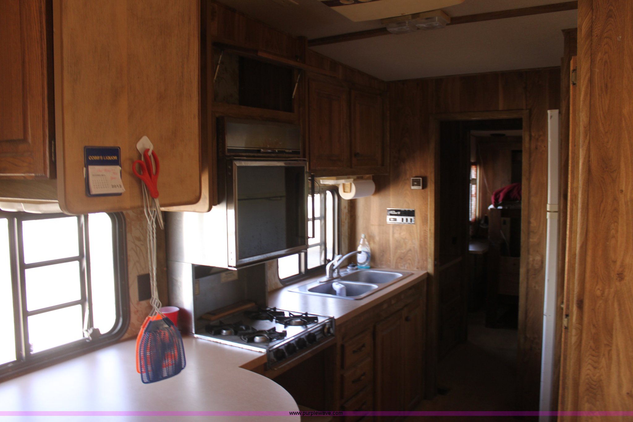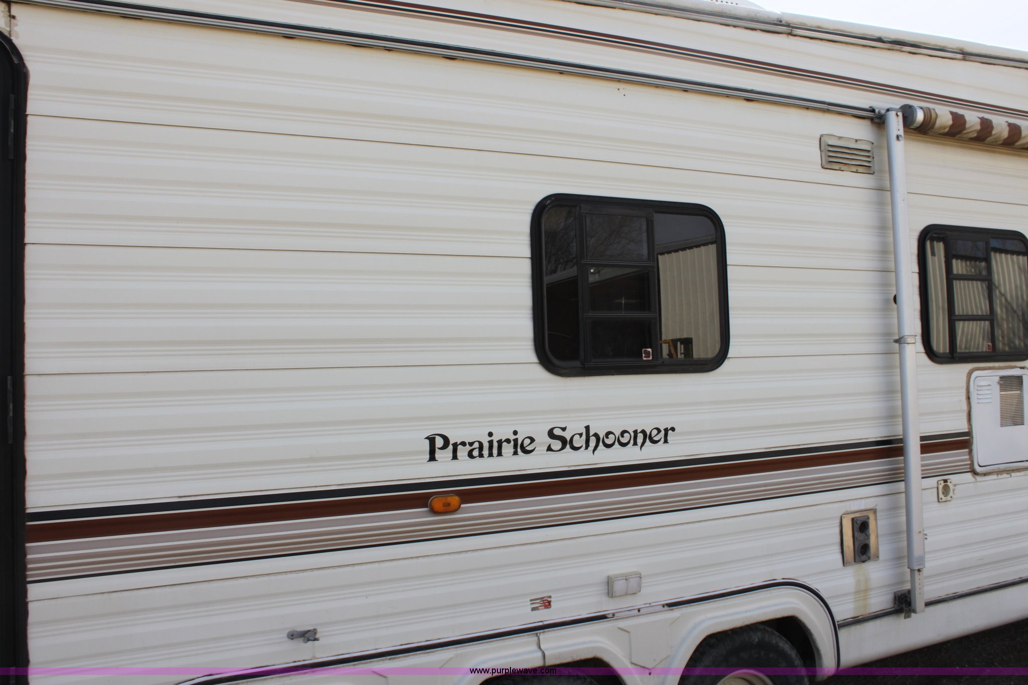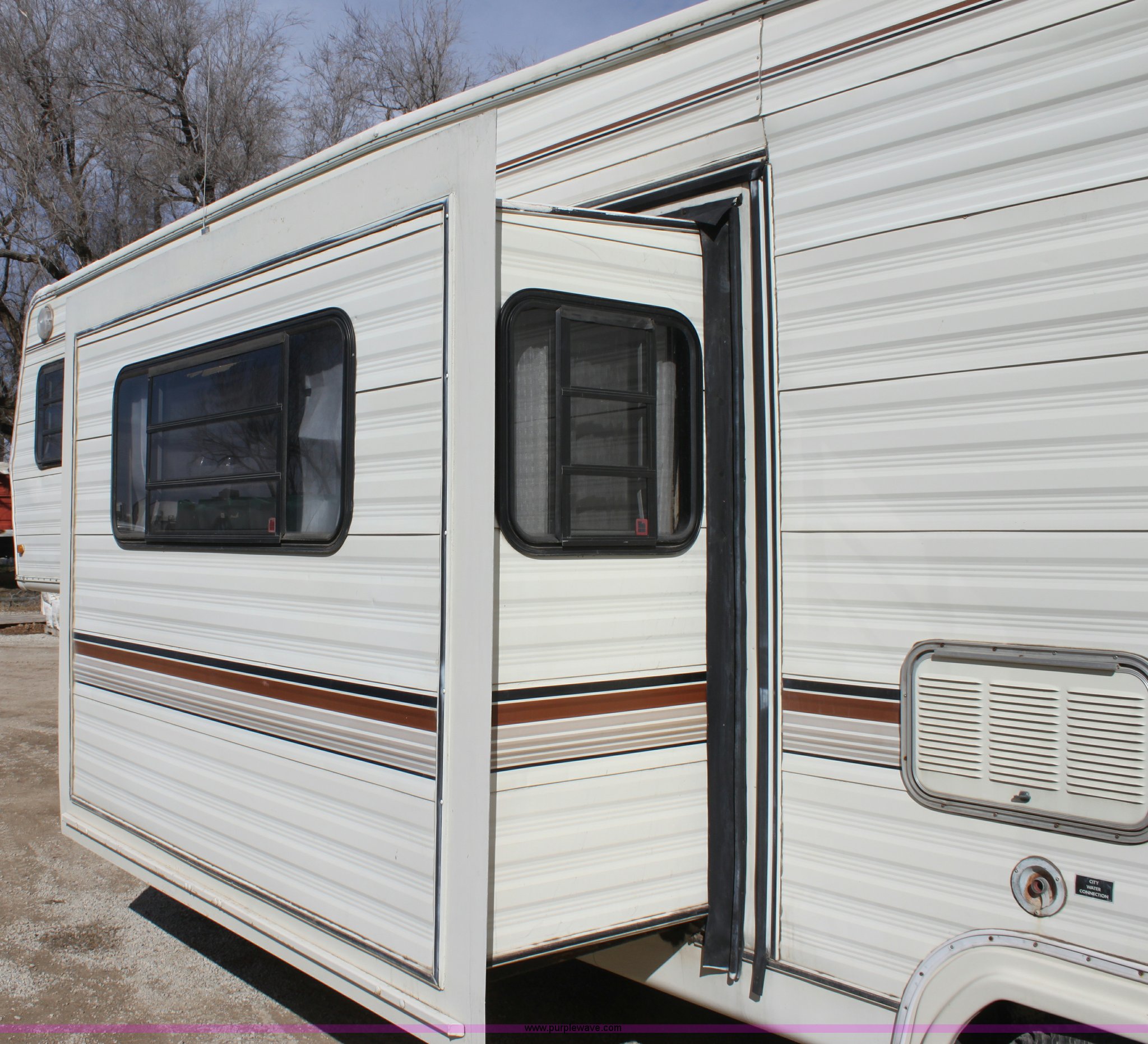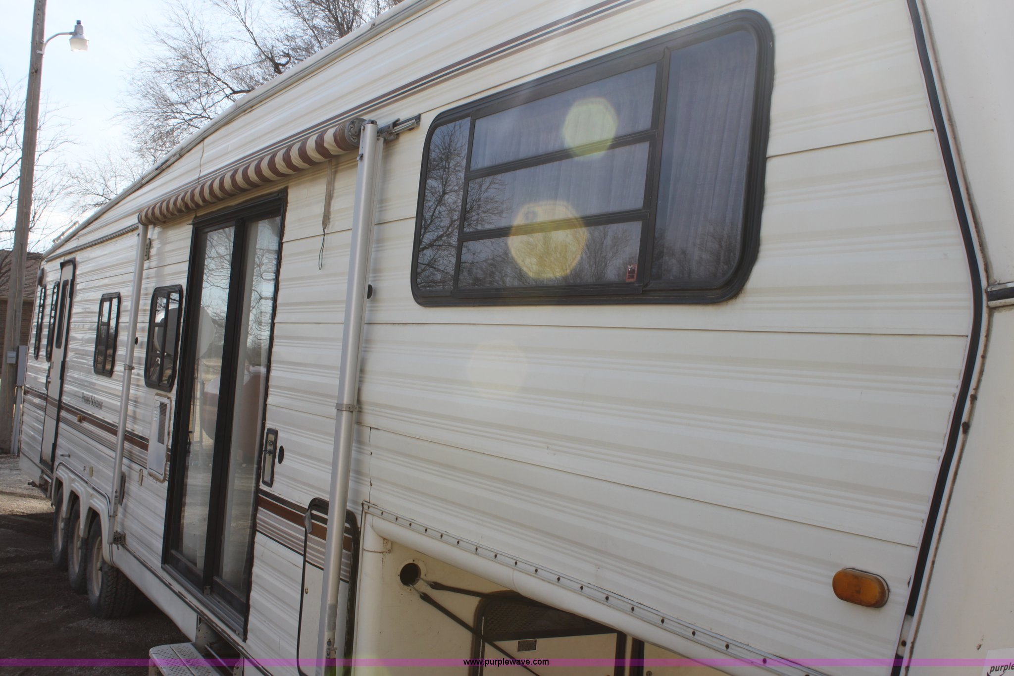 Purple Wave is selling a used RV in Kansas. This item is a 1985 Prairie Schooner camper with the following: Dual slide-outs, 8' and 6', Conservator refrigerator/freezer, System Monitor II, Fresh water, Gray holding tank, (2) rooftop Alas, Duo-therm, Coleman Mach, Roof has been cool sealed, 12' awning, Gooseneck adapter, Triple axle, Wheel bearings packed last year, 235/75R15 tires, 16 gallon water heated replaced last year, Faucets, refrigerator, hot water heater, toilet and one roof top AC have all been replaced