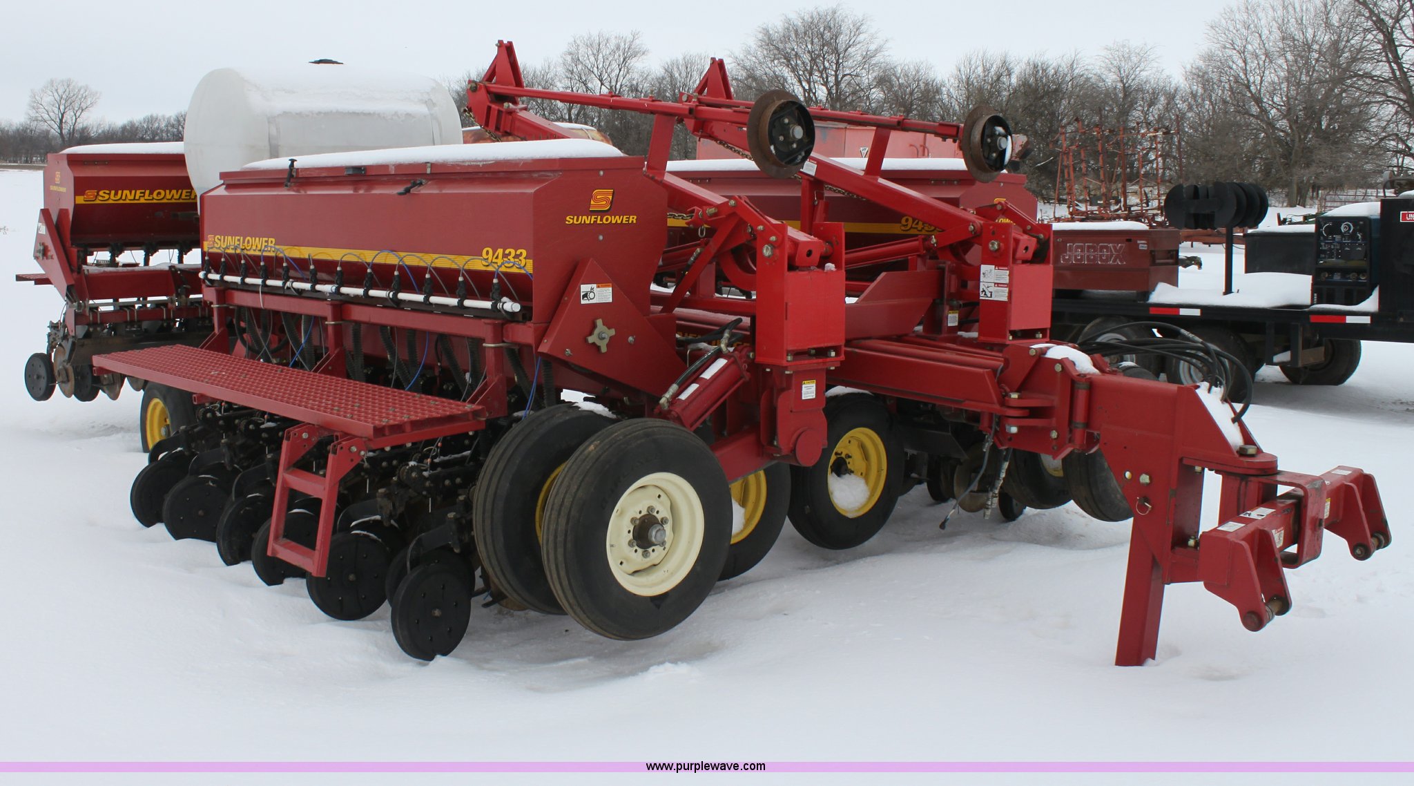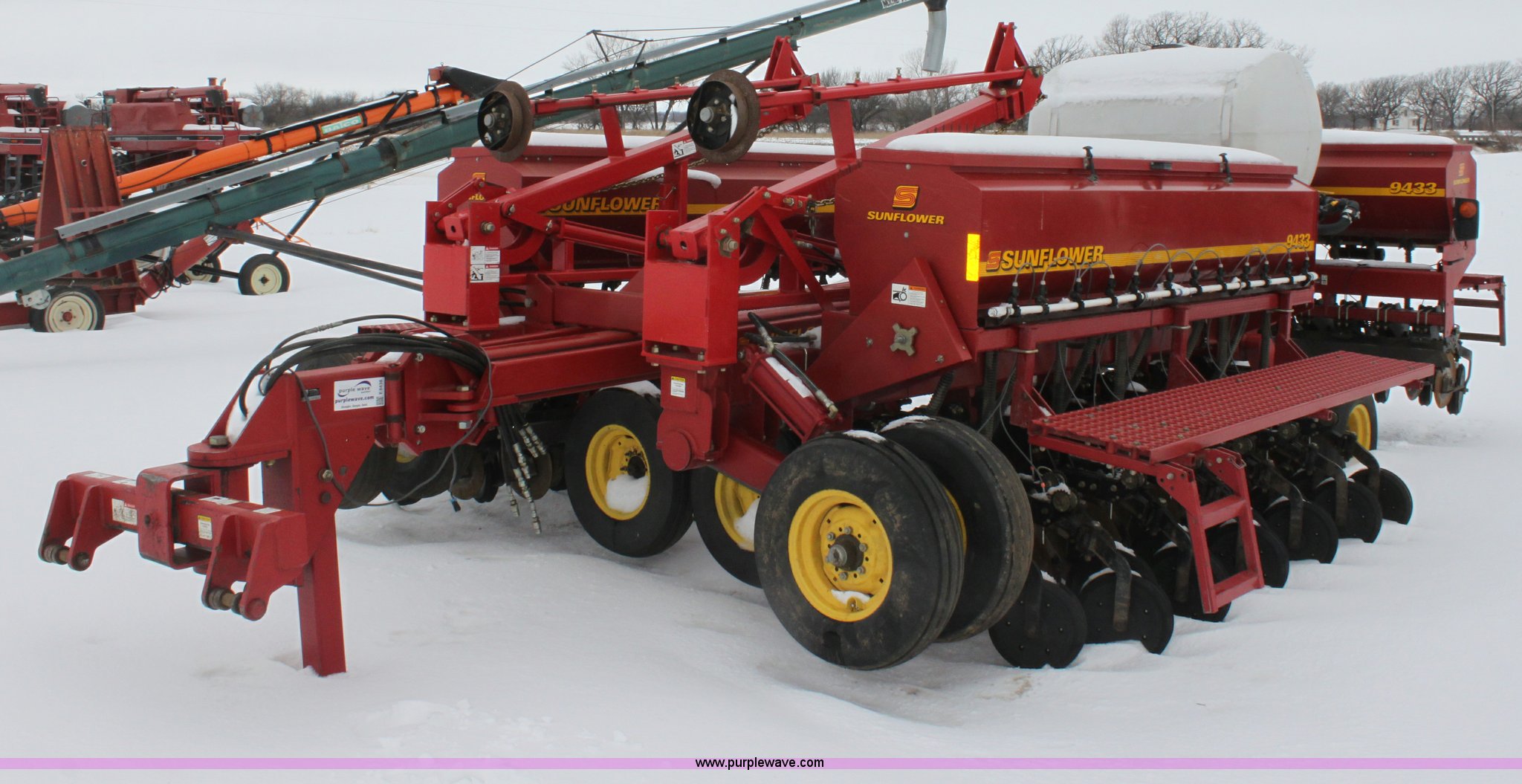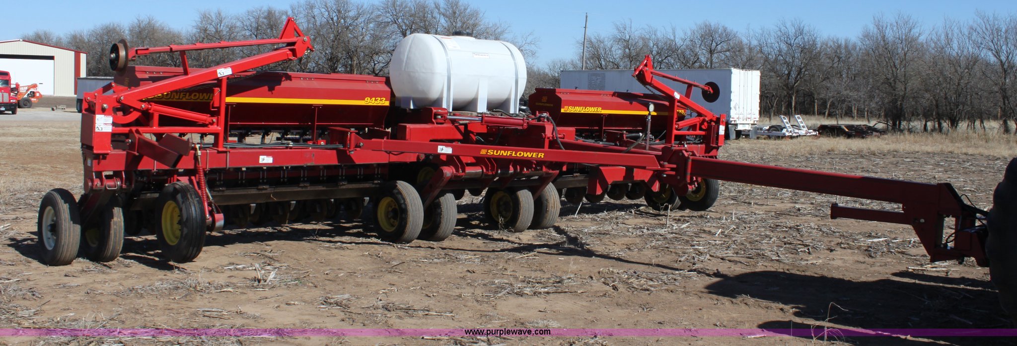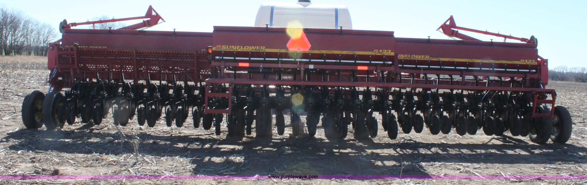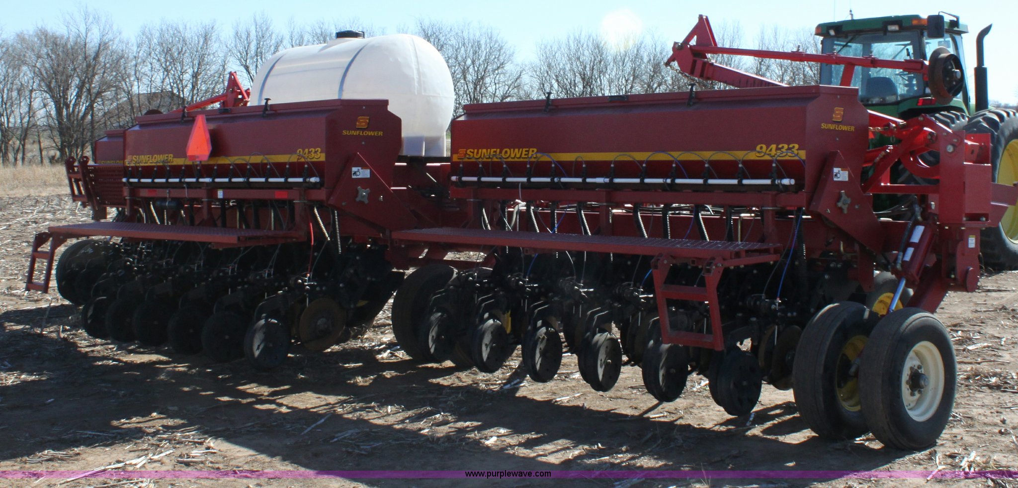 Purple Wave is selling a used Grain Drill or Seeder in Kansas. This item is a 2003 Sunflower 9432 30' folding drill with the following: 12,673 acres on meter, 36 row, 10" spacing, No-till markers, 300 gallon fertilizer tank, Ground drive, 14" blades, Replaced last year, 14" press wheels, Replaced one season ago, Double disk openers, 9.35L-15SL, Recently replaced closing wheels, Serial 9433B20020009