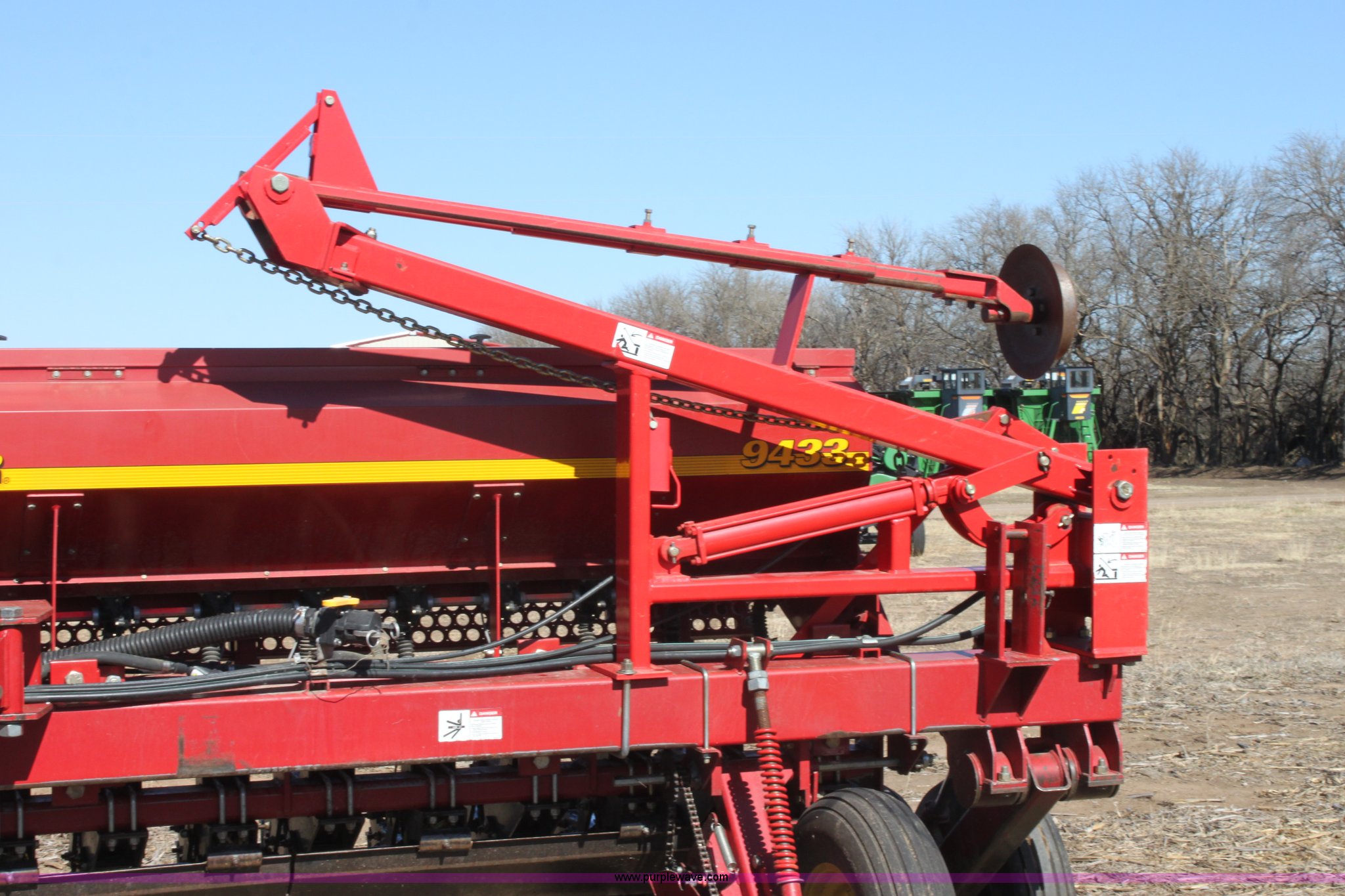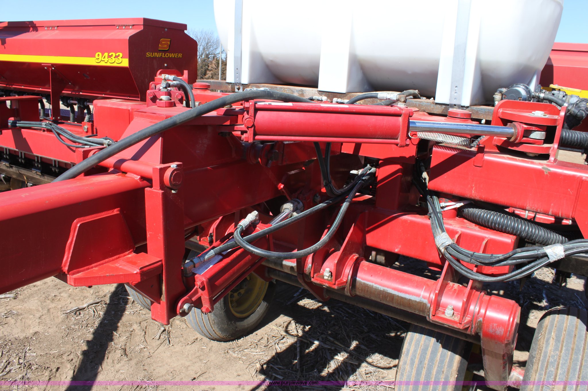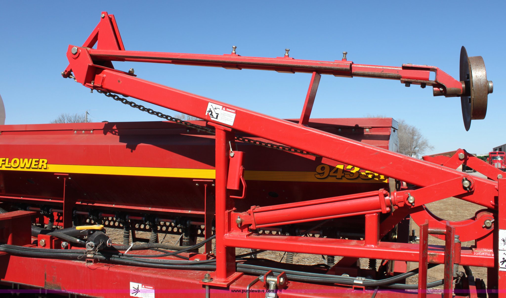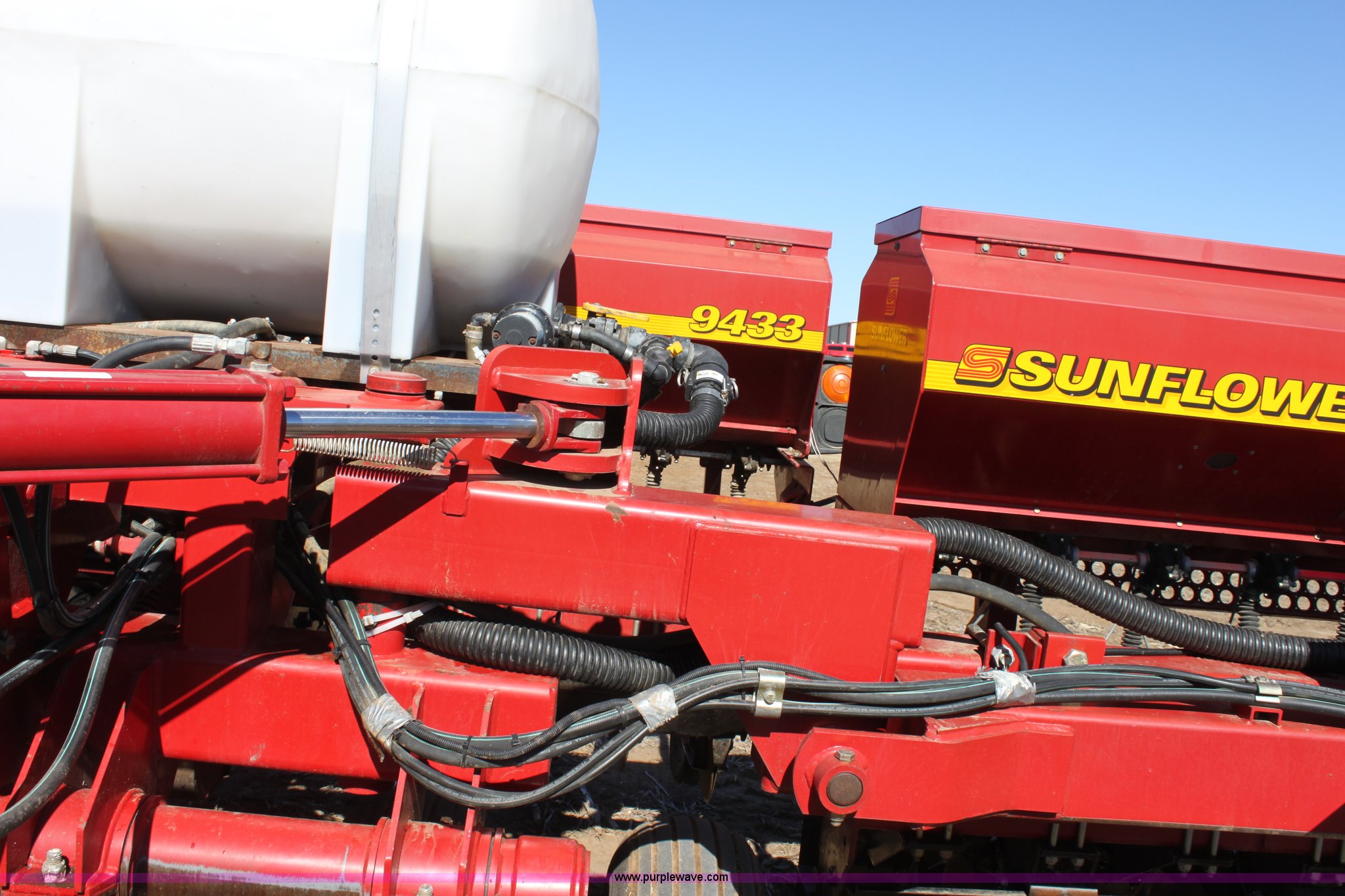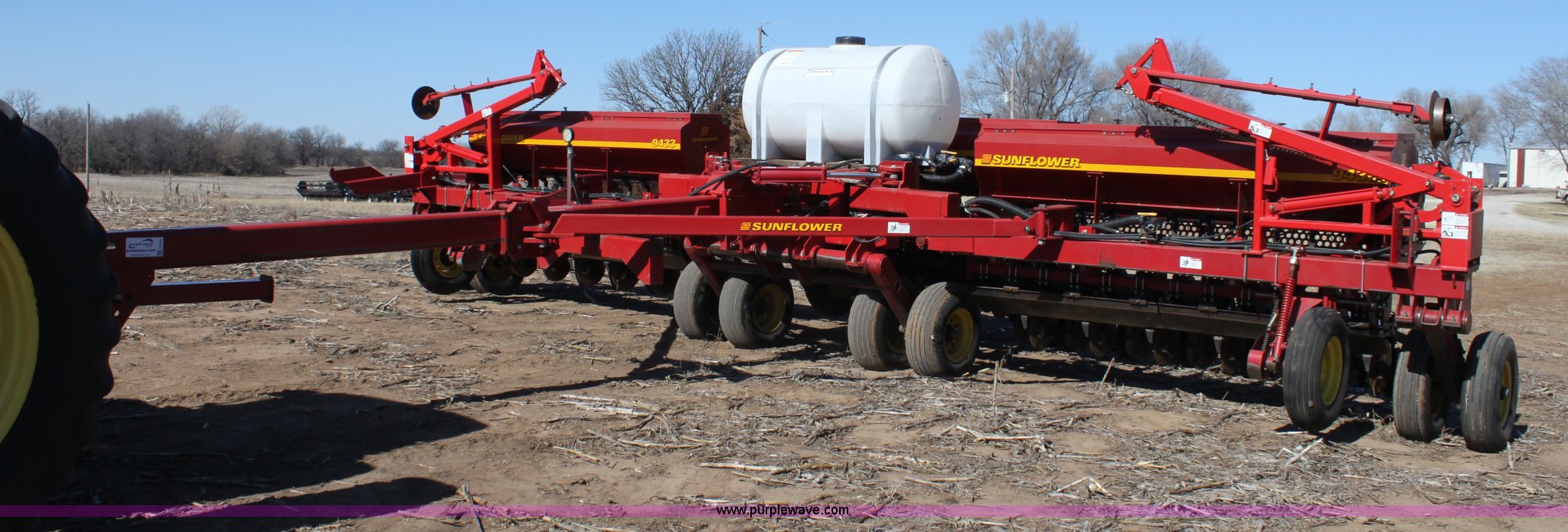 Purple Wave is selling a used Grain Drill or Seeder in Kansas. This item is a 2003 Sunflower 9432 30' folding drill with the following: 12,673 acres on meter, 36 row, 10" spacing, No-till markers, 300 gallon fertilizer tank, Ground drive, 14" blades, Replaced last year, 14" press wheels, Replaced one season ago, Double disk openers, 9.35L-15SL, Recently replaced closing wheels, Serial 9433B20020009
