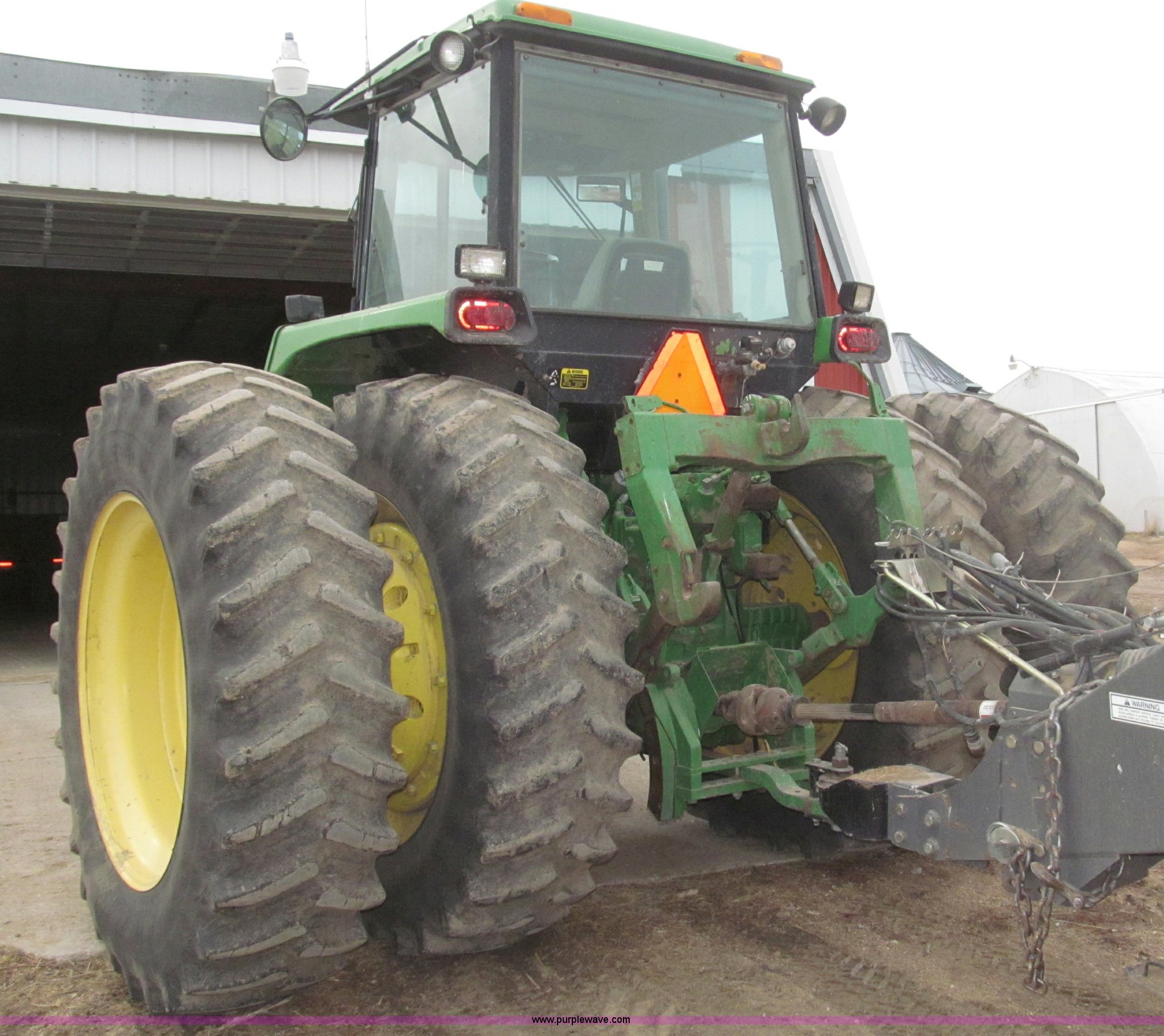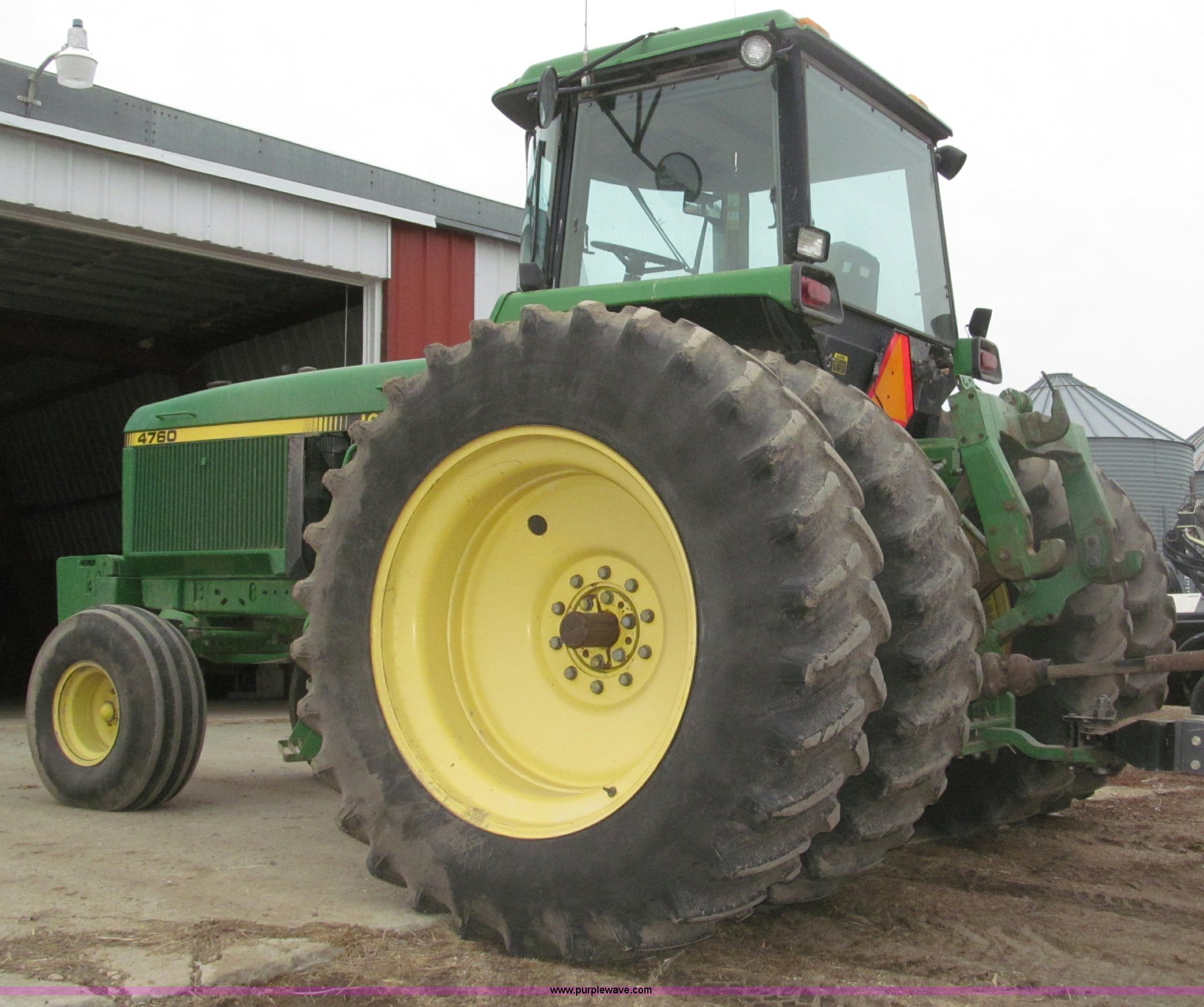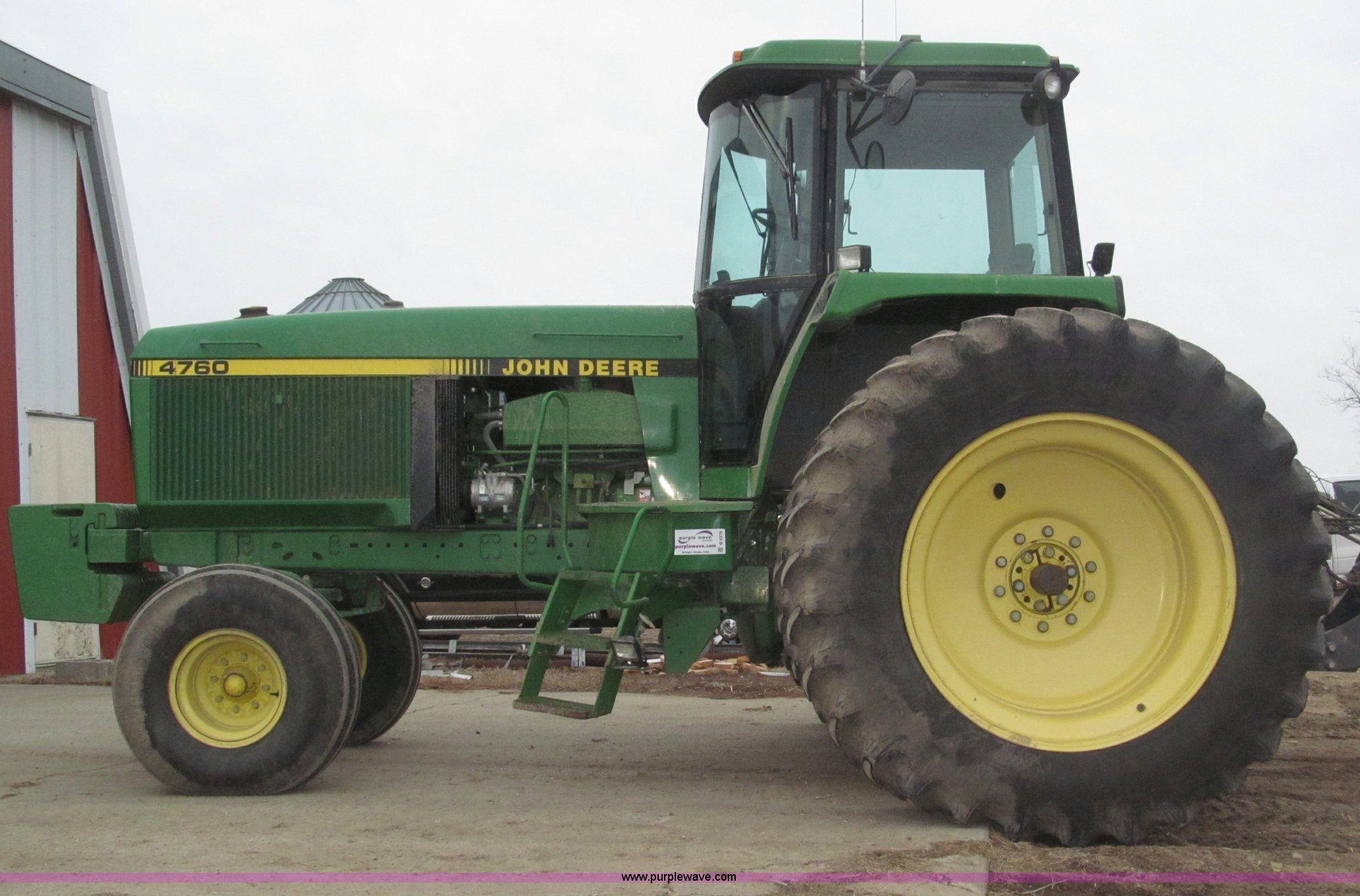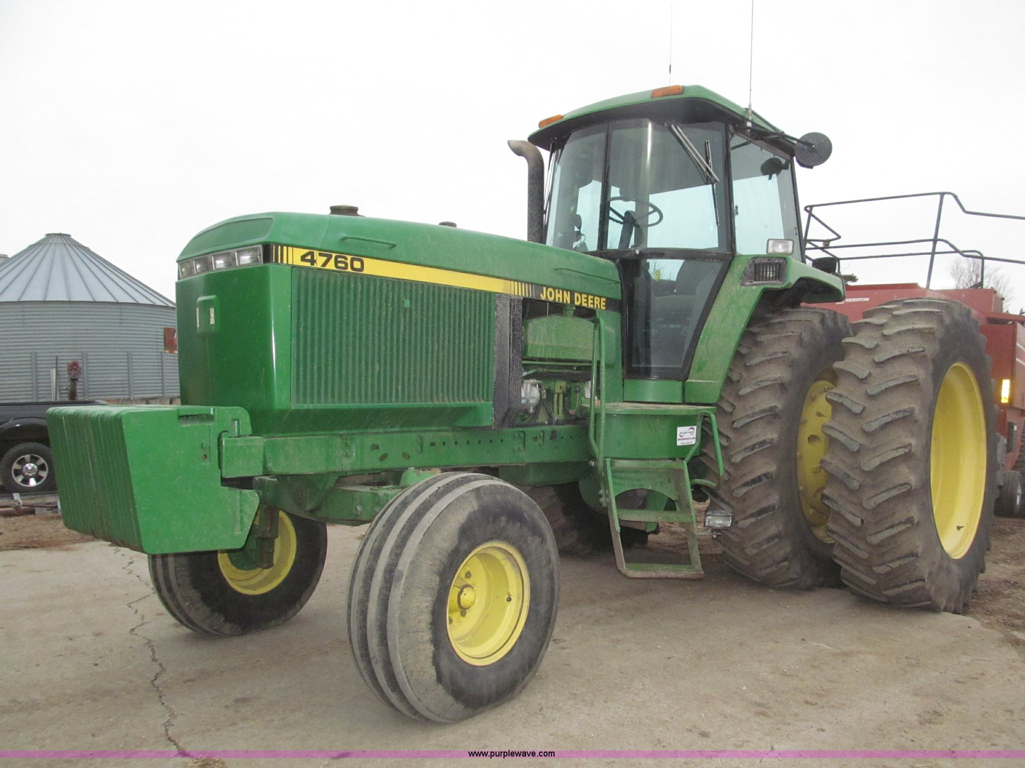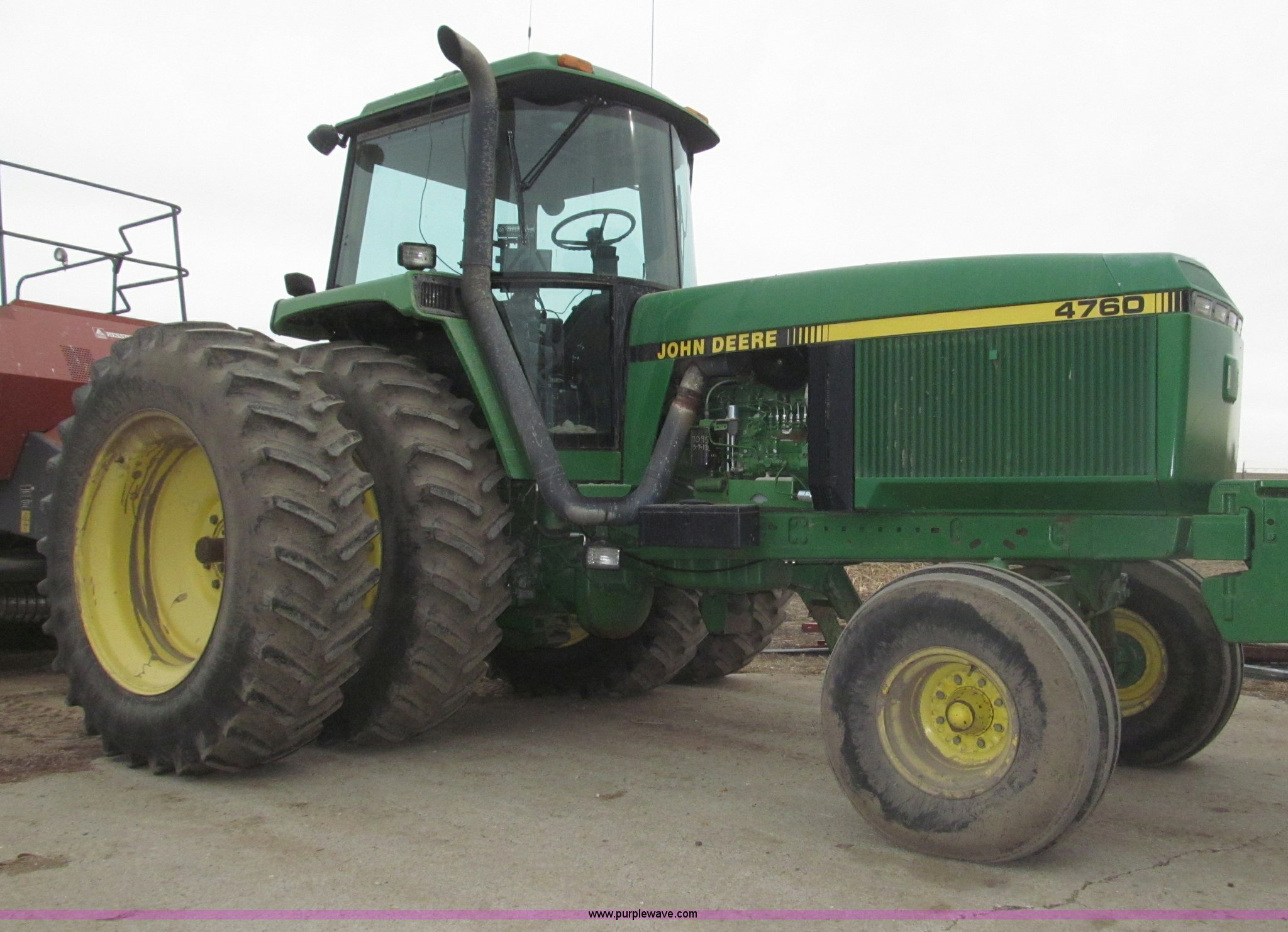 Purple Wave is selling a used Tractor in Nebraska. This item is a 1992 John Deere 4760 tractor with the following: John Deere 7.6L turbo diesel, 175 HP, Partial powershift transmission, 16F-6R gears, Locking differential, AC and heat, Tilt, AM/FM, Front and rear work lights, Electro hydraulic three point draft sensing, Side mounted toolbox, Three point, Three point quick attach, Draw Bar, Auxiliary outlet, 540/1000 PTO, (7) rear hydraulic remotes, (19) suitcase weights, Block heater, Ether aid, 102 gallon fuel tank, Front side vertical exhaust, 118.5" wheelbase, Firestone 14L-16.1 front tires, Firestone 18.4R42 dual rear tires, 18,703 lbs. base operating weight, Maintenance history available upon request, Serial RW4760P001280