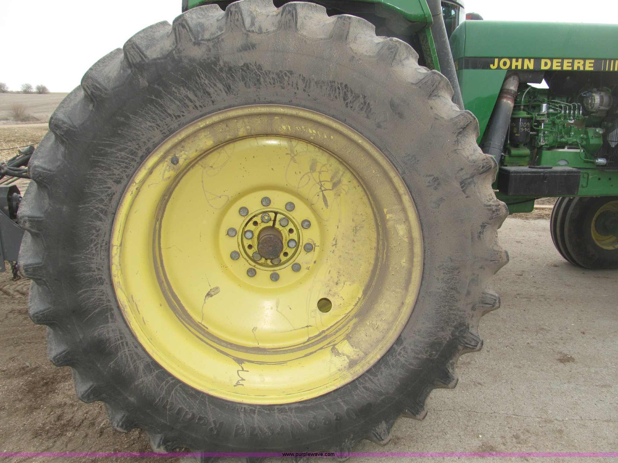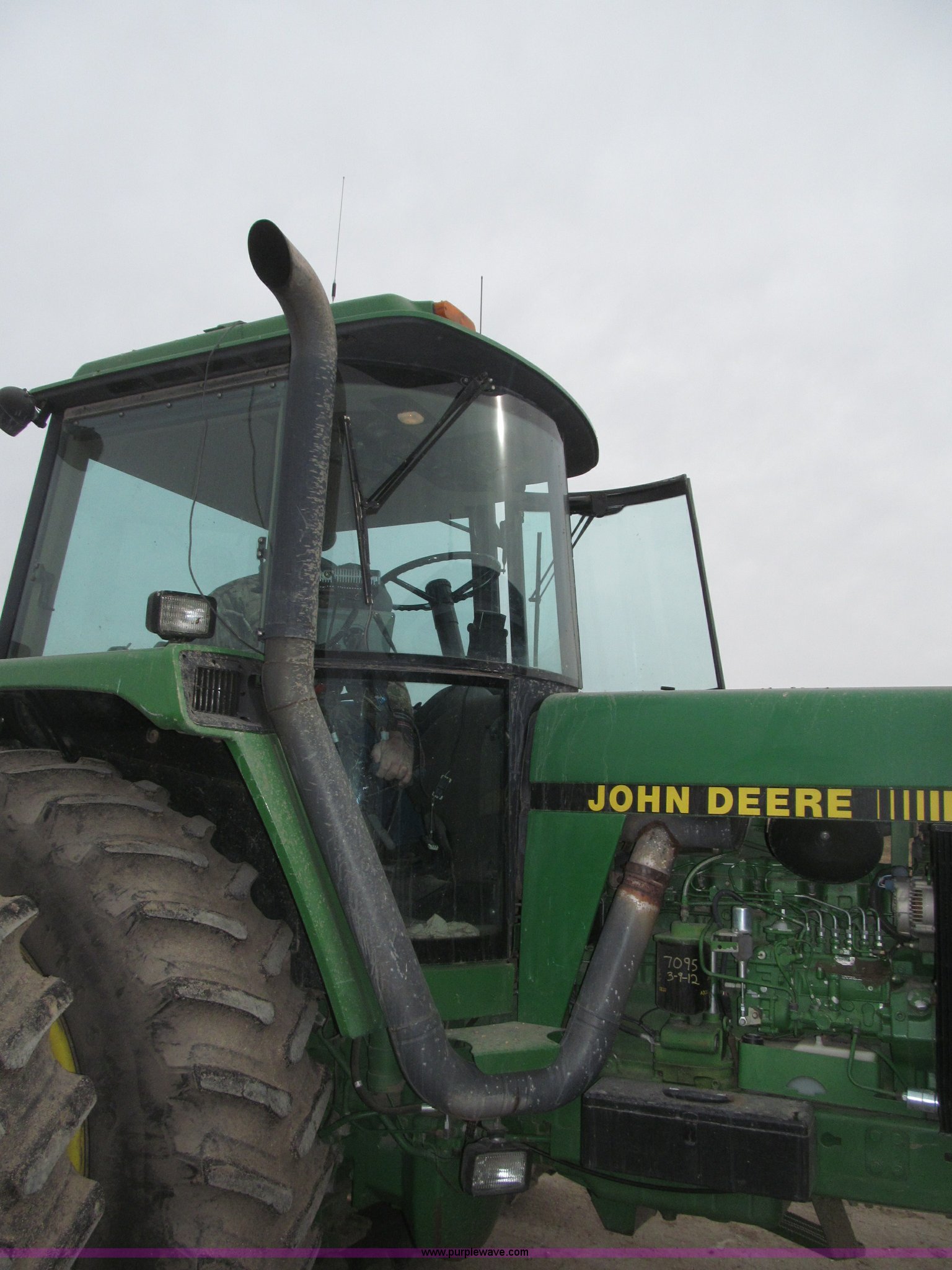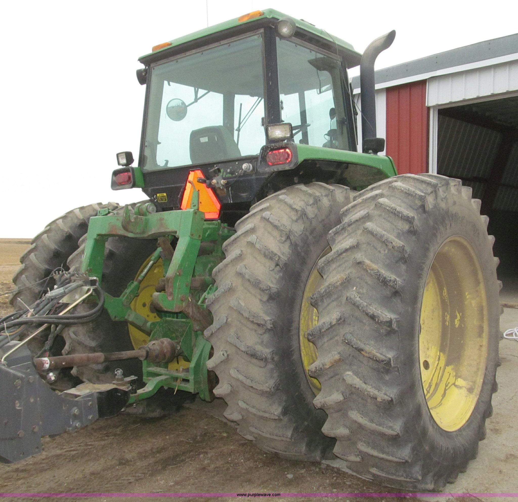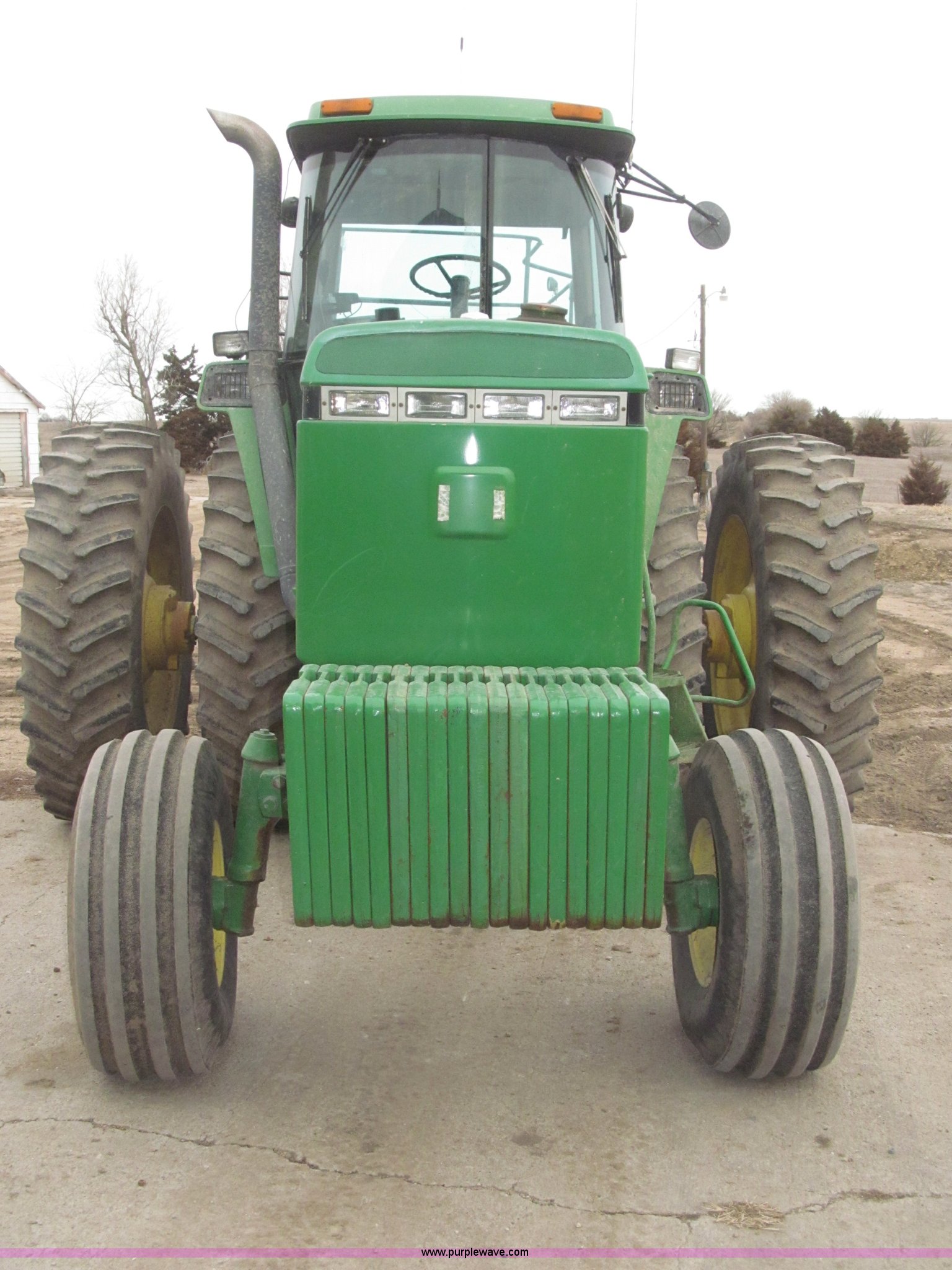 Purple Wave is selling a used Tractor in Nebraska. This item is a 1992 John Deere 4760 tractor with the following: John Deere 7.6L turbo diesel, 175 HP, Partial powershift transmission, 16F-6R gears, Locking differential, AC and heat, Tilt, AM/FM, Front and rear work lights, Electro hydraulic three point draft sensing, Side mounted toolbox, Three point, Three point quick attach, Draw Bar, Auxiliary outlet, 540/1000 PTO, (7) rear hydraulic remotes, (19) suitcase weights, Block heater, Ether aid, 102 gallon fuel tank, Front side vertical exhaust, 118.5" wheelbase, Firestone 14L-16.1 front tires, Firestone 18.4R42 dual rear tires, 18,703 lbs. base operating weight, Maintenance history available upon request, Serial RW4760P001280