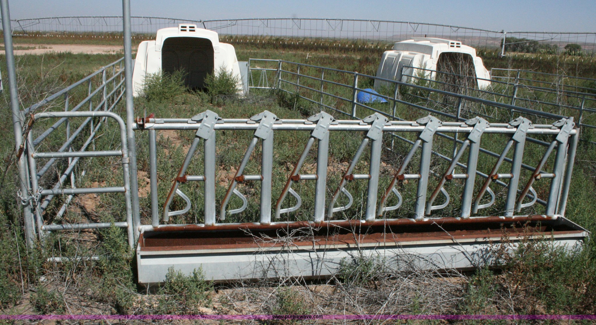 Purple Wave is selling a used Livestock Equip. in New Mexico. This item is a Agri-Plastics calf hutch with the following: 12' x 32' growing pen, 9'W x 6.5'H hutch with front and rear vents, Eight hole stanchion fence with feed trough, Front and rear gates