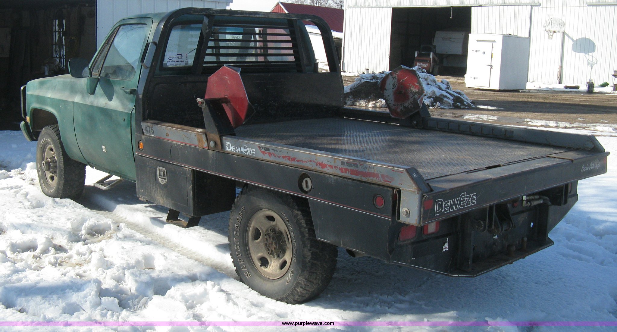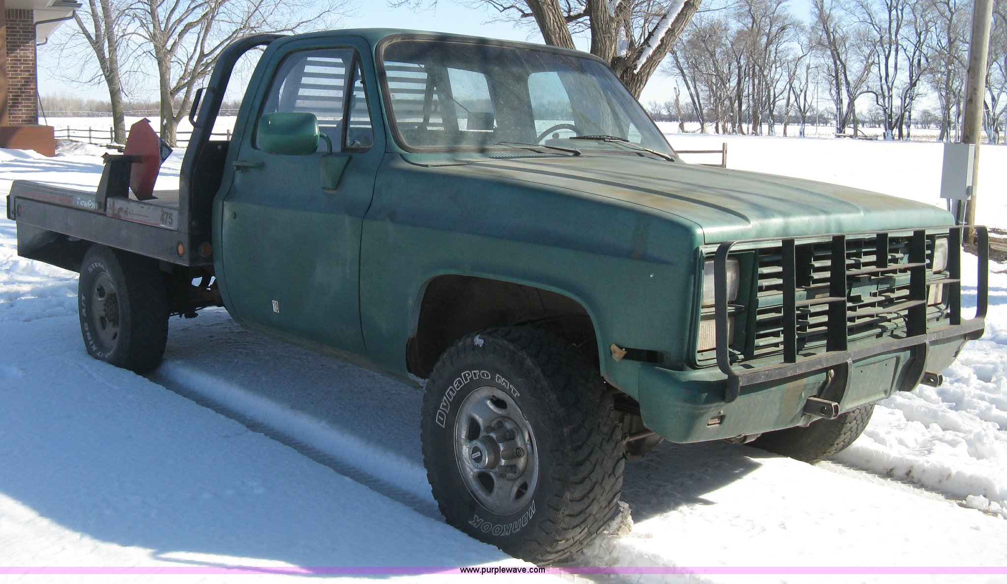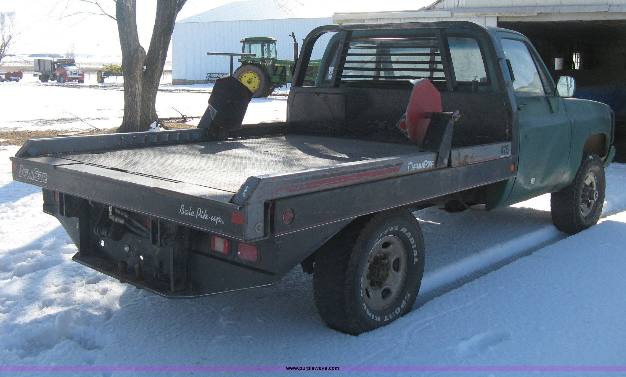 1985 Chevrolet flatbed pickup truck. 72,463 miles on odometer, 6.2L V8 diesel engine, Automatic transmission, Four wheel drive, Heat, AM/FM/CD Inoperable, Manual windows and locks, Vinyl interior, DewEze 475 bale bed 8.8'L x 7'W, Electric over hydraulic, Diamond plate floor, Headache rack, Under mount toolbox, Recessed gooseneck ball, DewEze in-cab hand control, LT28575R16 tires, GVWR 8,800 lbs, Interior cosmetic damage, Cracked windshield, Cracked transmission case, Power steering cylinder leaks. 1GCGD34JXFF374693. Shipping quotes available. Colwich, KS 67030