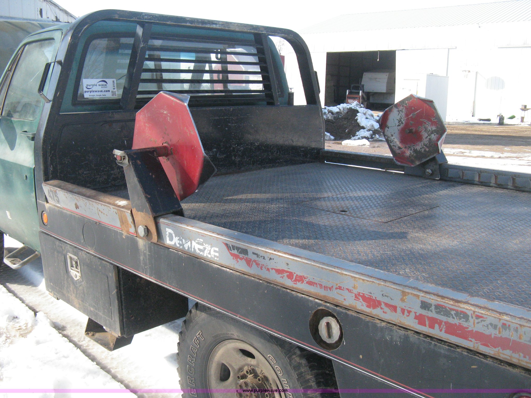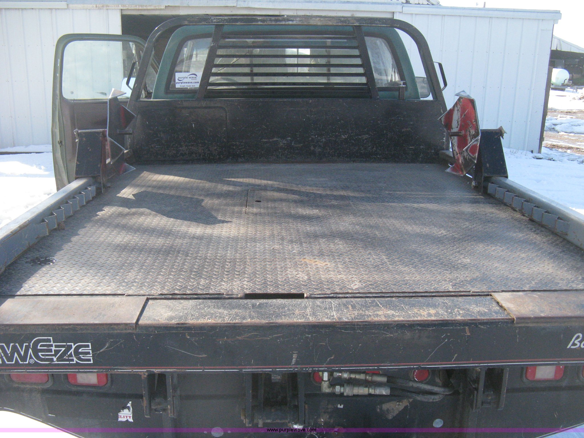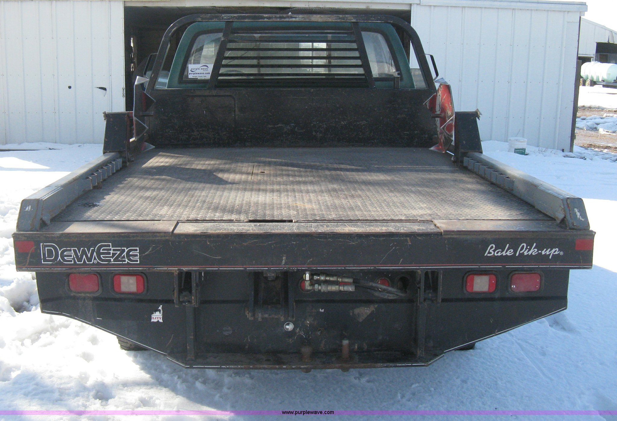 1985 Chevrolet flatbed pickup truck. 72,463 miles on odometer, 6.2L V8 diesel engine, Automatic transmission, Four wheel drive, Heat, AM/FM/CD Inoperable, Manual windows and locks, Vinyl interior, DewEze 475 bale bed 8.8'L x 7'W, Electric over hydraulic, Diamond plate floor, Headache rack, Under mount toolbox, Recessed gooseneck ball, DewEze in-cab hand control, LT28575R16 tires, GVWR 8,800 lbs, Interior cosmetic damage, Cracked windshield, Cracked transmission case, Power steering cylinder leaks. 1GCGD34JXFF374693. Shipping quotes available. Colwich, KS 67030