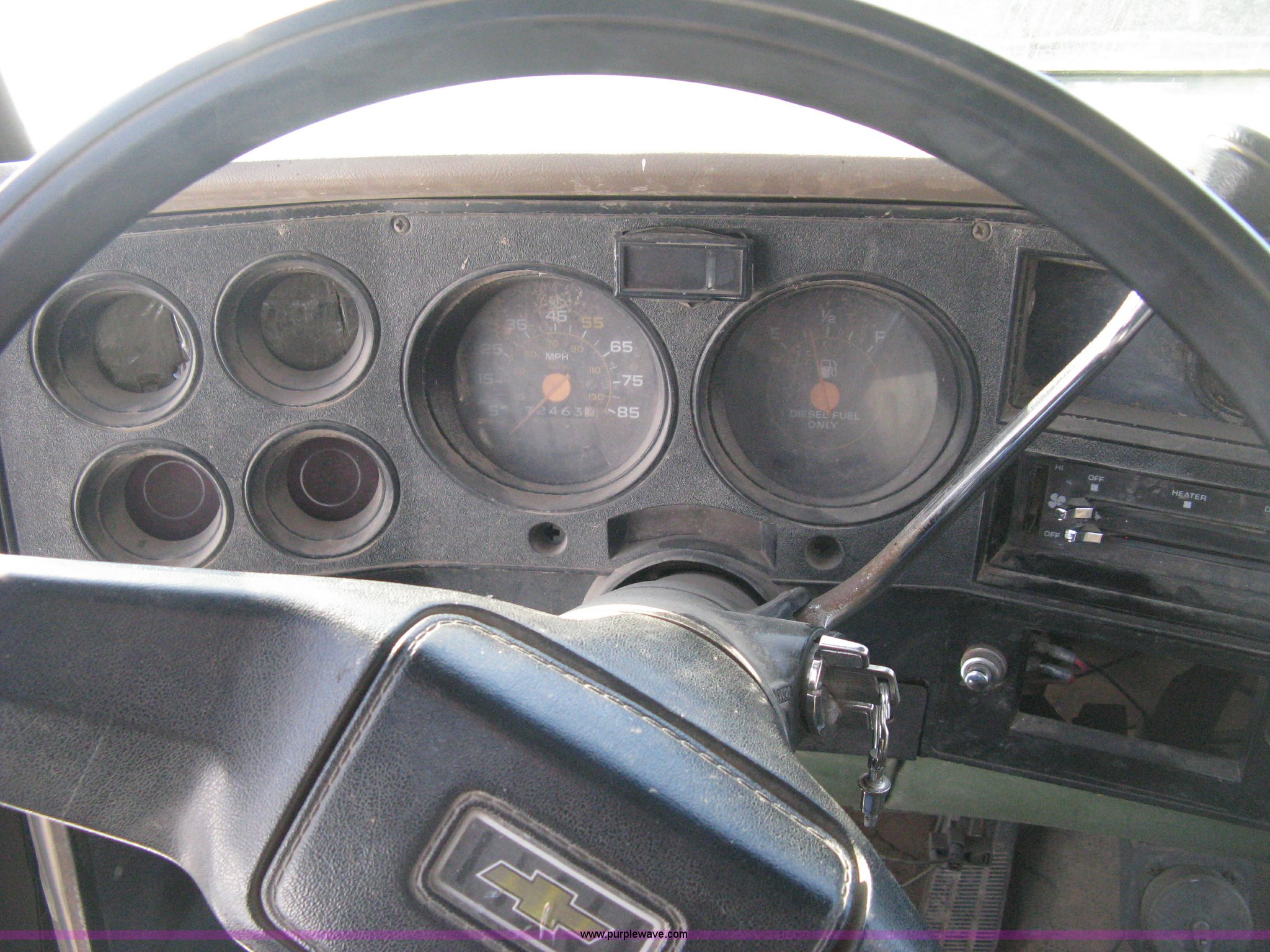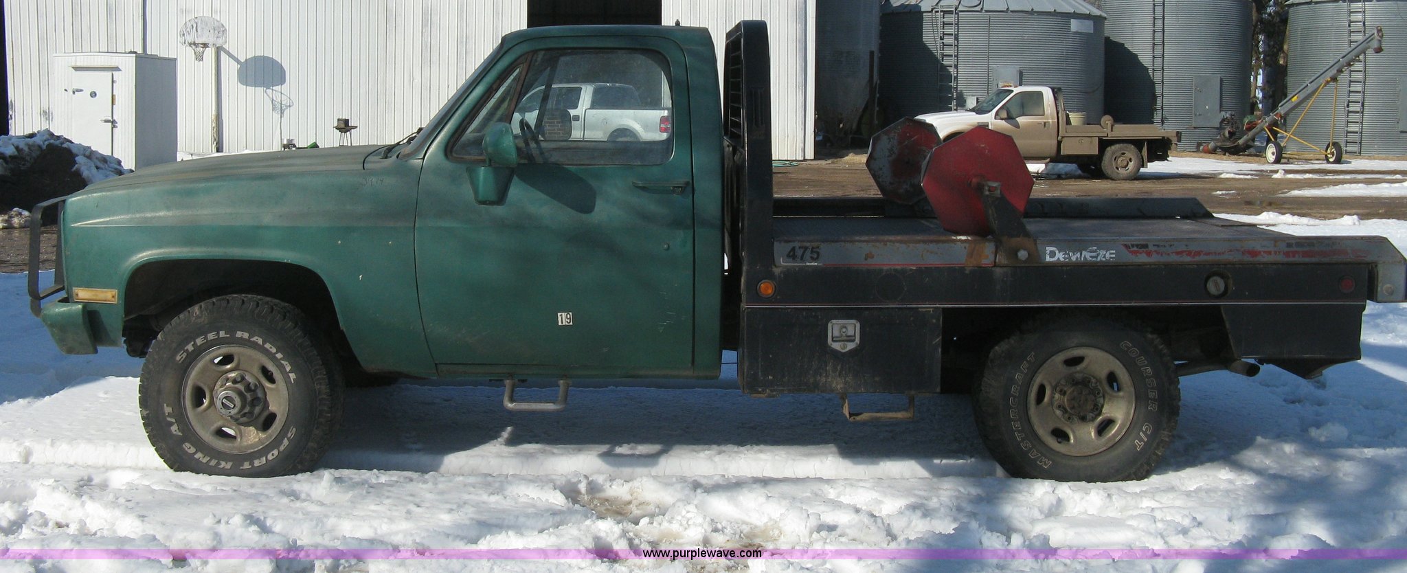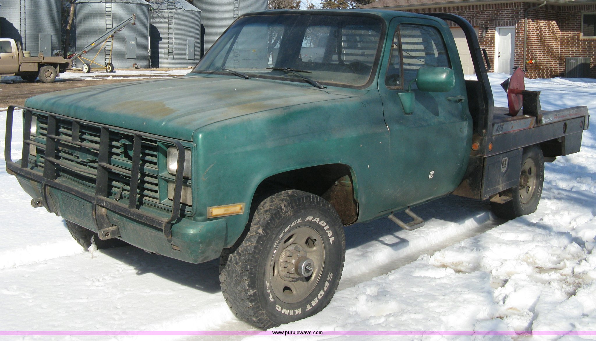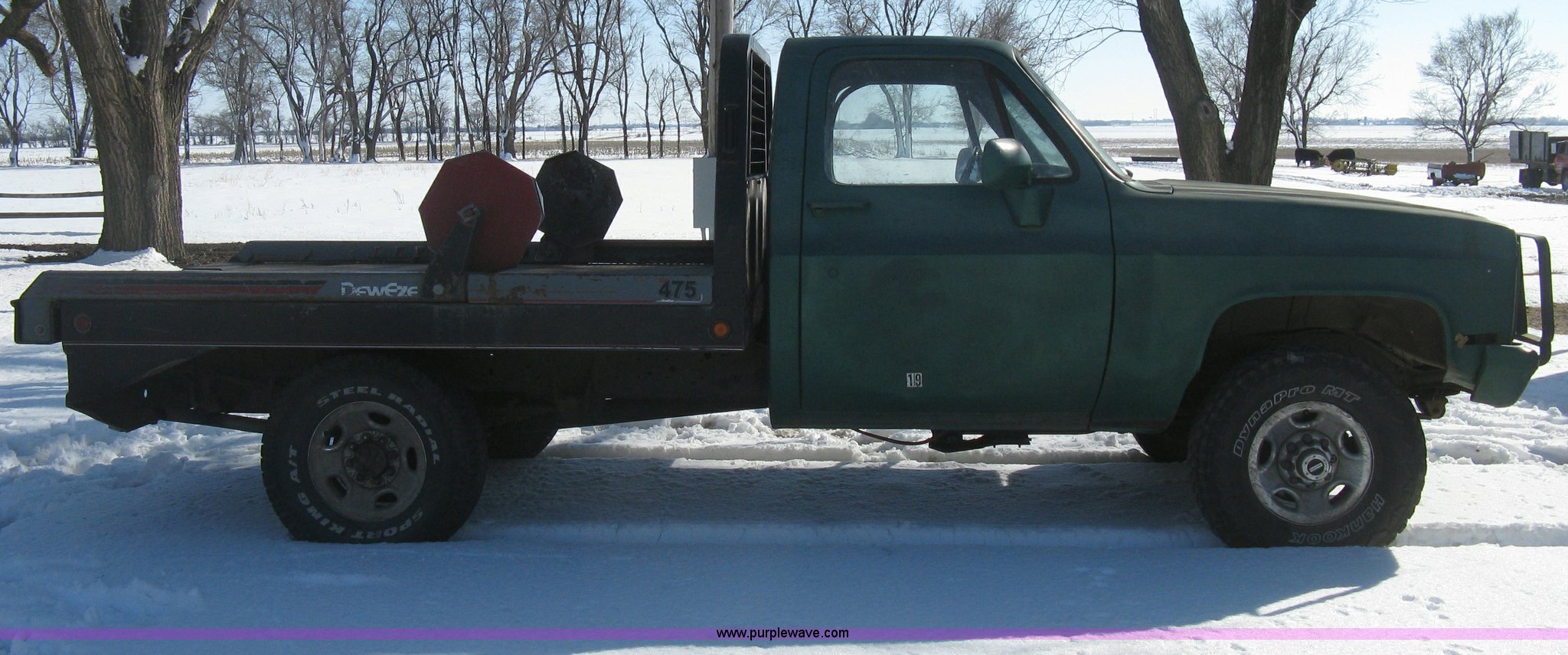 Purple Wave is selling a used Passenger Vehicle in Kansas. This item is a 1985 Chevrolet flatbed pickup truck with the following: 72,463 miles on odometer, 6.2L V8 diesel engine, Automatic transmission, Four wheel drive, Heat, AM/FM/CD, Inoperable, Manual windows and locks, Vinyl interior, DewEze 475 bale bed, 8.8'L x 7'W, Electric over hydraulic, Diamond plate floor, Headache rack, Under mount toolbox, Recessed gooseneck ball, DewEze in-cab hand control, LT28575R16 tires, GVWR 8,800 lbs, Interior cosmetic damage, Cracked windshield, Cracked transmission case, Power steering cylinder leaks