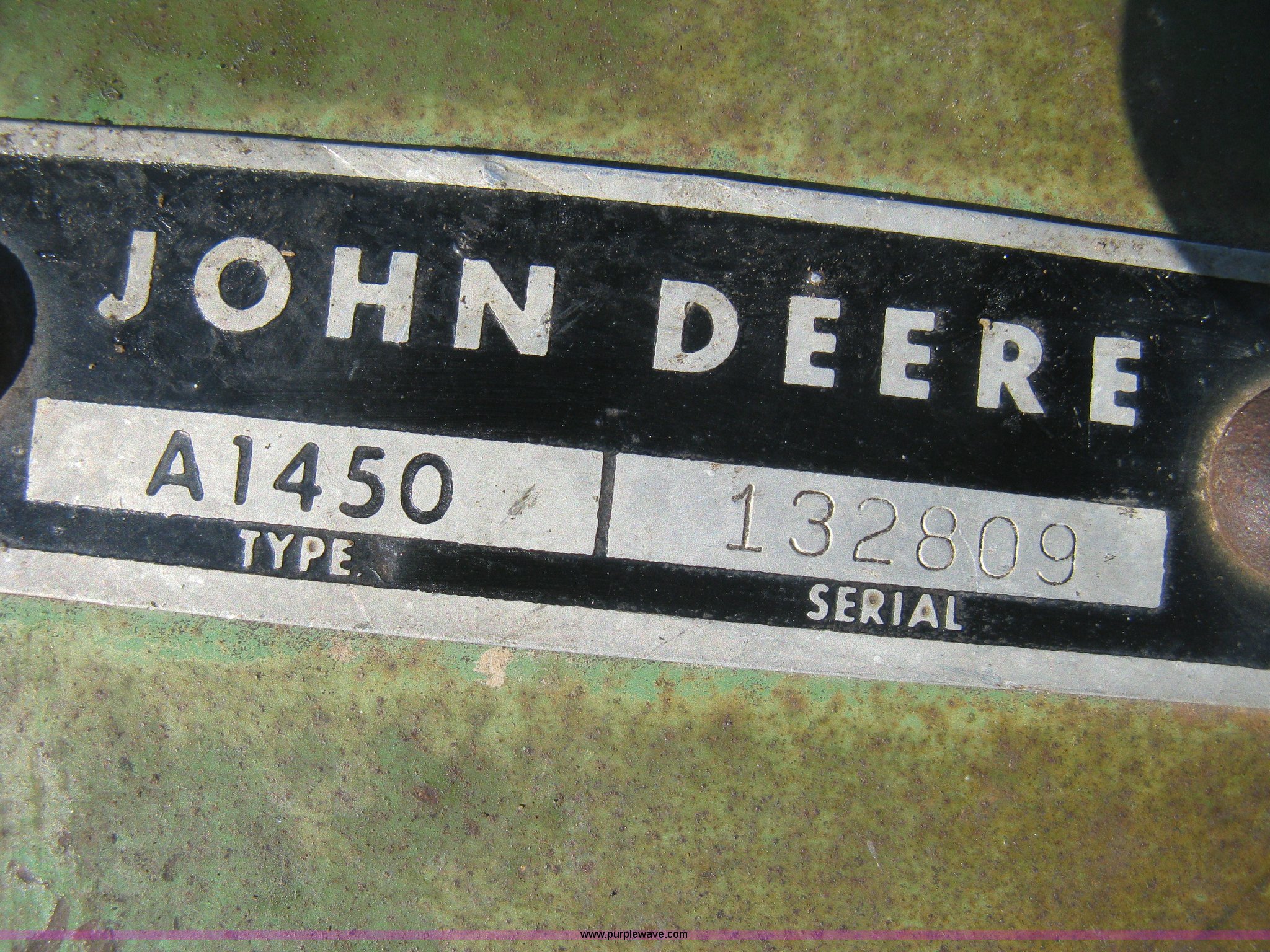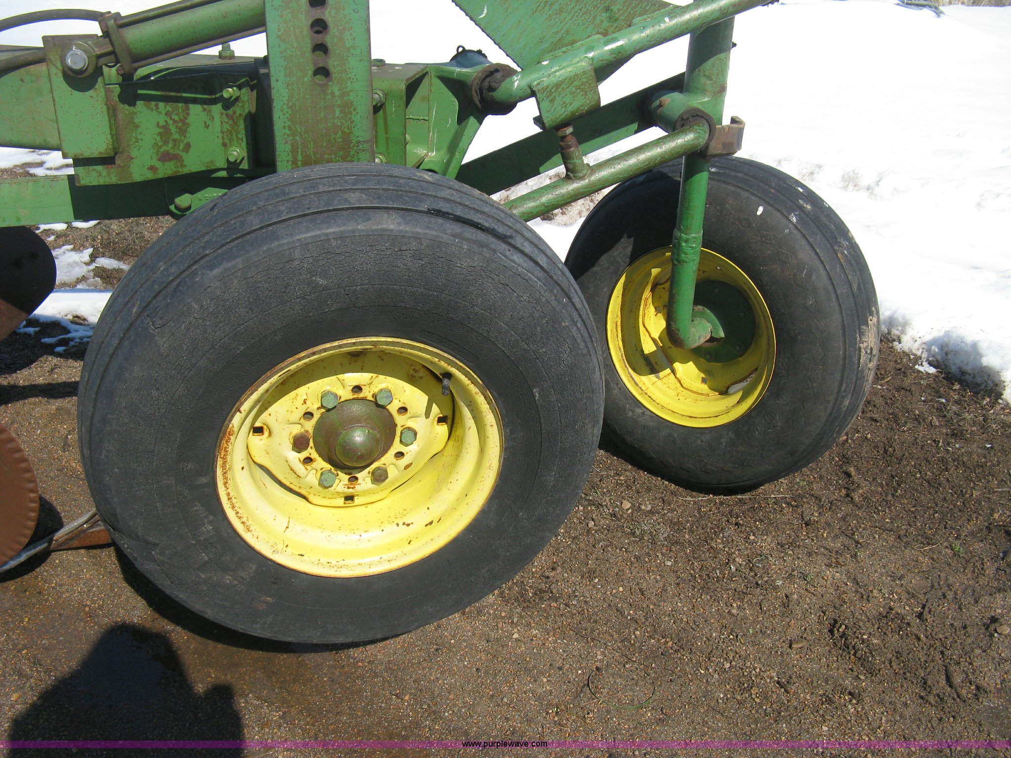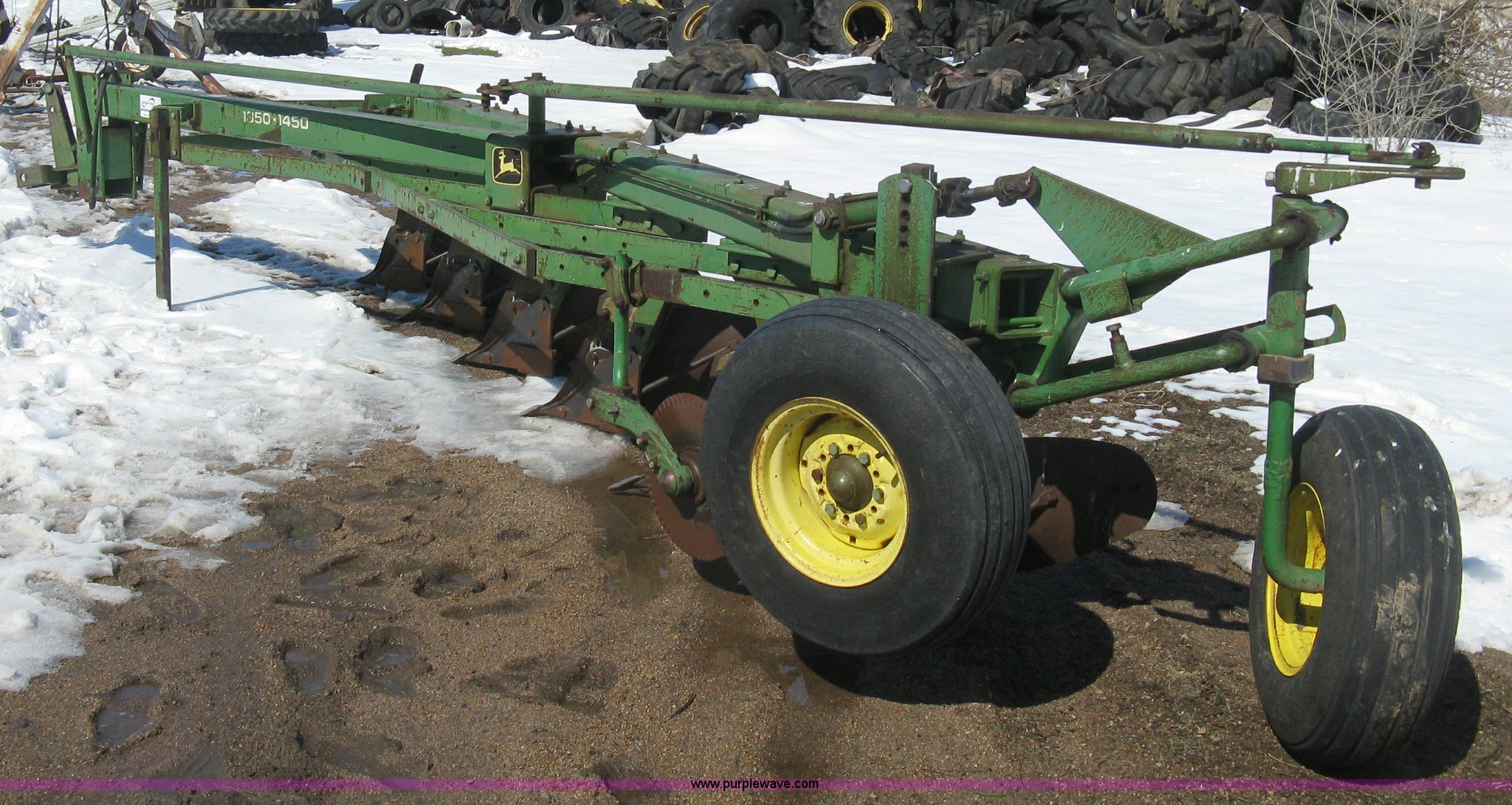 Purple Wave is selling a used Plow in Kansas. This item is a John Deere 1350-1450 six bottom plow with the following: Type A1450, Three point hitch, (2) rear dolly wheels, 9.5L-14 tires, Damaged, Serial 132809