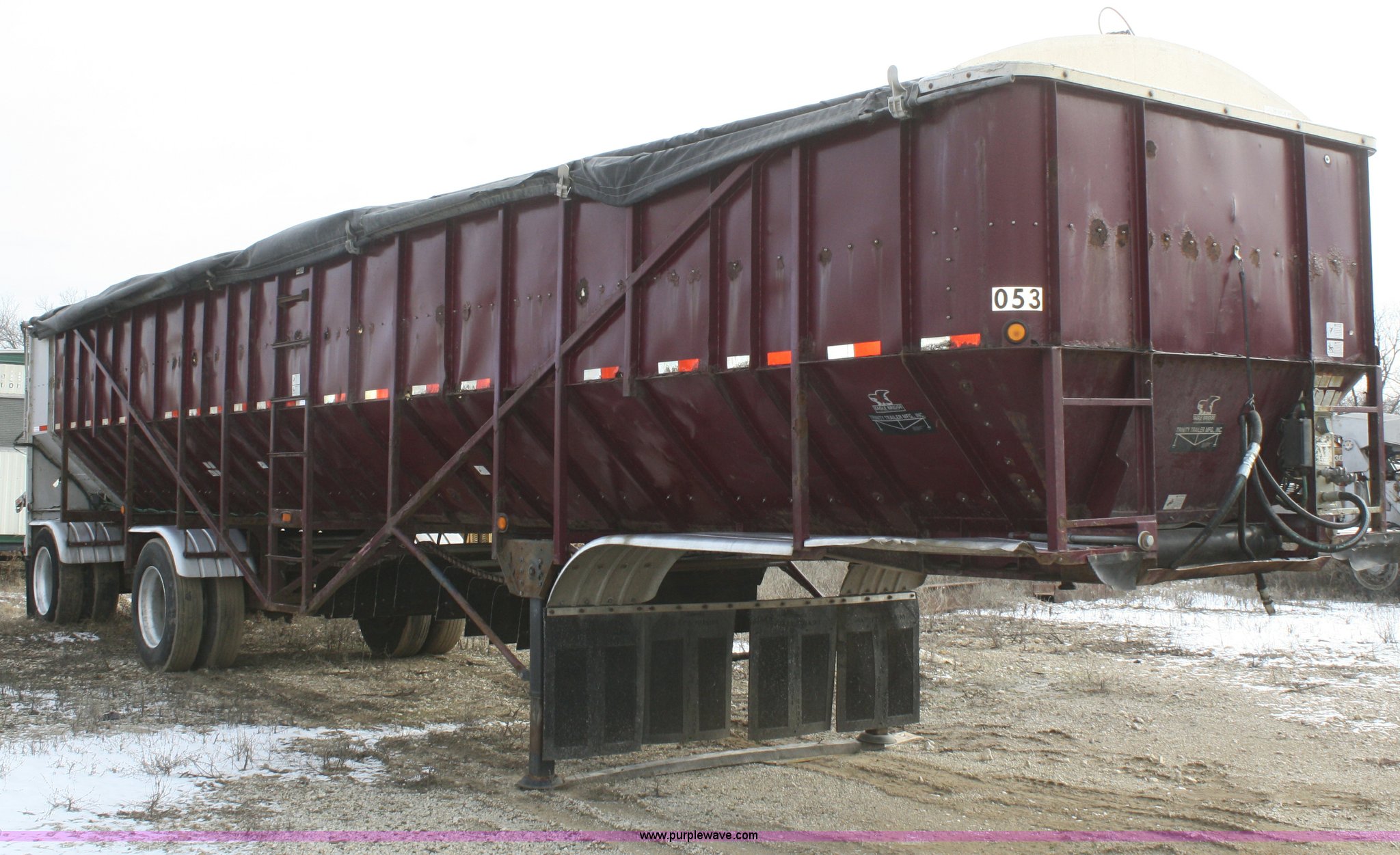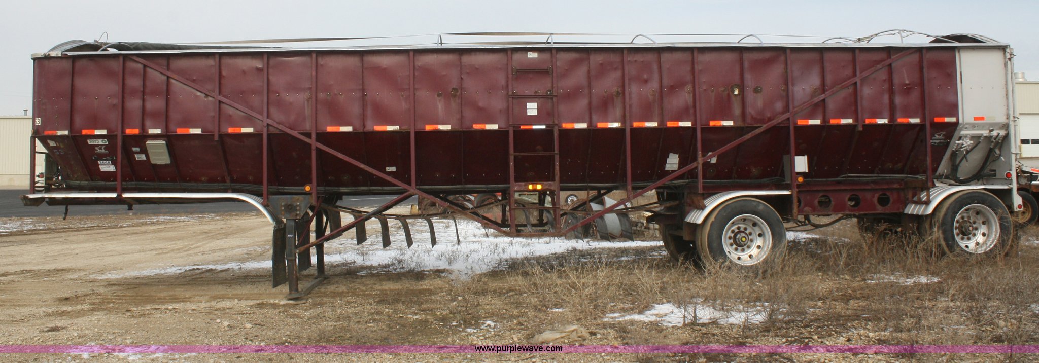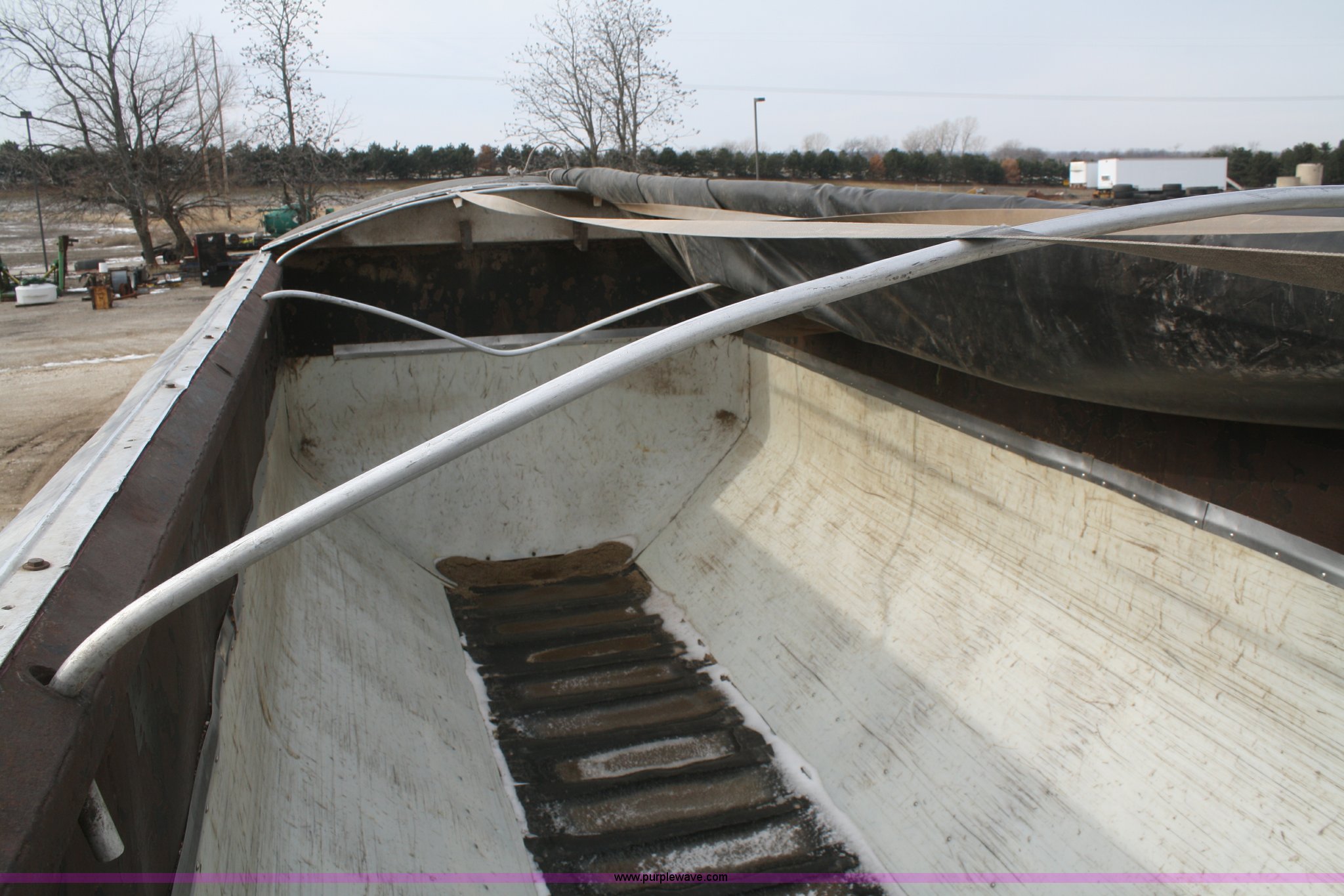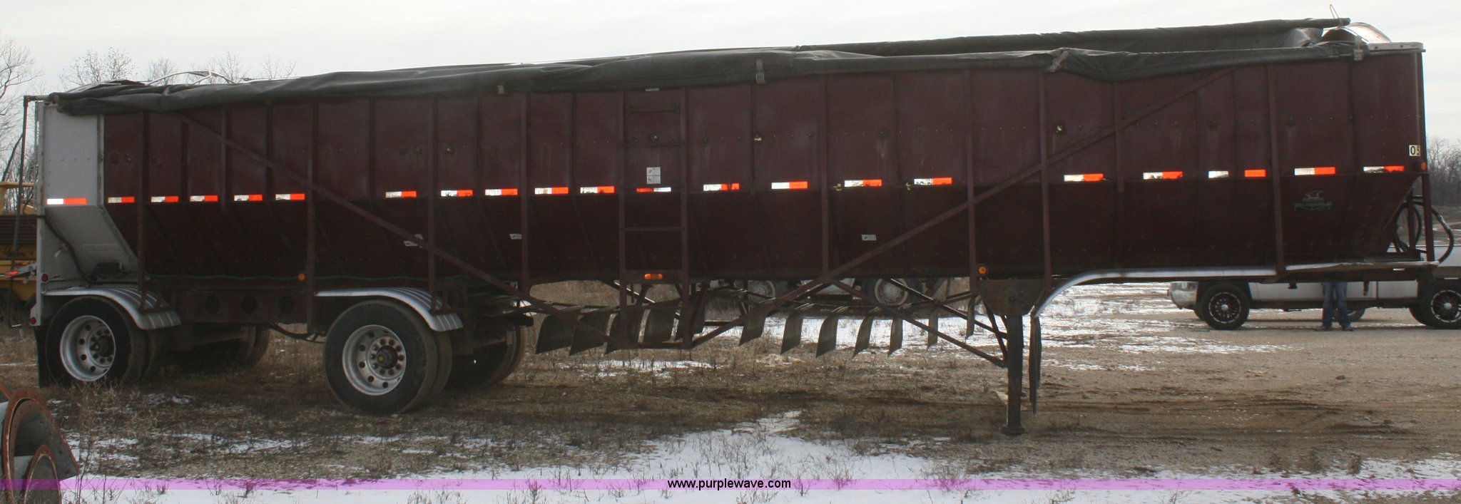 Purple Wave is selling a used Grain or Commodity Trailer in Kansas. This item is a 2002 Trinity spread axle self unloading trailer with the following: 42'L, 41"W belt, Poly bed liner, Stainless steel fenders, Air suspension, Air brakes, Aluminum wheels, 11R24.5 tires, GVWR 65,000 lbs, Rust, Tarp bow is bent, Tarp is torn