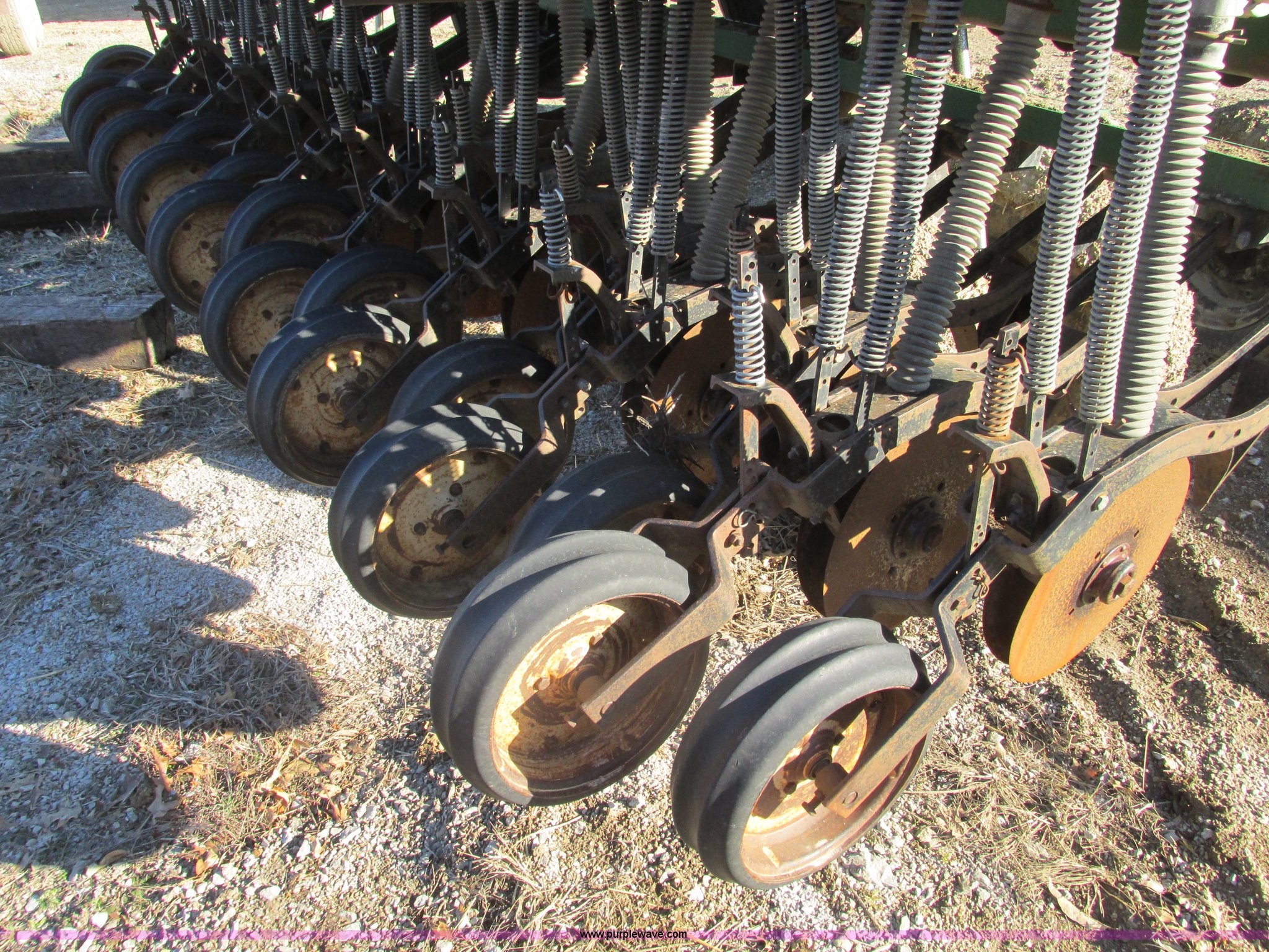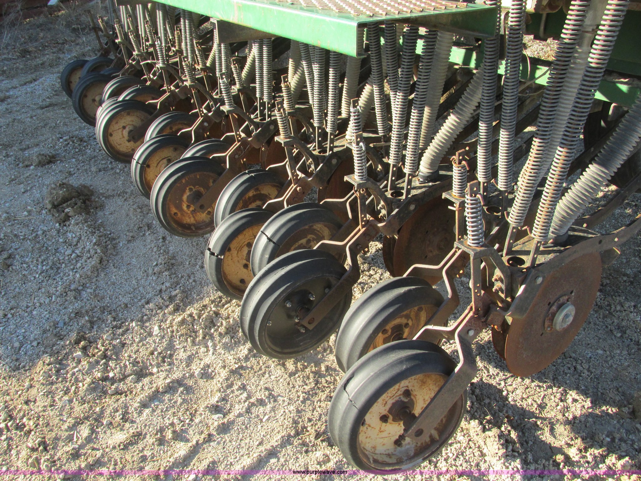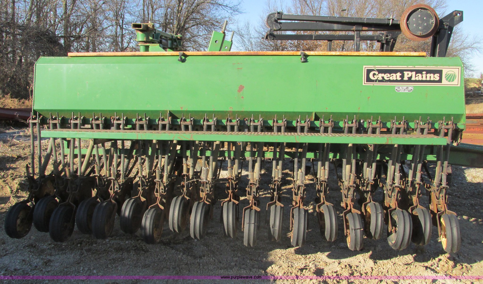 Purple Wave is selling a used Grain Drill or Seeder in Missouri. This item is a Great Plains Solid Stand 24 drill with the following: Model TS-387-582-DDF4, Manual jack, Tri-fold markers, One marker broken off, Quick connect hydraulic hose couplings, 9.5L-15 tires, Hoses show wear, Serial 1069F