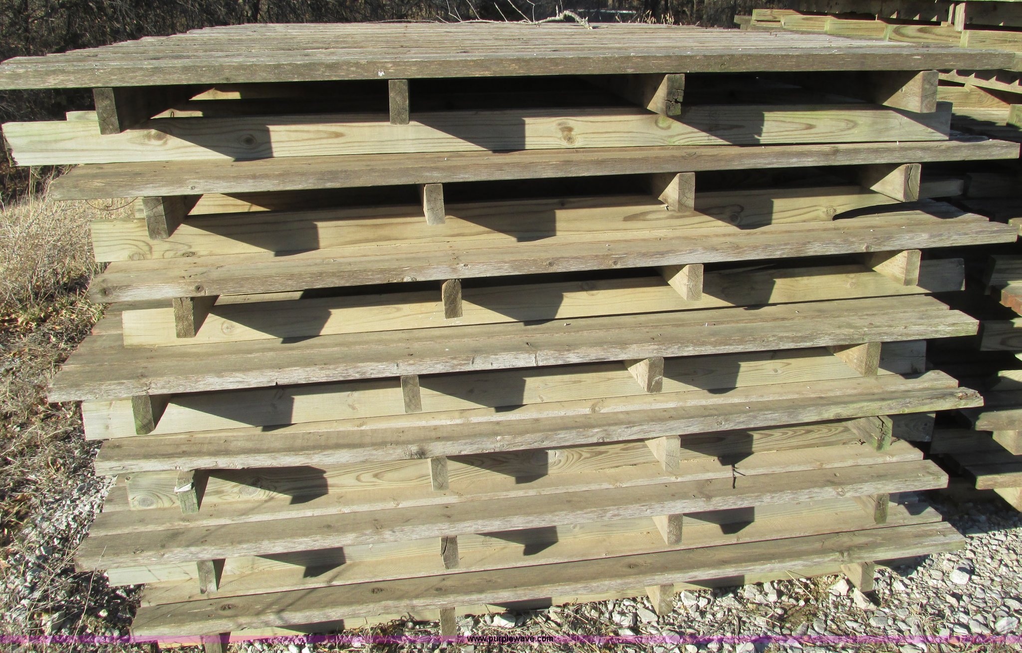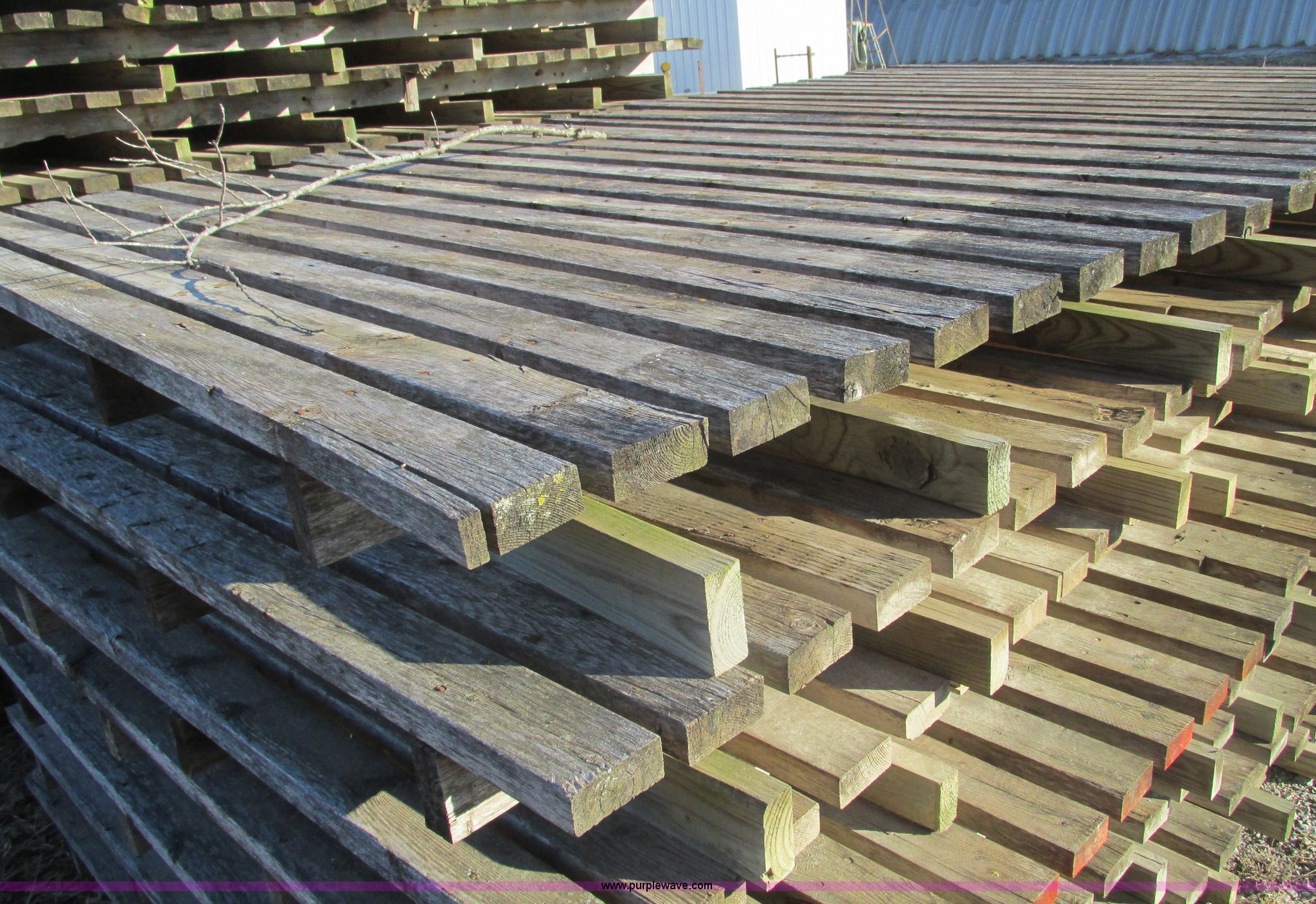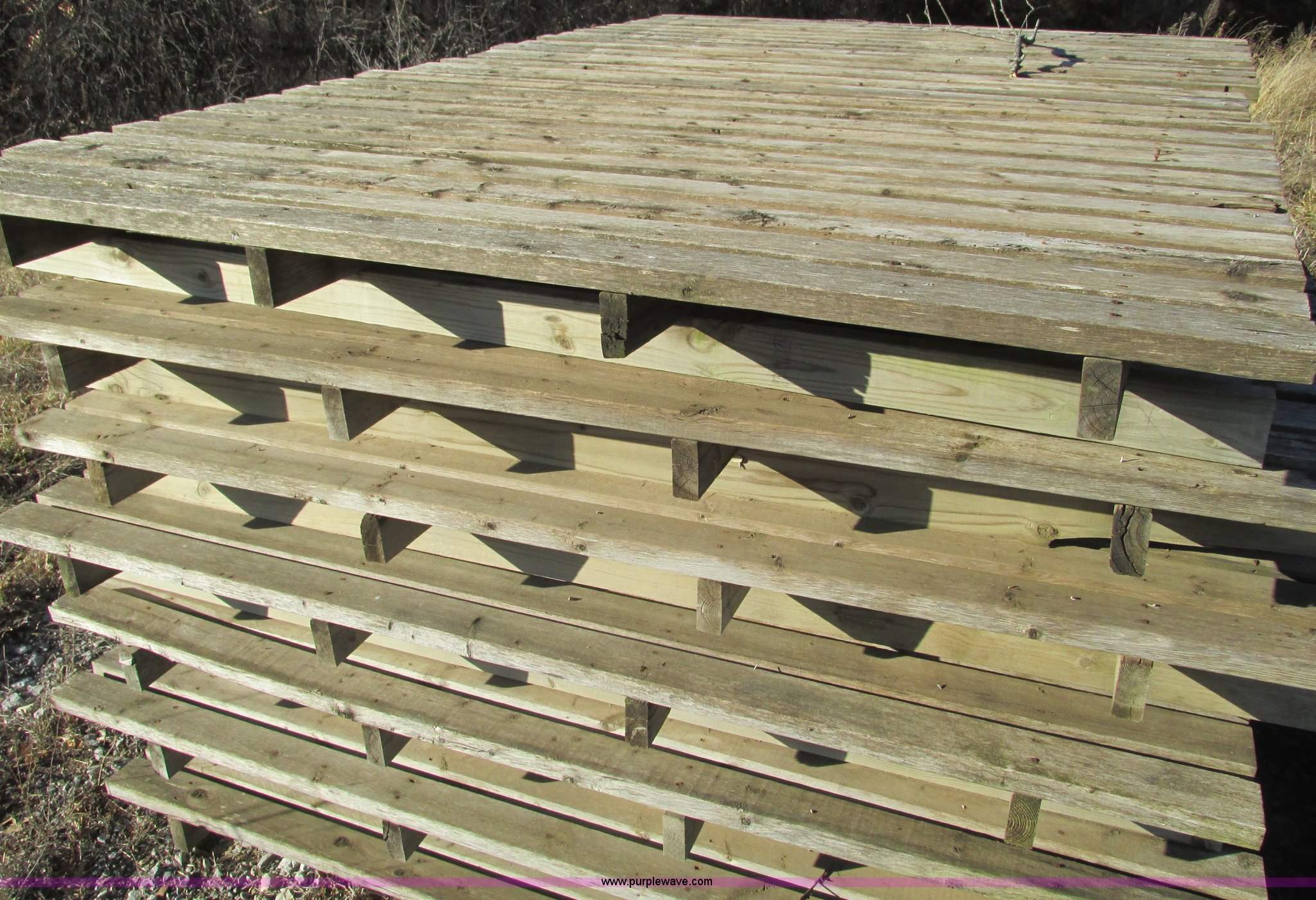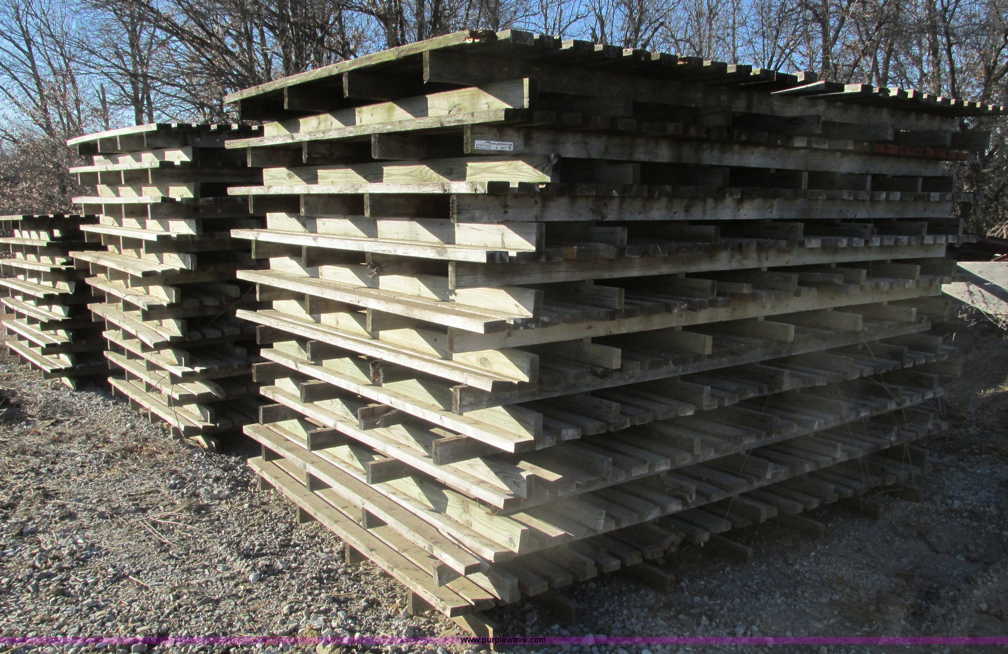 Purple Wave is selling a used Hay Equip. Attach. in Missouri. This item is a (27) New Holland stack wagon pallets with the following: 126"L x 7"W, 2" x 4" treated boards, Used to move large square bales and pull forks out from underneath bale
