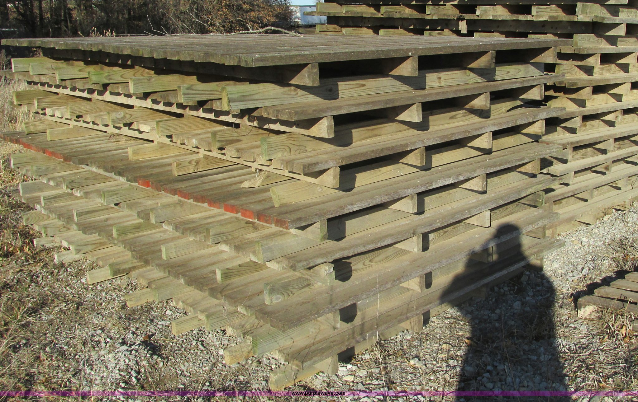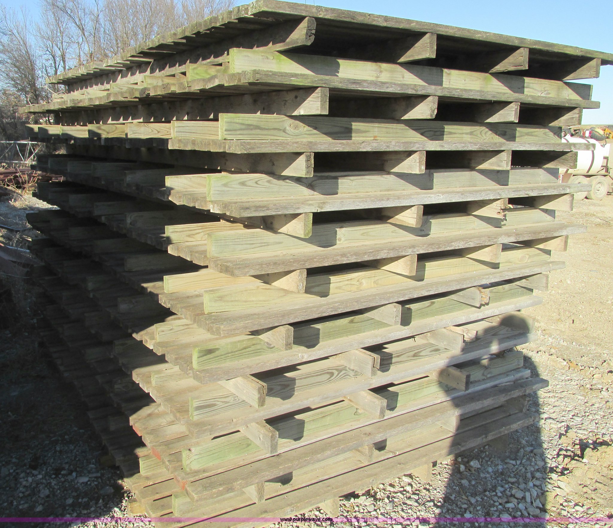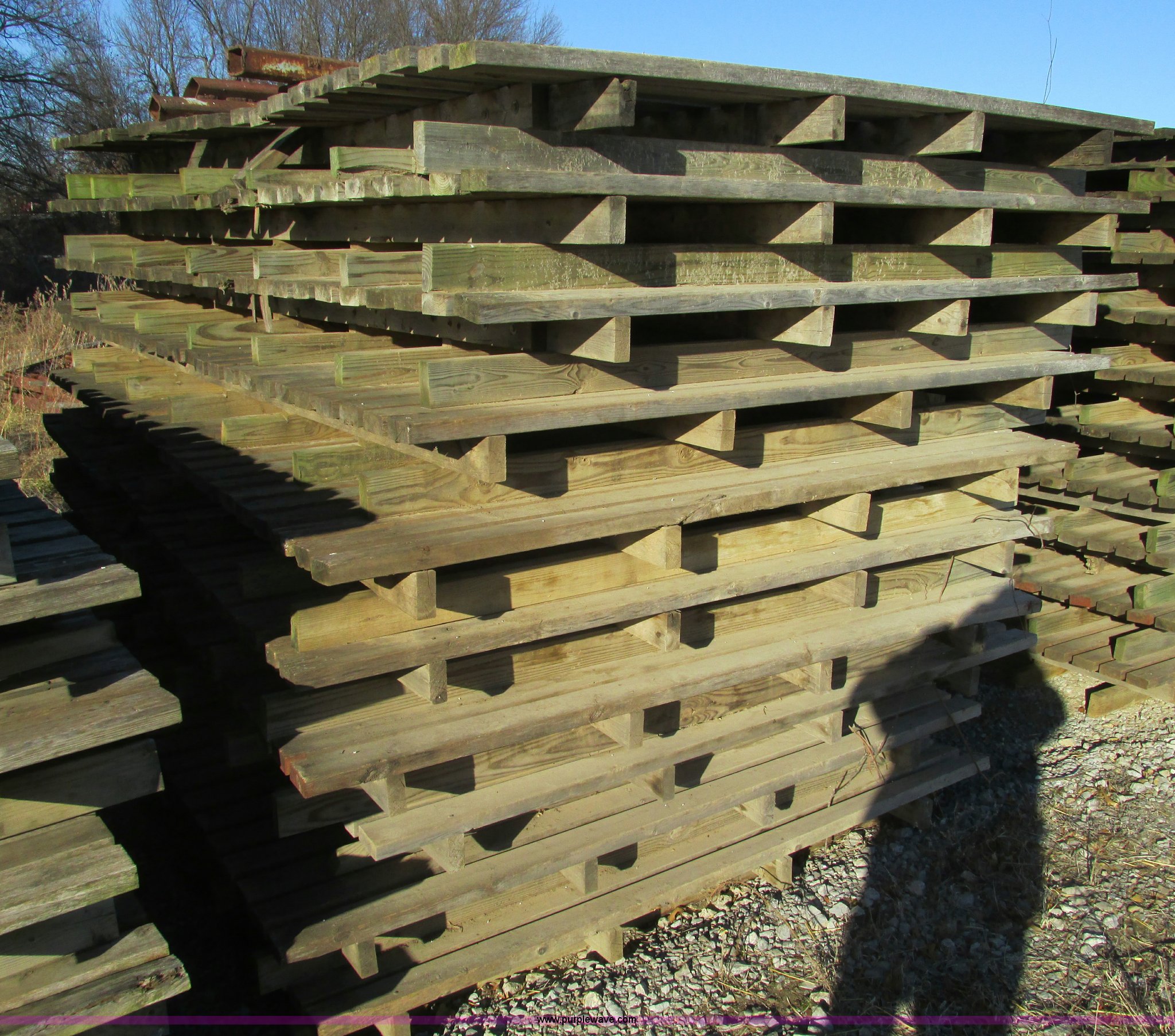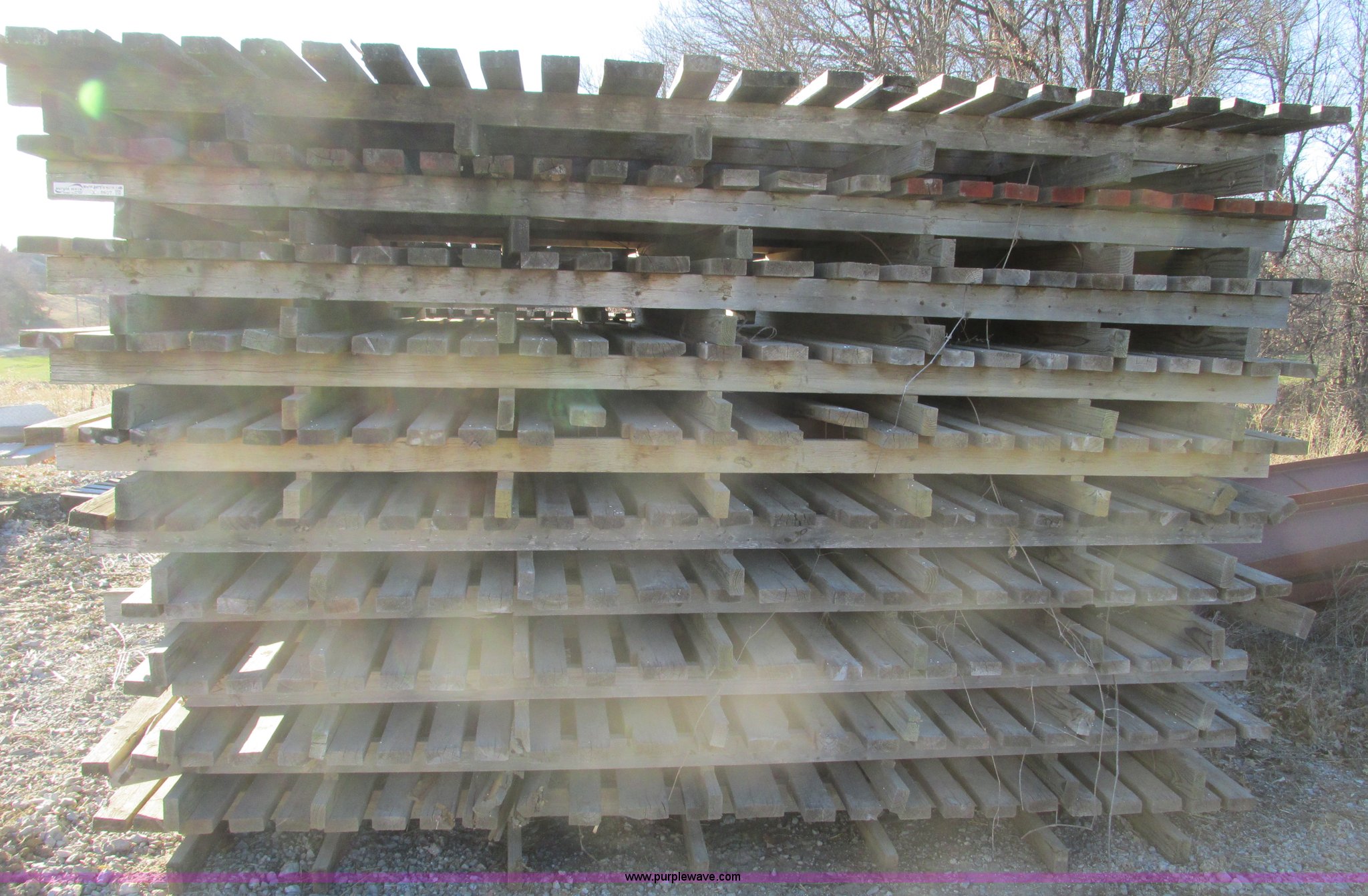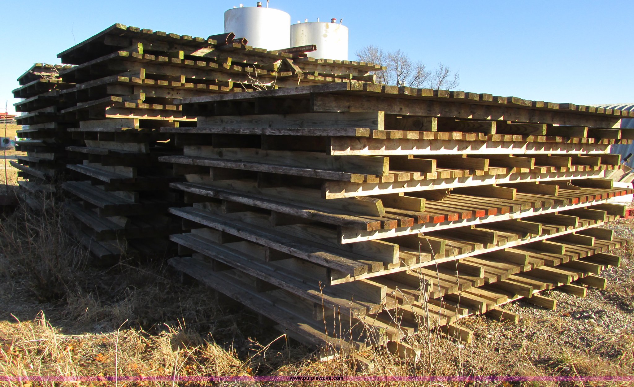 Purple Wave is selling a used Hay Equip. Attach. in Missouri. This item is a (27) New Holland stack wagon pallets with the following: 126"L x 7"W, 2" x 4" treated boards, Used to move large square bales and pull forks out from underneath bale