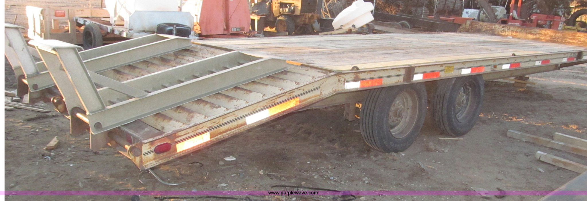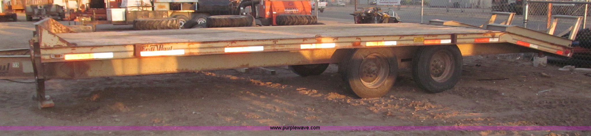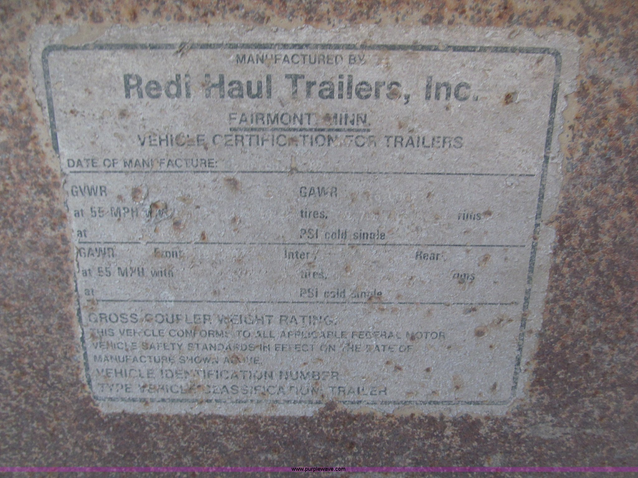 Purple Wave is selling a used Equip. Trailer in Nebraska. This item is a 1989 Redi Haul 25' tandem axle tag trailer with the following: 20'L x 8'W bed, 5'L x 19 1/4" fold down ramps, Broken brace, (3) D-ring tie downs per side, (2) side stake pockets per side, Tongue mounted registration tube, Self cleaning ramps and 5'L dove tail, Spring suspension, Adjustable pintle ring, Manual front mounted jack, Reflective tape, Marker and tail lights, One marker missing, Rear axle brakes, Safety chains, Show repairs and wear, Seven pin trailer wiring, 235/75R17.5 tires, EIN 139
