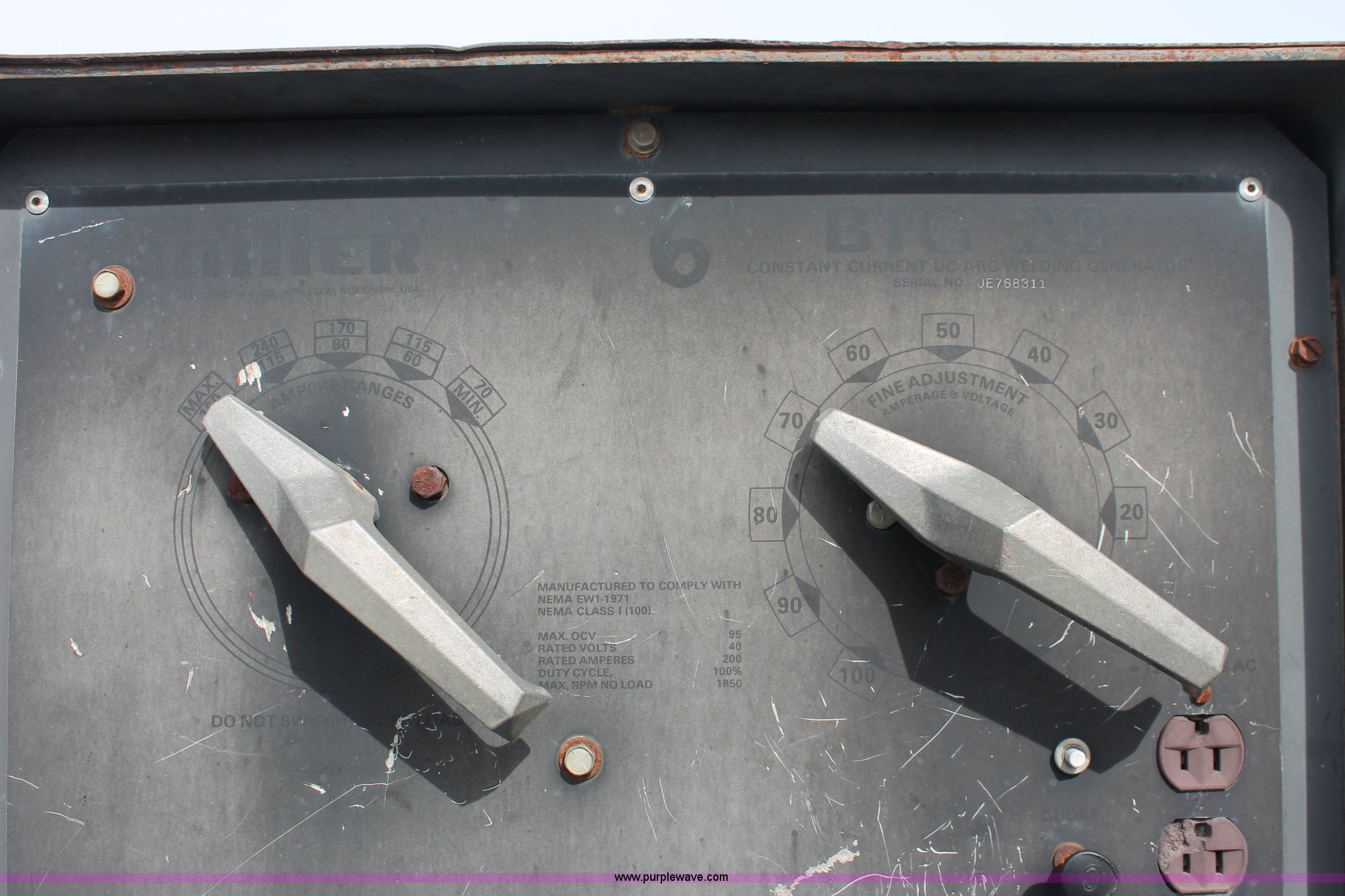 Purple Wave is selling a used Welder (Manual) in Missouri. This item is a Miller Big 20 constant current DC arc welder/generator with the following: 2,258 hours on meter, Teledyne Continental four cylinder gas engine, (2) 120V AC outlets, 40V, 95 max OVC, 200 amps, Serial JE768311