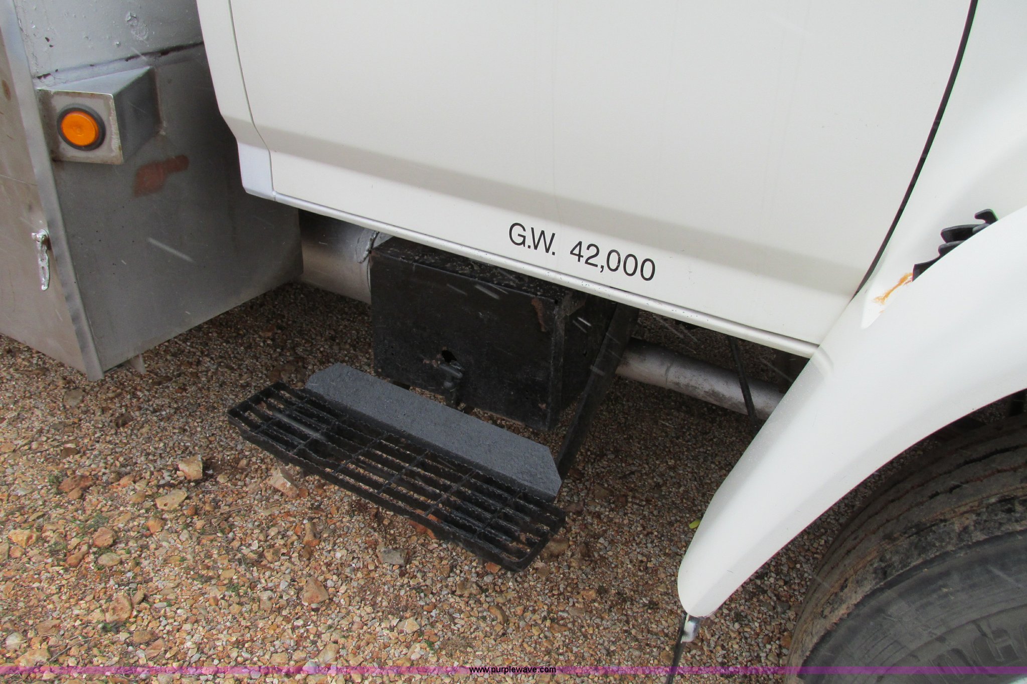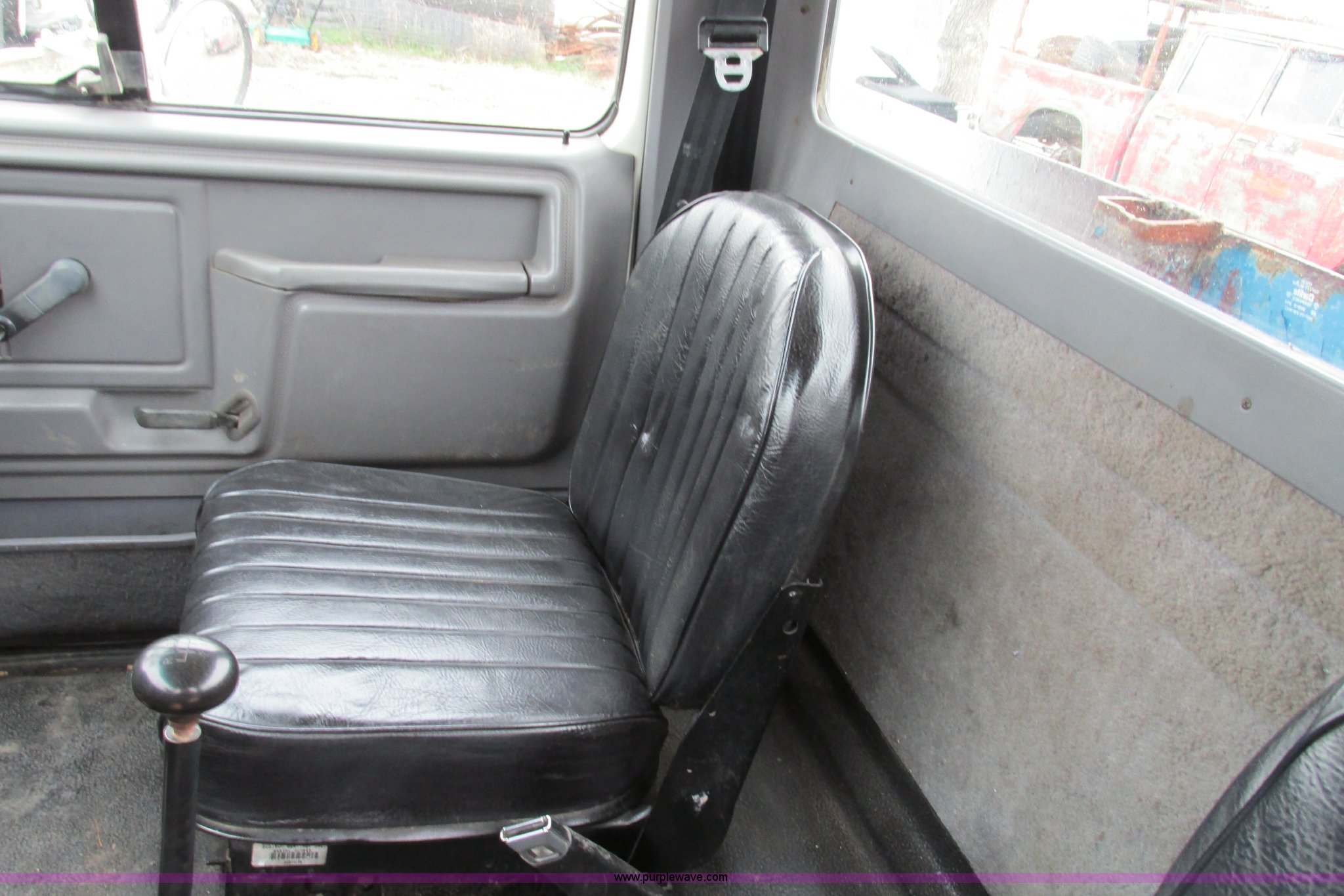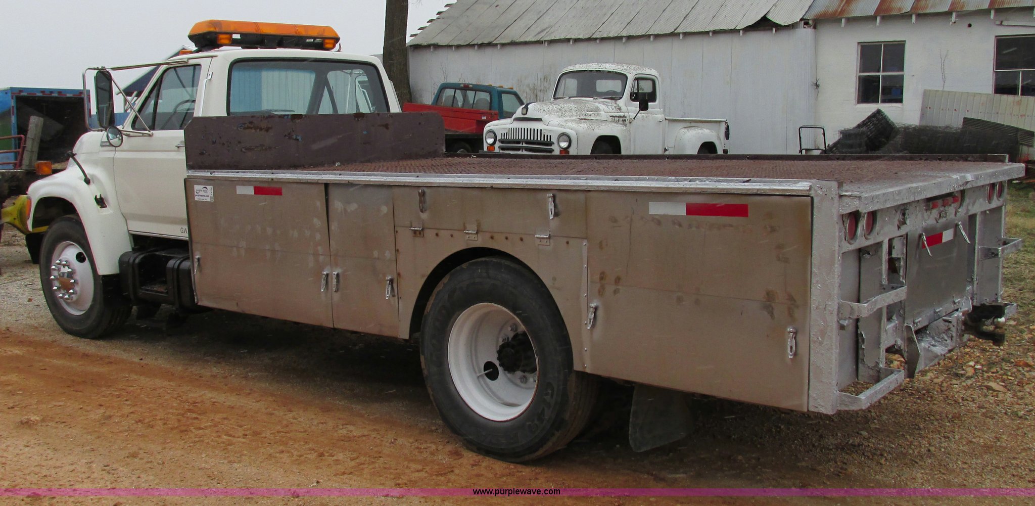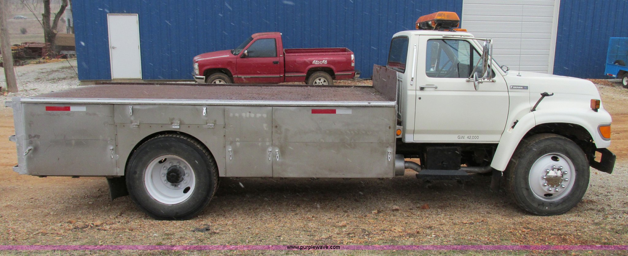 Purple Wave is selling a used Flat Bed Truck in Missouri. This item is a 1995 Ford F800 flatbed truck with the following: 269,654 miles on odometer, Ford 5.9L six cylinder diesel engine, Six speed manual transmission, AC and heat, AM/FM, Spring suspension seat, 50 gallon fuel tank with step, Battery box with step, Flatbed with aluminum boxes, Pintle/ball hitch, 295/75R22.5 front tires, 11R22.5 rear tires